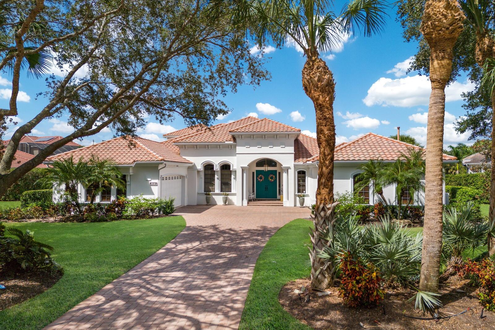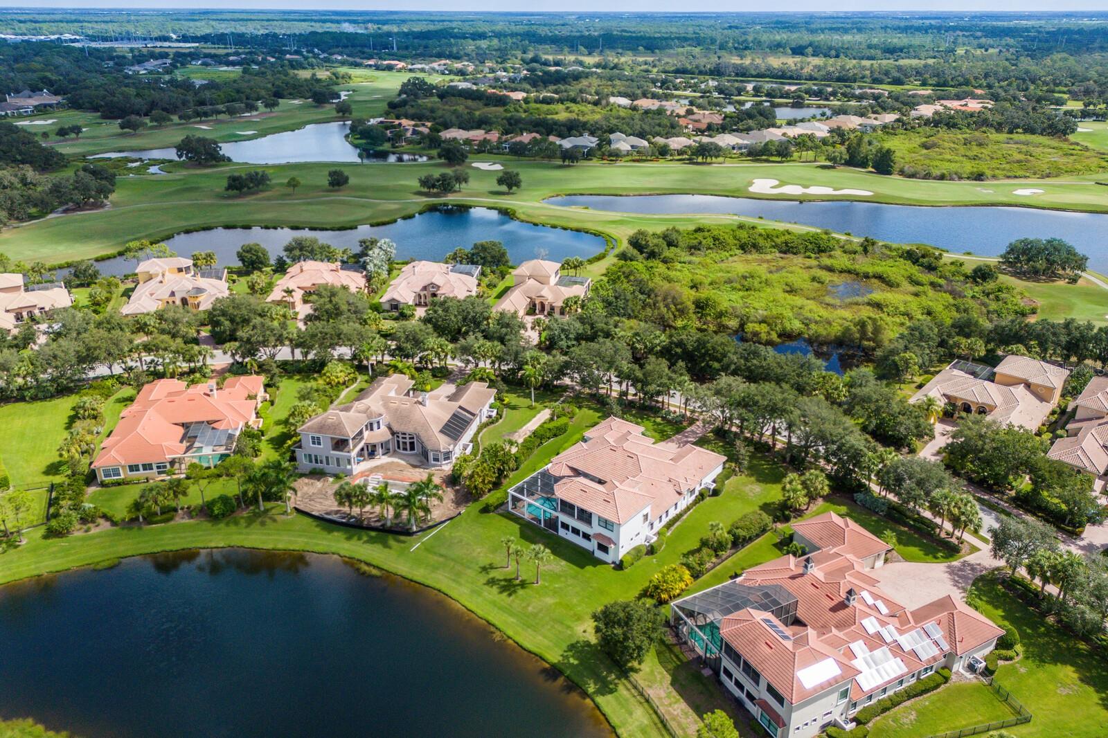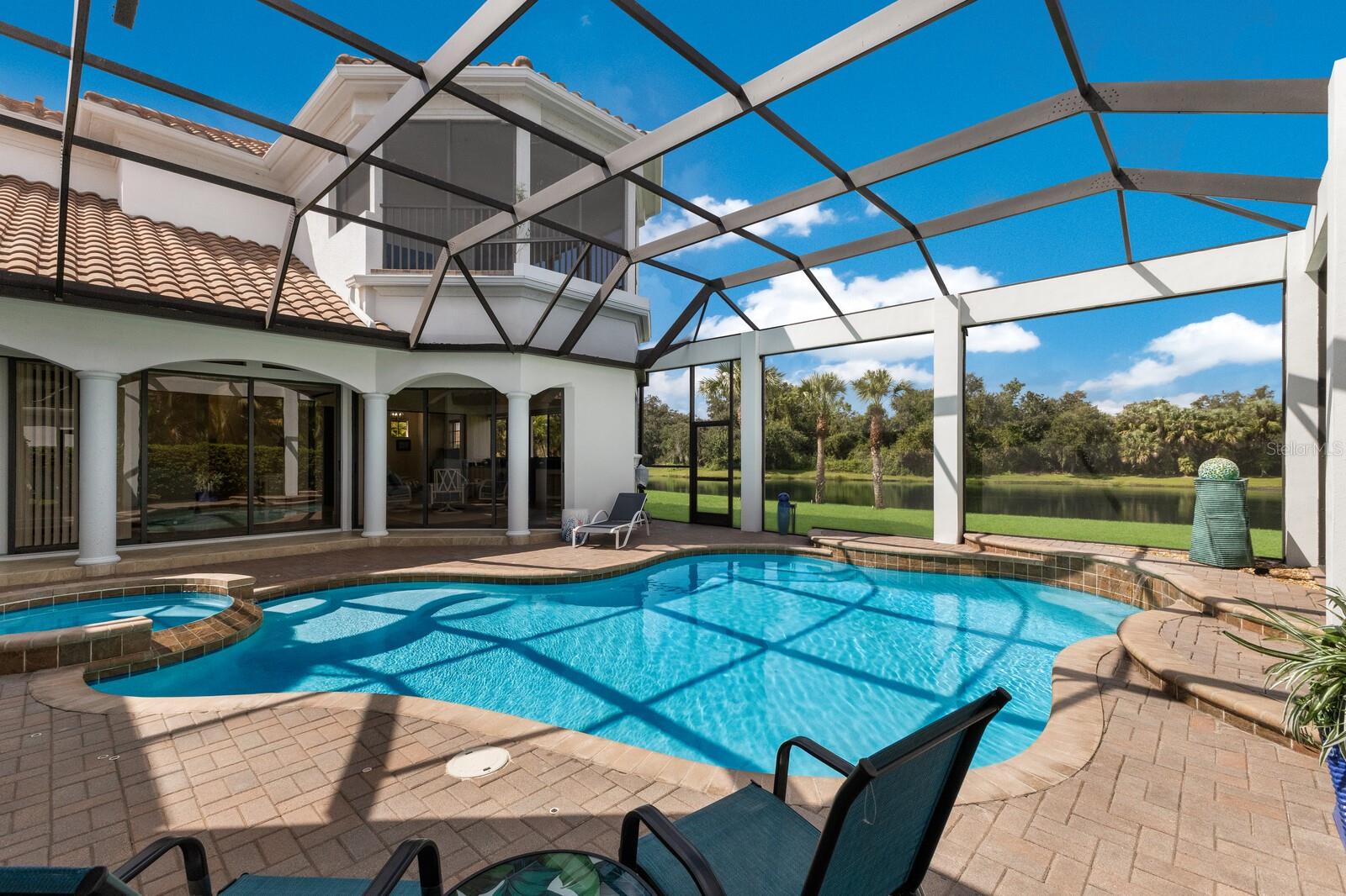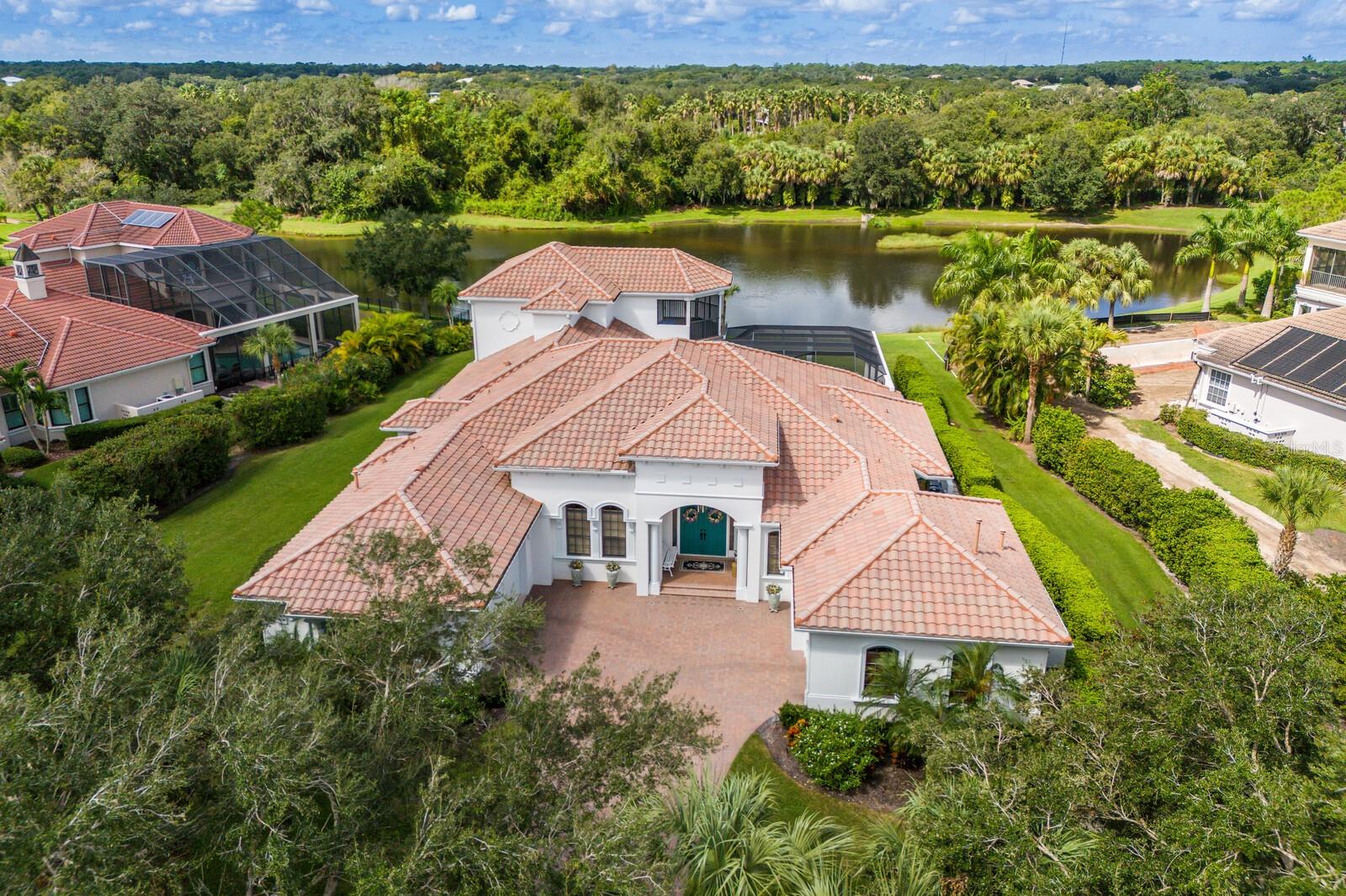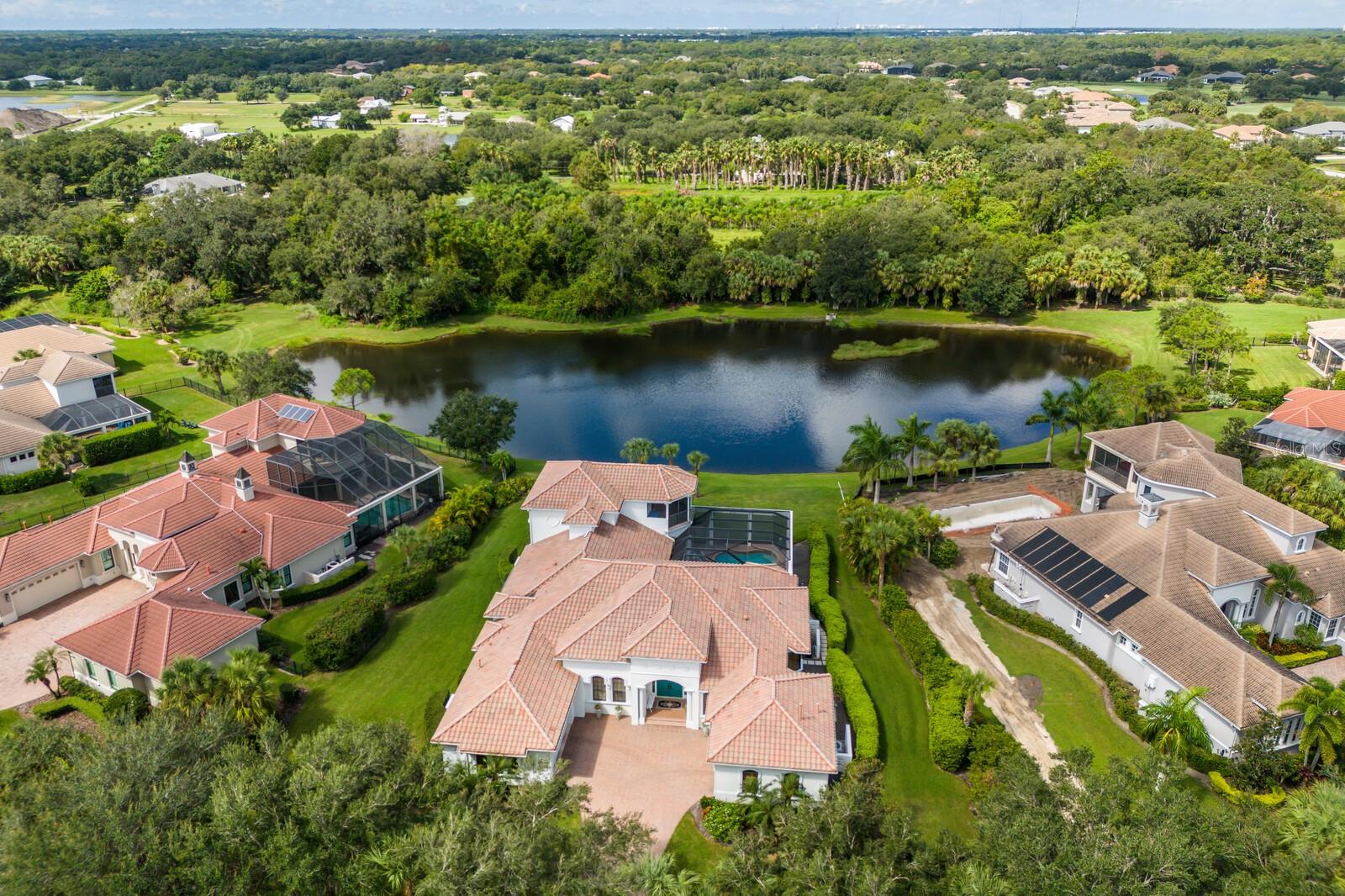 This lovingly maintained Lee Wetherington custom home in Sarasota’s exclusive Founders Club golf community is situated on a private lot which offers breathtaking daily views of wildlife. Whether you’re relaxing on the first-floor lanai or enjoying the upstairs balcony, the unobstructed vistas of nature make it easy to connect with the tranquility of the outdoors. The grand entryway leads to an impressive foyer and formal living area featuring a hand-carved wood and granite natural gas fireplace straight ahead, with an oversized dining room suitable for entertaining on the left. The expansive Florida room boasts three walls of glass sliders, screen windows, a natural gas fireplace, and a wet bar, making it a perfect space for relaxing, entertaining, or even as a playroom or sunroom. The gourmet kitchen is a chef’s dream, featuring two sinks, two GE Profile dishwashers, two GE Monogram ovens (both with convection options), GE Profile Arctica refrigerator, a microwave, stone countertops, and resurfaced off-white cabinetry. The six-burner GE Monogram gas cooktop includes a built-in grill and exterior vented hood, while the large center island contains a prep sink for added convenience. The luxurious primary suite offers two spacious walk-in closets and an impressive bath with dual stone vanities, a jetted tub, and a two-person walk-in shower. Two additional bedrooms, one en suite, are located on the first floor in addition to a 13x15 office with custom storage which can easily accommodate multiple work spaces. Upstairs is ideal for long term guests with its large open area, bedroom and full bath as well as a screened balcony overlooking the serene pond. The bedroom sliders retract at the corners, providing an amazing view of the pond. All closets and shelving throughout the house are custom-built, providing both functionality and style. This exceptional home is equipped with a 40-kilowatt Olympian natural gas whole-house generator. A multi-use, 15-by-13-foot saferoom on the first floor can also serve as a home gym, craft room, or storage area in addition to its stated purpose of providing a safe place during high winds. This home is not in a flood zone and has not experienced water intrusion from storms. Other features include three heating and cooling units, a whole-house water softening and reverse osmosis system, instant hot water faucet in the kitchen and water filling faucet at the stove. Recent upgrades to the pool and spa include a new pump in 2020, resurfacing in 2021, new remote-control system in 2021 and heater in 2022. Various types of memberships in the exclusive Founders Golf Club are available but membership is not required to live in the community. Access to the private golf course from this home is provided by a wooden cart path located just down the street. Home ownership provides access to the Community Center, pickle ball and tennis courts, kids’ playground and multiple activities. This home offers an unparalleled combination of luxury, security, and convenience, making it an ideal retreat for those seeking comfort and tranquility in an exquisite setting.