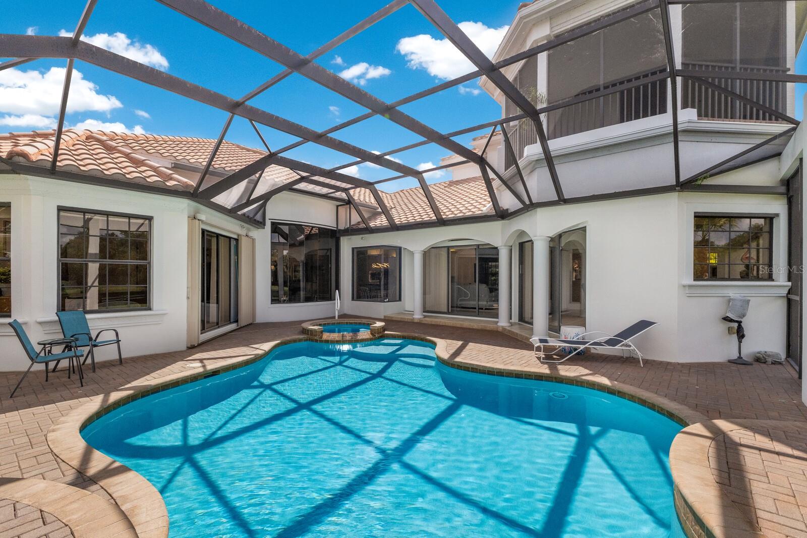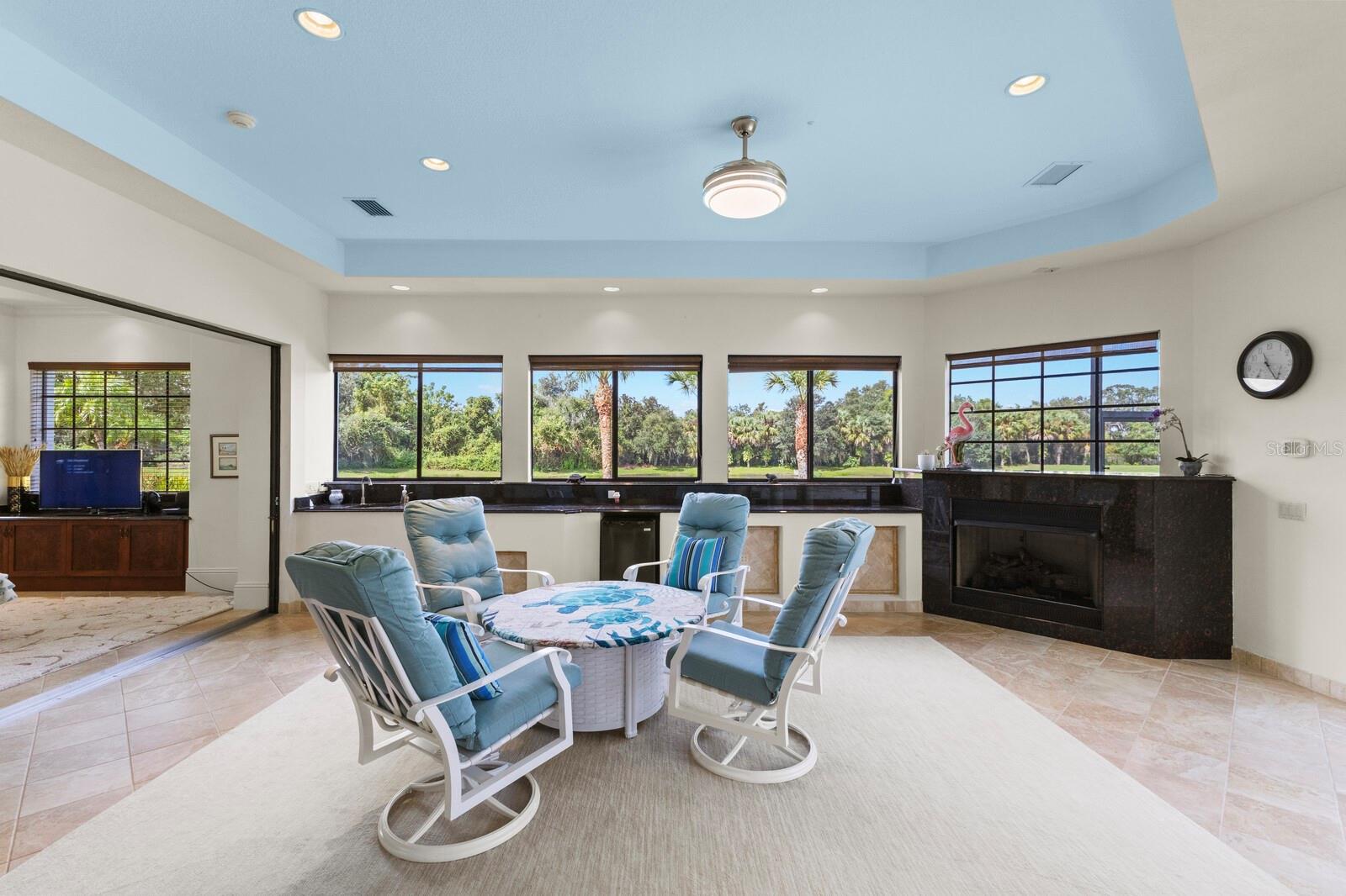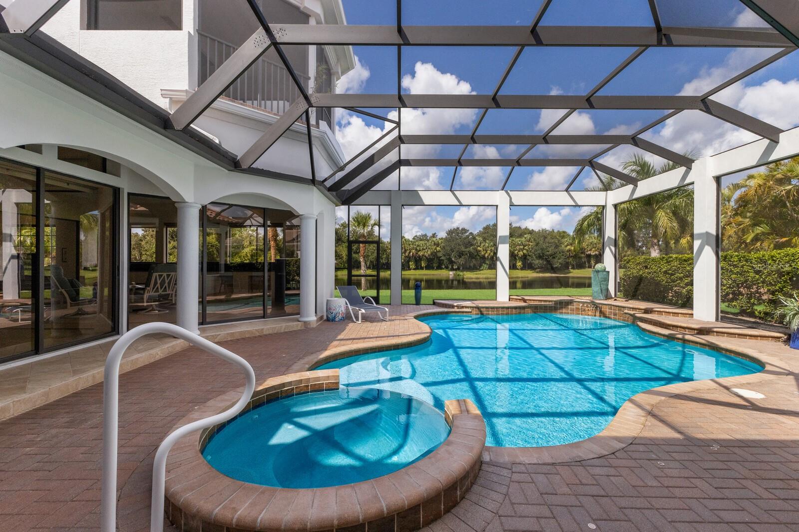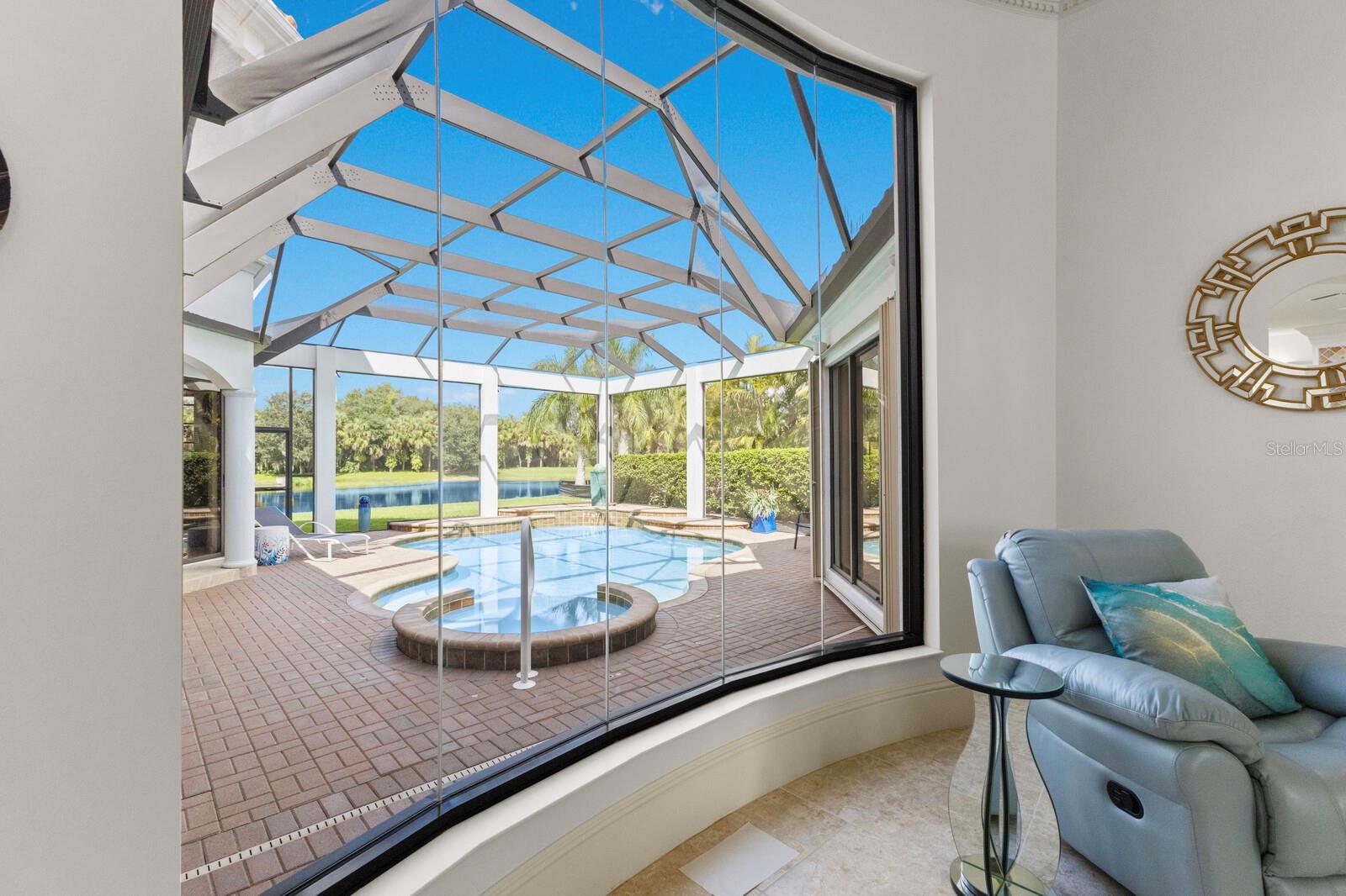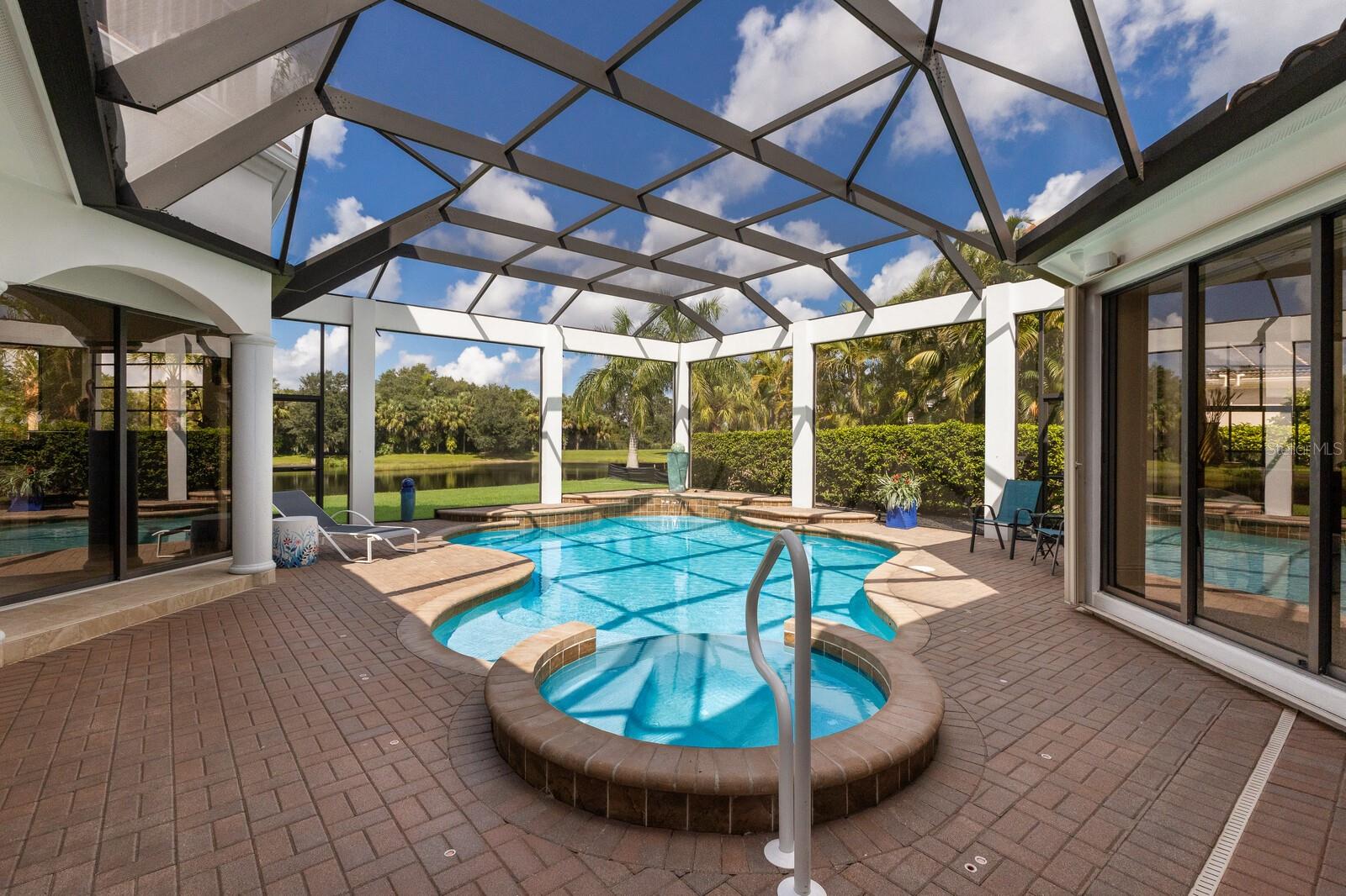 This lovingly maintained Lee Wetherington custom home in Sarasota’s exclusive Founders Club golf community is situated on a private lot which offers breathtaking daily views of wildlife. Whether you’re relaxing on the first-floor lanai or enjoying the upstairs balcony, the unobstructed vistas of nature make it easy to connect with the tranquility of the outdoors. The grand entryway leads to an impressive foyer and formal living area featuring a hand-carved wood and granite natural gas fireplace straight ahead, with an oversized dining room suitable for entertaining on the left. The expansive Florida room boasts three walls of glass sliders, screen windows, a natural gas fireplace, and a wet bar, making it a perfect space for relaxing, entertaining, or even as a playroom or sunroom. The gourmet kitchen is a chef’s dream, featuring two sinks, two GE Profile dishwashers, two GE Monogram ovens (both with convection options), GE Profile Arctica refrigerator, a microwave, stone countertops, and resurfaced off-white cabinetry. The six-burner GE Monogram gas cooktop includes a built-in grill and exterior vented hood, while the large center island contains a prep sink for added convenience. The luxurious primary suite offers two spacious walk-in closets and an impressive bath with dual stone vanities, a jetted tub, and a two-person walk-in shower. Two additional bedrooms, one en suite, are located on the first floor in addition to a 13x15 office with custom storage which can easily accommodate multiple work spaces. Upstairs is ideal for long term guests with its large open area, bedroom and full bath as well as a screened balcony overlooking the serene pond. The bedroom sliders retract at the corners, providing an amazing view of the pond. All closets and shelving throughout the house are custom-built, providing both functionality and style. This exceptional home is equipped with a 40-kilowatt Olympian natural gas whole-house generator. A multi-use, 15-by-13-foot saferoom on the first floor can also serve as a home gym, craft room, or storage area in addition to its stated purpose of providing a safe place during high winds. This home is not in a flood zone and has not experienced water intrusion from storms. Other features include three heating and cooling units, a whole-house water softening and reverse osmosis system, instant hot water faucet in the kitchen and water filling faucet at the stove. Recent upgrades to the pool and spa include a new pump in 2020, resurfacing in 2021, new remote-control system in 2021 and heater in 2022. Various types of memberships in the exclusive Founders Golf Club are available but membership is not required to live in the community. Access to the private golf course from this home is provided by a wooden cart path located just down the street. Home ownership provides access to the Community Center, pickle ball and tennis courts, kids’ playground and multiple activities. This home offers an unparalleled combination of luxury, security, and convenience, making it an ideal retreat for those seeking comfort and tranquility in an exquisite setting.