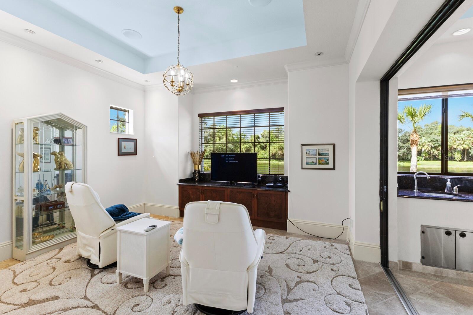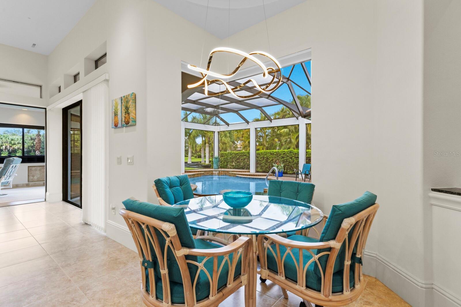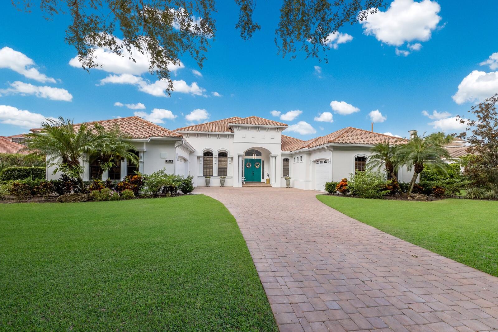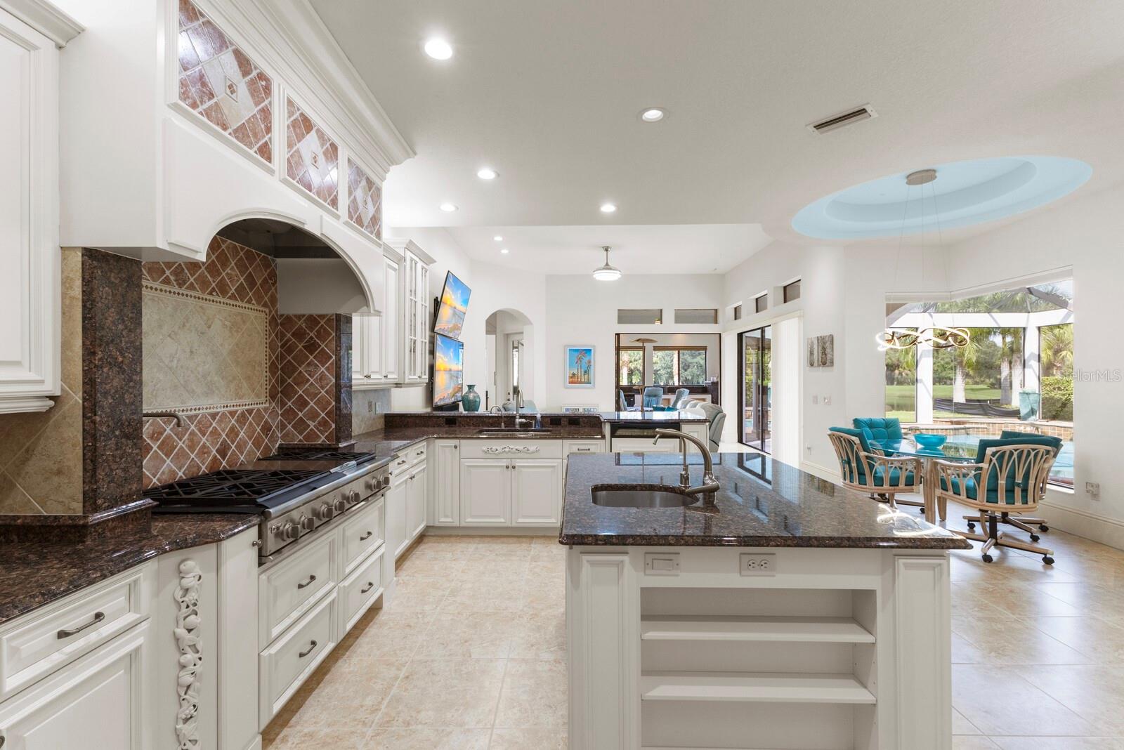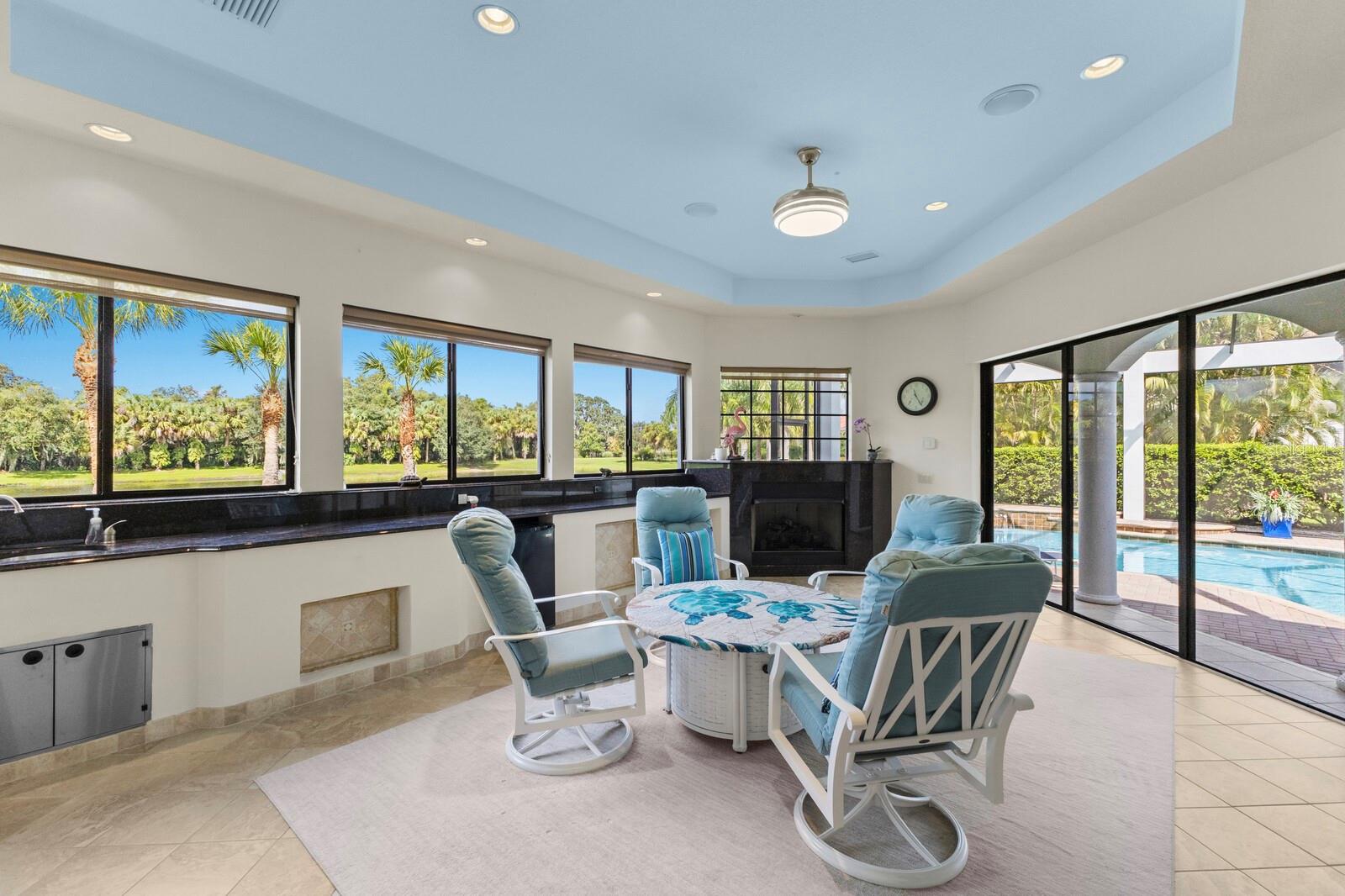 This lovingly maintained Lee Wetherington custom home in Sarasota’s exclusive Founders Club golf community is situated on a private lot which offers breathtaking daily views of wildlife. Whether you’re relaxing on the first-floor lanai or enjoying the upstairs balcony, the unobstructed vistas of nature make it easy to connect with the tranquility of the outdoors. The grand entryway leads to an impressive foyer and formal living area featuring a hand-carved wood and granite natural gas fireplace straight ahead, with an oversized dining room suitable for entertaining on the left. The expansive Florida room boasts three walls of glass sliders, screen windows, a natural gas fireplace, and a wet bar, making it a perfect space for relaxing, entertaining, or even as a playroom or sunroom. The gourmet kitchen is a chef’s dream, featuring two sinks, two GE Profile dishwashers, two GE Monogram ovens (both with convection options), GE Profile Arctica refrigerator, a microwave, stone countertops, and resurfaced off-white cabinetry. The six-burner GE Monogram gas cooktop includes a built-in grill and exterior vented hood, while the large center island contains a prep sink for added convenience. The luxurious primary suite offers two spacious walk-in closets and an impressive bath with dual stone vanities, a jetted tub, and a two-person walk-in shower. Two additional bedrooms, one en suite, are located on the first floor in addition to a 13x15 office with custom storage which can easily accommodate multiple work spaces. Upstairs is ideal for long term guests with its large open area, bedroom and full bath as well as a screened balcony overlooking the serene pond. The bedroom sliders retract at the corners, providing an amazing view of the pond. All closets and shelving throughout the house are custom-built, providing both functionality and style. This exceptional home is equipped with a 40-kilowatt Olympian natural gas whole-house generator. A multi-use, 15-by-13-foot saferoom on the first floor can also serve as a home gym, craft room, or storage area in addition to its stated purpose of providing a safe place during high winds. This home is not in a flood zone and has not experienced water intrusion from storms. Other features include three heating and cooling units, a whole-house water softening and reverse osmosis system, instant hot water faucet in the kitchen and water filling faucet at the stove. Recent upgrades to the pool and spa include a new pump in 2020, resurfacing in 2021, new remote-control system in 2021 and heater in 2022. Various types of memberships in the exclusive Founders Golf Club are available but membership is not required to live in the community. Access to the private golf course from this home is provided by a wooden cart path located just down the street. Home ownership provides access to the Community Center, pickle ball and tennis courts, kids’ playground and multiple activities. This home offers an unparalleled combination of luxury, security, and convenience, making it an ideal retreat for those seeking comfort and tranquility in an exquisite setting.