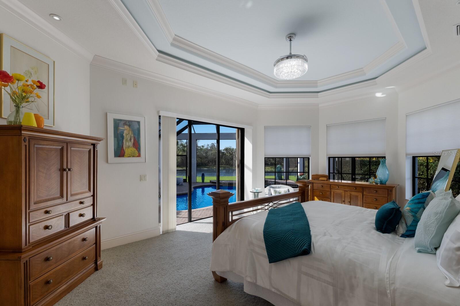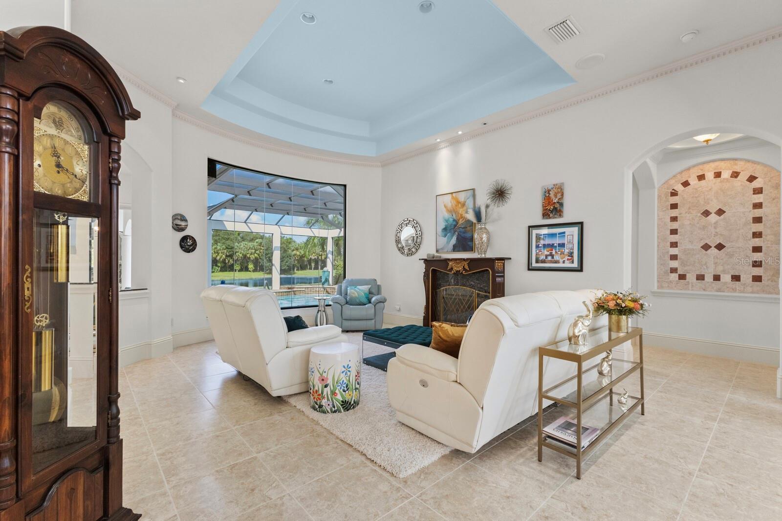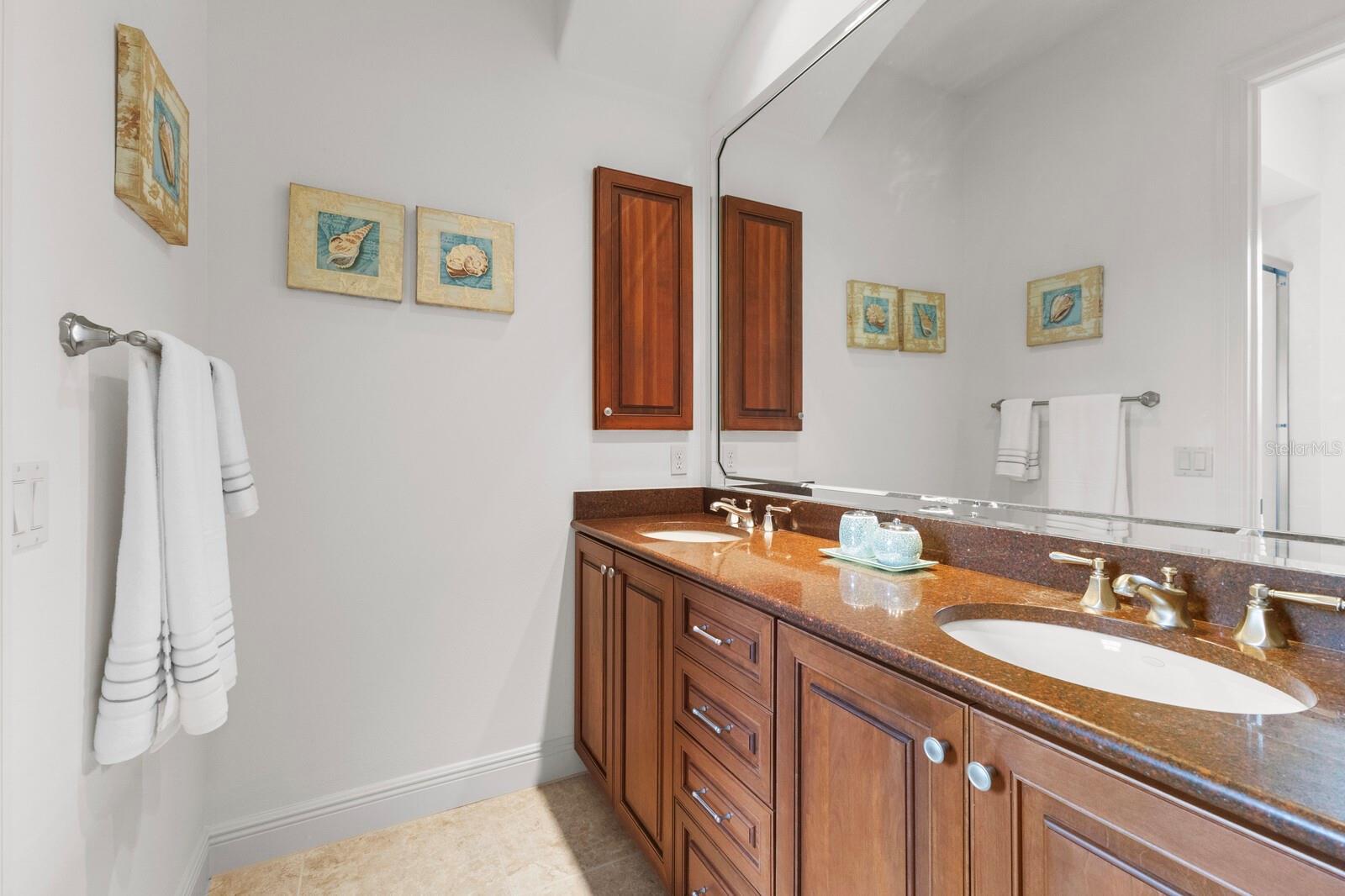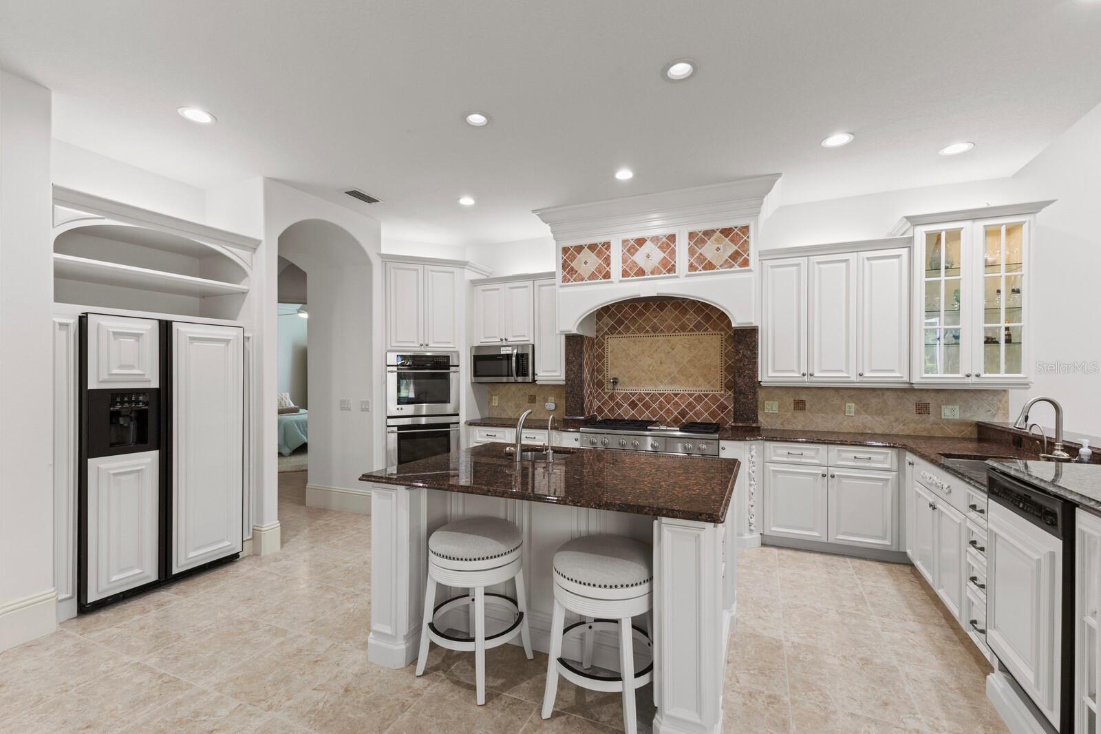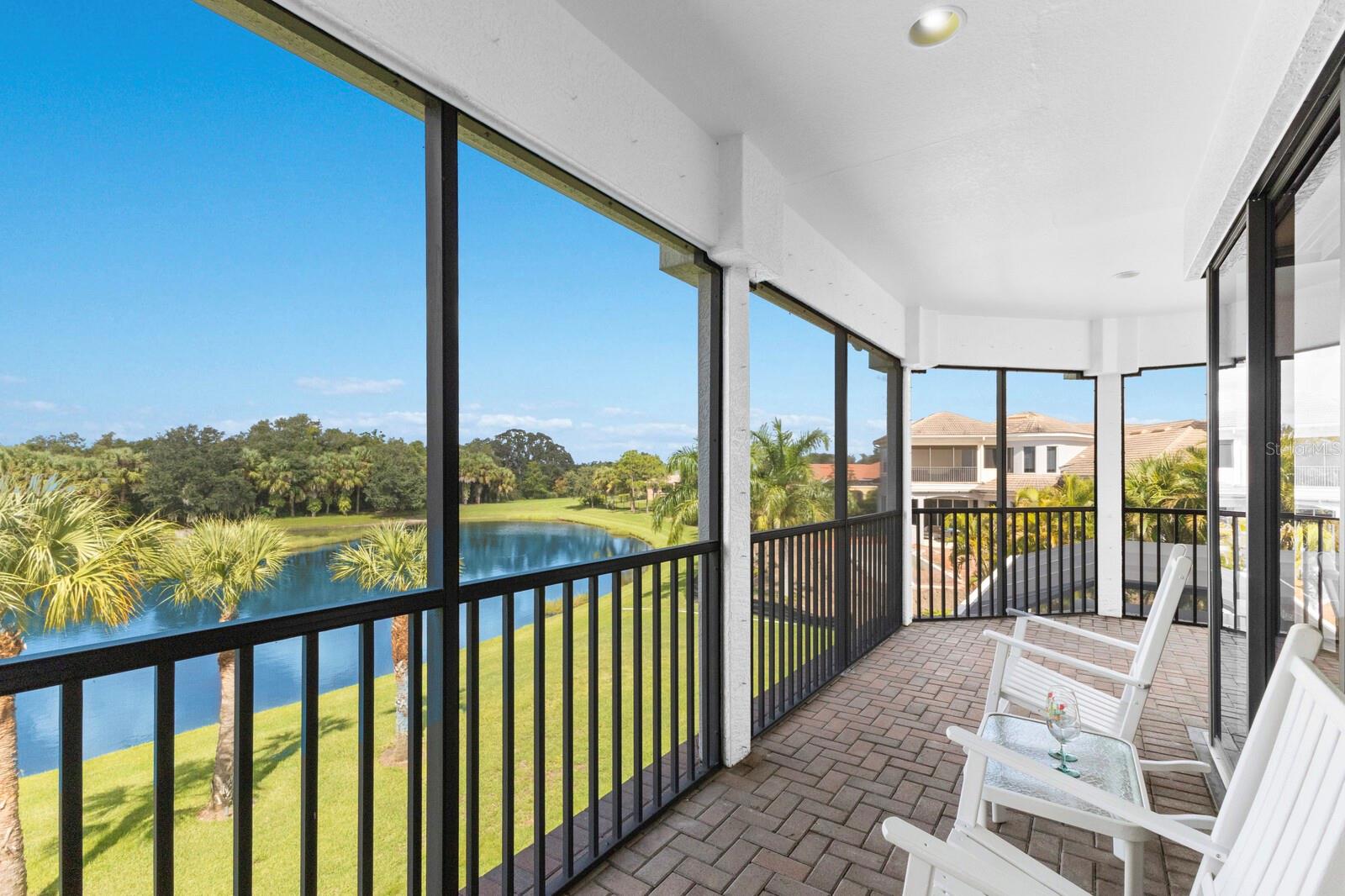 This lovingly maintained Lee Wetherington custom home in Sarasota’s exclusive Founders Club golf community is situated on a private lot which offers breathtaking daily views of wildlife. Whether you’re relaxing on the first-floor lanai or enjoying the upstairs balcony, the unobstructed vistas of nature make it easy to connect with the tranquility of the outdoors. The grand entryway leads to an impressive foyer and formal living area featuring a hand-carved wood and granite natural gas fireplace straight ahead, with an oversized dining room suitable for entertaining on the left. The expansive Florida room boasts three walls of glass sliders, screen windows, a natural gas fireplace, and a wet bar, making it a perfect space for relaxing, entertaining, or even as a playroom or sunroom. The gourmet kitchen is a chef’s dream, featuring two sinks, two GE Profile dishwashers, two GE Monogram ovens (both with convection options), GE Profile Arctica refrigerator, a microwave, stone countertops, and resurfaced off-white cabinetry. The six-burner GE Monogram gas cooktop includes a built-in grill and exterior vented hood, while the large center island contains a prep sink for added convenience. The luxurious primary suite offers two spacious walk-in closets and an impressive bath with dual stone vanities, a jetted tub, and a two-person walk-in shower. Two additional bedrooms, one en suite, are located on the first floor in addition to a 13x15 office with custom storage which can easily accommodate multiple work spaces. Upstairs is ideal for long term guests with its large open area, bedroom and full bath as well as a screened balcony overlooking the serene pond. The bedroom sliders retract at the corners, providing an amazing view of the pond. All closets and shelving throughout the house are custom-built, providing both functionality and style. This exceptional home is equipped with a 40-kilowatt Olympian natural gas whole-house generator. A multi-use, 15-by-13-foot saferoom on the first floor can also serve as a home gym, craft room, or storage area in addition to its stated purpose of providing a safe place during high winds. This home is not in a flood zone and has not experienced water intrusion from storms. Other features include three heating and cooling units, a whole-house water softening and reverse osmosis system, instant hot water faucet in the kitchen and water filling faucet at the stove. Recent upgrades to the pool and spa include a new pump in 2020, resurfacing in 2021, new remote-control system in 2021 and heater in 2022. Various types of memberships in the exclusive Founders Golf Club are available but membership is not required to live in the community. Access to the private golf course from this home is provided by a wooden cart path located just down the street. Home ownership provides access to the Community Center, pickle ball and tennis courts, kids’ playground and multiple activities. This home offers an unparalleled combination of luxury, security, and convenience, making it an ideal retreat for those seeking comfort and tranquility in an exquisite setting.