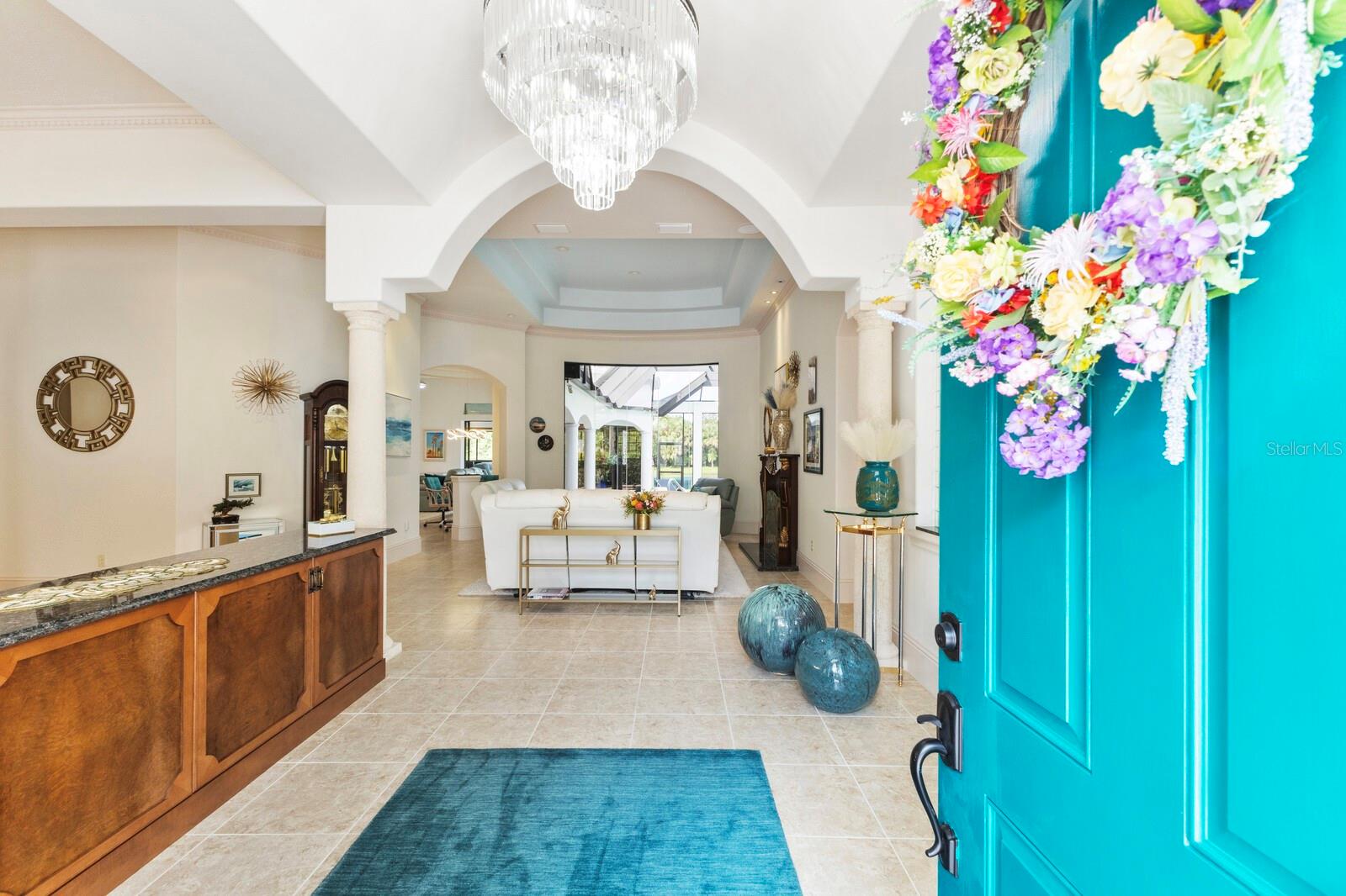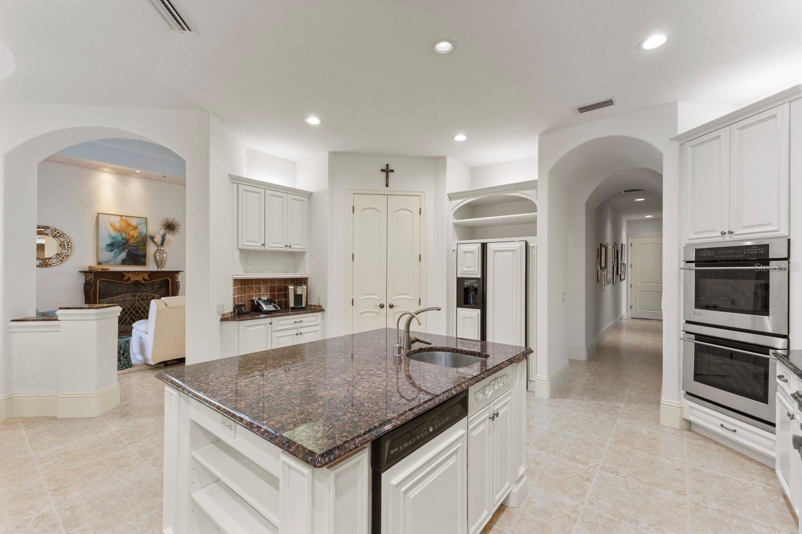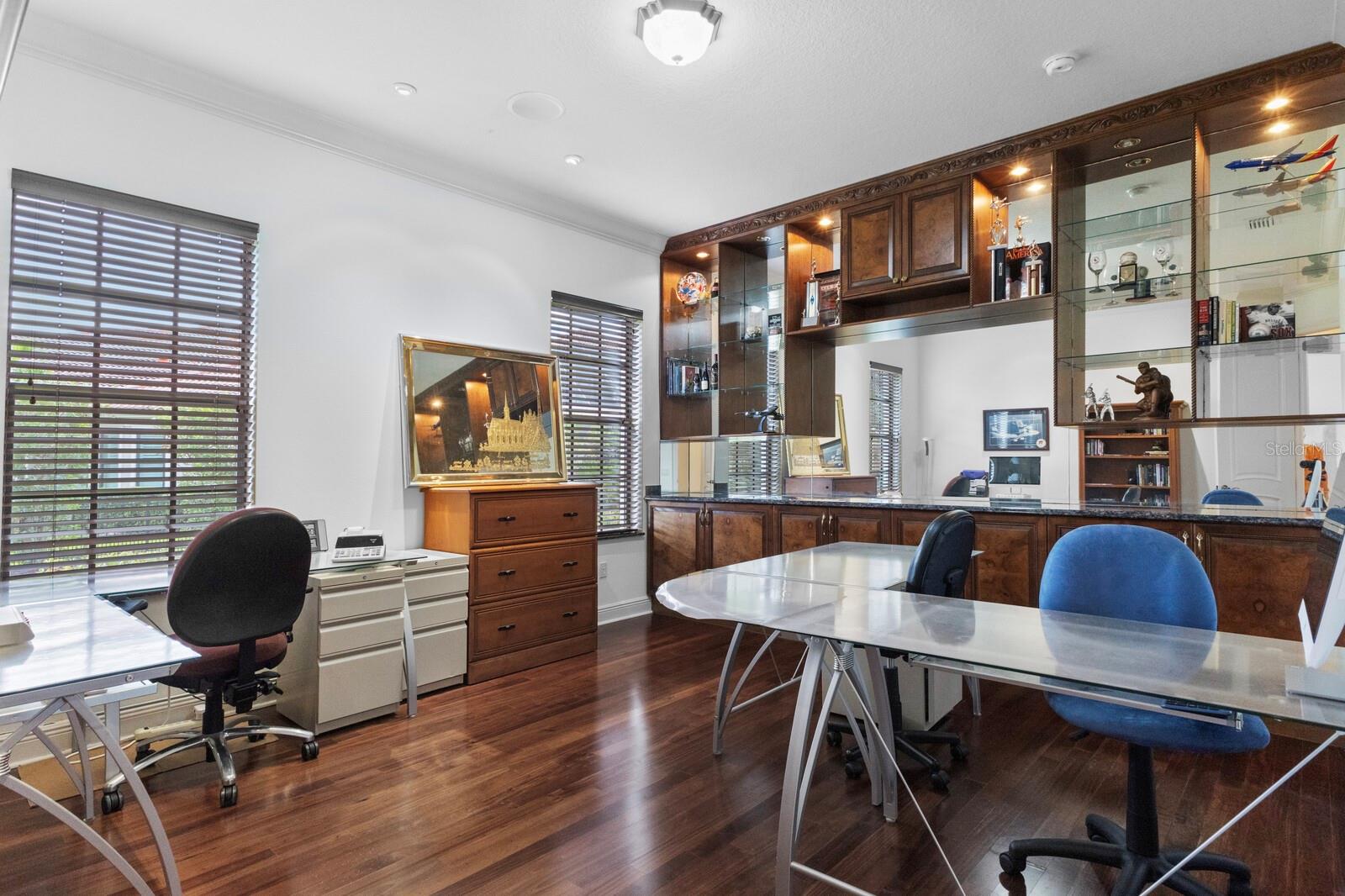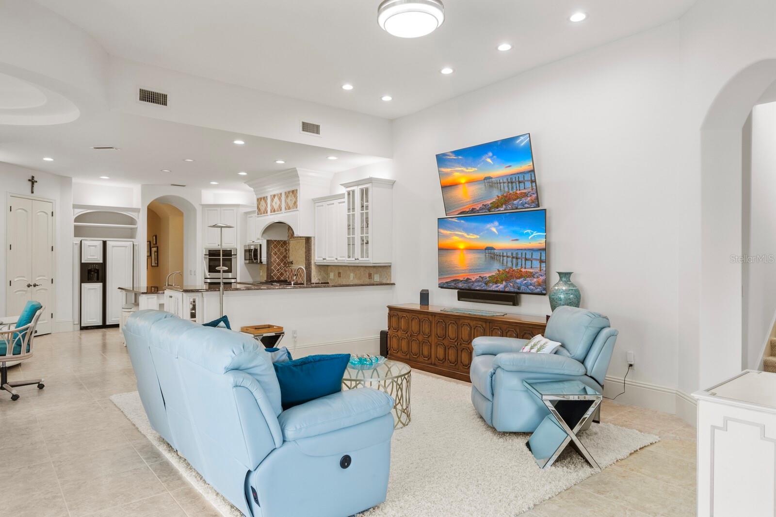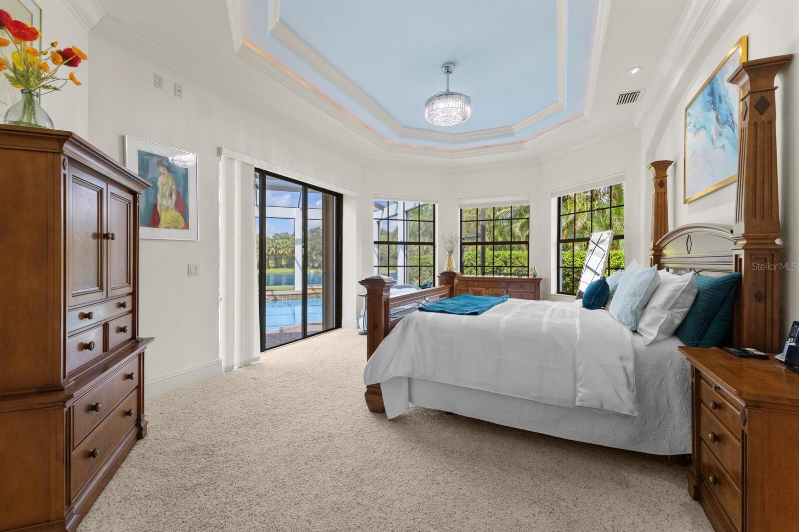 This lovingly maintained Lee Wetherington custom home in Sarasota’s exclusive Founders Club golf community is situated on a private lot which offers breathtaking daily views of wildlife. Whether you’re relaxing on the first-floor lanai or enjoying the upstairs balcony, the unobstructed vistas of nature make it easy to connect with the tranquility of the outdoors. The grand entryway leads to an impressive foyer and formal living area featuring a hand-carved wood and granite natural gas fireplace straight ahead, with an oversized dining room suitable for entertaining on the left. The expansive Florida room boasts three walls of glass sliders, screen windows, a natural gas fireplace, and a wet bar, making it a perfect space for relaxing, entertaining, or even as a playroom or sunroom. The gourmet kitchen is a chef’s dream, featuring two sinks, two GE Profile dishwashers, two GE Monogram ovens (both with convection options), GE Profile Arctica refrigerator, a microwave, stone countertops, and resurfaced off-white cabinetry. The six-burner GE Monogram gas cooktop includes a built-in grill and exterior vented hood, while the large center island contains a prep sink for added convenience. The luxurious primary suite offers two spacious walk-in closets and an impressive bath with dual stone vanities, a jetted tub, and a two-person walk-in shower. Two additional bedrooms, one en suite, are located on the first floor in addition to a 13x15 office with custom storage which can easily accommodate multiple work spaces. Upstairs is ideal for long term guests with its large open area, bedroom and full bath as well as a screened balcony overlooking the serene pond. The bedroom sliders retract at the corners, providing an amazing view of the pond. All closets and shelving throughout the house are custom-built, providing both functionality and style. This exceptional home is equipped with a 40-kilowatt Olympian natural gas whole-house generator. A multi-use, 15-by-13-foot saferoom on the first floor can also serve as a home gym, craft room, or storage area in addition to its stated purpose of providing a safe place during high winds. This home is not in a flood zone and has not experienced water intrusion from storms. Other features include three heating and cooling units, a whole-house water softening and reverse osmosis system, instant hot water faucet in the kitchen and water filling faucet at the stove. Recent upgrades to the pool and spa include a new pump in 2020, resurfacing in 2021, new remote-control system in 2021 and heater in 2022. Various types of memberships in the exclusive Founders Golf Club are available but membership is not required to live in the community. Access to the private golf course from this home is provided by a wooden cart path located just down the street. Home ownership provides access to the Community Center, pickle ball and tennis courts, kids’ playground and multiple activities. This home offers an unparalleled combination of luxury, security, and convenience, making it an ideal retreat for those seeking comfort and tranquility in an exquisite setting.