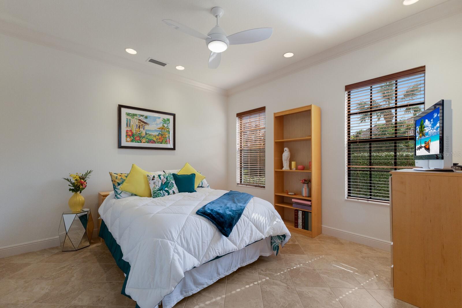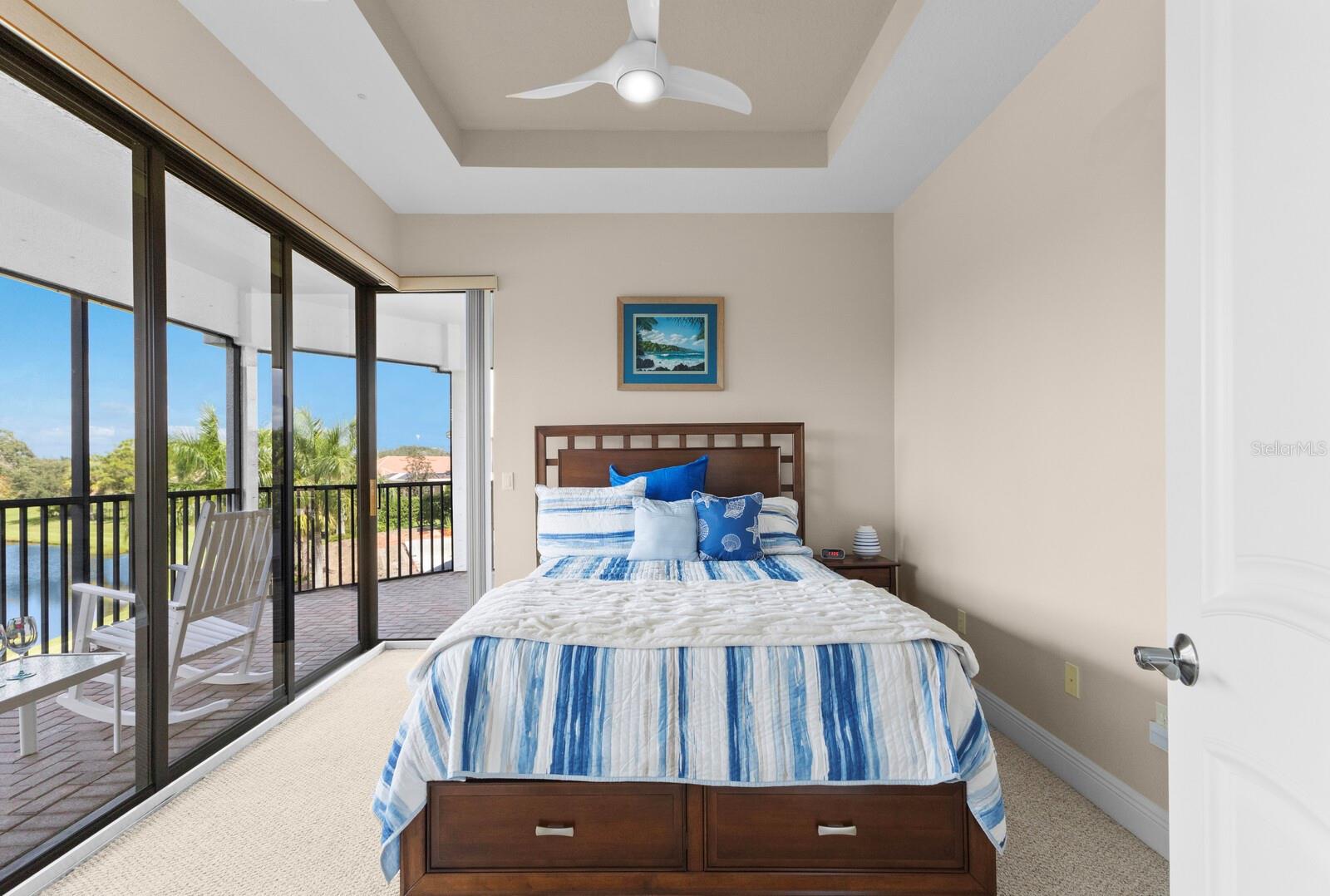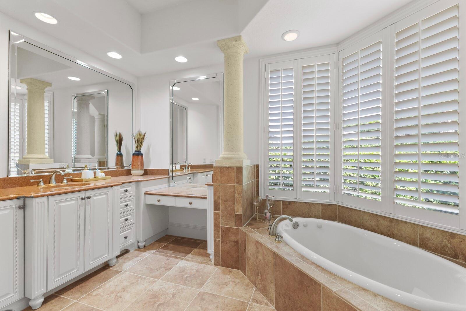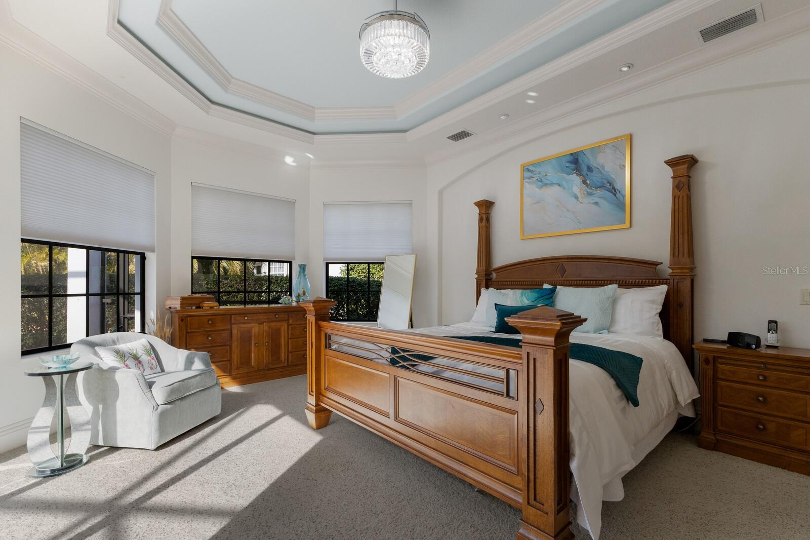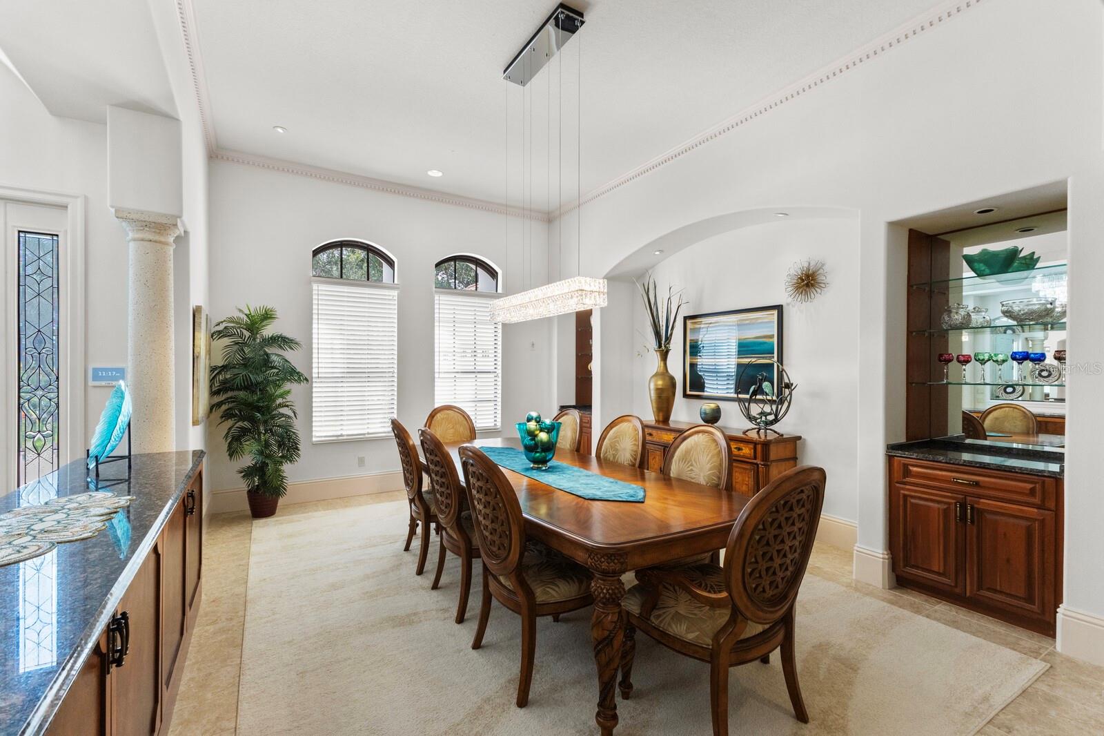 This lovingly maintained Lee Wetherington custom home in Sarasota’s exclusive Founders Club golf community is situated on a private lot which offers breathtaking daily views of wildlife. Whether you’re relaxing on the first-floor lanai or enjoying the upstairs balcony, the unobstructed vistas of nature make it easy to connect with the tranquility of the outdoors. The grand entryway leads to an impressive foyer and formal living area featuring a hand-carved wood and granite natural gas fireplace straight ahead, with an oversized dining room suitable for entertaining on the left. The expansive Florida room boasts three walls of glass sliders, screen windows, a natural gas fireplace, and a wet bar, making it a perfect space for relaxing, entertaining, or even as a playroom or sunroom. The gourmet kitchen is a chef’s dream, featuring two sinks, two GE Profile dishwashers, two GE Monogram ovens (both with convection options), GE Profile Arctica refrigerator, a microwave, stone countertops, and resurfaced off-white cabinetry. The six-burner GE Monogram gas cooktop includes a built-in grill and exterior vented hood, while the large center island contains a prep sink for added convenience. The luxurious primary suite offers two spacious walk-in closets and an impressive bath with dual stone vanities, a jetted tub, and a two-person walk-in shower. Two additional bedrooms, one en suite, are located on the first floor in addition to a 13x15 office with custom storage which can easily accommodate multiple work spaces. Upstairs is ideal for long term guests with its large open area, bedroom and full bath as well as a screened balcony overlooking the serene pond. The bedroom sliders retract at the corners, providing an amazing view of the pond. All closets and shelving throughout the house are custom-built, providing both functionality and style. This exceptional home is equipped with a 40-kilowatt Olympian natural gas whole-house generator. A multi-use, 15-by-13-foot saferoom on the first floor can also serve as a home gym, craft room, or storage area in addition to its stated purpose of providing a safe place during high winds. This home is not in a flood zone and has not experienced water intrusion from storms. Other features include three heating and cooling units, a whole-house water softening and reverse osmosis system, instant hot water faucet in the kitchen and water filling faucet at the stove. Recent upgrades to the pool and spa include a new pump in 2020, resurfacing in 2021, new remote-control system in 2021 and heater in 2022. Various types of memberships in the exclusive Founders Golf Club are available but membership is not required to live in the community. Access to the private golf course from this home is provided by a wooden cart path located just down the street. Home ownership provides access to the Community Center, pickle ball and tennis courts, kids’ playground and multiple activities. This home offers an unparalleled combination of luxury, security, and convenience, making it an ideal retreat for those seeking comfort and tranquility in an exquisite setting.