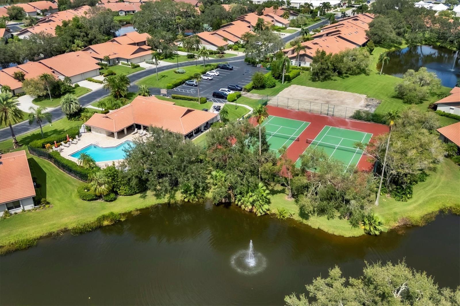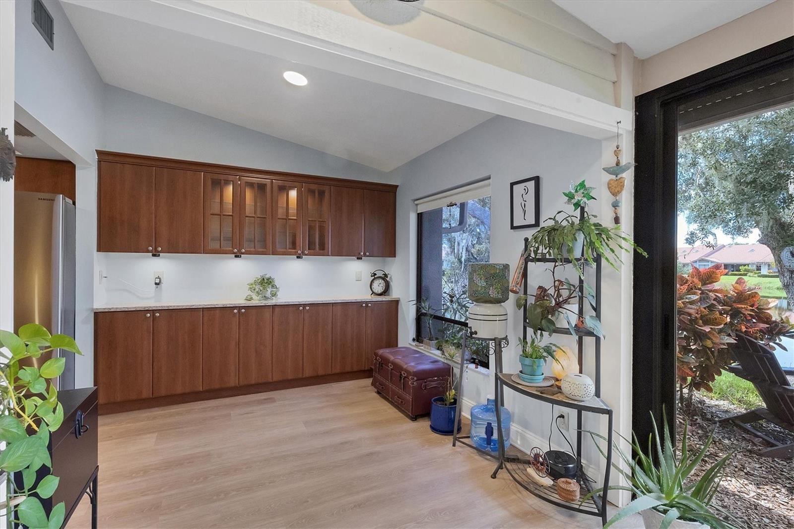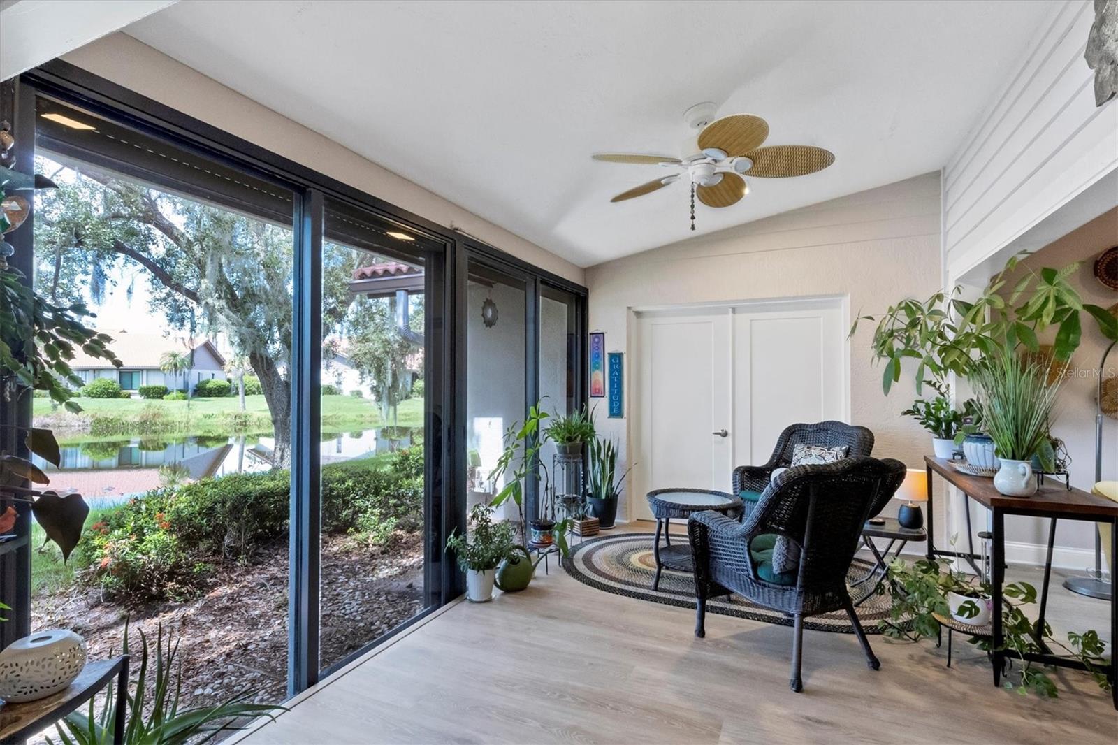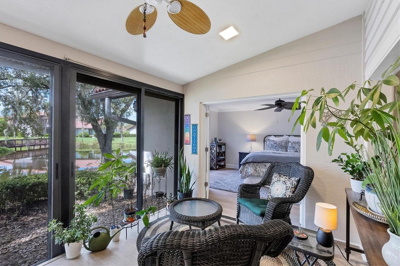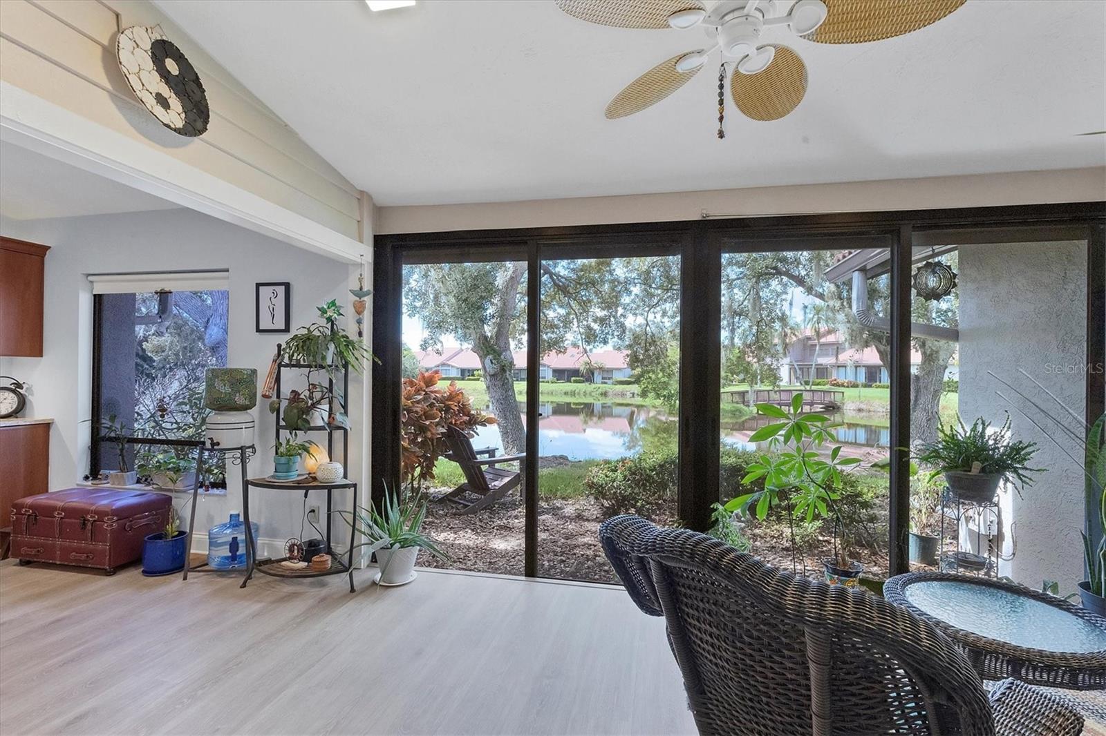 MOVE-IN-ready, maintenance-free villa that perfectly combines modern luxury with serene lakefront living! This meticulously maintained gem boasts breathtaking views of the tranquil lake and surrounding wildlife, offering a peaceful retreat right from your doorstep. Once you enter, you will discover wide plank luxury vinyl flooring that flows throughout, setting the tone for elegance and durability. The beautifully appointed kitchen is a chef's delight, featuring gleaming granite countertops, upgraded cabinetry, and a dry-bar with additional storage in the breakfast room area, ideal for casual dining or entertaining. The spacious living room with vaulted ceilings opens seamlessly into the enclosed lanai, expanding your living space and providing panoramic views of the lake. Imagine enjoying your morning coffee or evening sunsets in this tranquil setting! For added peace of mind, electronic hurricane shutters have been installed at the sliding doors. The master suite is a private sanctuary, complete with crown molding, a generously sized walk-in closet, and a spa-like ensuite bathroom featuring two quartz topped vanities and a large tiled walk-in shower. On the opposite side of the villa, the second bedroom is adjacent to a fully updated bathroom, and the den/office, complete with pocket doors, offers the flexibility to serve as a third bedroom due to its generous size. Convenience and storage are abundant in this home, with a large laundry room, located near the master suite, and two-car garage with extra storage and a hurricane-rated door. Recent updates ensure this home is both energy-efficient and move-in ready, including a new A/C system and ductwork (2021), an advanced air sterilization system (2024), a new dishwasher (2021), and a re-piping of the entire home in 2023. The electrical panel has been upgraded with a surge protector for added safety, and the Association takes care of the tile roof, which was replaced in 2006. Lakeshore Village is an active and welcoming 55+ community, providing a robust array of amenities, including a heated saltwater pool, two tennis courts, pickleball courts (under construction), a clubhouse with a billiard room, library, and a horseshoe court. Residents can enjoy fishing in the community's picturesque lakes under catch-and-release policies while social butterflies will appreciate the numerous community events and gatherings. Located just minutes from top-notch dining, shopping, medical facilities, and only three miles from the world-renowned Siesta Key beach, this home offers the perfect blend of luxury, convenience, and Florida's coastal charm. Don't miss the opportunity to own this immaculate villa, schedule your private showing today!