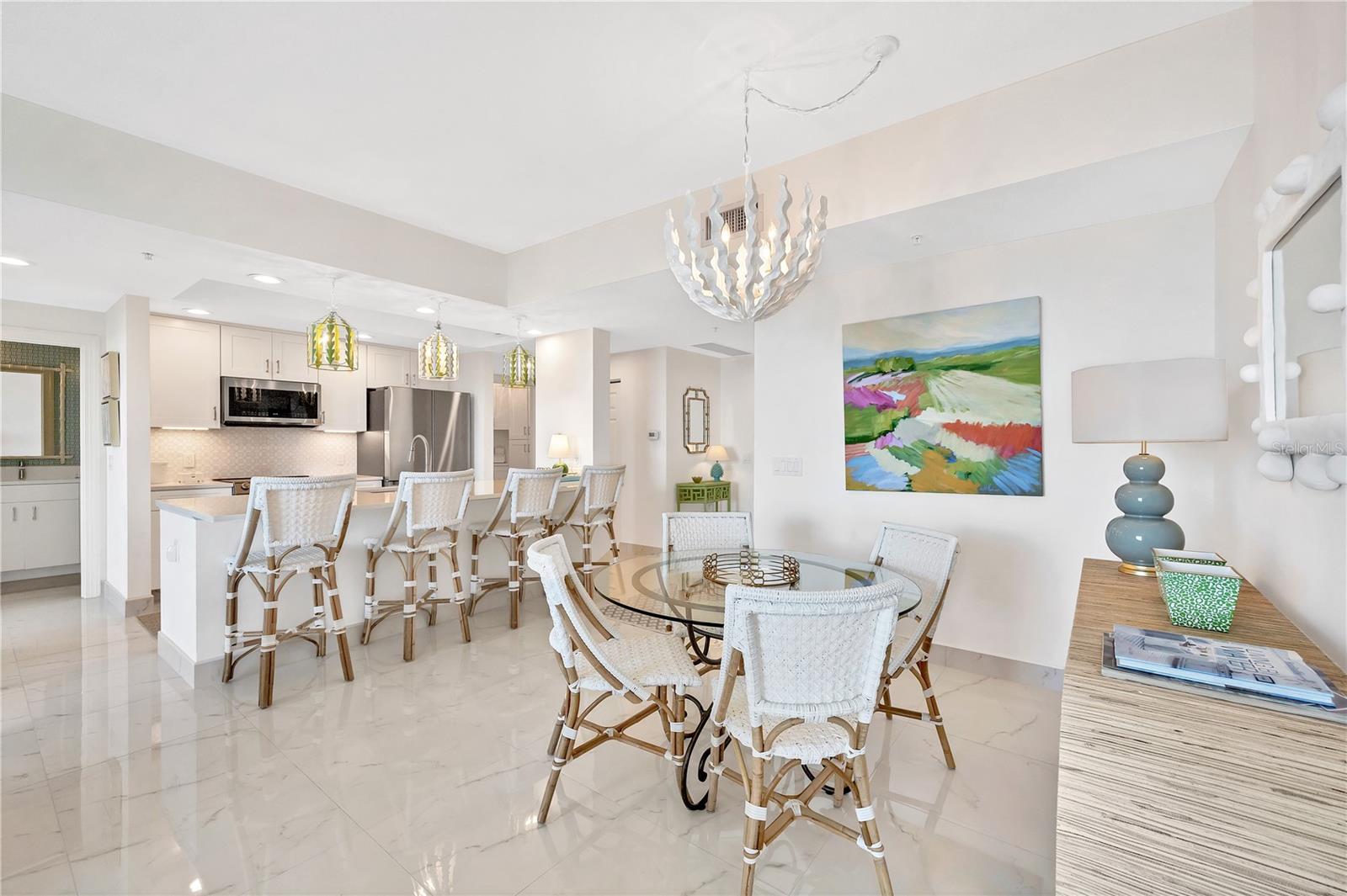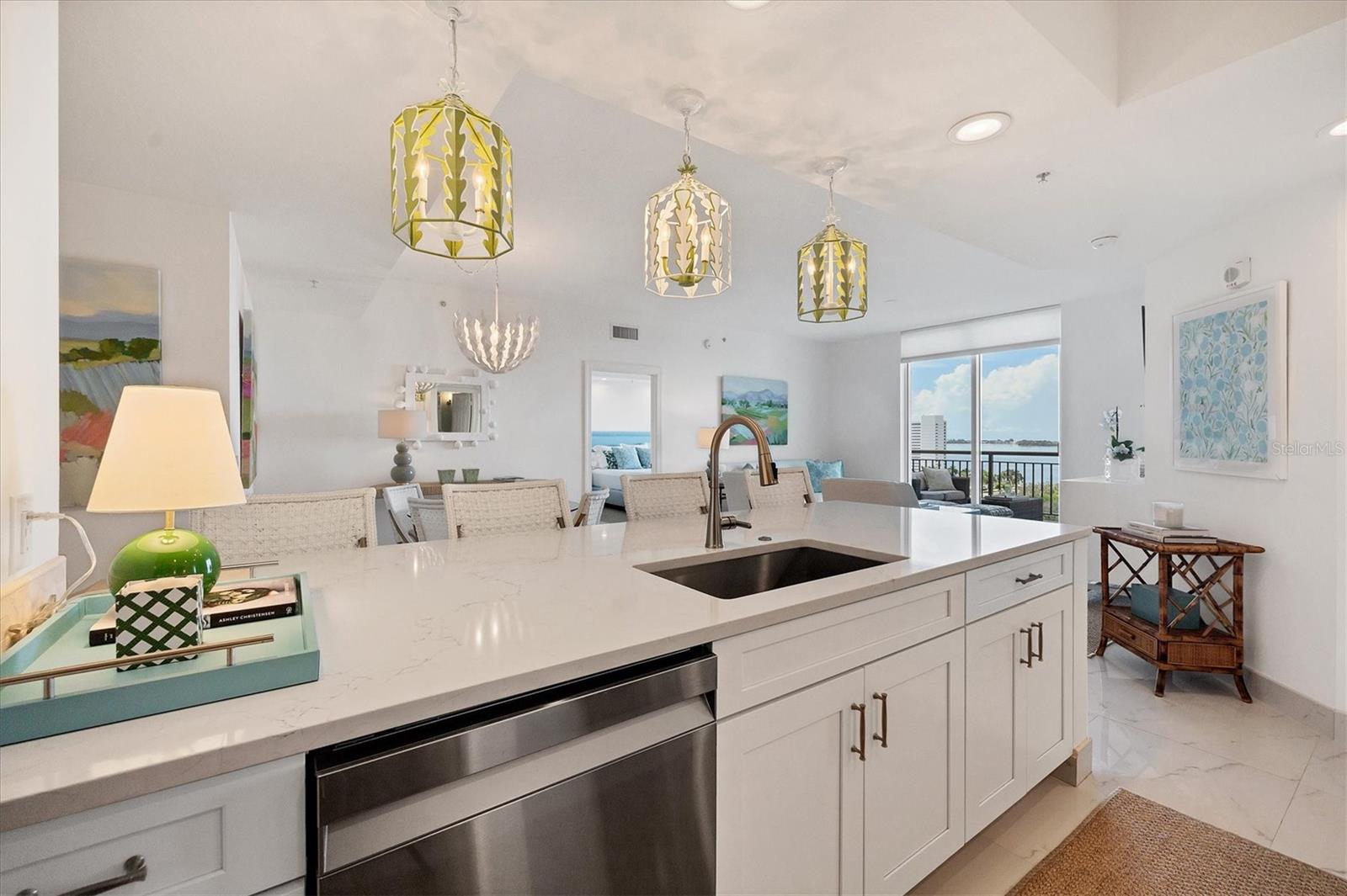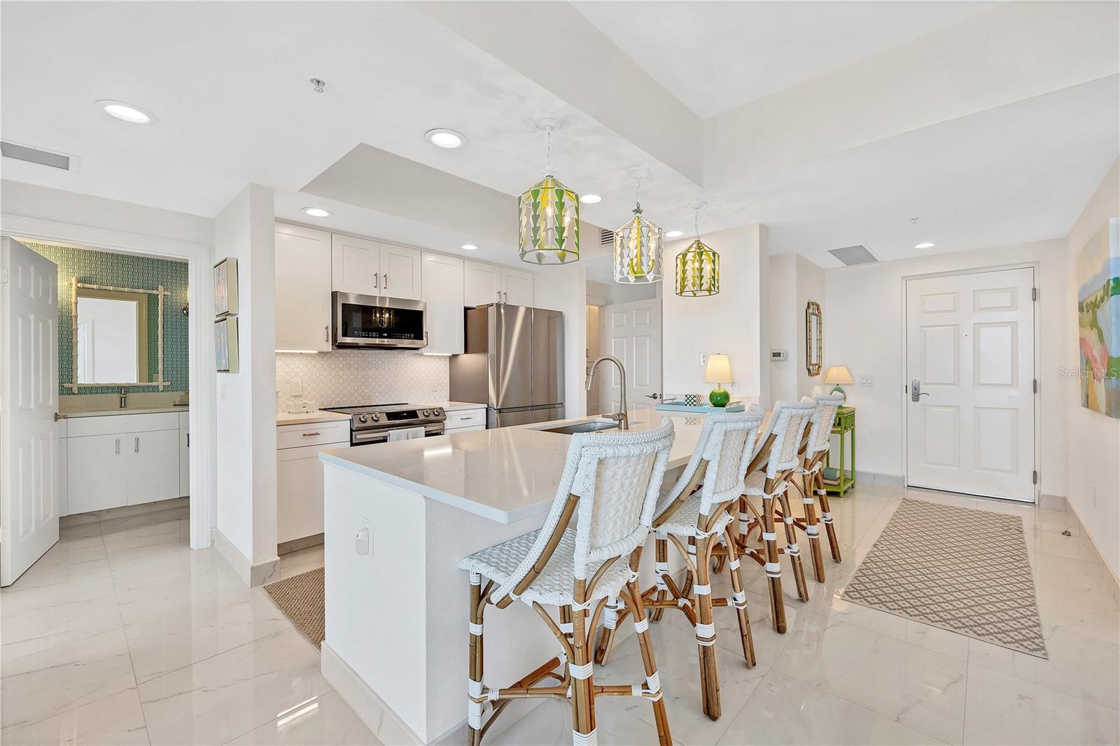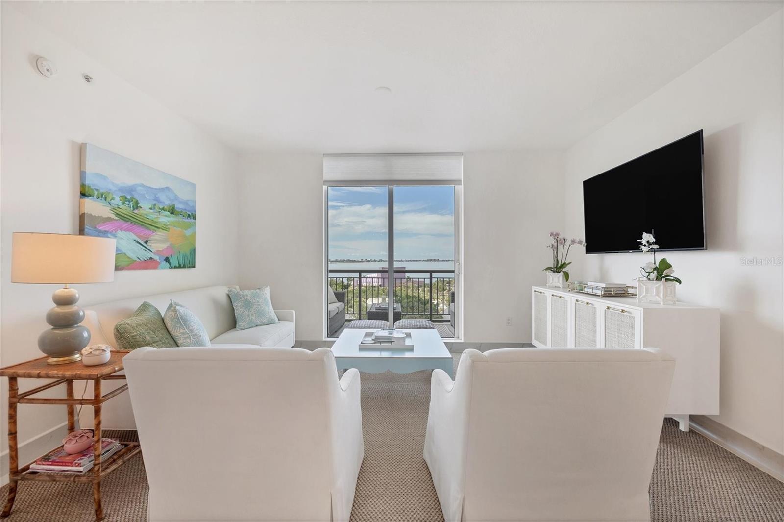Immerse yourself with coastal luxury in this spectacularly designed two-bedroom, two-bath unit in downtown Sarasota. Nearly every surface has been artistically modernized to provide supreme elegance, comfort and functionality. As you step inside, you will be immediately greeted by the bright interior and open floor plan. The sunlight reflects beautifully off the porcelain tile throughout the unit and almost exudes the ambiance that you are walking amongst the clouds, although on the 11th floor. The beautiful porcelain tile is utilized as the baseboards throughout your unit, elevating the look and makes cleaning effortless. Every detail has been accounted for and no expense has been spared when designing your future home. The stately Samsung stainless steel appliance package in the kitchen and laundry room complements the overall atmosphere. The primary bedroom has impeccable views of Sarasota Bay, a large walk-in closet and an en-suite bath. The primary bath is absolutely gorgeous, functional, custom designed and unique to the building's original floor plan design. The primary bath has a large walk-in shower and a large linen/storage closet which is commonly sought-after with condominium living. Your second bedroom is equally large and has two windows that capture views of Sarasota Bay and the Ringling Bridge. No detail has been spared. The laundry room has a beautiful set of built-in cabinetry and a gorgeous lighting fixture. Living here means that you will enjoy the most amazing sunsets on the west coast of Florida! When it comes to selecting your next building to call home, understand that Alinari truly has all the amenities and security that you would want in a Florida condominium building. Beyond the unit itself, Alinari offers a wealth of amenities. Residents of this stunning 18-story condominium high-rise enjoy lovely plazas, fountains and modern resort-style perks. The building is completely secure with key-card entry and 24-hour front desk services, including an overnight guard. The building is in flood zone X and outside the floodplain. Alinari is designed like a fortress and was constructed with reinforced concrete beams, has been fireproofed, and was built on pilings that were drilled deep into the ground for extra added stability and security. The lobby and guest parking spaces are elevated 17 feet above from the base sea level. This unit enjoys two assigned parking spaces (one on the third floor garage and one on the first floor garage), which means your vehicles will be secured and elevated over 30 feet from sea level. From a grand entrance and an impressive lobby to concierge services, on-site management, secured parking, a clubroom, business center, fitness center and even a resident theater, every need is catered to. The location couldn't be better. In an Italian villa-inspired building, Alinari is in the heart of Sarasota's cultural district. You'll have access to all social events the city has to offer. Don't miss out on this opportunity to experience the epitome of downtown Sarasota living.