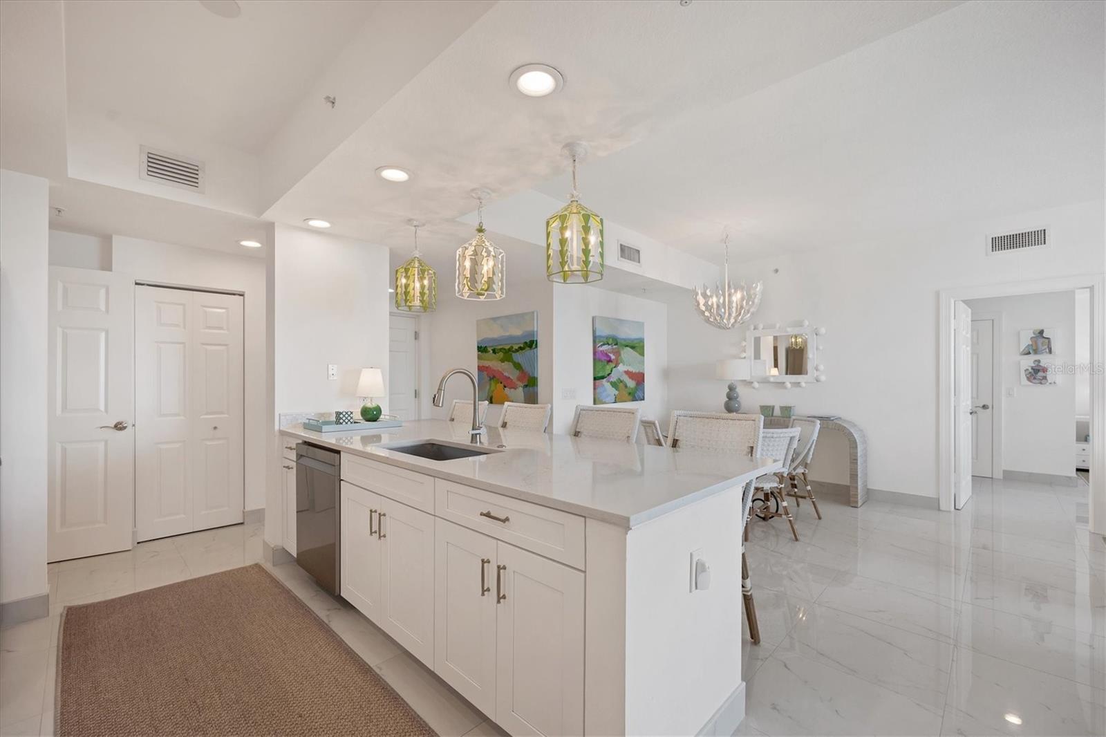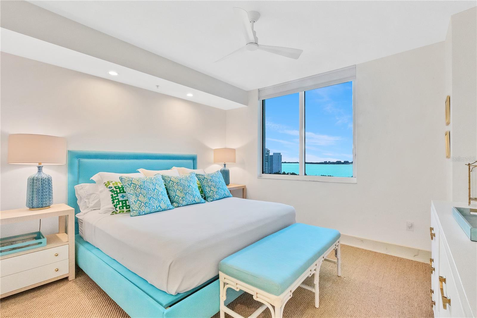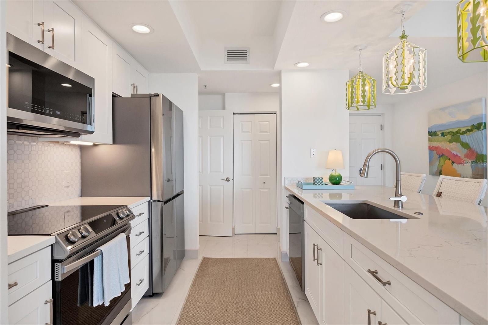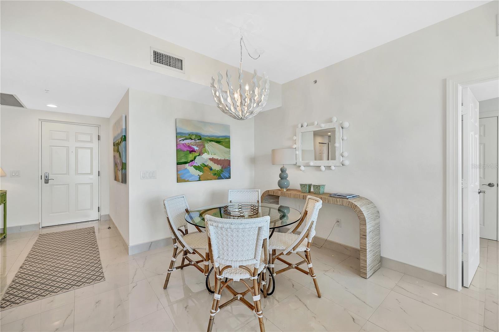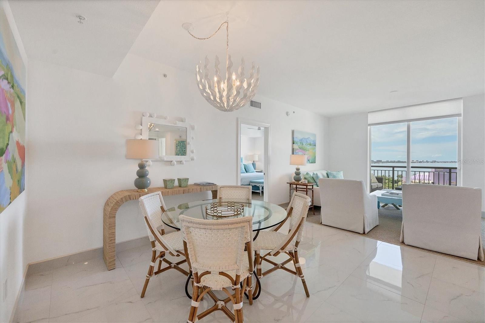 Immerse yourself with coastal luxury in this spectacularly designed two-bedroom, two-bath unit in downtown Sarasota. Nearly every surface has been artistically modernized to provide supreme elegance, comfort and functionality. As you step inside, you will be immediately greeted by the bright interior and open floor plan. The sunlight reflects beautifully off the porcelain tile throughout the unit and almost exudes the ambiance that you are walking amongst the clouds, although on the 11th floor. The beautiful porcelain tile is utilized as the baseboards throughout your unit, elevating the look and makes cleaning effortless. Every detail has been accounted for and no expense has been spared when designing your future home. The stately Samsung stainless steel appliance package in the kitchen and laundry room complements the overall atmosphere. The primary bedroom has impeccable views of Sarasota Bay, a large walk-in closet and an en-suite bath. The primary bath is absolutely gorgeous, functional, custom designed and unique to the building's original floor plan design. The primary bath has a large walk-in shower and a large linen/storage closet which is commonly sought-after with condominium living. Your second bedroom is equally large and has two windows that capture views of Sarasota Bay and the Ringling Bridge. No detail has been spared. The laundry room has a beautiful set of built-in cabinetry and a gorgeous lighting fixture. Living here means that you will enjoy the most amazing sunsets on the west coast of Florida! When it comes to selecting your next building to call home, understand that Alinari truly has all the amenities and security that you would want in a Florida condominium building. Beyond the unit itself, Alinari offers a wealth of amenities. Residents of this stunning 18-story condominium high-rise enjoy lovely plazas, fountains and modern resort-style perks. The building is completely secure with key-card entry and 24-hour front desk services, including an overnight guard. The building is in flood zone X and outside the floodplain. Alinari is designed like a fortress and was constructed with reinforced concrete beams, has been fireproofed, and was built on pilings that were drilled deep into the ground for extra added stability and security. The lobby and guest parking spaces are elevated 17 feet above from the base sea level. This unit enjoys two assigned parking spaces (one on the third floor garage and one on the first floor garage), which means your vehicles will be secured and elevated over 30 feet from sea level. From a grand entrance and an impressive lobby to concierge services, on-site management, secured parking, a clubroom, business center, fitness center and even a resident theater, every need is catered to. The location couldn't be better. In an Italian villa-inspired building, Alinari is in the heart of Sarasota's cultural district. You'll have access to all social events the city has to offer. Don't miss out on this opportunity to experience the epitome of downtown Sarasota living.