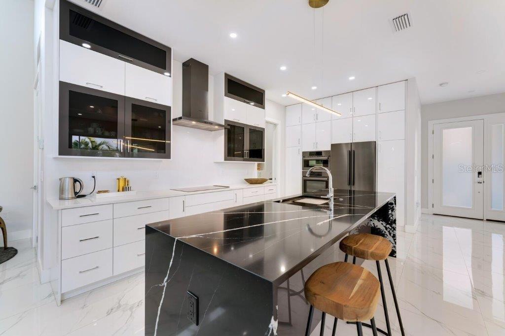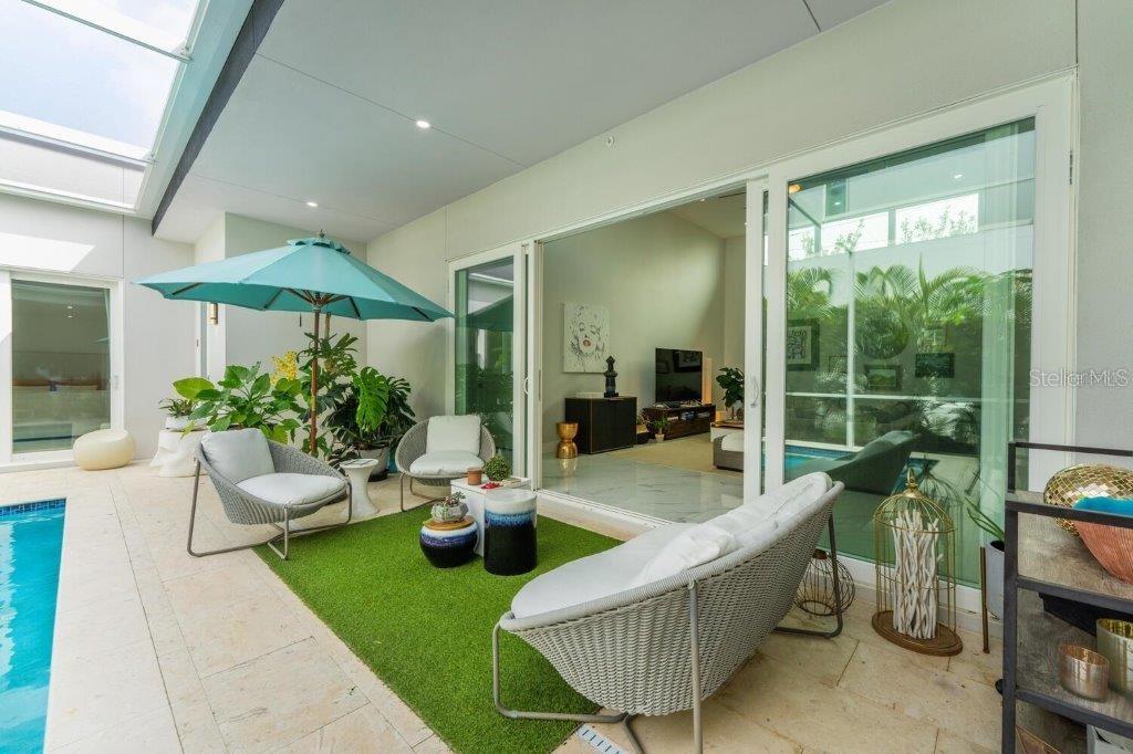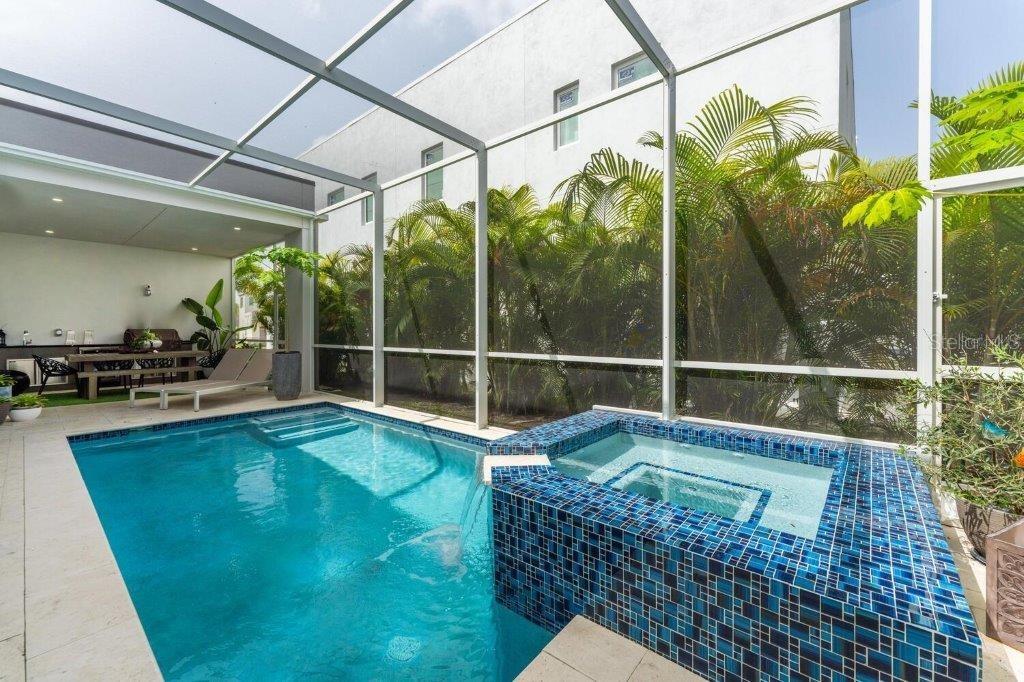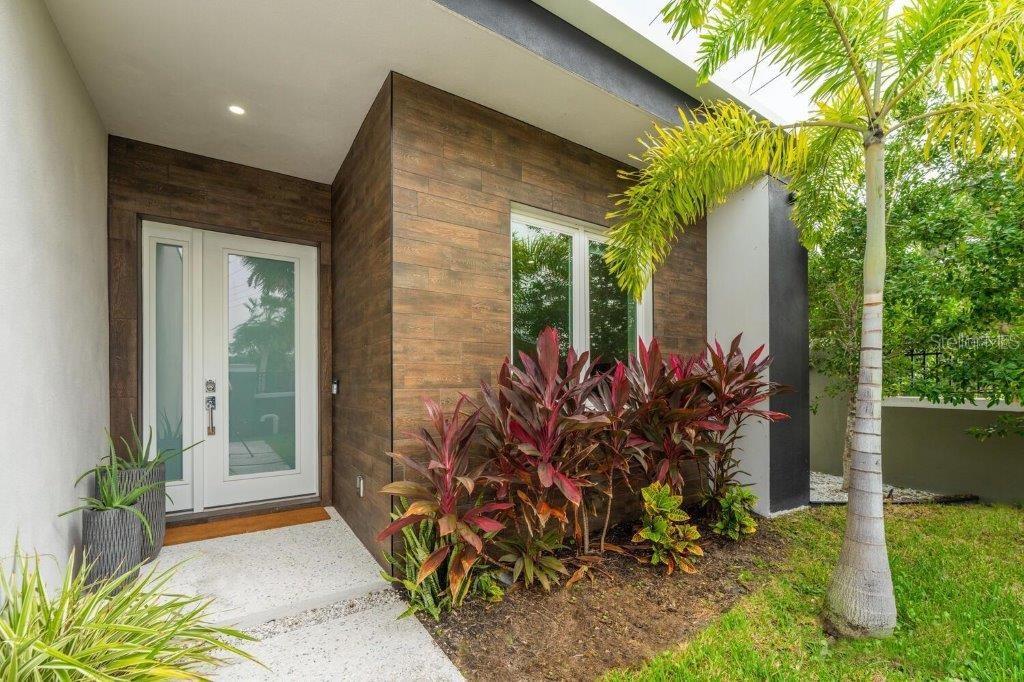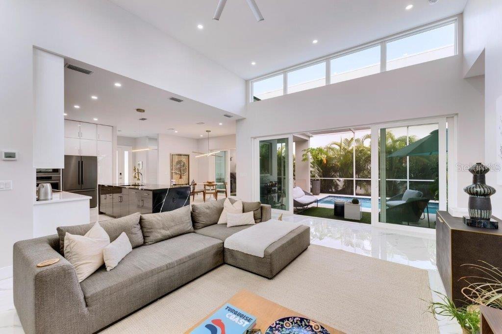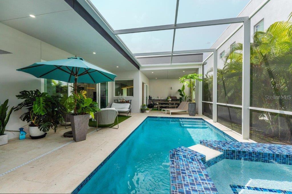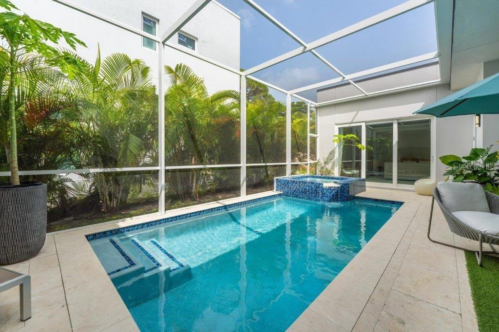 This stunning modern DSDG Architects home is located in an exclusive waterfront community on Phillippi Creek that lets you enjoy Florida's lifestyle unlike any other. Water access but NOT in the flood zone. The 3-bedroom, 3.5-bath plus office/den home has 2,870 sq ft of high-end living space. Jeld Wen impact windows, 14ft high ceilings, hybrid water heater, and a level 5 smooth drywall finish. Awash with abundant natural light throughout the home that accentuates the open floor plan. The bright living area meets the enclosed lanai space with large glass slider doors from different areas of the home creating a seamless indoor-outdoor living. A gourmet kitchen with European cabinetry, top-of-the-line German appliances, exotic quartz countertops, and a bespoke waterfall edge island with modern brass light fixtures are a delight for meals and gatherings. Large, attached pantry room and a separate laundry room. The outdoor lounge area has a matching outdoor kitchen with a grill and a resort-style saltwater heated pool, jacuzzi spa, outdoor shower and more. Sinful self-indulgence is fully realized in the generous primary suite with his & hers walk-in closets; and primary bath with dual rain showers and a large soaking tub. The other two bedrooms each have a luxe, spa-like bath and private walk-in closets. Private backyard access, and a south wall built to create a sound barrier to add to the peace and quiet within the home. Community's amenities include creek access for canoeing and boating; a large private dog park; and a possibility of boat slip rental. Close proximity to the top-rated schools, Landings shopping mall, Siesta Key beach and downtown gives you access to the best that Sarasota has to offer. This house will make a wonderful family home, pied-a-terre, or a great investment.