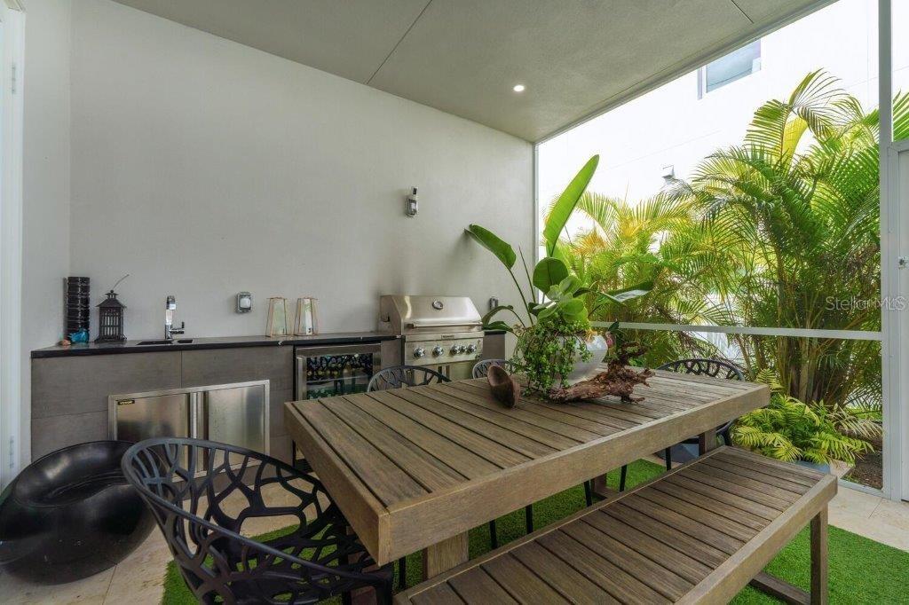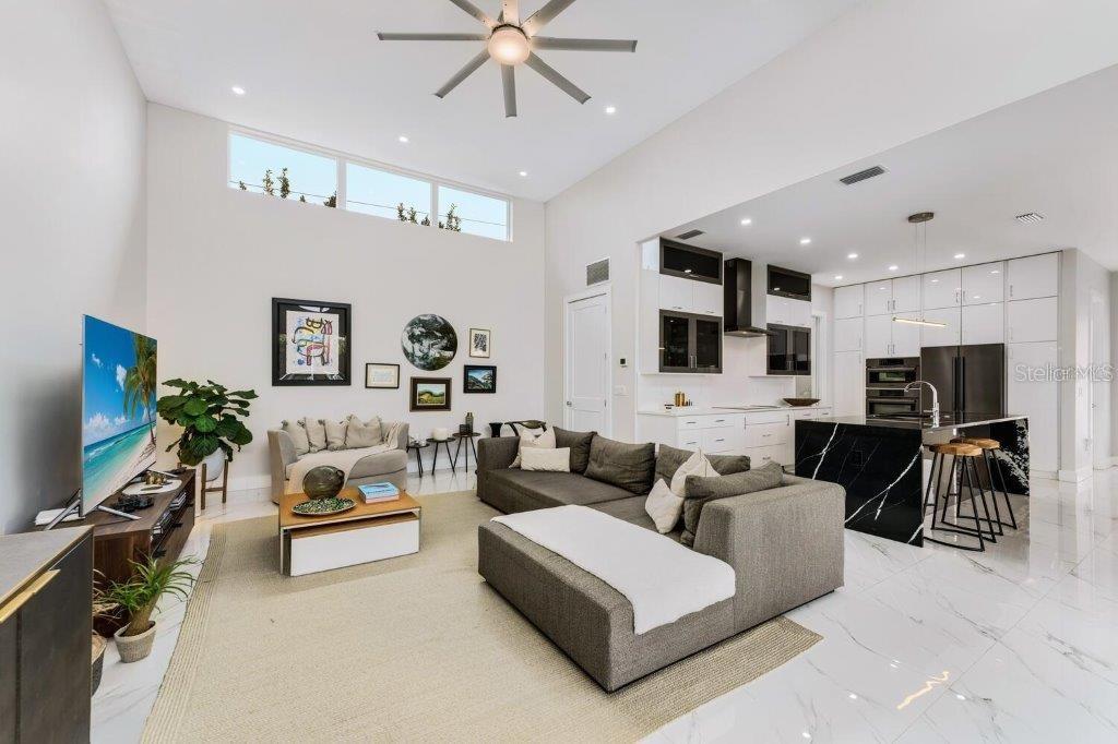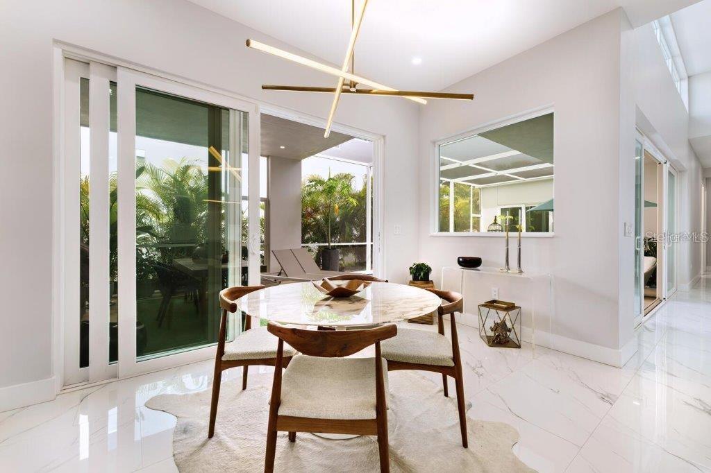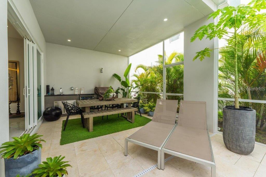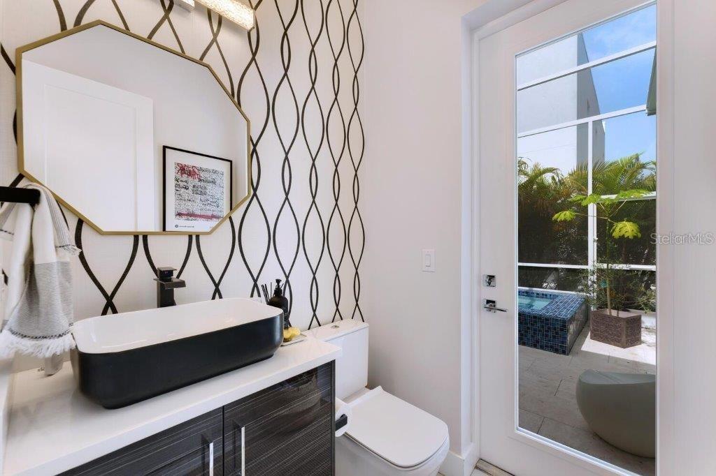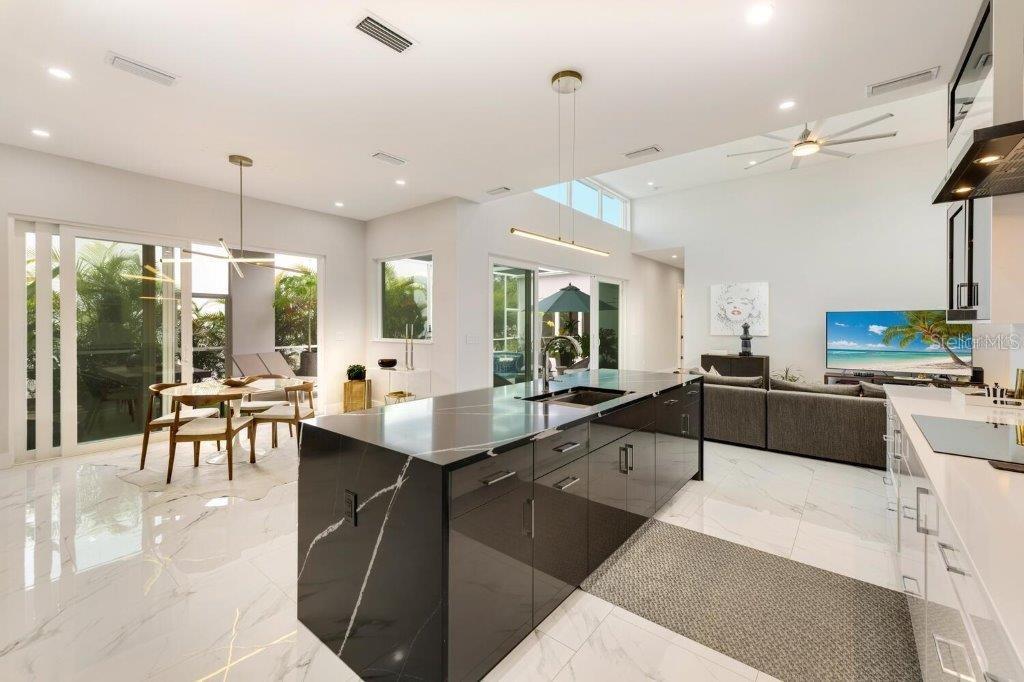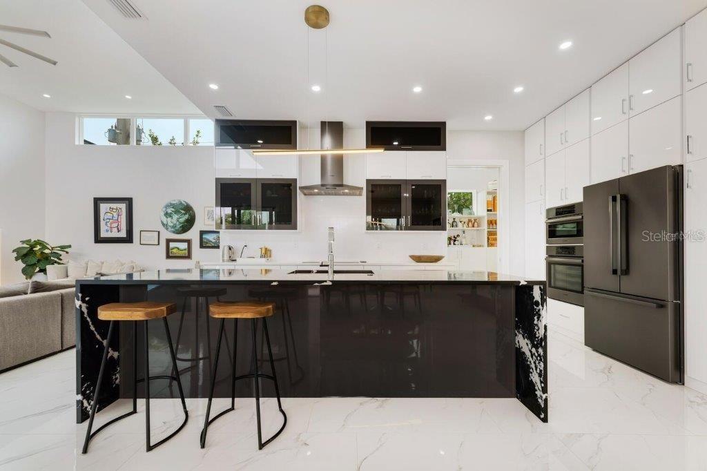 This stunning modern DSDG Architects home is located in an exclusive waterfront community on Phillippi Creek that lets you enjoy Florida's lifestyle unlike any other. Water access but NOT in the flood zone. The 3-bedroom, 3.5-bath plus office/den home has 2,870 sq ft of high-end living space. Jeld Wen impact windows, 14ft high ceilings, hybrid water heater, and a level 5 smooth drywall finish. Awash with abundant natural light throughout the home that accentuates the open floor plan. The bright living area meets the enclosed lanai space with large glass slider doors from different areas of the home creating a seamless indoor-outdoor living. A gourmet kitchen with European cabinetry, top-of-the-line German appliances, exotic quartz countertops, and a bespoke waterfall edge island with modern brass light fixtures are a delight for meals and gatherings. Large, attached pantry room and a separate laundry room. The outdoor lounge area has a matching outdoor kitchen with a grill and a resort-style saltwater heated pool, jacuzzi spa, outdoor shower and more. Sinful self-indulgence is fully realized in the generous primary suite with his & hers walk-in closets; and primary bath with dual rain showers and a large soaking tub. The other two bedrooms each have a luxe, spa-like bath and private walk-in closets. Private backyard access, and a south wall built to create a sound barrier to add to the peace and quiet within the home. Community's amenities include creek access for canoeing and boating; a large private dog park; and a possibility of boat slip rental. Close proximity to the top-rated schools, Landings shopping mall, Siesta Key beach and downtown gives you access to the best that Sarasota has to offer. This house will make a wonderful family home, pied-a-terre, or a great investment.