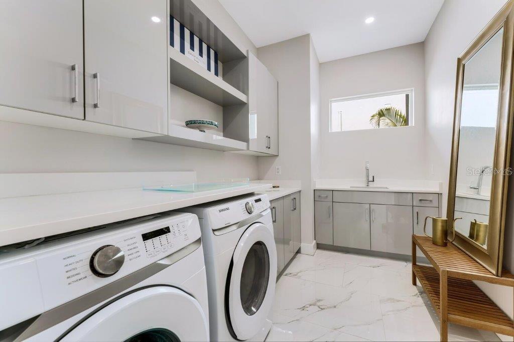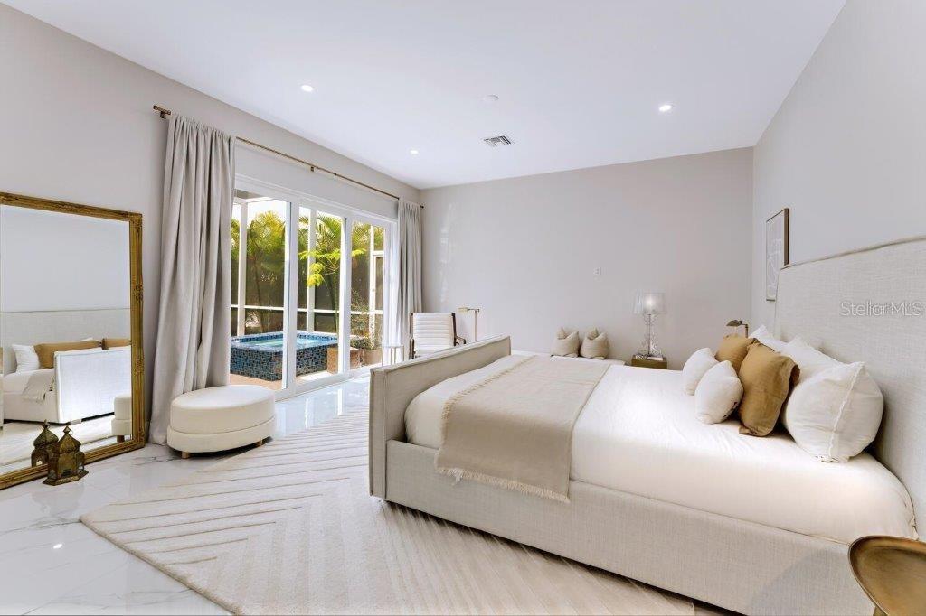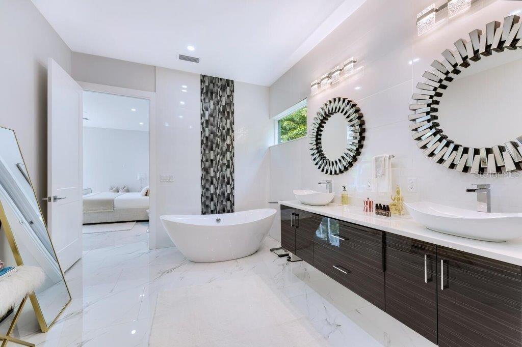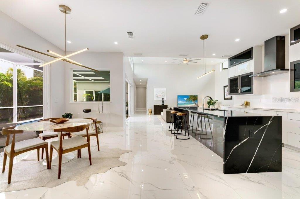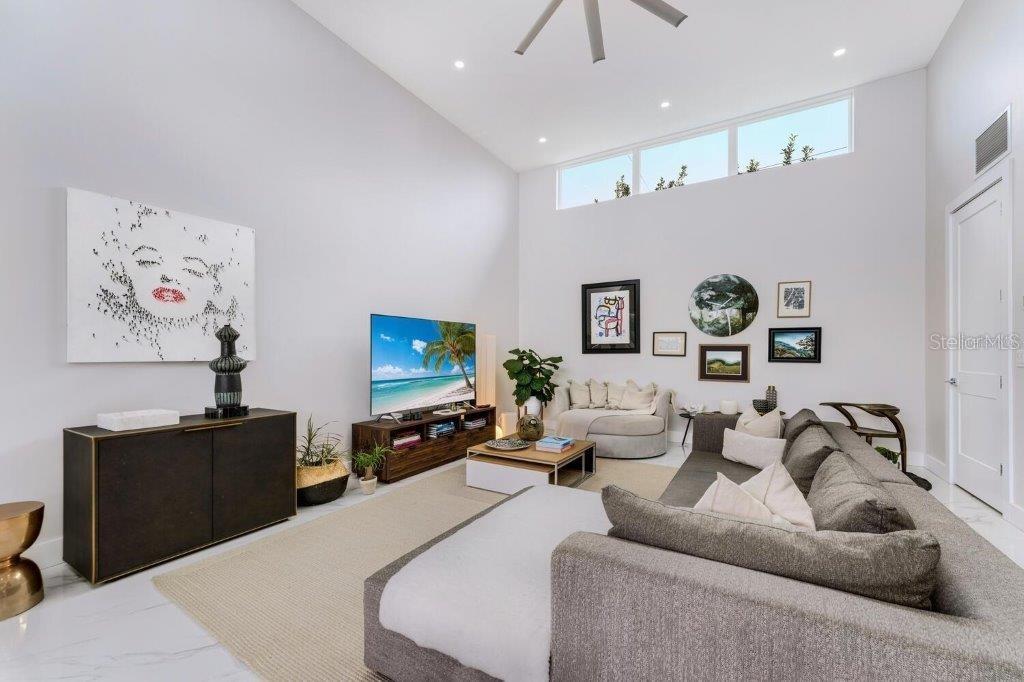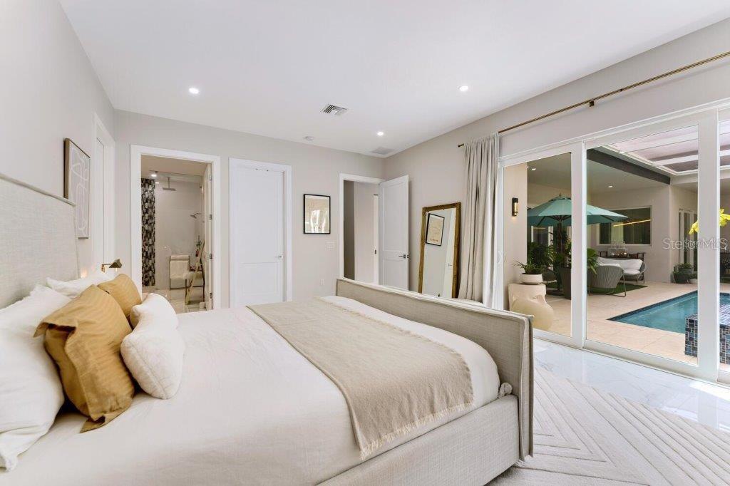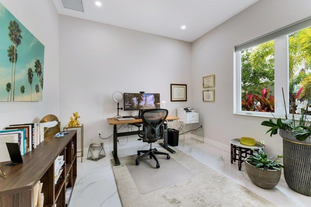 This stunning modern DSDG Architects home is located in an exclusive waterfront community on Phillippi Creek that lets you enjoy Florida's lifestyle unlike any other. Water access but NOT in the flood zone. The 3-bedroom, 3.5-bath plus office/den home has 2,870 sq ft of high-end living space. Jeld Wen impact windows, 14ft high ceilings, hybrid water heater, and a level 5 smooth drywall finish. Awash with abundant natural light throughout the home that accentuates the open floor plan. The bright living area meets the enclosed lanai space with large glass slider doors from different areas of the home creating a seamless indoor-outdoor living. A gourmet kitchen with European cabinetry, top-of-the-line German appliances, exotic quartz countertops, and a bespoke waterfall edge island with modern brass light fixtures are a delight for meals and gatherings. Large, attached pantry room and a separate laundry room. The outdoor lounge area has a matching outdoor kitchen with a grill and a resort-style saltwater heated pool, jacuzzi spa, outdoor shower and more. Sinful self-indulgence is fully realized in the generous primary suite with his & hers walk-in closets; and primary bath with dual rain showers and a large soaking tub. The other two bedrooms each have a luxe, spa-like bath and private walk-in closets. Private backyard access, and a south wall built to create a sound barrier to add to the peace and quiet within the home. Community's amenities include creek access for canoeing and boating; a large private dog park; and a possibility of boat slip rental. Close proximity to the top-rated schools, Landings shopping mall, Siesta Key beach and downtown gives you access to the best that Sarasota has to offer. This house will make a wonderful family home, pied-a-terre, or a great investment.