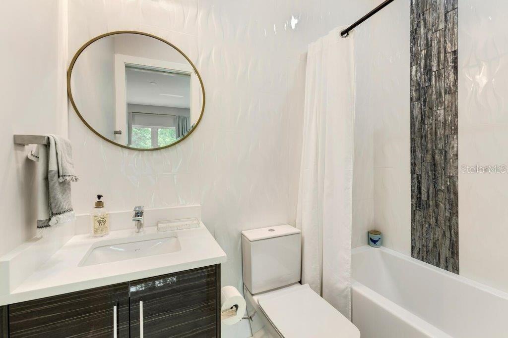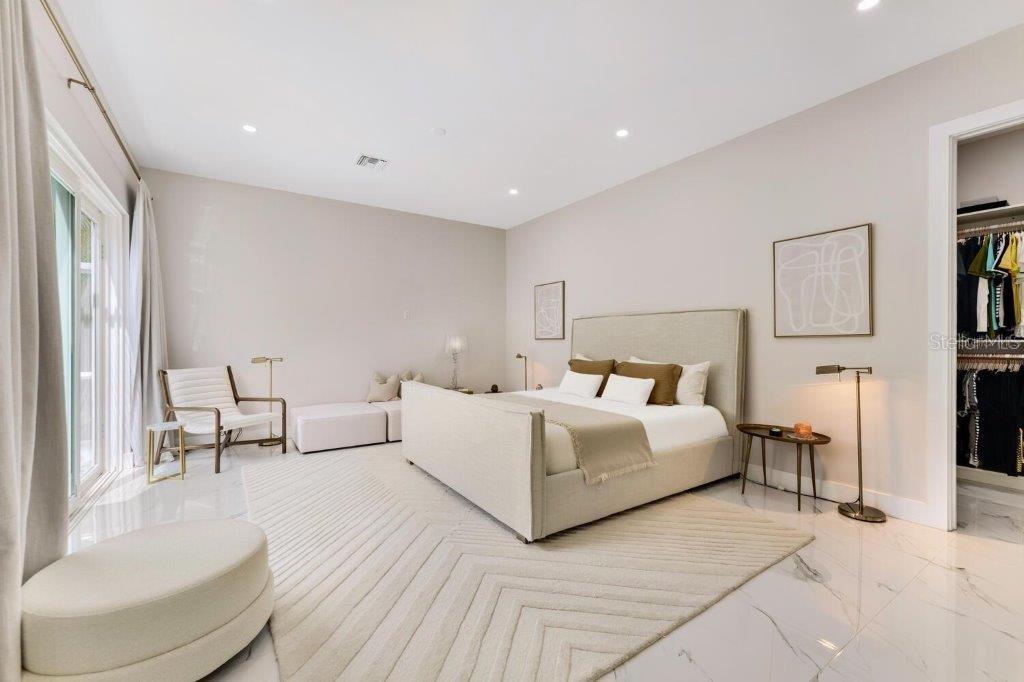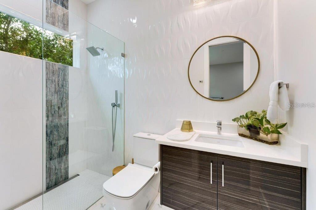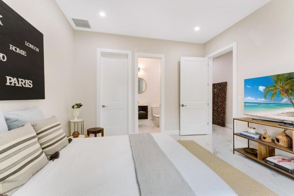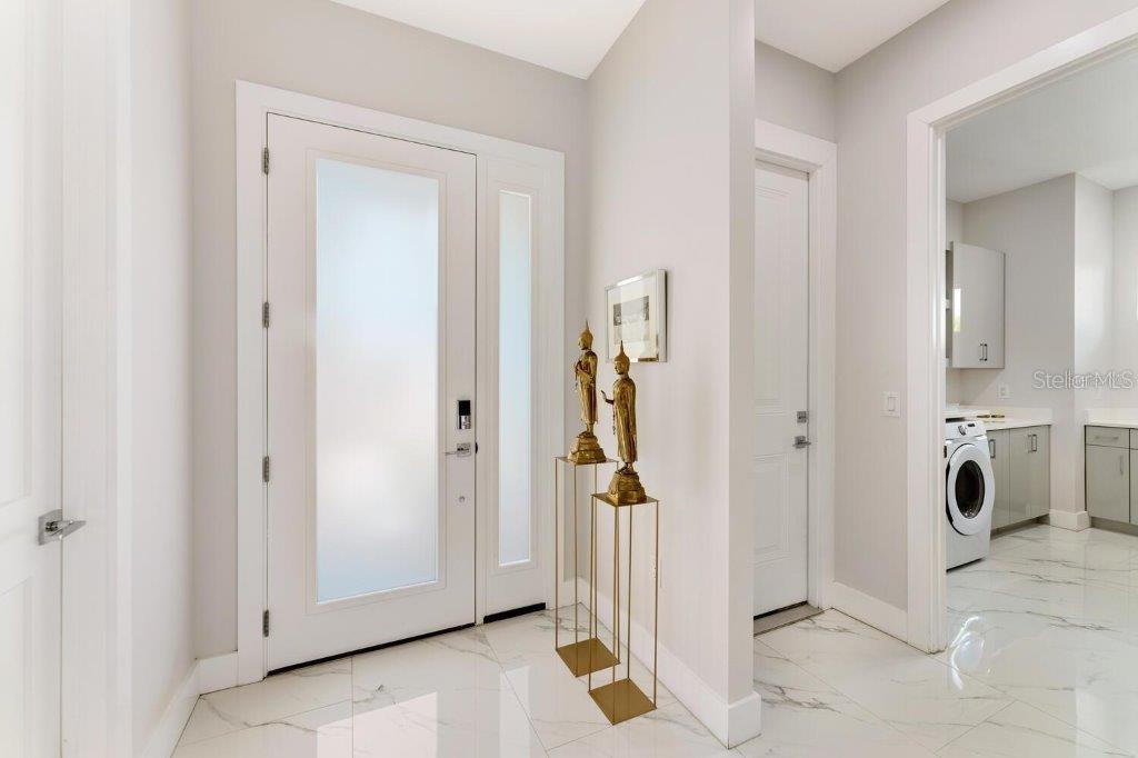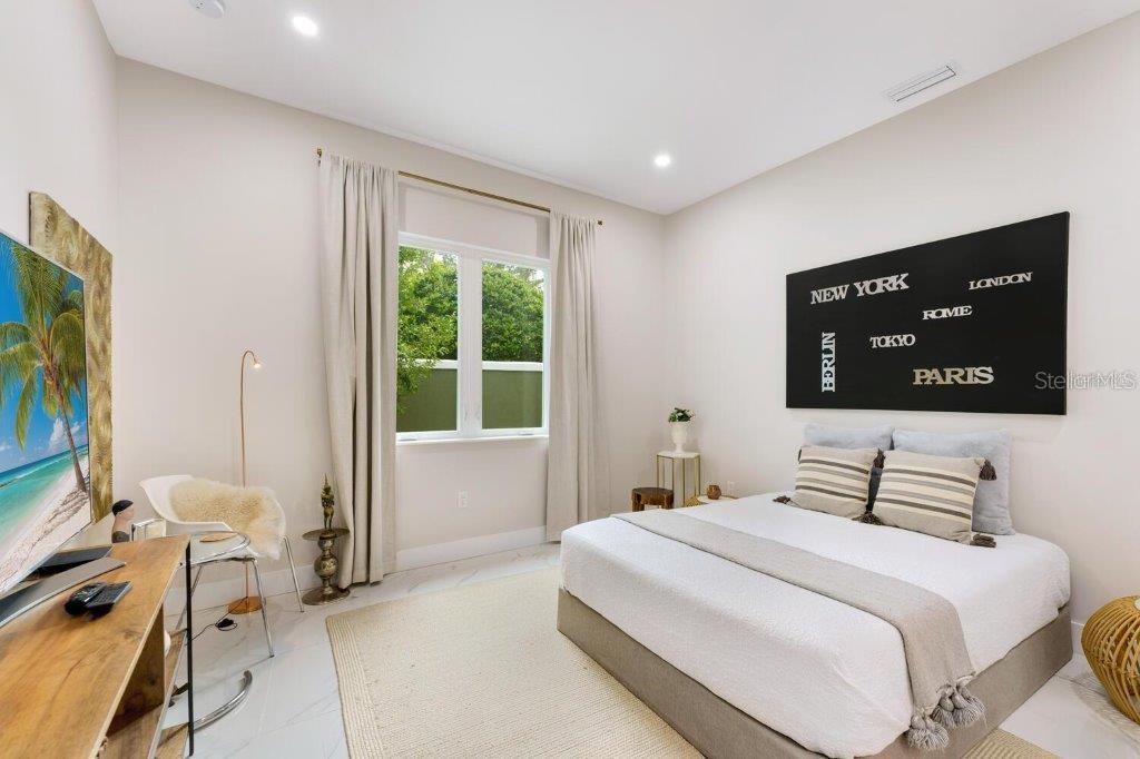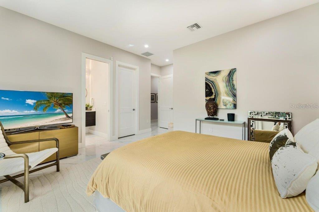 This stunning modern DSDG Architects home is located in an exclusive waterfront community on Phillippi Creek that lets you enjoy Florida's lifestyle unlike any other. Water access but NOT in the flood zone. The 3-bedroom, 3.5-bath plus office/den home has 2,870 sq ft of high-end living space. Jeld Wen impact windows, 14ft high ceilings, hybrid water heater, and a level 5 smooth drywall finish. Awash with abundant natural light throughout the home that accentuates the open floor plan. The bright living area meets the enclosed lanai space with large glass slider doors from different areas of the home creating a seamless indoor-outdoor living. A gourmet kitchen with European cabinetry, top-of-the-line German appliances, exotic quartz countertops, and a bespoke waterfall edge island with modern brass light fixtures are a delight for meals and gatherings. Large, attached pantry room and a separate laundry room. The outdoor lounge area has a matching outdoor kitchen with a grill and a resort-style saltwater heated pool, jacuzzi spa, outdoor shower and more. Sinful self-indulgence is fully realized in the generous primary suite with his & hers walk-in closets; and primary bath with dual rain showers and a large soaking tub. The other two bedrooms each have a luxe, spa-like bath and private walk-in closets. Private backyard access, and a south wall built to create a sound barrier to add to the peace and quiet within the home. Community's amenities include creek access for canoeing and boating; a large private dog park; and a possibility of boat slip rental. Close proximity to the top-rated schools, Landings shopping mall, Siesta Key beach and downtown gives you access to the best that Sarasota has to offer. This house will make a wonderful family home, pied-a-terre, or a great investment.