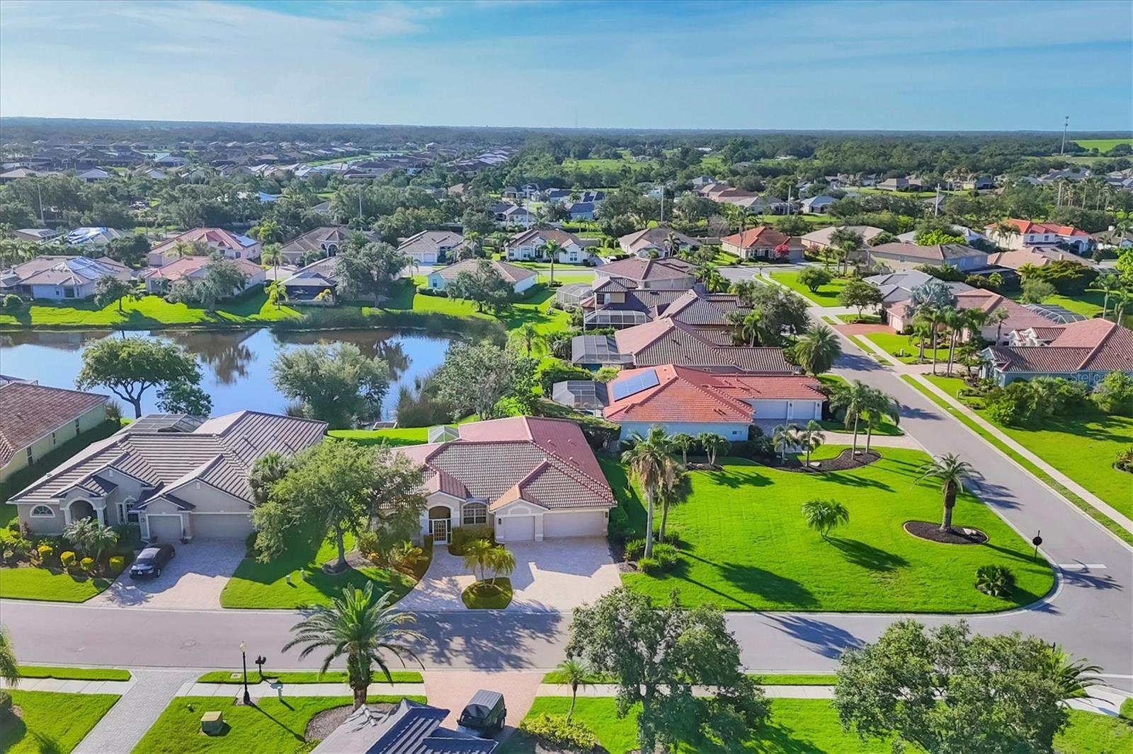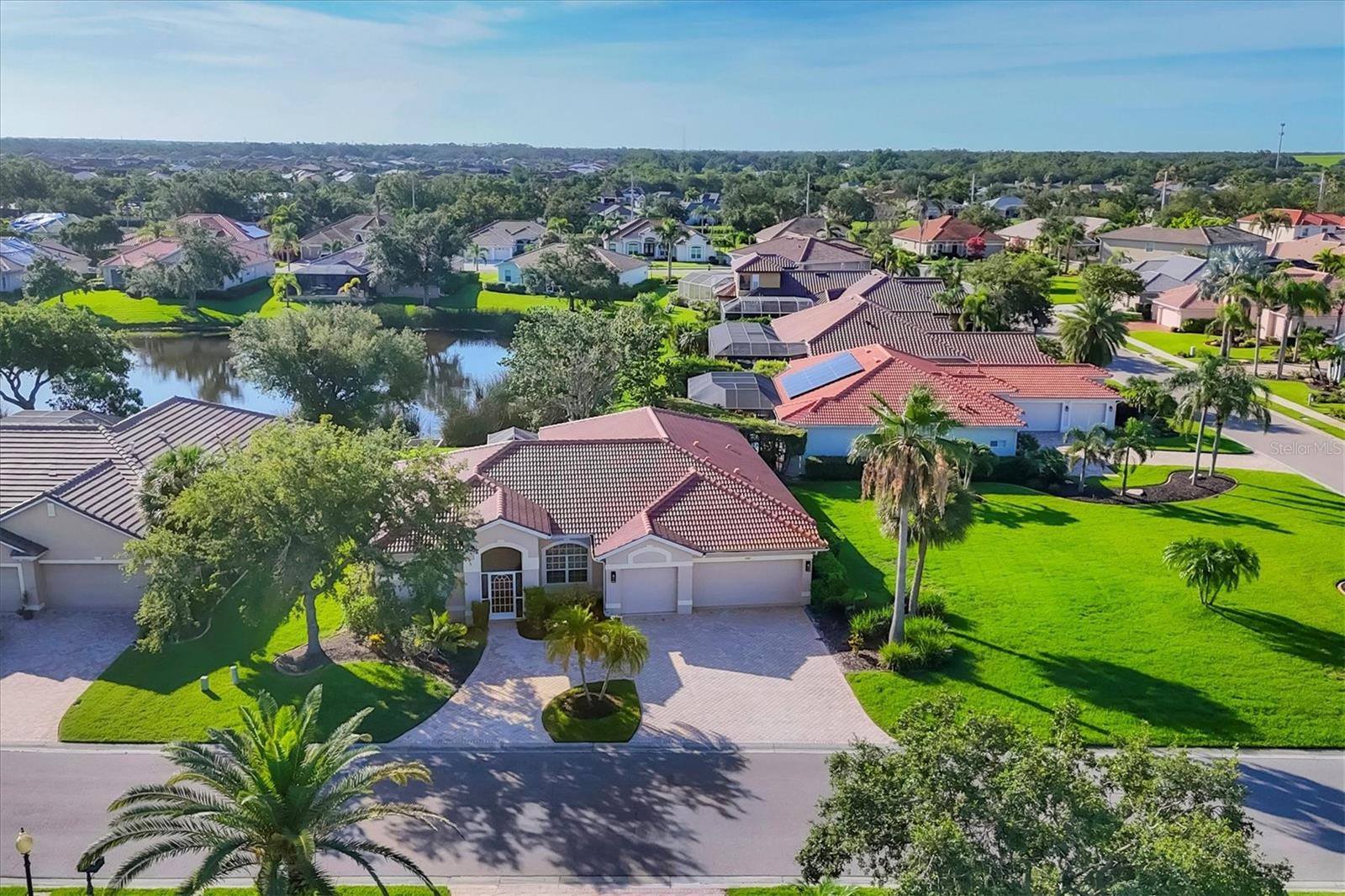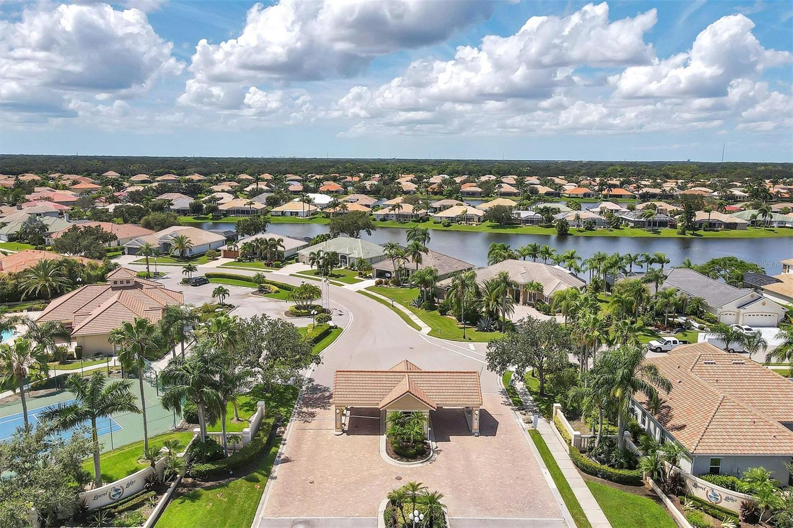 Come live the Florida lifestyle in this split plan, lakefront home with a THREE CAR GARAGE in the desirable gated community of Laurel Lakes. It’s easy living in this ONE LEVEL floor plan with HIGH CEILINGS and MULTIPLE SETS OF 8’ POCKET SLIDERS to the lanai. Tranquil water views visible from all main living areas including the primary bedroom as well as the back guest bedroom. BRAND NEW TILE ROOF INSTALLED NOV. 2024. Pull down attic access in garage for extra storage and a three car garage and paver circular driveway provide ample space for cars. HURRICANE RATED GARAGE DOORS and SHUTTERS for peace of mind and lower insurance costs. An expansive corner lot adds to the privacy and the mature landscaping adds curb appeal. Laurel Lakes is a well-maintained community offering low HOA fees, including a clubhouse with a heated pool, fitness center, pickleball/tennis courts and lots of planned social activities! Located close to everything wonderful Sarasota has to offer. Only 15-20 minutes to Downtown Sarasota, 15 min to University Town Center and Waterside, 5-10 min to hiking in beautiful Celery Fields and Rothenbach park and 25-30 minutes to Lido or Siesta Key beach! Come check it out and make this your new place to call home!