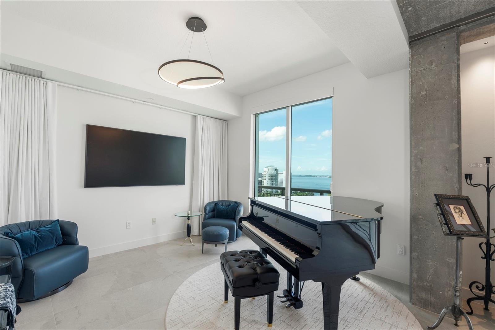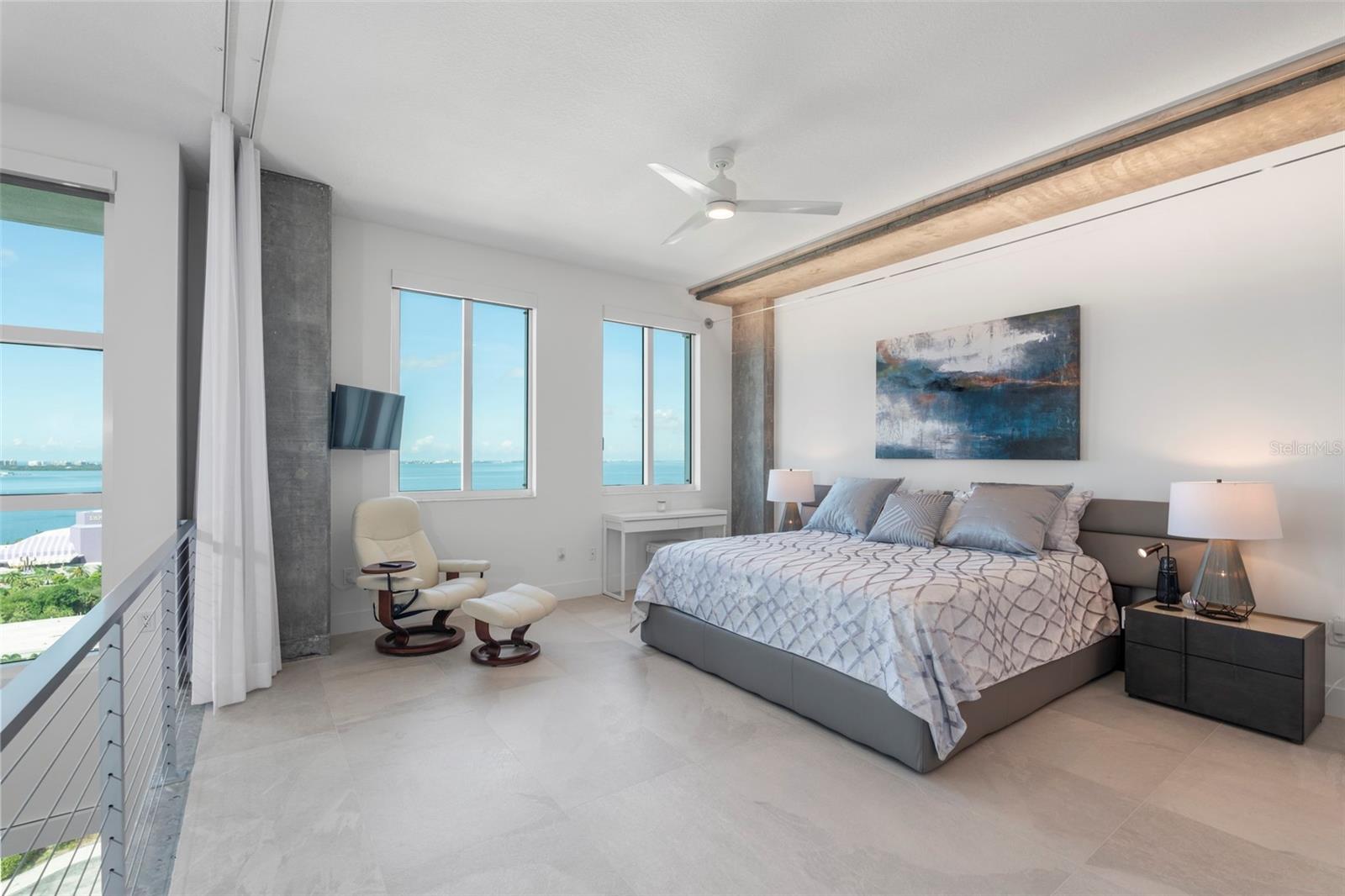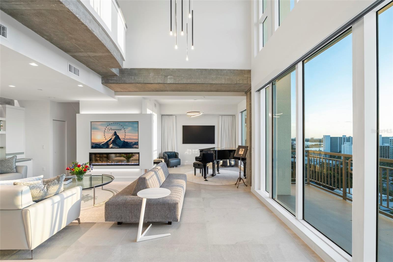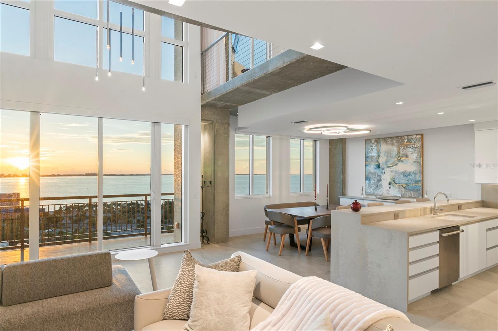 TWENTY-FOOT-HIGH CENTRAL ATRIUM WINDOWS PROVIDE WORLD CLASS SWEEPING BAY AND BEYOND VIEWS from this 16th floor, custom-designed two-story, 2 bedroom plus flex room, 3.5 bath Penthouse in the prestigious, well-built and storm-resistant Alinari condominium. Built at 16 ft above sea level in the X flood zone directly across from the 53-acre Bayfront Park, Alinari property owners benefit from both the protected water views as well as the city's commitment to preserving and expanding the park's natural beauty and resilience. Seamlessly blending coastal elegance with New York City chic, this turnkey furnished residence offers immediate luxury living just minutes from the Bayfront and Downtown. Masterfully redesigned and renovated by the renowned architect Yehuda Inbar and Yoder Homes between 2020 and 2023, the residence features breathtaking sunset views and exquisite design elements. The sanctuary is a testament to innovative design with its flowing, multi-level open concept layout with convenient 16th and 17th floor access and expertly appointed spaces echoing the natural beauty of the waterfront, with vistas from every room. Exposed concrete walls, Ceramiche D’Arte porcelain tile flooring, and piano-inspired design details create a lyrical, modern ambiance. Electric shades preserve the gorgeous views while offering privacy, and the acoustically engineered spaces, coupled with a cutting-edge Integrity Sound audio system with invisible in wall speakers, ensure both visual and auditory perfection. Culinary enthusiasts will delight in the gourmet kitchen, which boasts high end appliances, custom cabinetry, Caesarstone Quartz countertops, and an expansive breakfast bar. The adjacent dining and living areas, anchored by a custom electric Dimplex fireplace, exude comfort and elegance—perfect for relaxing with a view or entertaining friends. The versatile flex room, currently used as a piano room, has a full bath and previously had a Murphy bed and can be converted into a third bedroom. Open the sliders to your private balcony and savor gentle bay breezes while taking in the picturesque surroundings. The upstairs features a serene sitting room and an expansive primary suite, offering stunning water views. The primary bath is a spa-like retreat, complete with a Victoria and Albert soaking tub, walk-in shower and Caesarstone concrete counters. A well-appointed guest bedroom, full bath and custom storage closet complete this level. Impeccably furnished with premium pieces from Clive Daniel, Soft Square, Natuzzi, and Copenhagen Imports, designer lighting from Light Up Your Life, custom built-ins, and the Yamaha grand piano, you can move in and immediately experience the full splendor of this discerning Bayfront retreat. As an added luxury, this remarkable residence includes the option to purchase a separately deeded private cabana—one of only 10 available and the perfect tranquil escape for sun-soaked poolside days. Alinari residents enjoy an array of amenities including the longest resort-style swimming pool in Downtown Sarasota, spa, fitness center, social room with billiards, guest suites, wine cellar, round-the-clock security, private parking, concierge service, private walk-in climate-controlled storage unit and separate service entrance. An extraordinary lifestyle awaits you in this remarkable one-of-a-kind property just a stroll from downtown Sarasota's vibrant dining, arts and cultural offerings.