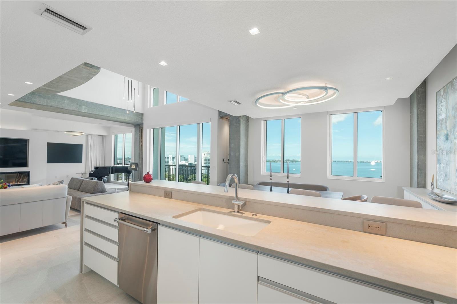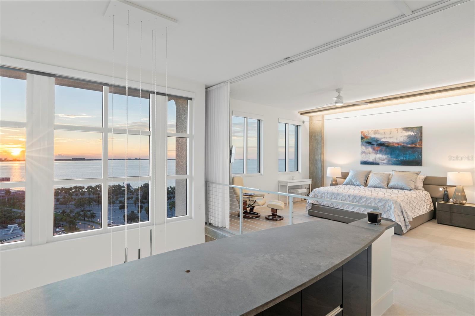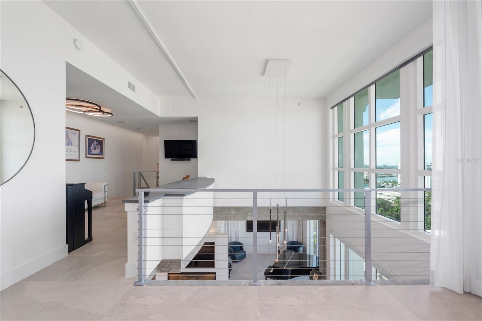 TWENTY-FOOT-HIGH CENTRAL ATRIUM WINDOWS PROVIDE WORLD CLASS SWEEPING BAY AND BEYOND VIEWS from this 16th floor, custom-designed two-story, 2 bedroom plus flex room, 3.5 bath Penthouse in the prestigious, well-built and storm-resistant Alinari condominium. Built at 16 ft above sea level in the X flood zone directly across from the 53-acre Bayfront Park, Alinari property owners benefit from both the protected water views as well as the city's commitment to preserving and expanding the park's natural beauty and resilience. Seamlessly blending coastal elegance with New York City chic, this turnkey furnished residence offers immediate luxury living just minutes from the Bayfront and Downtown. Masterfully redesigned and renovated by the renowned architect Yehuda Inbar and Yoder Homes between 2020 and 2023, the residence features breathtaking sunset views and exquisite design elements. The sanctuary is a testament to innovative design with its flowing, multi-level open concept layout with convenient 16th and 17th floor access and expertly appointed spaces echoing the natural beauty of the waterfront, with vistas from every room. Exposed concrete walls, Ceramiche D’Arte porcelain tile flooring, and piano-inspired design details create a lyrical, modern ambiance. Electric shades preserve the gorgeous views while offering privacy, and the acoustically engineered spaces, coupled with a cutting-edge Integrity Sound audio system with invisible in wall speakers, ensure both visual and auditory perfection. Culinary enthusiasts will delight in the gourmet kitchen, which boasts high end appliances, custom cabinetry, Caesarstone Quartz countertops, and an expansive breakfast bar. The adjacent dining and living areas, anchored by a custom electric Dimplex fireplace, exude comfort and elegance—perfect for relaxing with a view or entertaining friends. The versatile flex room, currently used as a piano room, has a full bath and previously had a Murphy bed and can be converted into a third bedroom. Open the sliders to your private balcony and savor gentle bay breezes while taking in the picturesque surroundings. The upstairs features a serene sitting room and an expansive primary suite, offering stunning water views. The primary bath is a spa-like retreat, complete with a Victoria and Albert soaking tub, walk-in shower and Caesarstone concrete counters. A well-appointed guest bedroom, full bath and custom storage closet complete this level. Impeccably furnished with premium pieces from Clive Daniel, Soft Square, Natuzzi, and Copenhagen Imports, designer lighting from Light Up Your Life, custom built-ins, and the Yamaha grand piano, you can move in and immediately experience the full splendor of this discerning Bayfront retreat. As an added luxury, this remarkable residence includes the option to purchase a separately deeded private cabana—one of only 10 available and the perfect tranquil escape for sun-soaked poolside days. Alinari residents enjoy an array of amenities including the longest resort-style swimming pool in Downtown Sarasota, spa, fitness center, social room with billiards, guest suites, wine cellar, round-the-clock security, private parking, concierge service, private walk-in climate-controlled storage unit and separate service entrance. An extraordinary lifestyle awaits you in this remarkable one-of-a-kind property just a stroll from downtown Sarasota's vibrant dining, arts and cultural offerings.