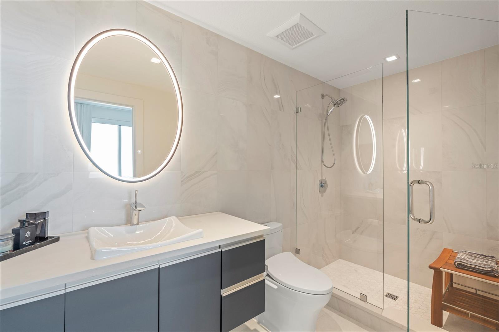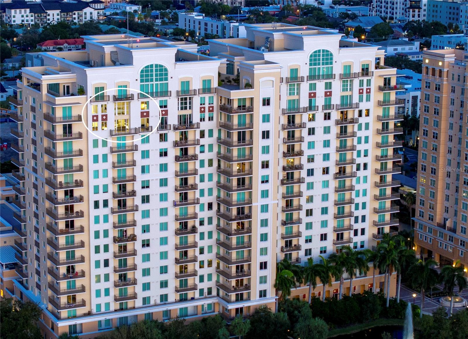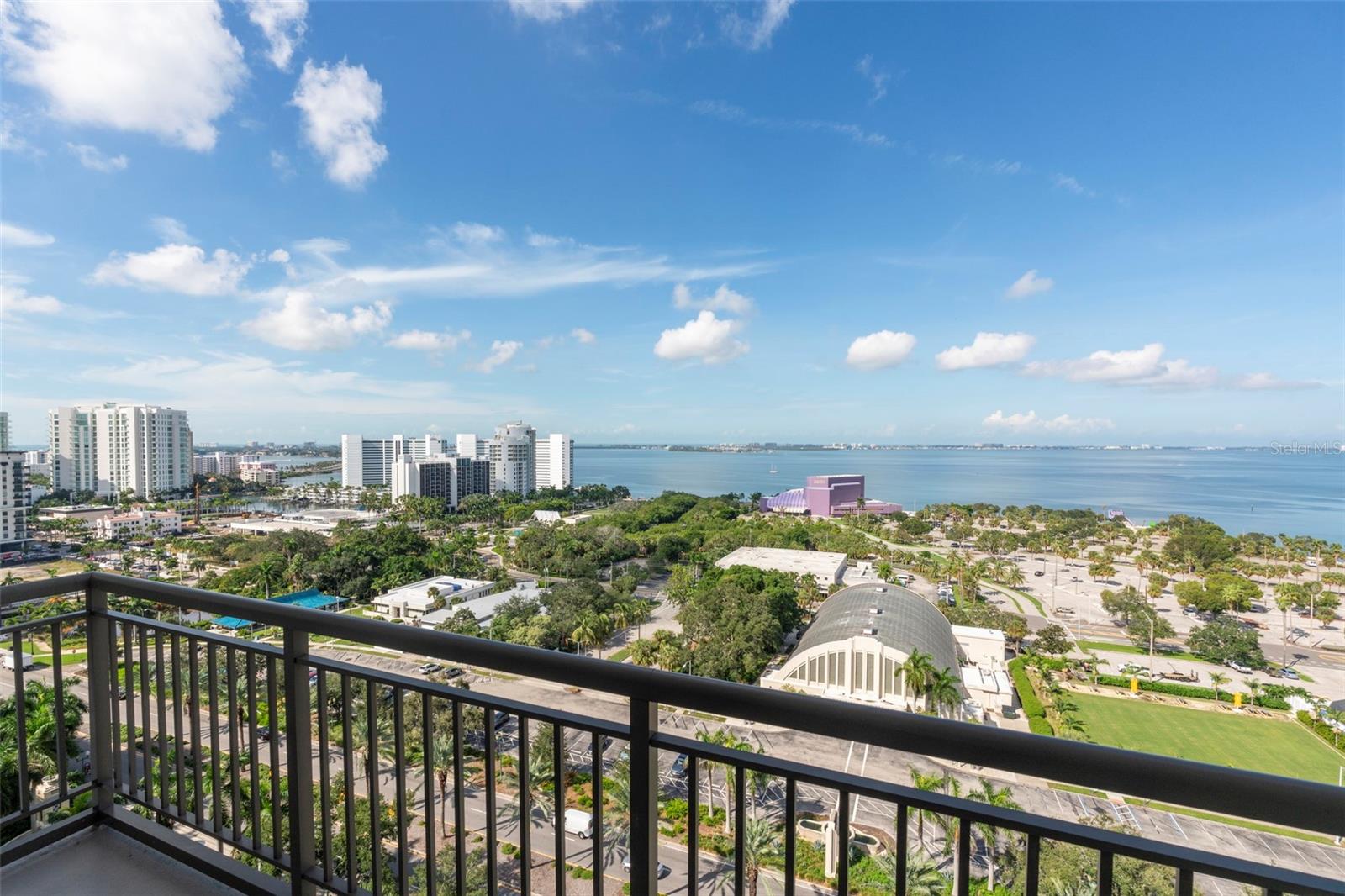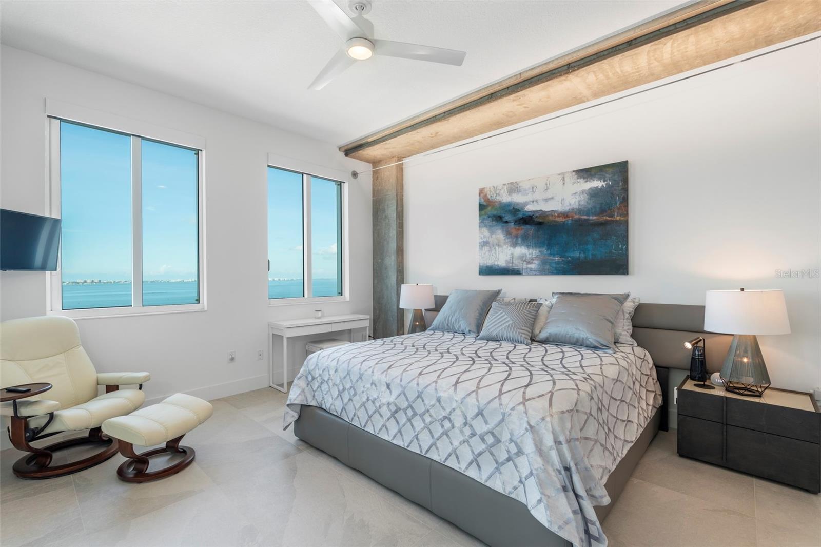 TWENTY-FOOT-HIGH CENTRAL ATRIUM WINDOWS PROVIDE WORLD CLASS SWEEPING BAY AND BEYOND VIEWS from this 16th floor, custom-designed two-story, 2 bedroom plus flex room, 3.5 bath Penthouse in the prestigious, well-built and storm-resistant Alinari condominium. Built at 16 ft above sea level in the X flood zone directly across from the 53-acre Bayfront Park, Alinari property owners benefit from both the protected water views as well as the city's commitment to preserving and expanding the park's natural beauty and resilience. Seamlessly blending coastal elegance with New York City chic, this turnkey furnished residence offers immediate luxury living just minutes from the Bayfront and Downtown. Masterfully redesigned and renovated by the renowned architect Yehuda Inbar and Yoder Homes between 2020 and 2023, the residence features breathtaking sunset views and exquisite design elements. The sanctuary is a testament to innovative design with its flowing, multi-level open concept layout with convenient 16th and 17th floor access and expertly appointed spaces echoing the natural beauty of the waterfront, with vistas from every room. Exposed concrete walls, Ceramiche D’Arte porcelain tile flooring, and piano-inspired design details create a lyrical, modern ambiance. Electric shades preserve the gorgeous views while offering privacy, and the acoustically engineered spaces, coupled with a cutting-edge Integrity Sound audio system with invisible in wall speakers, ensure both visual and auditory perfection. Culinary enthusiasts will delight in the gourmet kitchen, which boasts high end appliances, custom cabinetry, Caesarstone Quartz countertops, and an expansive breakfast bar. The adjacent dining and living areas, anchored by a custom electric Dimplex fireplace, exude comfort and elegance—perfect for relaxing with a view or entertaining friends. The versatile flex room, currently used as a piano room, has a full bath and previously had a Murphy bed and can be converted into a third bedroom. Open the sliders to your private balcony and savor gentle bay breezes while taking in the picturesque surroundings. The upstairs features a serene sitting room and an expansive primary suite, offering stunning water views. The primary bath is a spa-like retreat, complete with a Victoria and Albert soaking tub, walk-in shower and Caesarstone concrete counters. A well-appointed guest bedroom, full bath and custom storage closet complete this level. Impeccably furnished with premium pieces from Clive Daniel, Soft Square, Natuzzi, and Copenhagen Imports, designer lighting from Light Up Your Life, custom built-ins, and the Yamaha grand piano, you can move in and immediately experience the full splendor of this discerning Bayfront retreat. As an added luxury, this remarkable residence includes the option to purchase a separately deeded private cabana—one of only 10 available and the perfect tranquil escape for sun-soaked poolside days. Alinari residents enjoy an array of amenities including the longest resort-style swimming pool in Downtown Sarasota, spa, fitness center, social room with billiards, guest suites, wine cellar, round-the-clock security, private parking, concierge service, private walk-in climate-controlled storage unit and separate service entrance. An extraordinary lifestyle awaits you in this remarkable one-of-a-kind property just a stroll from downtown Sarasota's vibrant dining, arts and cultural offerings.