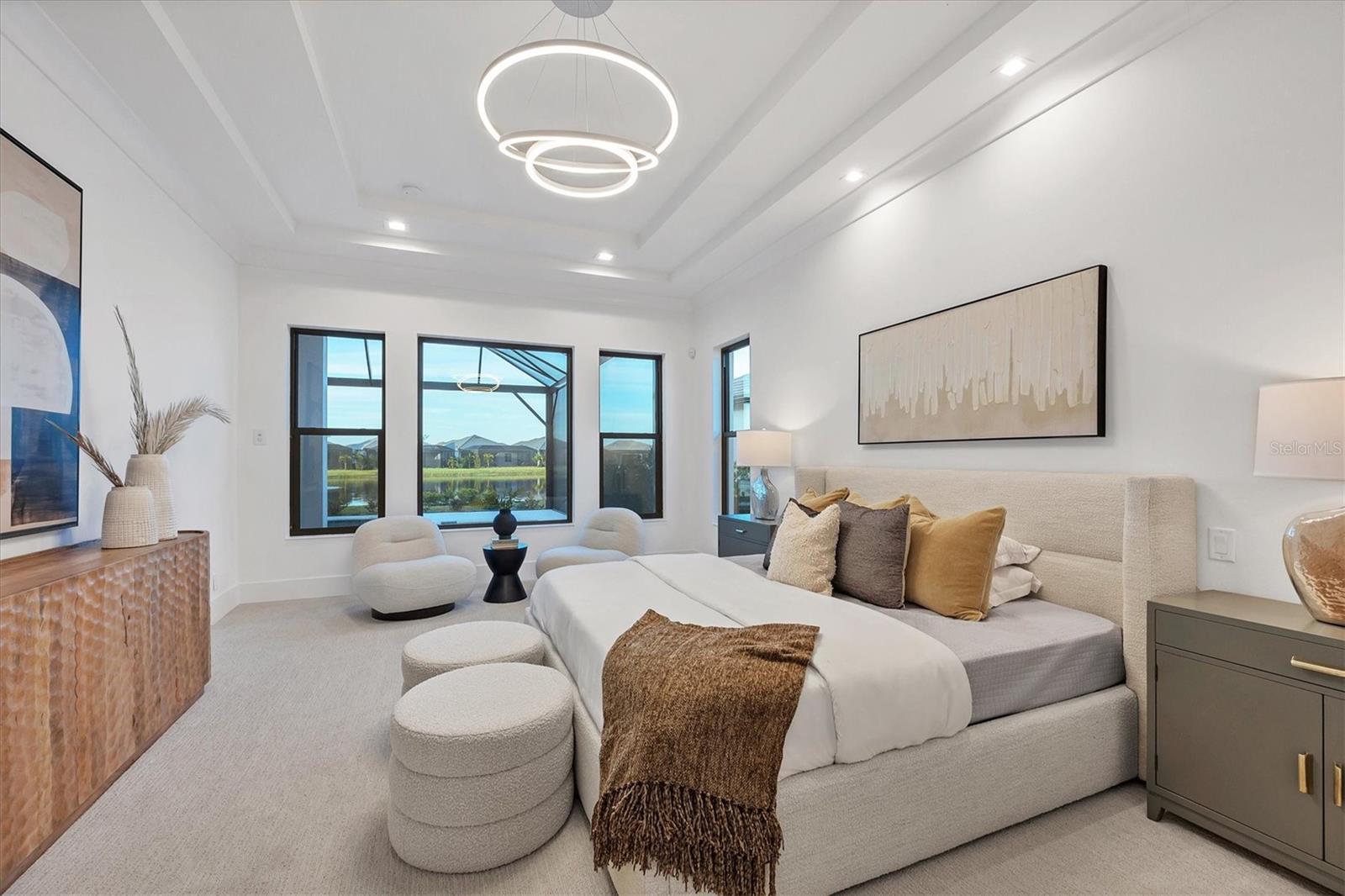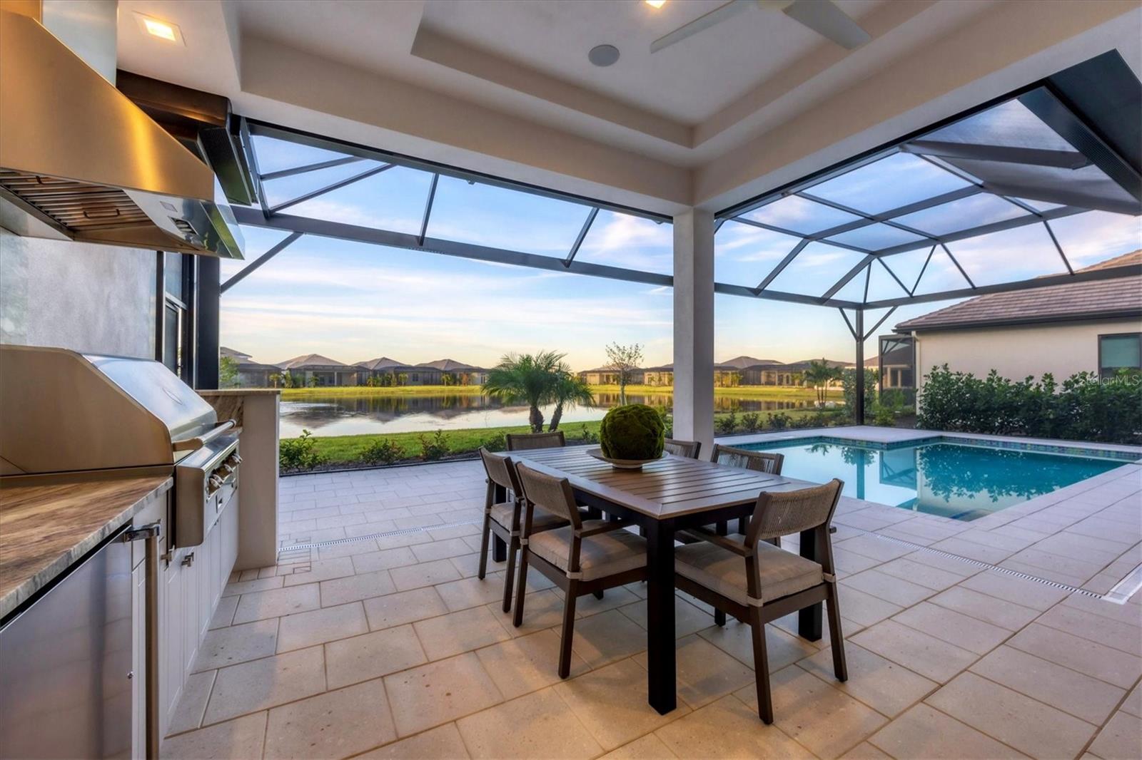 Welcome to this stunning, newly constructed 3,219-square-foot Rutenberg Talise model home, offering breathtaking water views in the Wild Blue at Waterside community. This luxurious residence features three spacious bedrooms, 3.5 beautifully appointed bathrooms, a den and a versatile bonus room. At the heart of the home is a breathtaking chef’s kitchen, complete with Thermador appliances, sleek quartz countertops, and beautiful wood cabinets. This space opens seamlessly to the great room and dining areas, creating an ideal setting for entertaining and everyday living in the home’s open layout. Architectural details, including crown molding and tray ceilings, combined with beautiful wood floors, enhance the warmth and elegance throughout the home. The professionally designed office boasts beautiful wood floors and is enclosed by elegant glass insert sliding doors, offering both privacy and style. Whether you work from home or need a quiet space to focus, this office combines functionality with sophisticated design. The oversized bonus room is a flexible space that can be used as a second entertainment room, game room or additional living area. With 11-foot ceilings and plenty of natural light, it offers a spacious, airy feel. The bonus room is conveniently near a powder room, which also doubles as a pool bath, providing easy access from the outdoor living area. For the ultimate indoor-outdoor living experience, corner sliders open to the lanai, inviting you to step outside and enjoy Florida’s year-round sunshine in your private outdoor oasis. The backyard features a pool, relaxing spa, and a spacious lanai including an outdoor kitchen with an Alfredo/Artisan grill, making this outdoor area a place for relaxing or hosting guests. The luxurious owner’s suite offers a peaceful retreat with dual walk-in closets and a spa-like bath, complete with a soaking tub, walk-in shower and dual vanities. Two additional guest bedrooms, each with their own en-suite baths, provide comfort and privacy for family and visitors. A three-car garage offers ample storage and convenience. In the prestigious Lakewood Ranch area, Waterside is the pinnacle of luxury lakefront living. This planned community surrounds you with natural beauty, featuring sparkling lakes, lush landscapes and thoughtfully designed neighborhoods. With landscaping maintenance included, you’ll have more time to enjoy the resort-style amenities, including parks, walking trails, a village spa, tennis and pickleball courts, dog parks, playgrounds, golf and clubhouses. The vibrant town center offers boutique shopping, dining and entertainment just minutes away. Don’t miss the opportunity to make this extraordinary home yours and experience the best of luxury living at Wild Blue at Waterside.