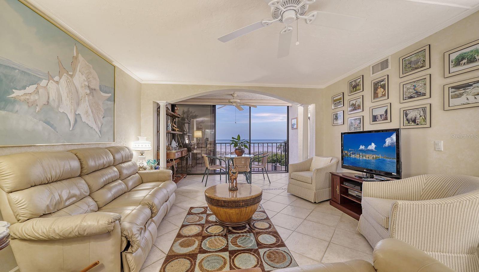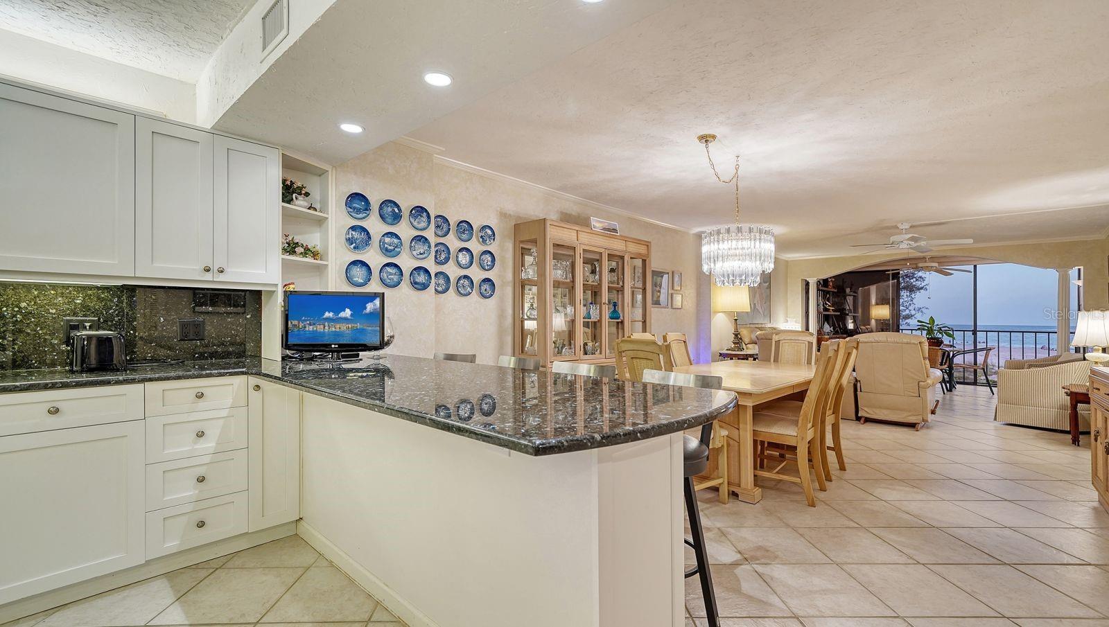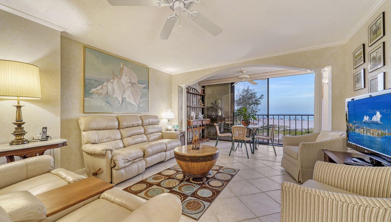 GREAT NEW PRICE! This beautiful, REMODELED, 2 bed/2 bath GULF FRONT tower residence in the premiere property of Whispering Sands is the perfect combination of comfort and convenience! Immediately upon entry, you’re greeted with spectacular, unobstructed 180 degree views of the sparkling Gulf of America! Along with its direct FULL GULF VIEWS, this unit is just one floor away from the beachside pool and Whispering Sands' own private beach. It's also conveniently located on the same floor as the Tower Lounge, reserved for the exclusive use of tower owners and their guests outside of community wide events. An entertainer’s dream, this unit welcomes you into the nicely REMODELED kitchen and great OPEN CONCEPT floor plan, enabling easy interaction between you and your guests. The kitchen features granite countertops & backsplash, an 8’ breakfast bar that seats 4, a new 2024 refrigerator and 2024 dishwasher, recessed LED & under cabinet lighting, an abundance of cabinet storage, and a convenient built-in desk with granite. Experience true Florida living by opening the floor to ceiling sliders in both the living room and primary bedroom and take in the fresh salt breezes and the gentle sound of the surf. Both sets of sliders include remote controlled shades. The primary bedroom includes a custom walk-in closet, large vanity area, and an ensuite bath with marble countertops, glassed walk-in shower, and linen closet with pullout drawers. A set of glassed French doors with privacy shades opens into the guest bedroom, which is currently set up as both an office and bedroom with a fantastic SICO wall bed, desk, and built-ins. Flooring consists of ceramic tile placed on the diagonal in the living areas & carpeted bedrooms. Beautifully textured ceilings and walls. Selected furniture is also included. Whispering Sands is a premiere 55+ Gulf front community offering beautifully landscaped grounds, security, onsite management, 2 heated pools, Tower Lounge and Clubhouse, beachside Tiki hut, grills, shuffleboard, canoe/kayak storage racks, and 800’ of private beach on the Gulf of America. Best of all, you are just around the corner from the colorful boutiques and restaurants of Siesta Key Village and a short drive across the North Bridge to Sarasota’s wealth of visual and performing arts, theatre, and cultural attractions!