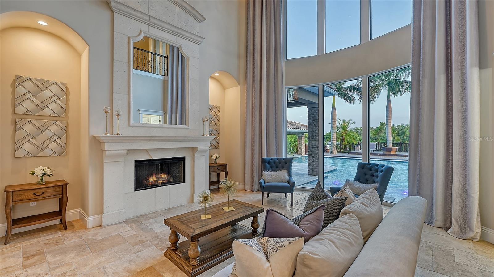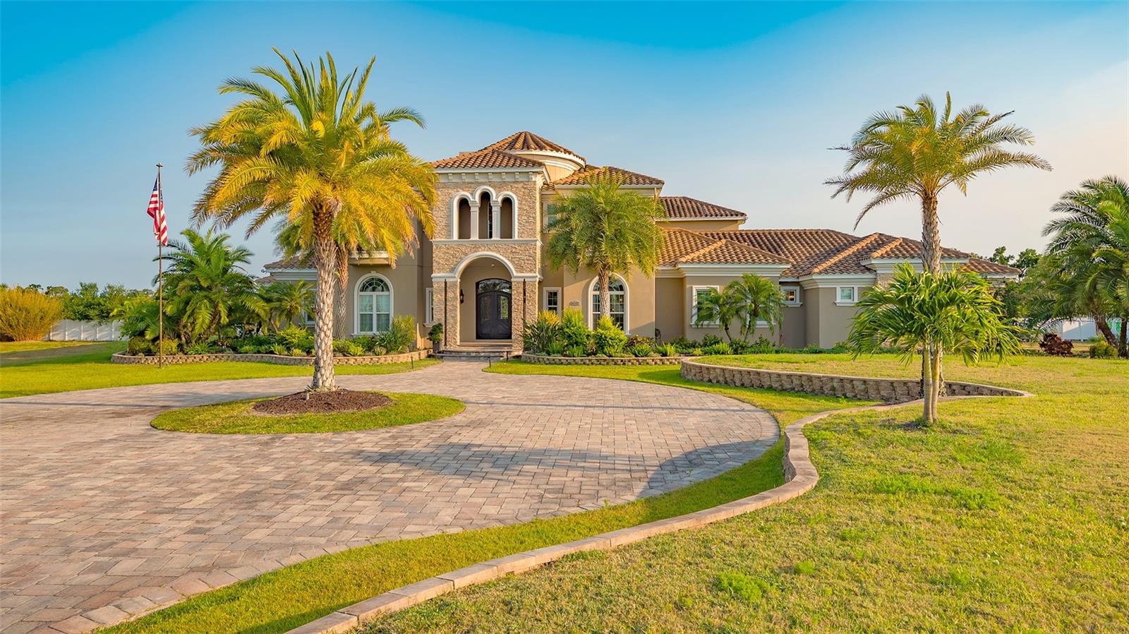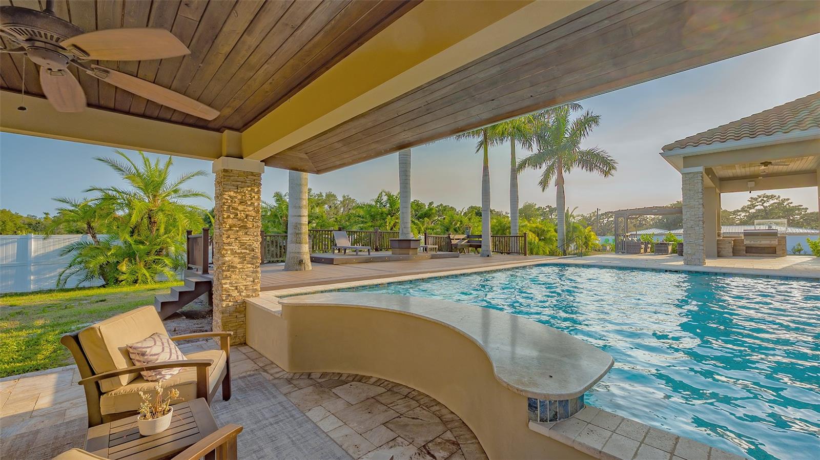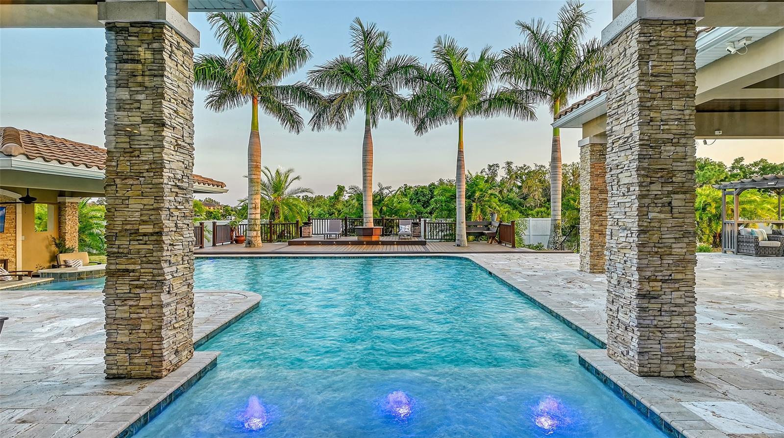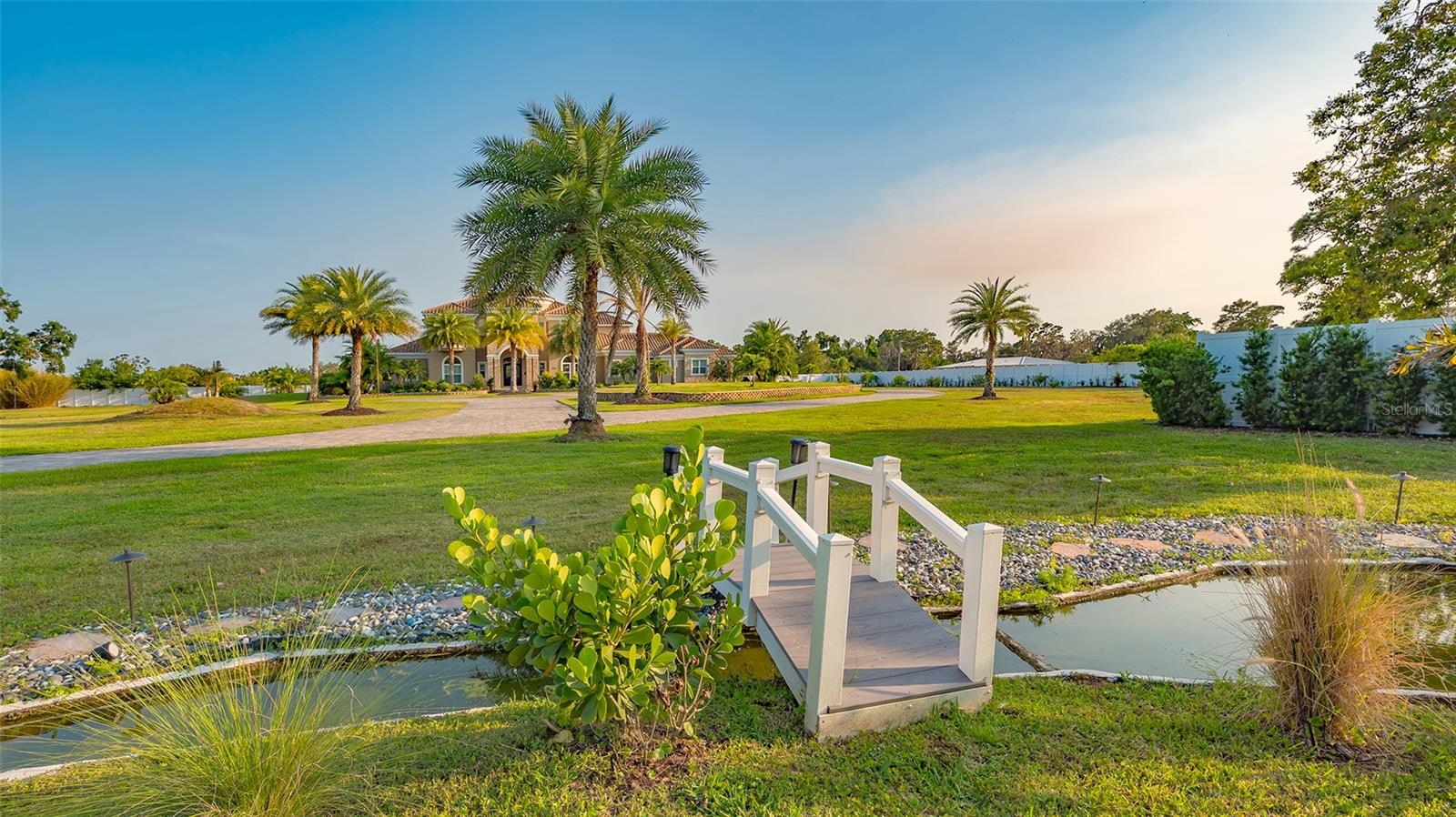 Amid six acres of meticulously landscaped grounds, this estate is a masterpiece, seamlessly blending opulence with tranquility. Beyond the grand iron gate, a sweeping circular driveway beckons, guiding you past enchanting features such as a charming gazebo and a picturesque bridge over a serene koi pond, setting a tone of elegance from the outset. Meticulous attention to detail defines every aspect of this home, from the imposing double iron front doors to the soaring 26-foot living room ceiling enveloped by floor-to-ceiling windows. Architectural marvels await indoors, with a stone gas fireplace serving as a focal point, a winding staircase exuding timeless grandeur and bespoke finishes adding a touch of refinement to every corner. Productivity awaits in the stately office, where rich wood floors bask in natural light, fostering an ambiance of creativity. Entertaining becomes an art form with the sophisticated built-in bar area, replete with an ice maker and glass cabinetry, seamlessly flowing into the dining space adorned with exquisite custom wood beams. Here, a climate-controlled wine room stands ready to cater to the most discerning connoisseurs, featuring a built-in dispenser for indulgence at any hour. The primary suite epitomizes serenity, boasting a spacious seating room with tranquil pool views, and luxurious amenities including custom closets and a spa-worthy primary bath boasting separate sinks, a walk-in shower and a sumptuous soaking tub. Culinary delights await in the gourmet kitchen, outfitted with top-tier appliances including Thermador double ovens and cooktop, Wolf grill and griddle, built-in 48-inch refrigerator, and a convenient pot filler. Exquisite finishes, from exotic stone countertops to custom wood cabinetry, elevate the culinary experience to new heights. Adjacent to the kitchen lies the family room, seamlessly blending indoor and outdoor living through corner pocket sliders that lead to the inviting lounge area. Step outside, and a resort-style oasis unfolds, complete with a sparkling pool, outdoor kitchen and bar-top seating, while an adjacent casita offers further options for relaxation and entertainment. Ascend the staircase to discover an additional bonus room and bar, ideal for intimate gatherings or leisurely evenings. For cinema enthusiasts, the state-of-the-art movie room promises an immersive viewing experience, while three guest suites ensure comfort and privacy for visitors. A built-in library offers a tranquil retreat, complete with a captivating array of books accessible via an attached wooden ladder. Modern conveniences abound, including a comprehensive water purification system with state-of-the-art reverse osmosis technology delivering over 4,000 gallons of pristine water daily from a 2,500-gallon primary tank and two secondary 500-gallon tanks, equipped with filters. A separate garage apartment offers versatility, with an additional bath, covered parking and a kitchenette. An adjacent RV garage, with a full electrical package and a 10-foot fan, provides ample space for recreational vehicles. With its elevated garden, additional shed and a large pond connected by a charming bridge to the koi pond, this estate is a testament to meticulous craftsmanship and unparalleled luxury. In every detail, from the meticulously manicured grounds to the luxurious interiors, this estate is the pinnacle of luxury living. Welcome home to a realm of unparalleled sophistication and refinement.