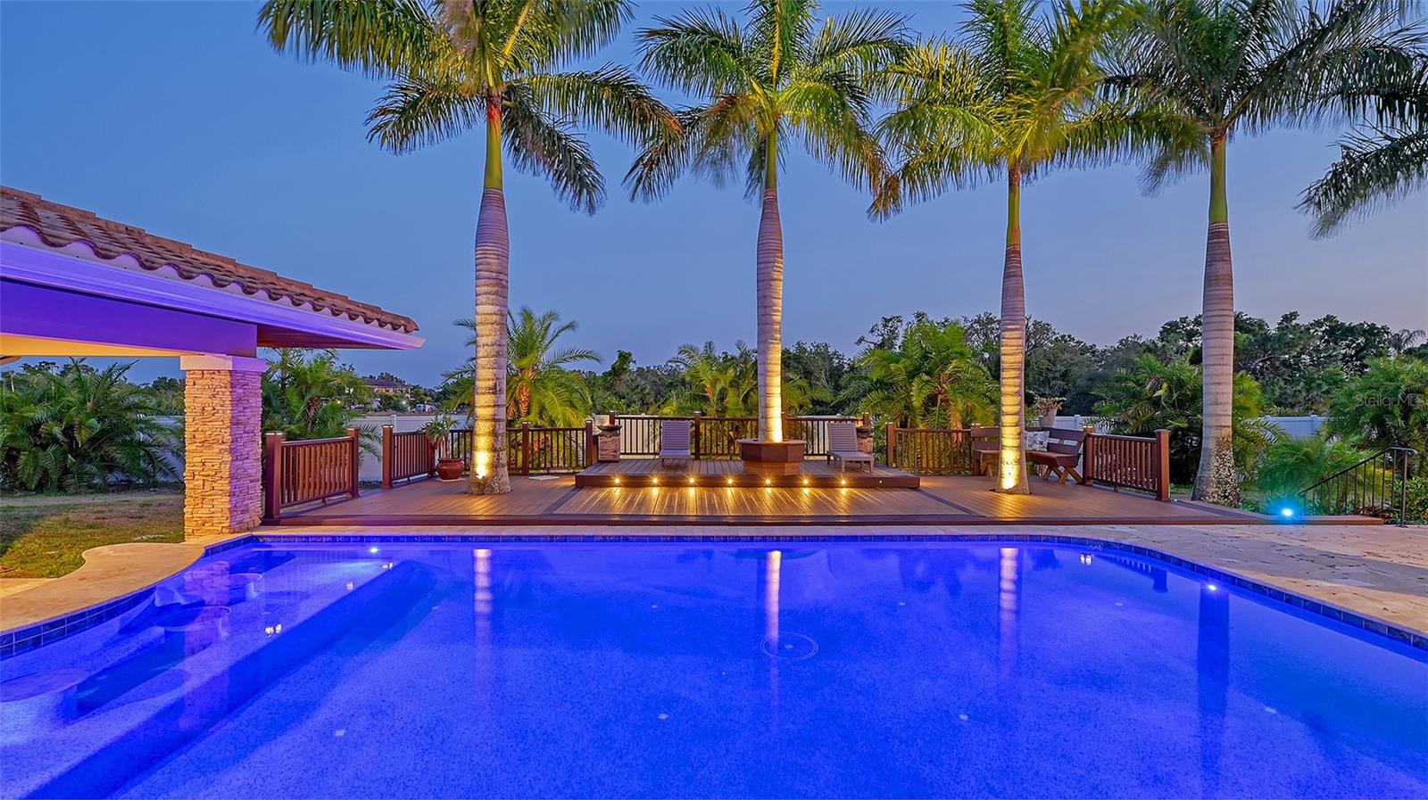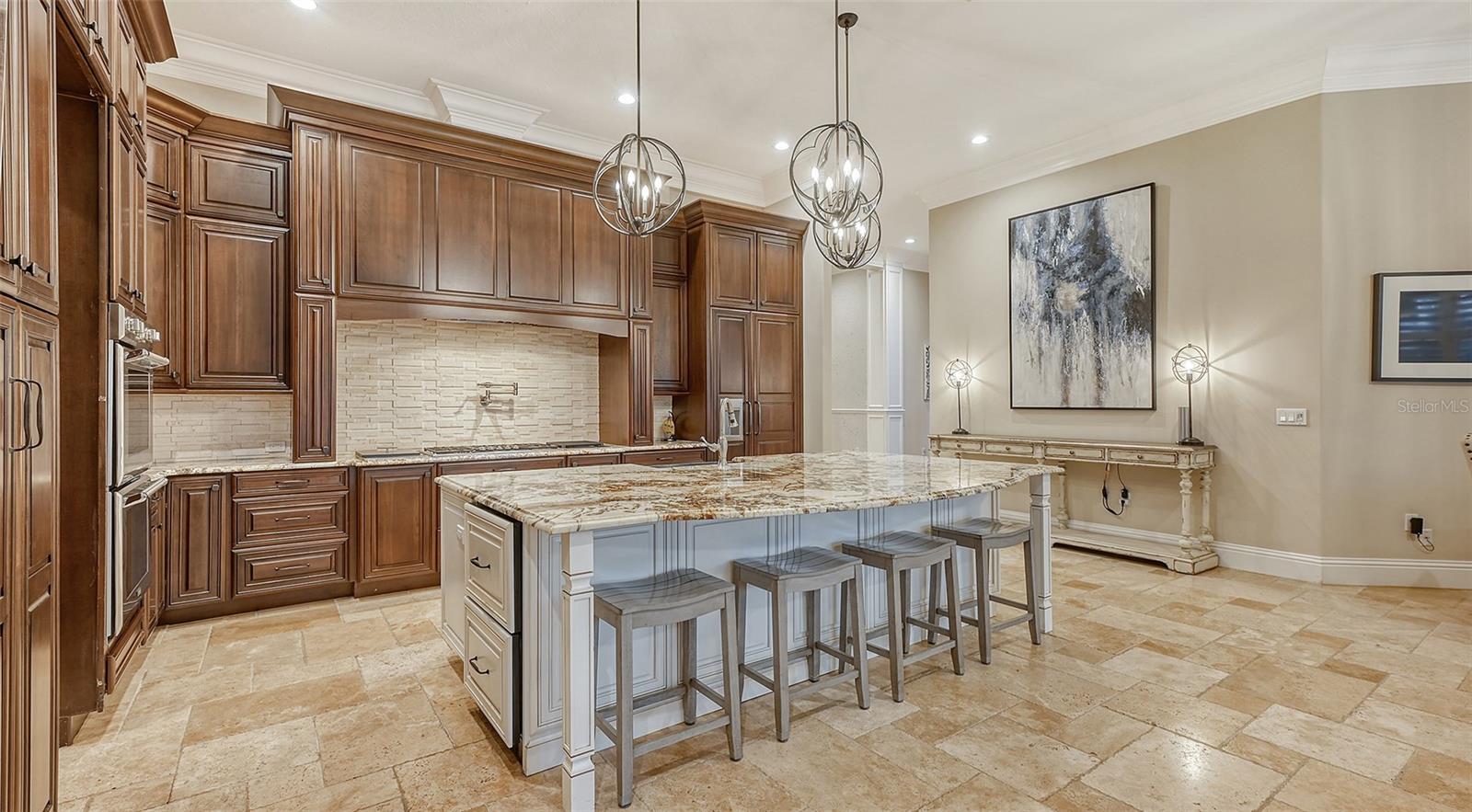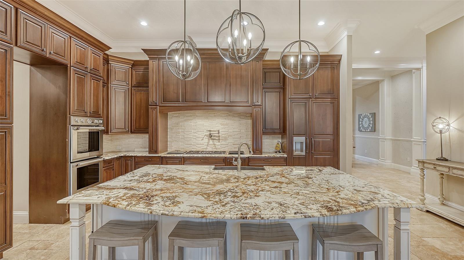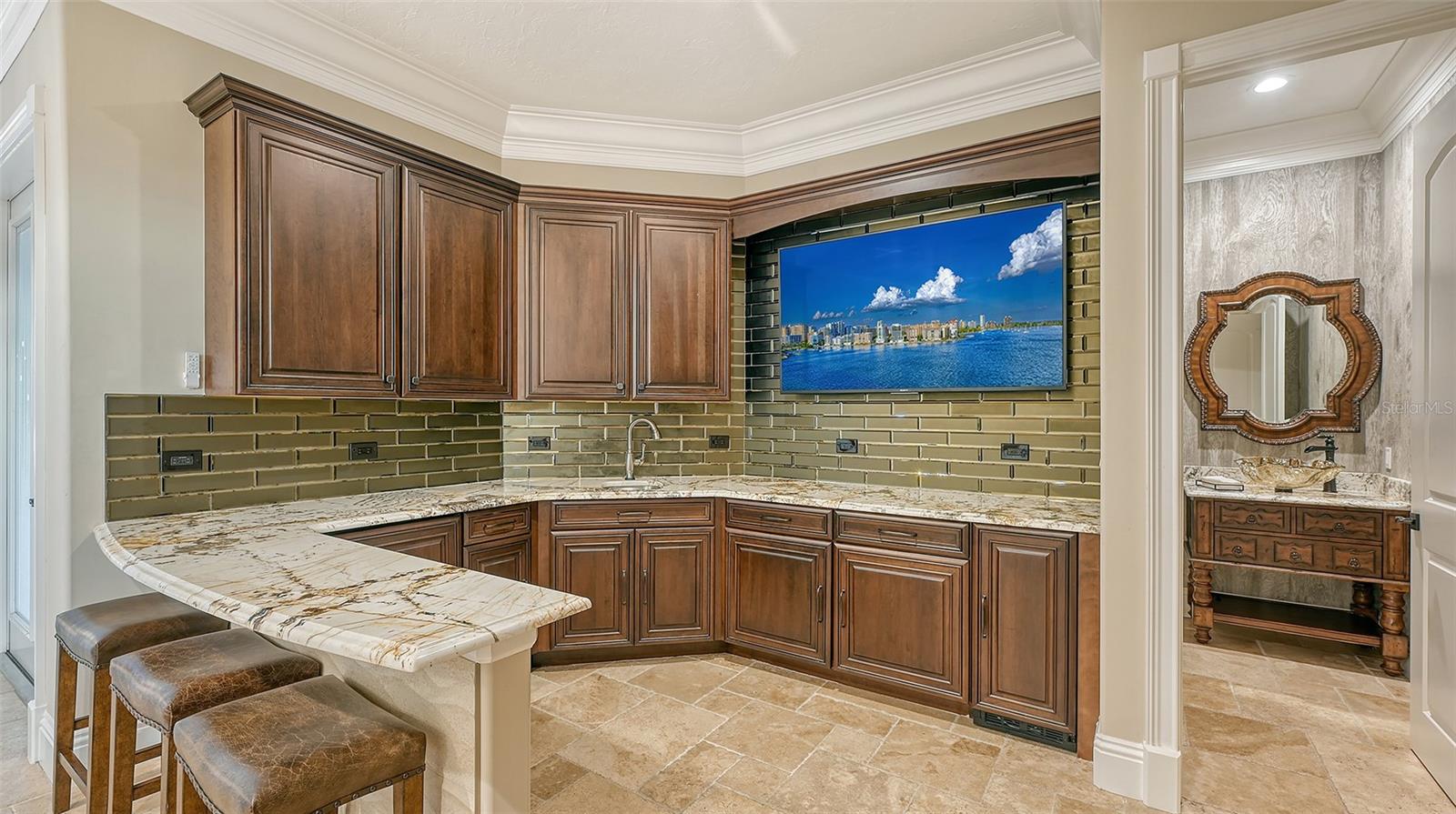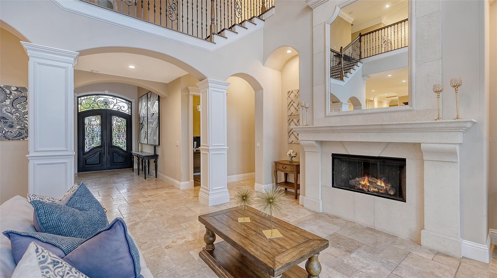 Amid six acres of meticulously landscaped grounds, this estate is a masterpiece, seamlessly blending opulence with tranquility. Beyond the grand iron gate, a sweeping circular driveway beckons, guiding you past enchanting features such as a charming gazebo and a picturesque bridge over a serene koi pond, setting a tone of elegance from the outset. Meticulous attention to detail defines every aspect of this home, from the imposing double iron front doors to the soaring 26-foot living room ceiling enveloped by floor-to-ceiling windows. Architectural marvels await indoors, with a stone gas fireplace serving as a focal point, a winding staircase exuding timeless grandeur and bespoke finishes adding a touch of refinement to every corner. Productivity awaits in the stately office, where rich wood floors bask in natural light, fostering an ambiance of creativity. Entertaining becomes an art form with the sophisticated built-in bar area, replete with an ice maker and glass cabinetry, seamlessly flowing into the dining space adorned with exquisite custom wood beams. Here, a climate-controlled wine room stands ready to cater to the most discerning connoisseurs, featuring a built-in dispenser for indulgence at any hour. The primary suite epitomizes serenity, boasting a spacious seating room with tranquil pool views, and luxurious amenities including custom closets and a spa-worthy primary bath boasting separate sinks, a walk-in shower and a sumptuous soaking tub. Culinary delights await in the gourmet kitchen, outfitted with top-tier appliances including Thermador double ovens and cooktop, Wolf grill and griddle, built-in 48-inch refrigerator, and a convenient pot filler. Exquisite finishes, from exotic stone countertops to custom wood cabinetry, elevate the culinary experience to new heights. Adjacent to the kitchen lies the family room, seamlessly blending indoor and outdoor living through corner pocket sliders that lead to the inviting lounge area. Step outside, and a resort-style oasis unfolds, complete with a sparkling pool, outdoor kitchen and bar-top seating, while an adjacent casita offers further options for relaxation and entertainment. Ascend the staircase to discover an additional bonus room and bar, ideal for intimate gatherings or leisurely evenings. For cinema enthusiasts, the state-of-the-art movie room promises an immersive viewing experience, while three guest suites ensure comfort and privacy for visitors. A built-in library offers a tranquil retreat, complete with a captivating array of books accessible via an attached wooden ladder. Modern conveniences abound, including a comprehensive water purification system with state-of-the-art reverse osmosis technology delivering over 4,000 gallons of pristine water daily from a 2,500-gallon primary tank and two secondary 500-gallon tanks, equipped with filters. A separate garage apartment offers versatility, with an additional bath, covered parking and a kitchenette. An adjacent RV garage, with a full electrical package and a 10-foot fan, provides ample space for recreational vehicles. With its elevated garden, additional shed and a large pond connected by a charming bridge to the koi pond, this estate is a testament to meticulous craftsmanship and unparalleled luxury. In every detail, from the meticulously manicured grounds to the luxurious interiors, this estate is the pinnacle of luxury living. Welcome home to a realm of unparalleled sophistication and refinement.