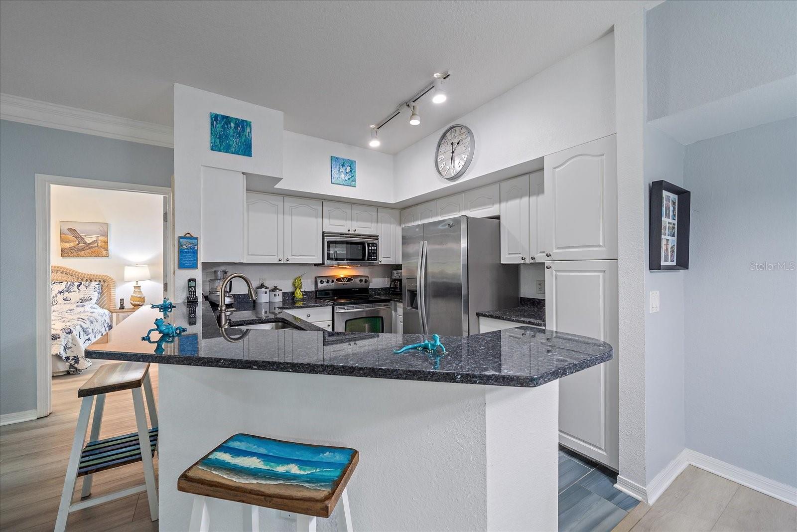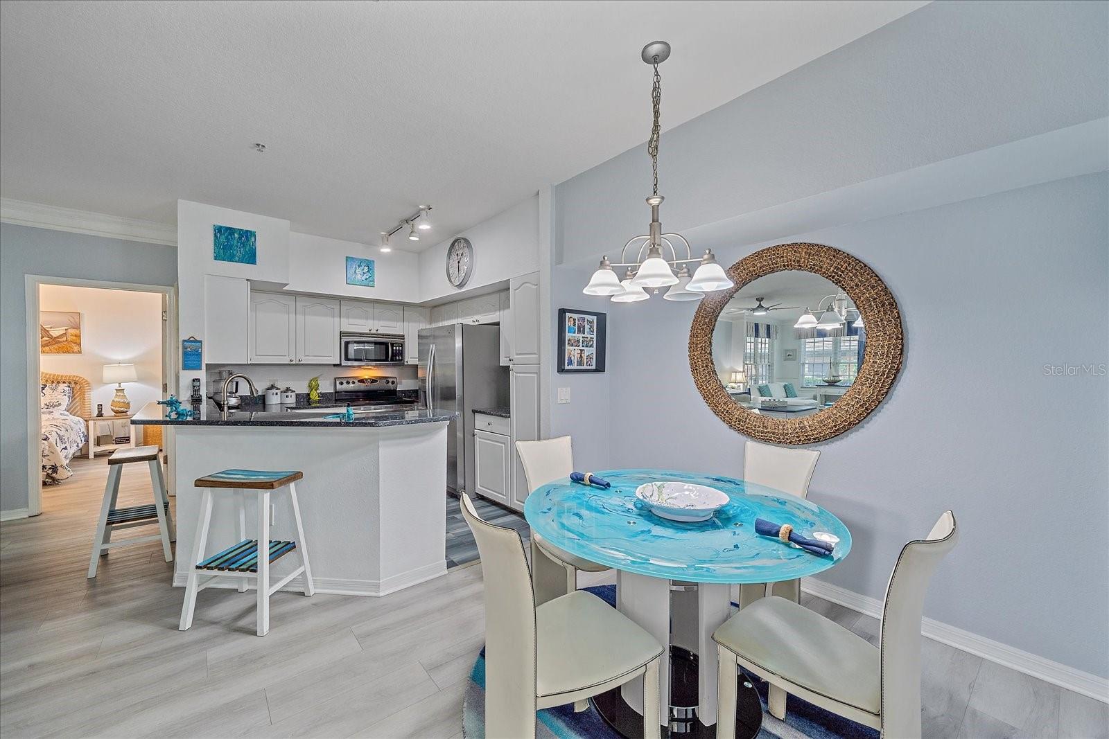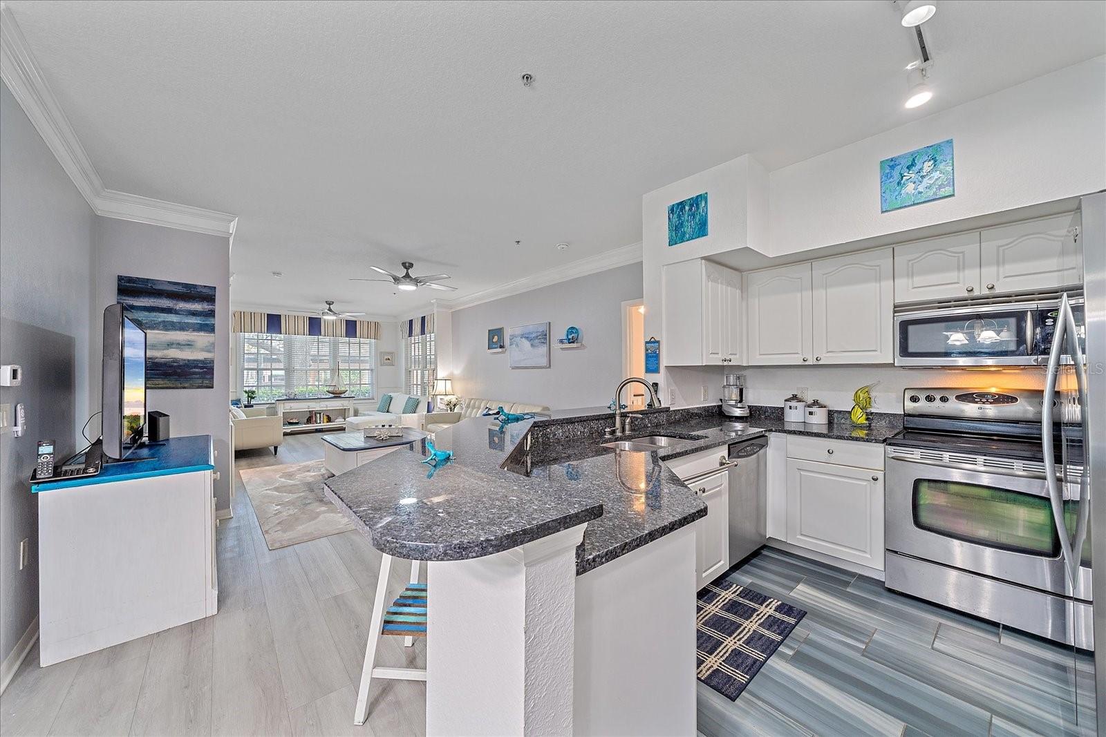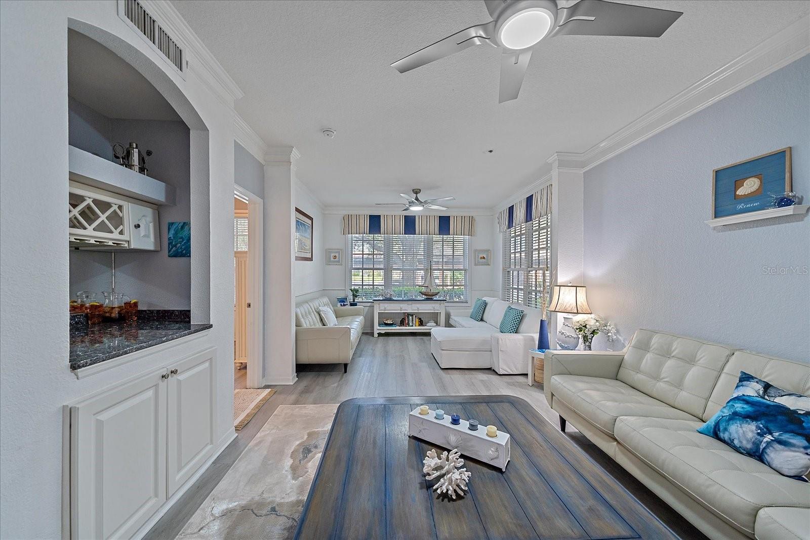 Welcome Home to this fabulous FIRST FLOOR Bella Villino condo with a cool coastal vibe! This MOVE-IN READY 2 BR/2 BA unit makes you feel right at HOME as soon as you step through the front door. Whether you live here seasonally, or full-time the finishes and ATTENTION-TO-DETAIL at every turn are sure to please. Luxury vinyl plank flooring in bedrooms and living areas with coordinating ceramic plank tiles in the kitchen and baths and custom crown-molding are a few special details to note. This home features a SPLIT-PLAN with 2 primary bedrooms each complete with their own WALK-IN-CLOSET and upgraded EN-SUITE, both with large bath tubs, gorgeous GRANITE counters and new fixtures. The large living room and adjacent sitting room offer plenty of space for ENTERTAINING and there is even a dry bar for cocktails in the evening. The modest kitchen features STAINLESS APPLIANCES, plenty of cabinet space, and beautiful dark GRANITE counters with flecks of blue to tie in the beach theme. HURRICANE IMPACT WINDOWS, NEW HVAC 2024 & NEW WATER HEATER 2024! The gated Bella Villino Condominiums are located just a short drive to all that Sarasota has to offer from shopping, dining, and the area's #1 Siesta Key Beach. Unbeatable RESORT STYLE AMENITIES that include: Heated POOL & SPA, Fitness Center, Indoor RACQUETBALL and BASKETBALL courts, TENNIS, Billiards Room, and Business Center. Additionally there is a Car care area, gas grills, and picnic areas to enjoy the FLORIDA LIFESTYLE! Onsite management & maintenance team and ASSIGNED COVERED PARKING with plenty of additional guest parking. (Most furnishings are negotiable on a separate contract.) EASY TO SHOW & PRICED TO SELL! Don't let this little slice of paradise get away!
