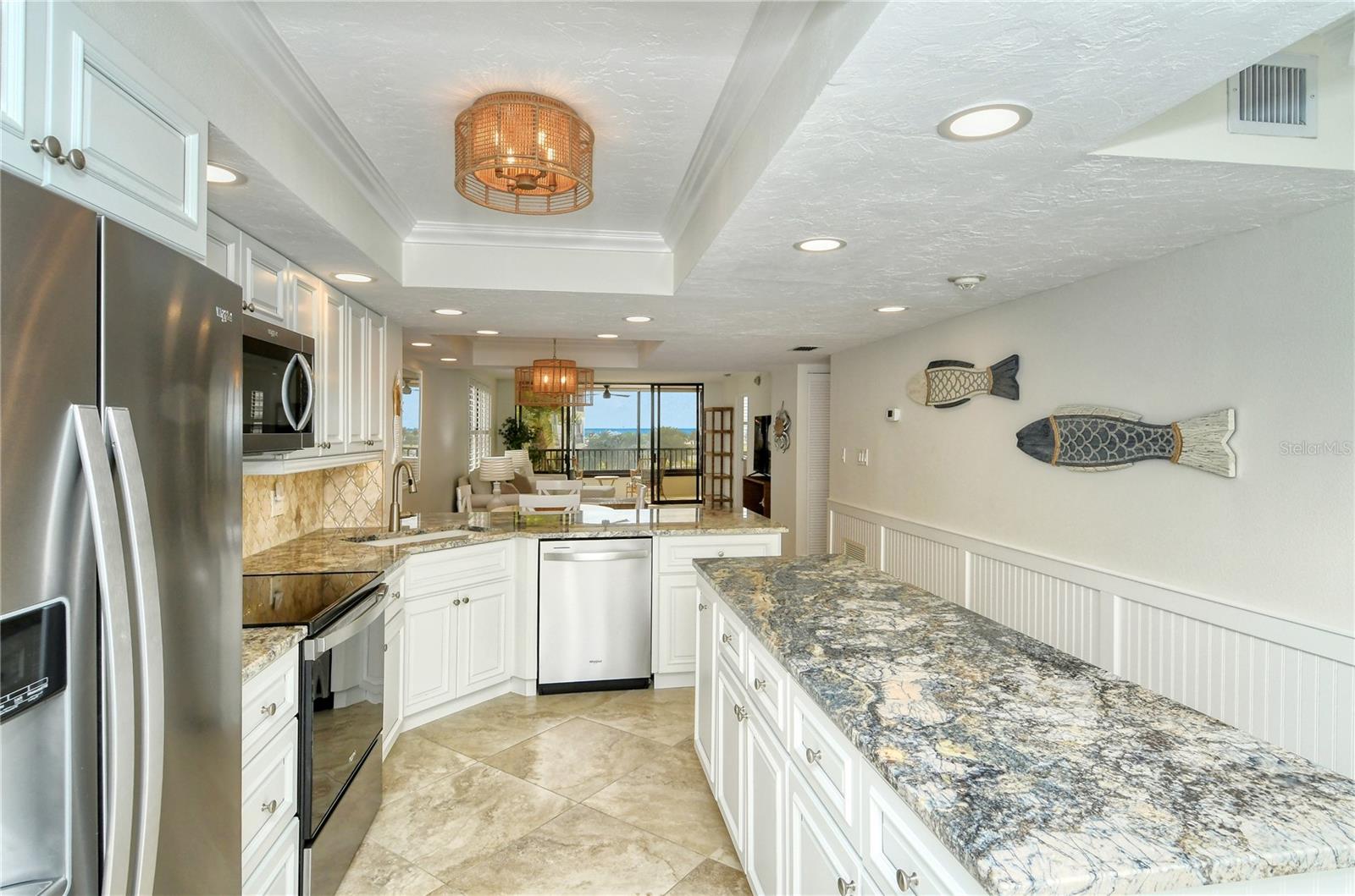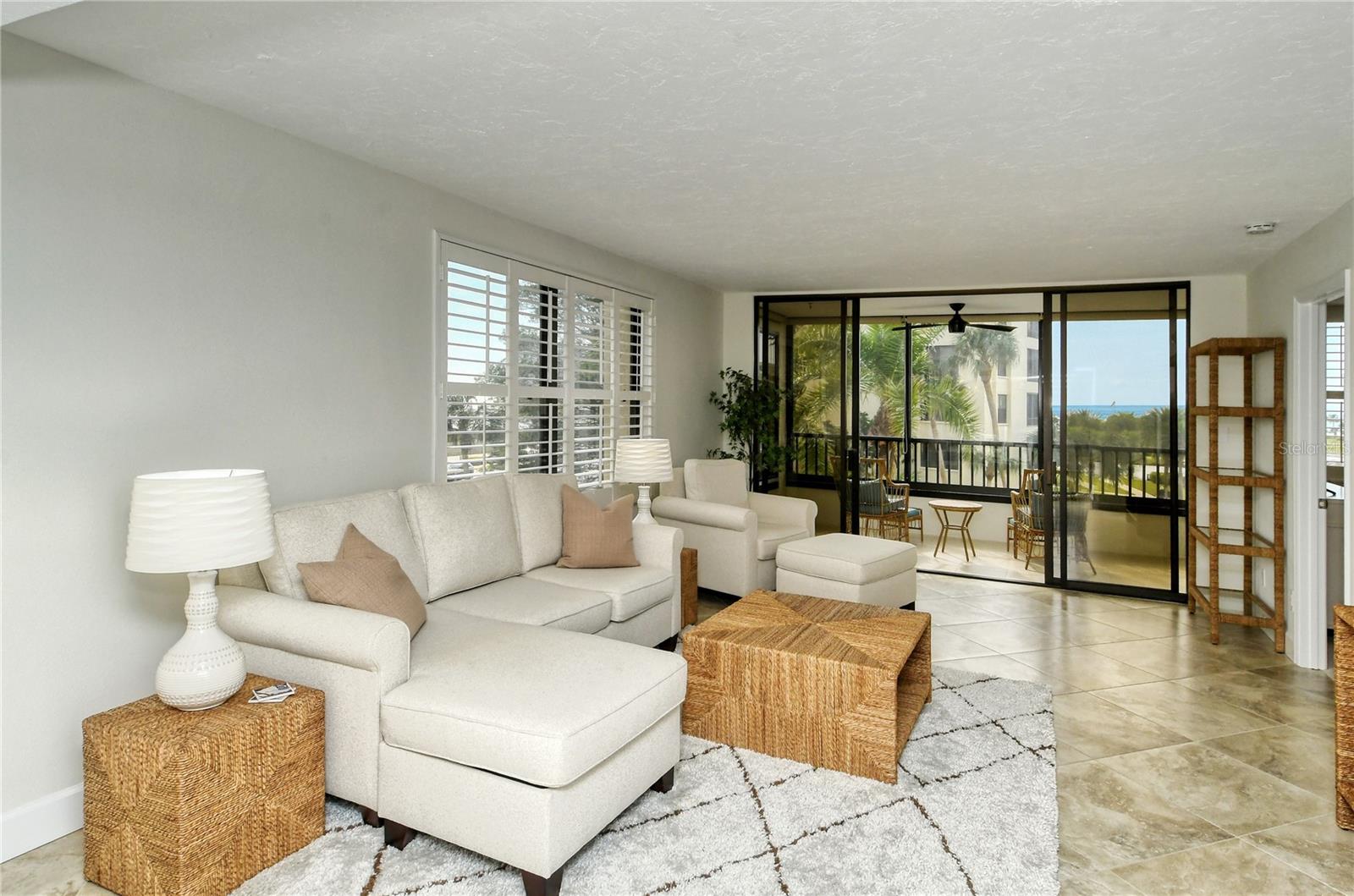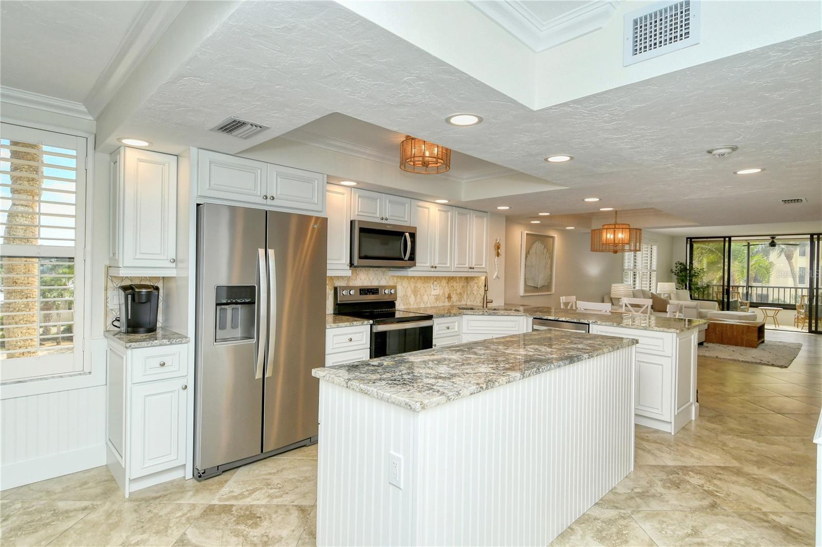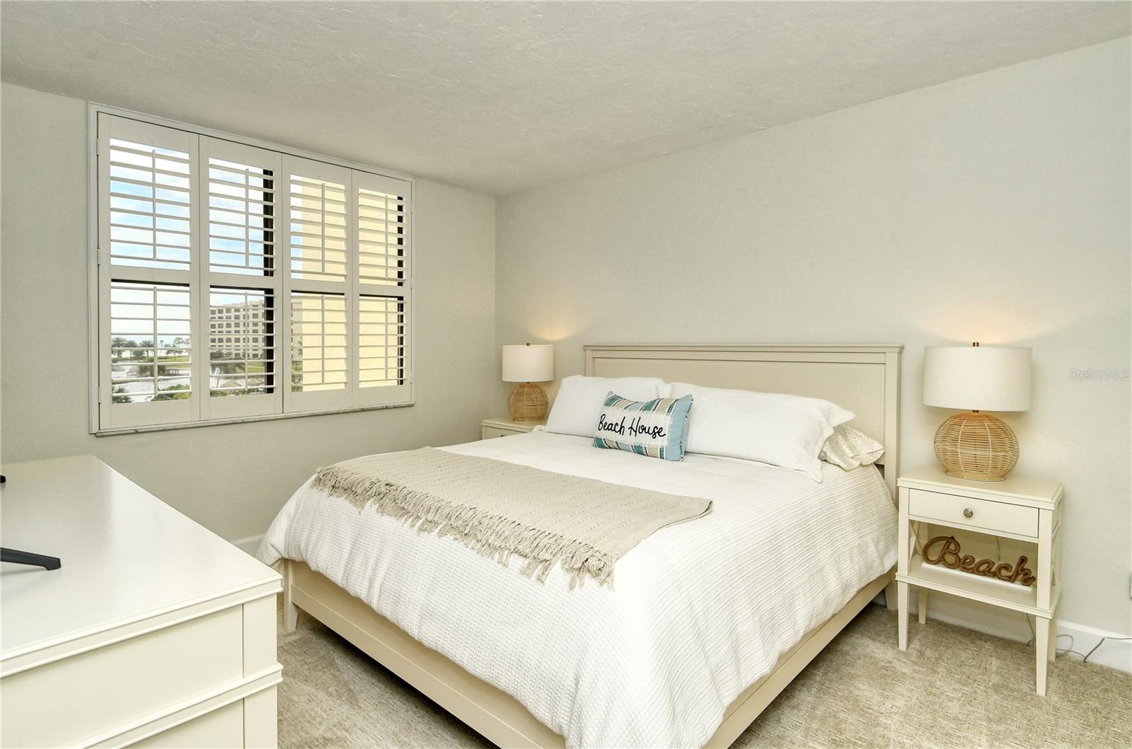 Do not miss the opportunity to purchase this fabulous, 2 bed, 2 bath turnkey furnished end unit condo, fully updated (kitchen, baths & more) & beautifully decorated with the most amazing views of the Gulf of Mexico (Siesta Key Beach) and Siesta itself! This 3rd floor unit certainly has the “Wow” factor immediately as you enter the front door, (which has keyless entry for convenience), being an end unit, there is an abundance of light and spectacular views from all rooms! Plantation shutters are located throughout to control the sun & the decor is so welcoming. You will note the newer white kitchen cabinets, gleaming granite counters with an oversized island complete with breakfast bar seating, all new stainless-steel appliances, unit was freshly painted (ceilings, walls & trim) new carpet in bedrooms, all new electrical outlets & switches, light fixtures, kitchen faucet, brushed nickel doorknobs/hinges, new Pottery Barn furniture throughout, all new screens, a Wi-Fi thermostat and again, keyless entry! A super handy beverage cooler has been installed in kitchen, you will find pull-outs and soft close doors & drawers, wainscoting, crown molding, 2 full sized beds in guest room, a master suite with gulf views , double vanities for convenience in the bath and the most organized closet to fill with your clothes, a true laundry room w/lots of storage for beach toys and so much more!! Did I mention the views?? Sit on your private lanai and watch the sunsets and waves of the Gulf of Mexico. This just isn’t a condo, it's a lifestyle! Gulf & Bay boasts 2 pools, a new fitness center (located right out in front of this building) with saunas, tennis & pickleball courts, basketball, electric car charging stations, clubhouse, indoor hot tub and more!! Location is key here, hop on the free trolley and head to the village for dinner and shopping or take a long walk on the beach, or just lay at the water's edge and be so thankful that you are now living the Siesta Key Beach life, it doesn’t get any better than this!