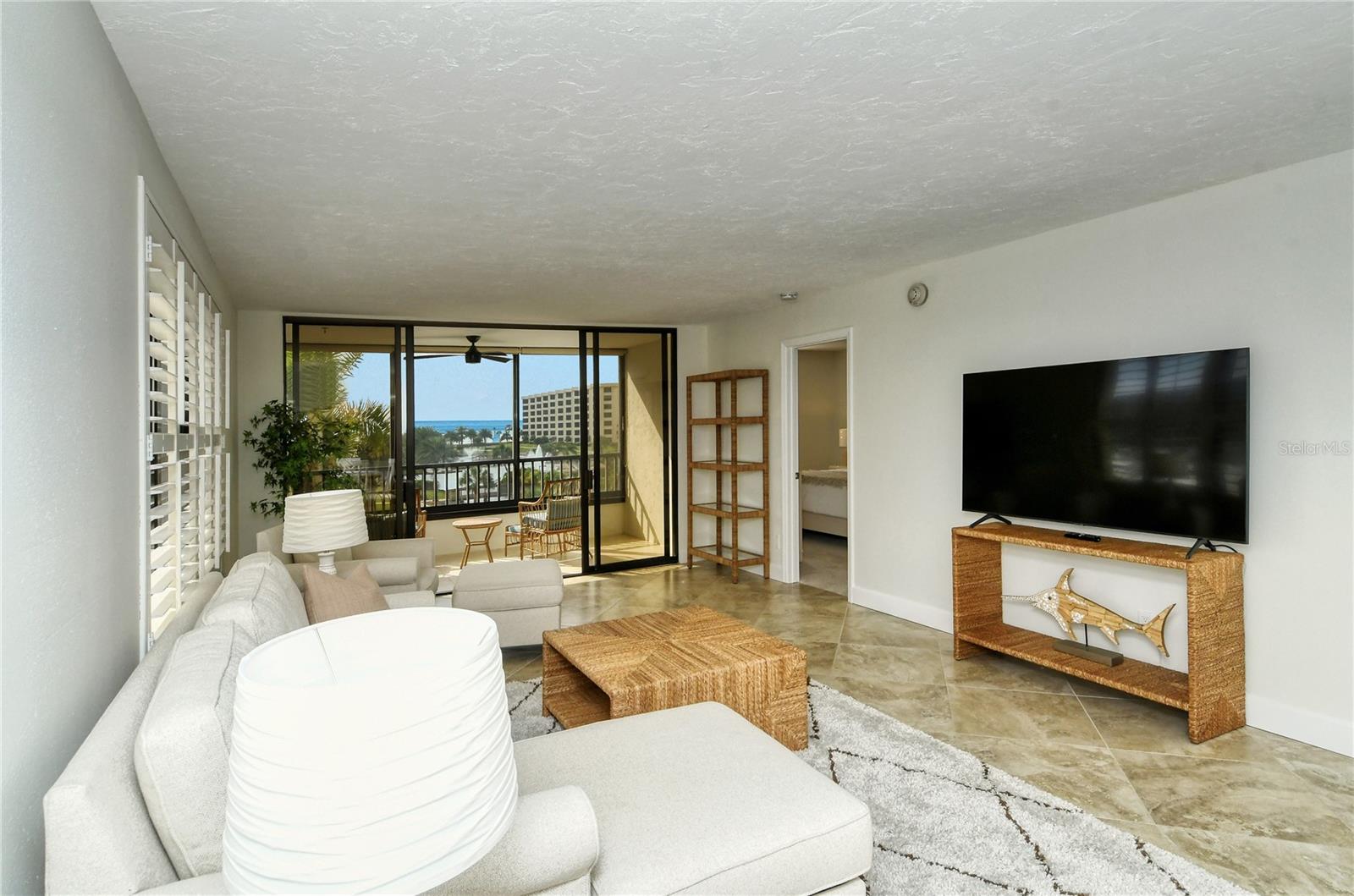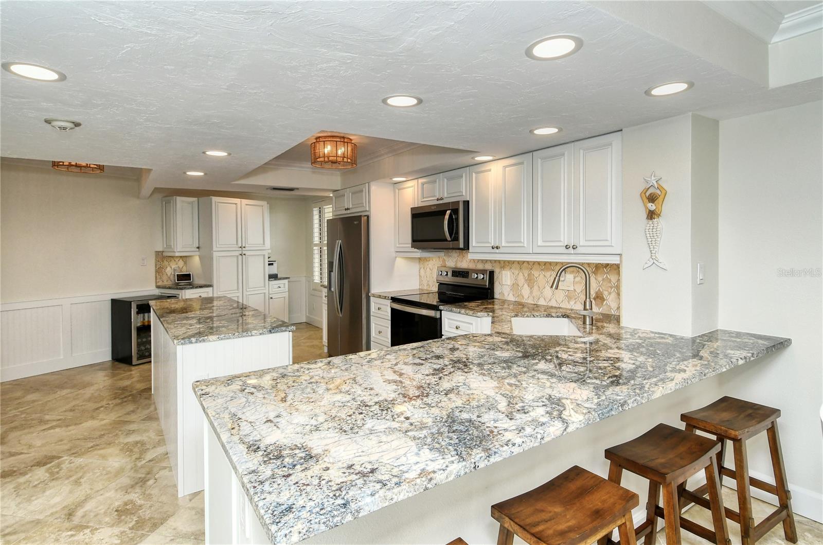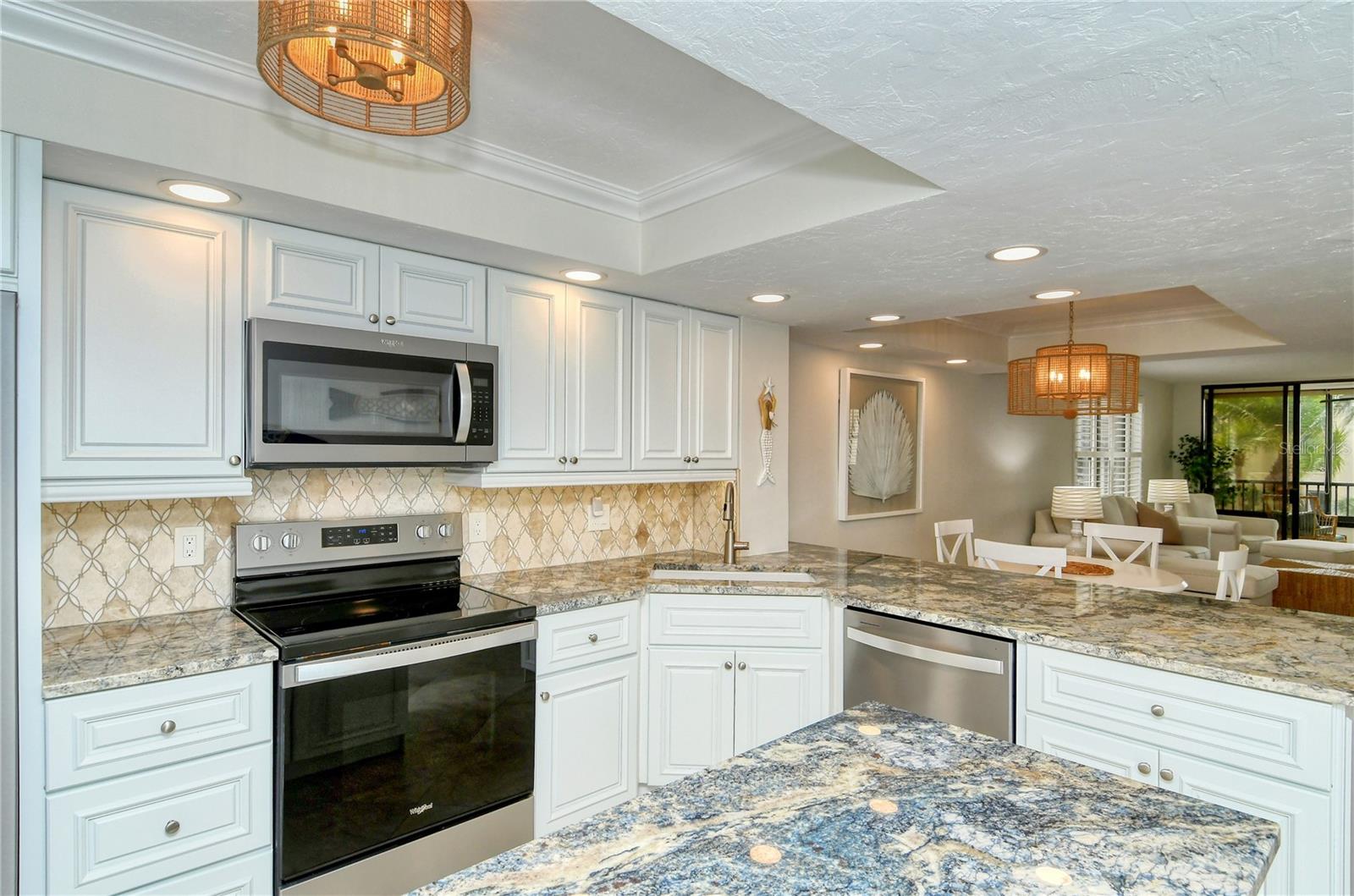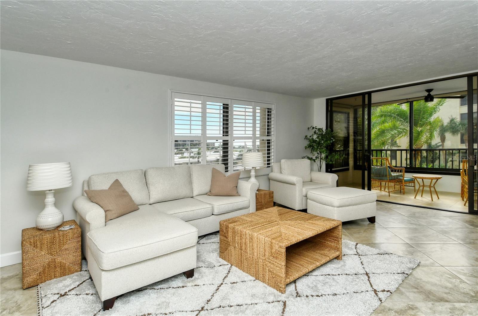 Do not miss the opportunity to purchase this fabulous, 2 bed, 2 bath turnkey furnished end unit condo, fully updated (kitchen, baths & more) & beautifully decorated with the most amazing views of the Gulf of Mexico (Siesta Key Beach) and Siesta itself! This 3rd floor unit certainly has the “Wow” factor immediately as you enter the front door, (which has keyless entry for convenience), being an end unit, there is an abundance of light and spectacular views from all rooms! Plantation shutters are located throughout to control the sun & the decor is so welcoming. You will note the newer white kitchen cabinets, gleaming granite counters with an oversized island complete with breakfast bar seating, all new stainless-steel appliances, unit was freshly painted (ceilings, walls & trim) new carpet in bedrooms, all new electrical outlets & switches, light fixtures, kitchen faucet, brushed nickel doorknobs/hinges, new Pottery Barn furniture throughout, all new screens, a Wi-Fi thermostat and again, keyless entry! A super handy beverage cooler has been installed in kitchen, you will find pull-outs and soft close doors & drawers, wainscoting, crown molding, 2 full sized beds in guest room, a master suite with gulf views , double vanities for convenience in the bath and the most organized closet to fill with your clothes, a true laundry room w/lots of storage for beach toys and so much more!! Did I mention the views?? Sit on your private lanai and watch the sunsets and waves of the Gulf of Mexico. This just isn’t a condo, it's a lifestyle! Gulf & Bay boasts 2 pools, a new fitness center (located right out in front of this building) with saunas, tennis & pickleball courts, basketball, electric car charging stations, clubhouse, indoor hot tub and more!! Location is key here, hop on the free trolley and head to the village for dinner and shopping or take a long walk on the beach, or just lay at the water's edge and be so thankful that you are now living the Siesta Key Beach life, it doesn’t get any better than this!
