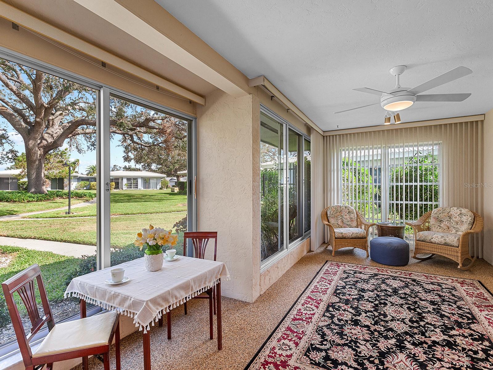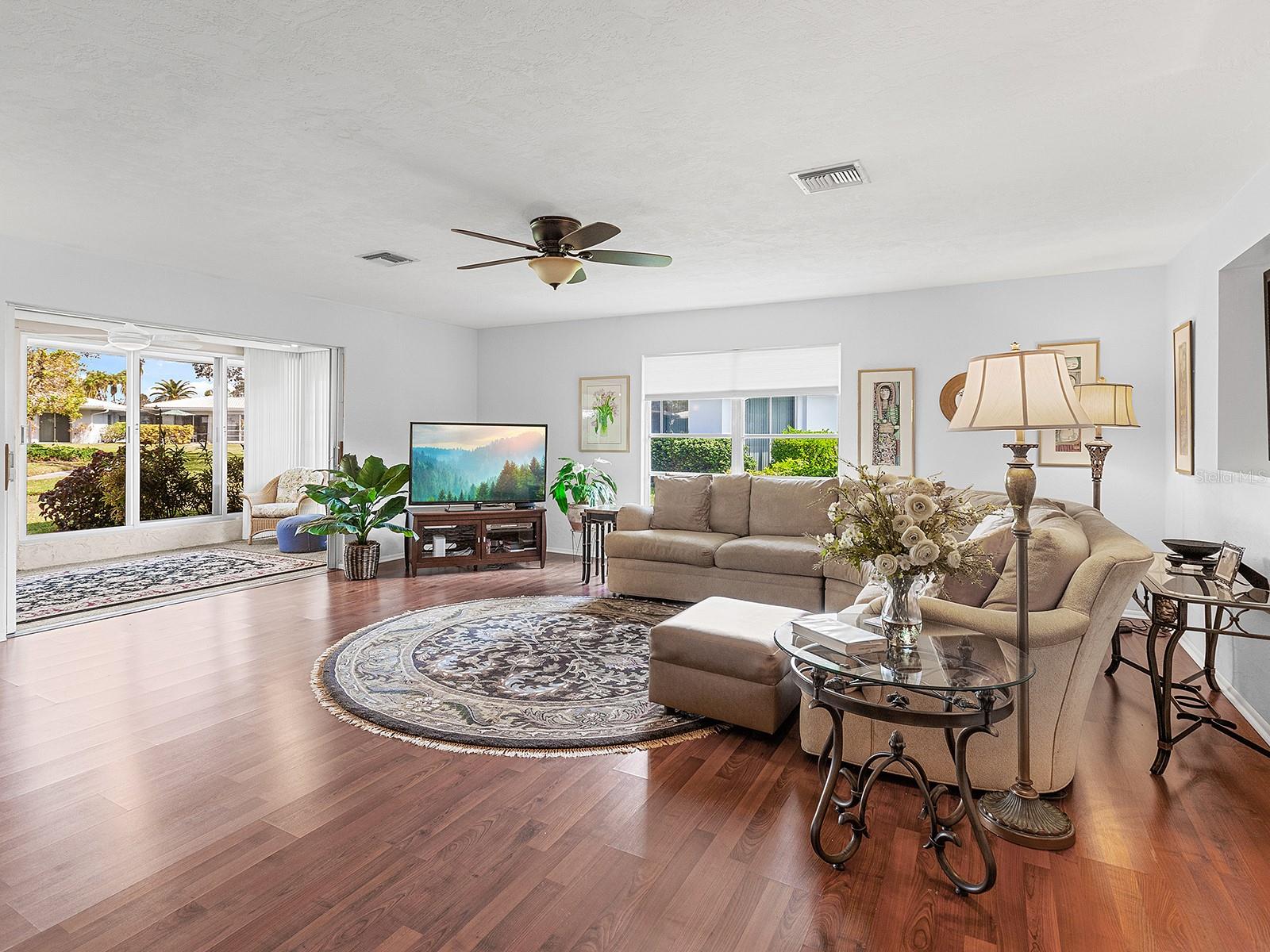 Welcome to your new sanctuary! This move-in ready two-bedroom, two-bath villa is the ideal retreat for those aged 55-plus. The flagstone foyer entrance welcomes you into a one-of-a-kind floor plan, with an open interior boasting a seamless flow that effortlessly connects the living area, dining space, kitchen and lanai. Bask in the natural light-filled interior with views of mature trees, colorful Florida landscaping and sweeping blue skies outside your windows, bringing beauty and instant relaxation. The nicely equipped kitchen features single-shaker cabinetry, granite countertops and stainless steel appliances where you can serve up gourmet creations in the adjacent dining area, in your enclosed air-conditioned lanai or perhaps dining alfresco under the stars from your enchanting outside deck. A spacious great room allows for gatherings of family and friends, while the art enthusiast can delight in the generous wall space to hang their collection. You will rest assured, retiring from the day’s adventures in your capacious primary suite with dual walk-in closets. Convenience is key with an attached two-car garage, inside utility and additional storage solutions. And to add to your peace of mind, it’s been totally re-piped throughout. So, whether you enjoy a relaxing swim at the heated pool or like to count your steps on a leisurely stroll along the walking paths, this top-notch location offers easy access to area beaches, shopping, dining, the arts and entertainment, and all life’s necessities. Don’t miss out on this incredible opportunity to enjoy a low-maintenance lifestyle in a friendly and welcoming community. Schedule your tour today and experience the blend of comfort, style and convenience.