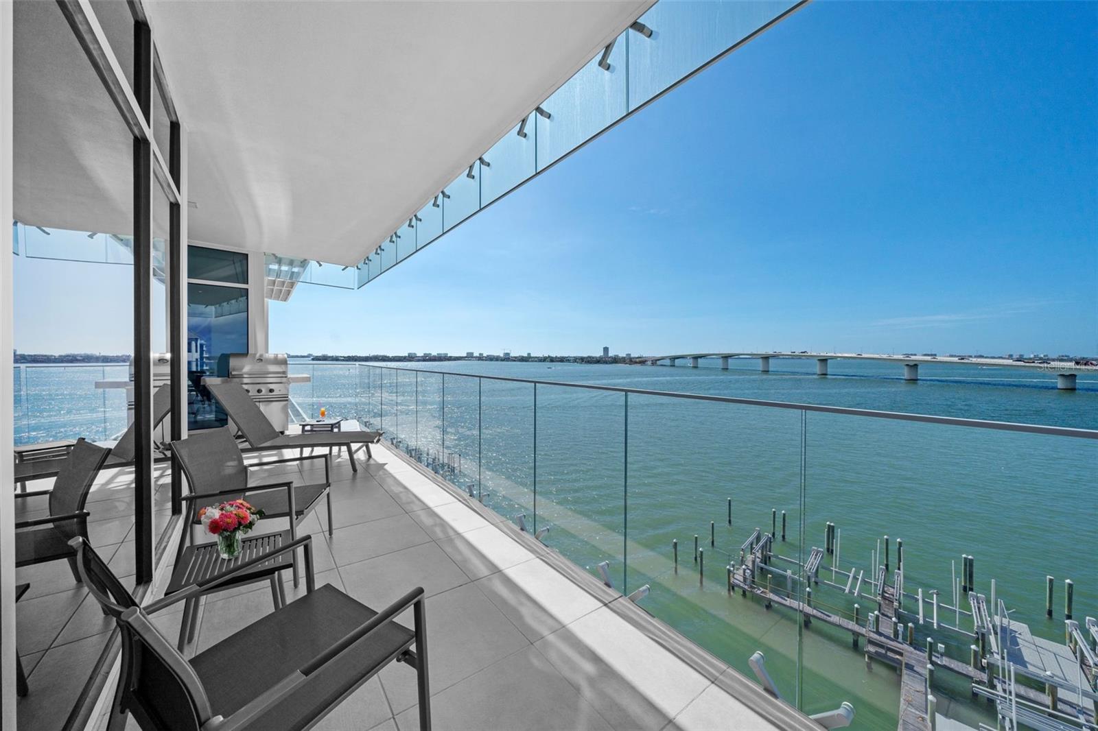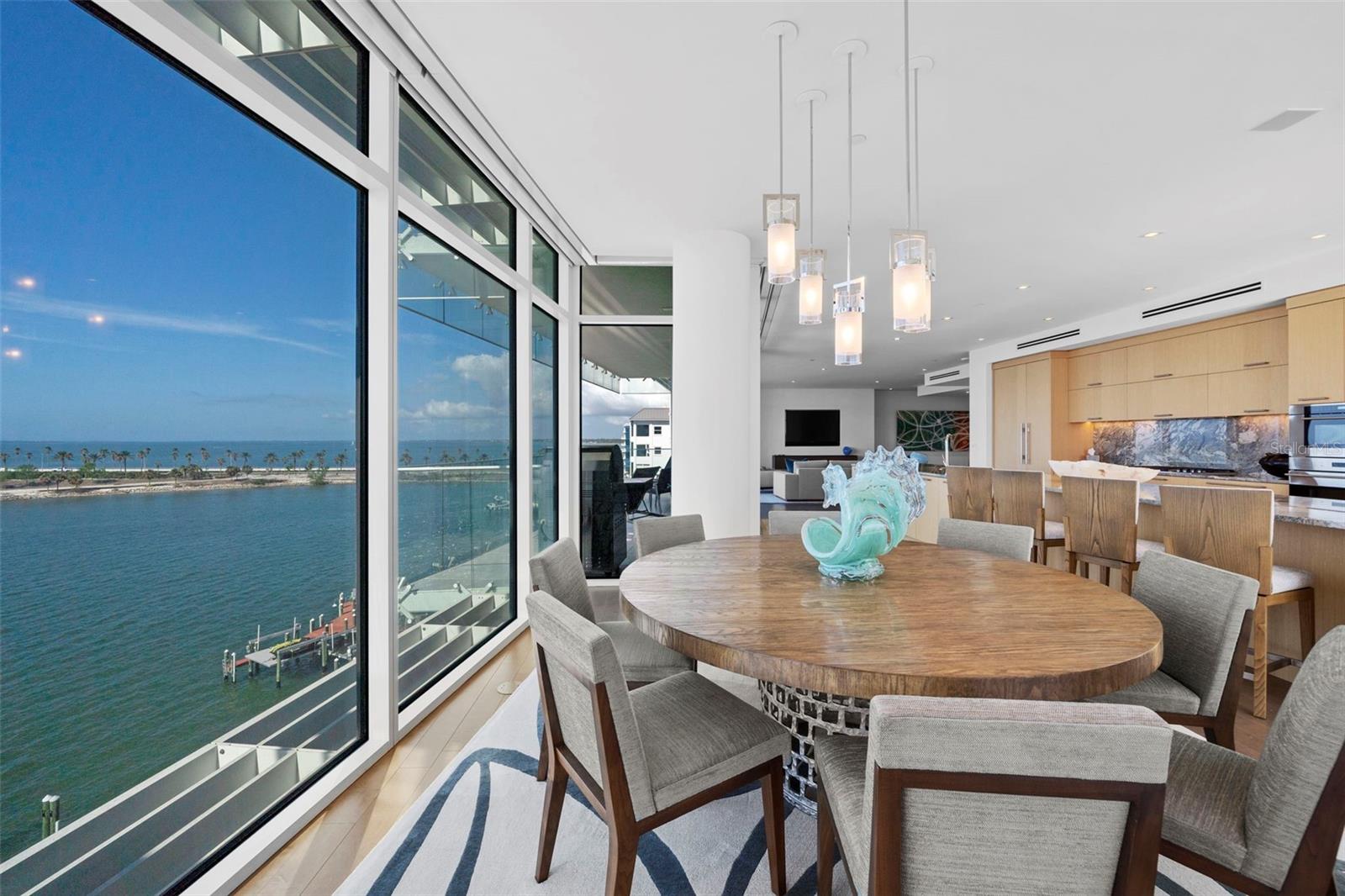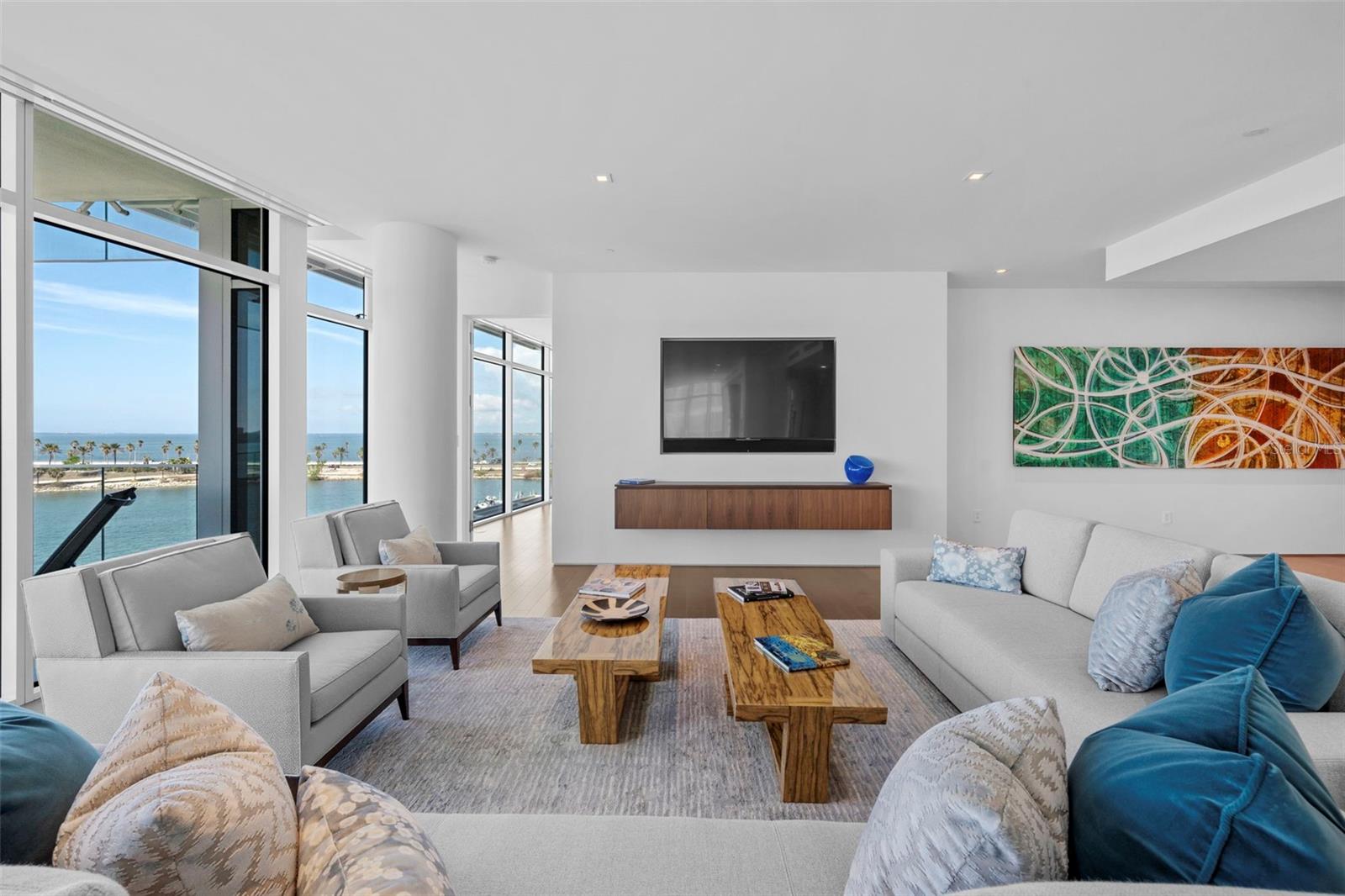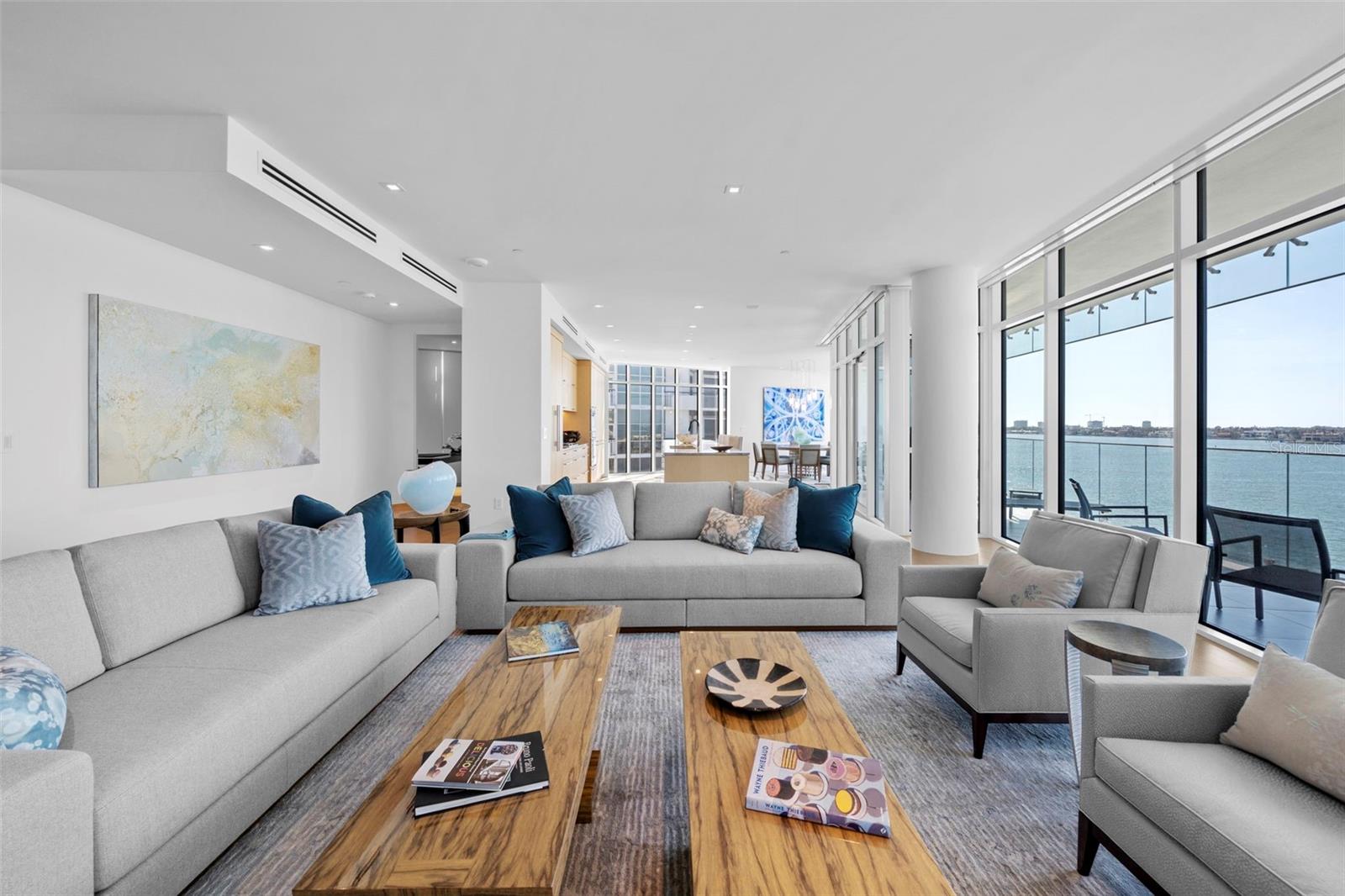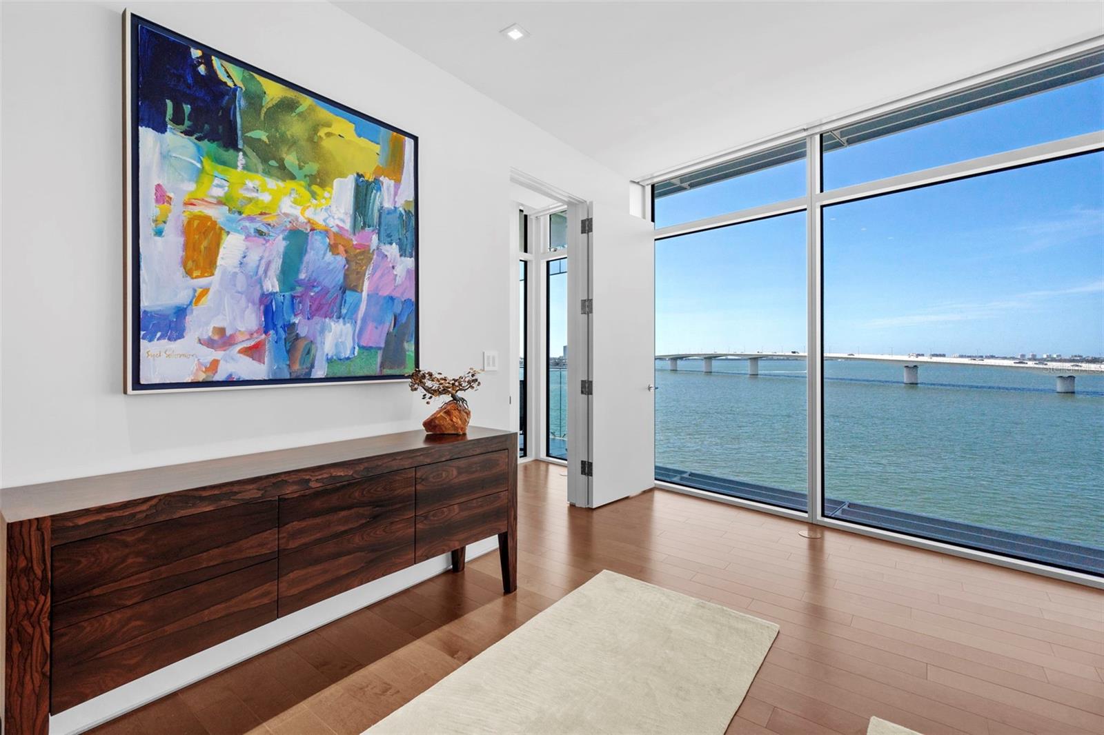 Welcome to AQUA, a pinnacle of refined luxury and architectural brilliance on Golden Gate Point. Designed by heralded modernist architect, Guy Peterson, this exclusive nine-story boutique building is home to only eight exquisite, full-floor residences, each designed for unparalleled privacy and sophistication. This 6th floor residence offers sweeping, unobstructed 180-degree views of Sarasota Bay and beyond, complete with a private boat dock. The location is enviable as it's just steps from the vibrant energy of downtown Sarasota. With over 4,100 square feet under air, this light-filled residence boasts 10-foot floor-to-ceiling walls of glass where the owners have curated some of the finest interiors in our marketplace. Hundreds of thousands of dollars were spent on elevating each aspect of this spectacular residence above and beyond the original finishes. The plan flows beautifully after entering the formal foyer from your private elevator turning the corner to experience the breathtaking views from the stunning living room. The adjacent wet bar area is positioned perfectly for entertaining guests. The gourmet kitchen features a Wolf cooktop and ovens, 2 Miele dishwashers and a Sub-Zero refrigerator. Cuisnes Laurier cabinetry and an expansive island topped with quartzite Cielo countertop provides casual in-kitchen dining. The adjacent formal dining room is a stunning space with 2 walls of glass offering views all around. The spacious water-side primary suite serves as a true sanctuary, offering a custom walk-in closet with individual sections fronted by Cuisimax poly-gloss doors and packing stations with extra storage. The spa-like primary bath features a dual vanity with blue crystal marble countertops and undermount sinks, a glass walk-in shower with full tile surround, a soaking tub and private water closet. The two guest suites are situated for complete privacy with walk-in closets and en-suite baths with the fourth bedroom currently serving as an office. With practical conveniences including extra storage flanking the service elevator entry, a Lutron light system, two sets of electronic blinds: both solar and privacy throughout. AQUA's state-of-the-art amenities create an environment that feels both exclusive and resort-like. Residents enjoy highly personalized concierge services, a private elevator, an enclosed two-car garage with dehumidifier and an EV charging station, a waterfront heated pool and spa, a fitness studio, temperature-controlled wine storage/wine tasting room and a rooftop observation area with stunning panoramic views. The building also includes architecturally landscaped grounds, sauna and secure spaces for meetings and entertaining. AQUA is truly an intimate and exclusive sanctuary reflecting a heritage of Sarasota's architectural elegance and embodies the pinnacle of modern coastal living. Discover AQUA, where refined elegance meets Sarasota's vibrant downtown and idyllic beaches.