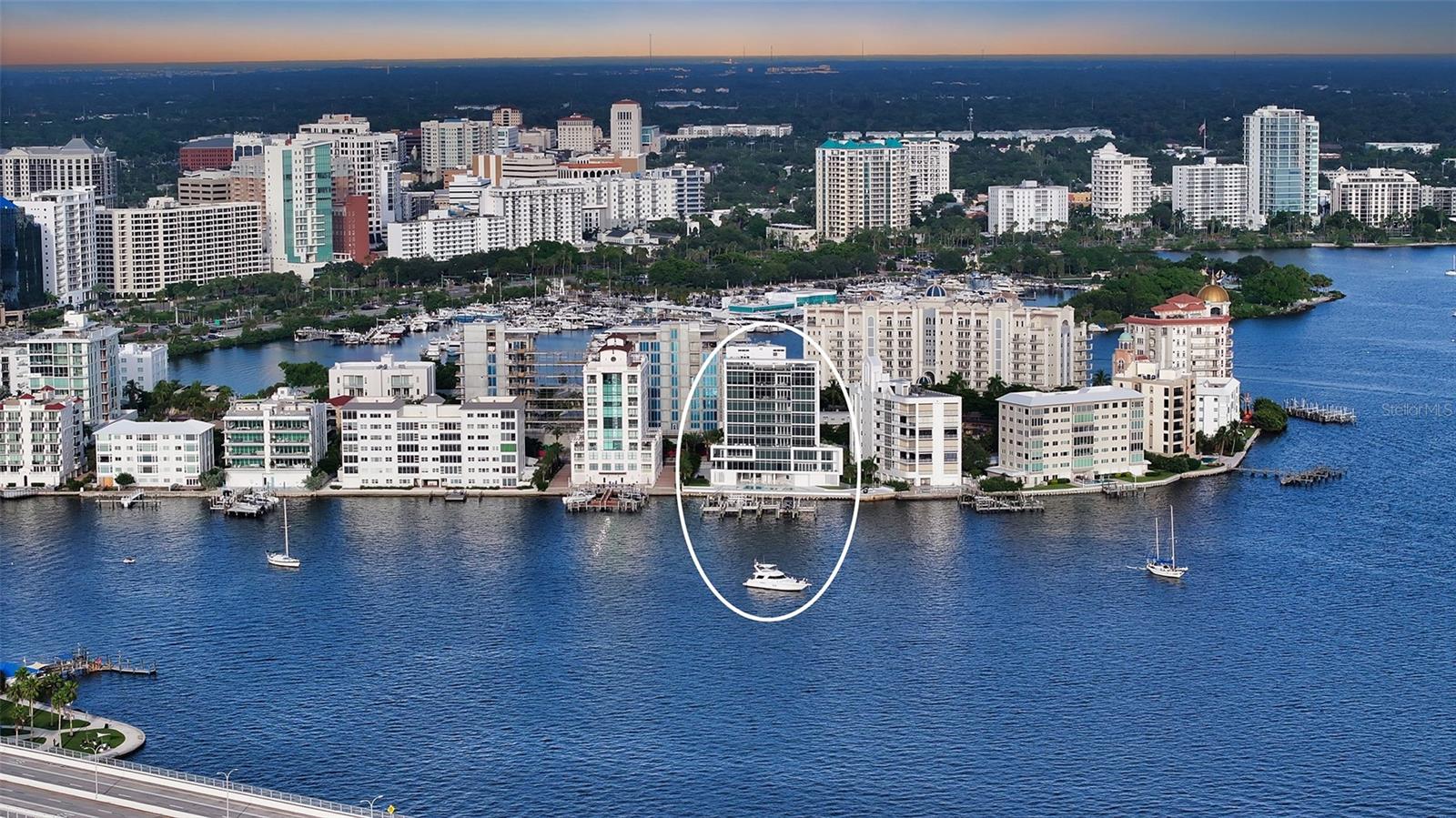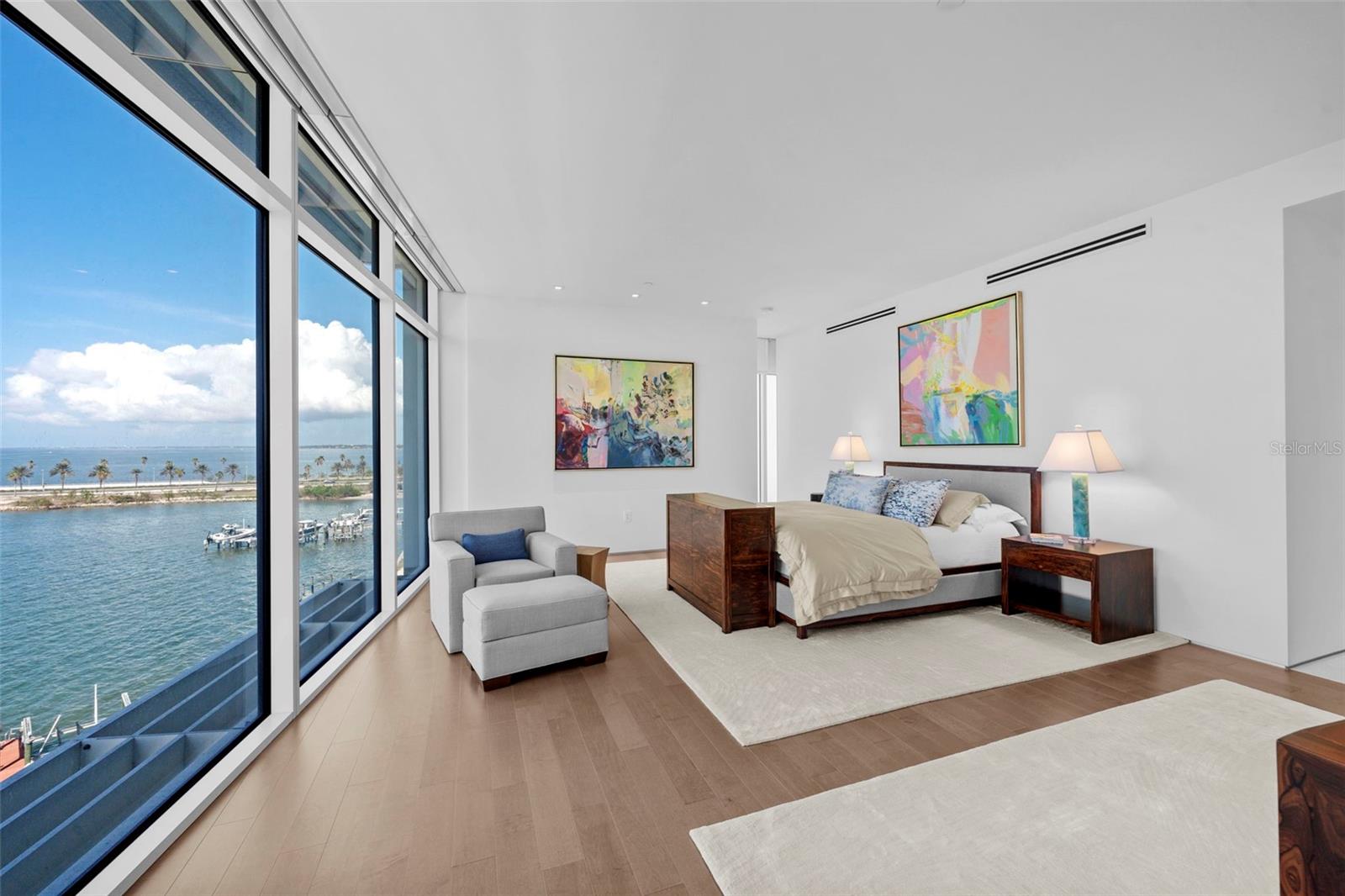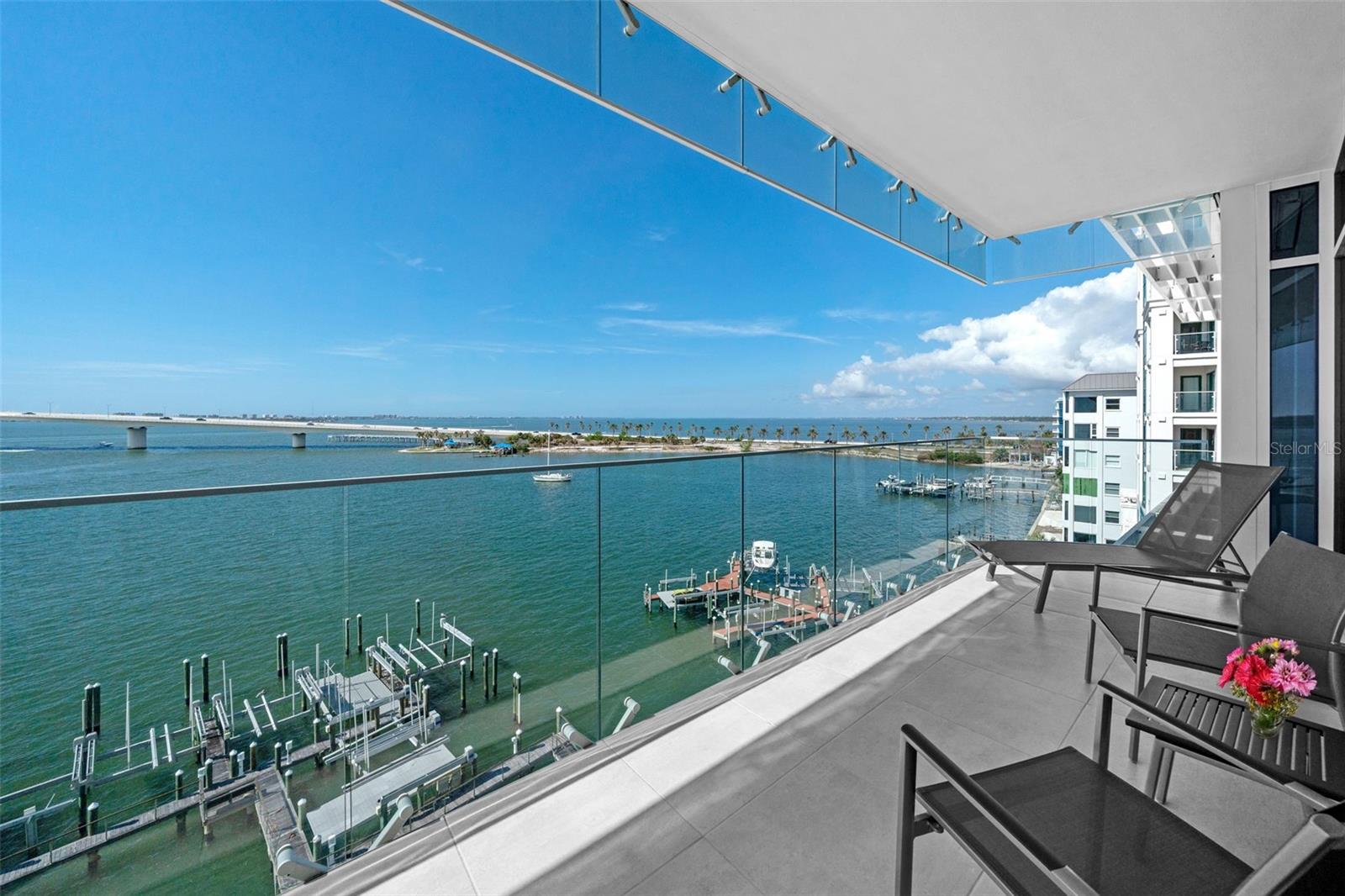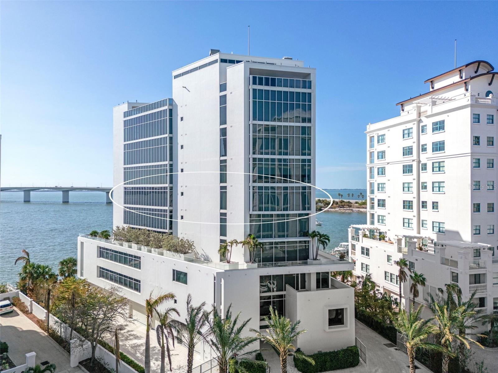 Welcome to AQUA, a pinnacle of refined luxury and architectural brilliance on Golden Gate Point. Designed by heralded modernist architect, Guy Peterson, this exclusive nine-story boutique building is home to only eight exquisite, full-floor residences, each designed for unparalleled privacy and sophistication. This 6th floor residence offers sweeping, unobstructed 180-degree views of Sarasota Bay and beyond, complete with a private boat dock. The location is enviable as it's just steps from the vibrant energy of downtown Sarasota. With over 4,100 square feet under air, this light-filled residence boasts 10-foot floor-to-ceiling walls of glass where the owners have curated some of the finest interiors in our marketplace. Hundreds of thousands of dollars were spent on elevating each aspect of this spectacular residence above and beyond the original finishes. The plan flows beautifully after entering the formal foyer from your private elevator turning the corner to experience the breathtaking views from the stunning living room. The adjacent wet bar area is positioned perfectly for entertaining guests. The gourmet kitchen features a Wolf cooktop and ovens, 2 Miele dishwashers and a Sub-Zero refrigerator. Cuisnes Laurier cabinetry and an expansive island topped with quartzite Cielo countertop provides casual in-kitchen dining. The adjacent formal dining room is a stunning space with 2 walls of glass offering views all around. The spacious water-side primary suite serves as a true sanctuary, offering a custom walk-in closet with individual sections fronted by Cuisimax poly-gloss doors and packing stations with extra storage. The spa-like primary bath features a dual vanity with blue crystal marble countertops and undermount sinks, a glass walk-in shower with full tile surround, a soaking tub and private water closet. The two guest suites are situated for complete privacy with walk-in closets and en-suite baths with the fourth bedroom currently serving as an office. With practical conveniences including extra storage flanking the service elevator entry, a Lutron light system, two sets of electronic blinds: both solar and privacy throughout. AQUA's state-of-the-art amenities create an environment that feels both exclusive and resort-like. Residents enjoy highly personalized concierge services, a private elevator, an enclosed two-car garage with dehumidifier and an EV charging station, a waterfront heated pool and spa, a fitness studio, temperature-controlled wine storage/wine tasting room and a rooftop observation area with stunning panoramic views. The building also includes architecturally landscaped grounds, sauna and secure spaces for meetings and entertaining. AQUA is truly an intimate and exclusive sanctuary reflecting a heritage of Sarasota's architectural elegance and embodies the pinnacle of modern coastal living. Discover AQUA, where refined elegance meets Sarasota's vibrant downtown and idyllic beaches.