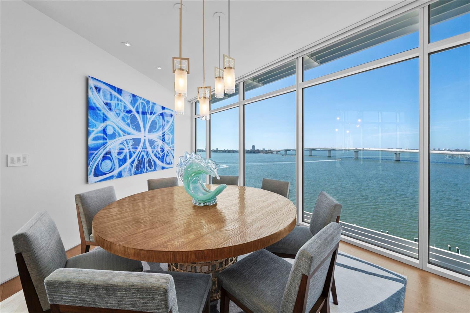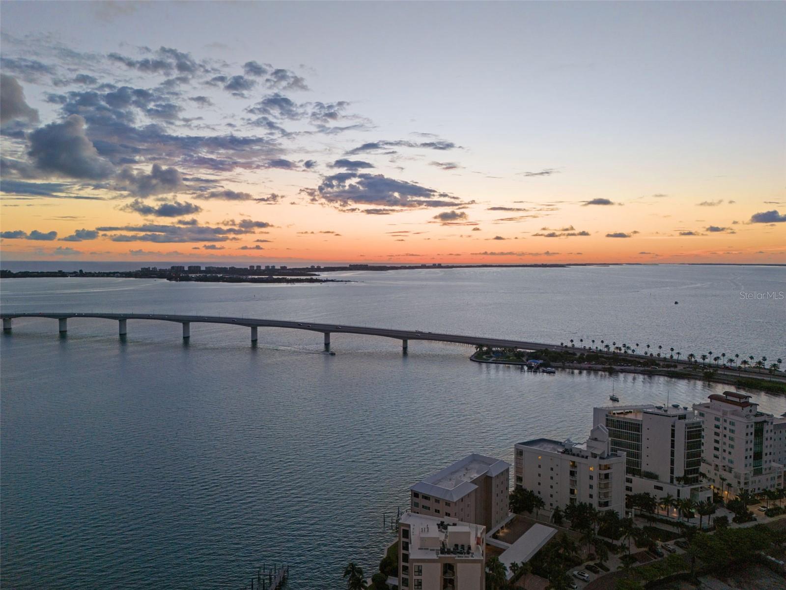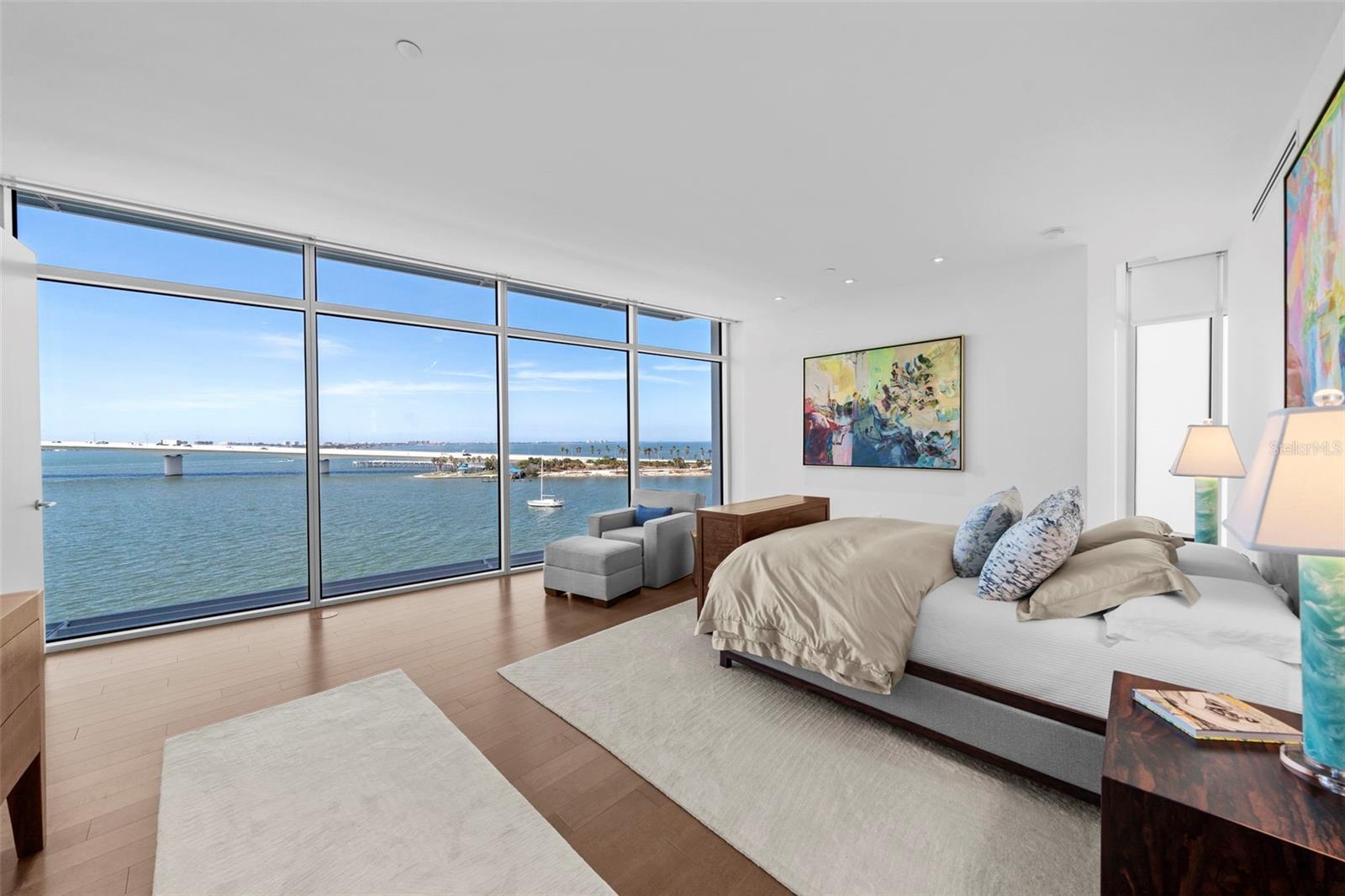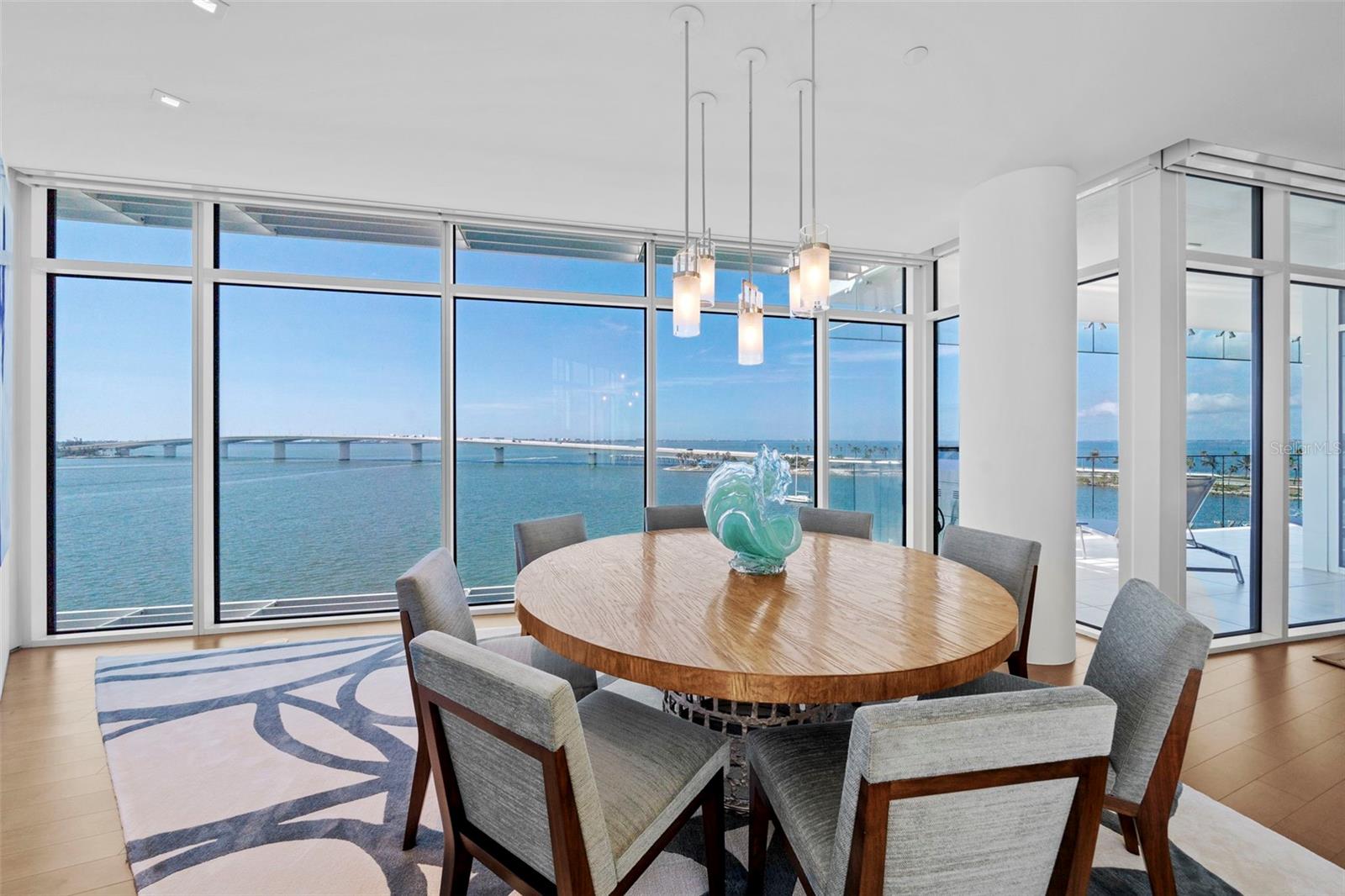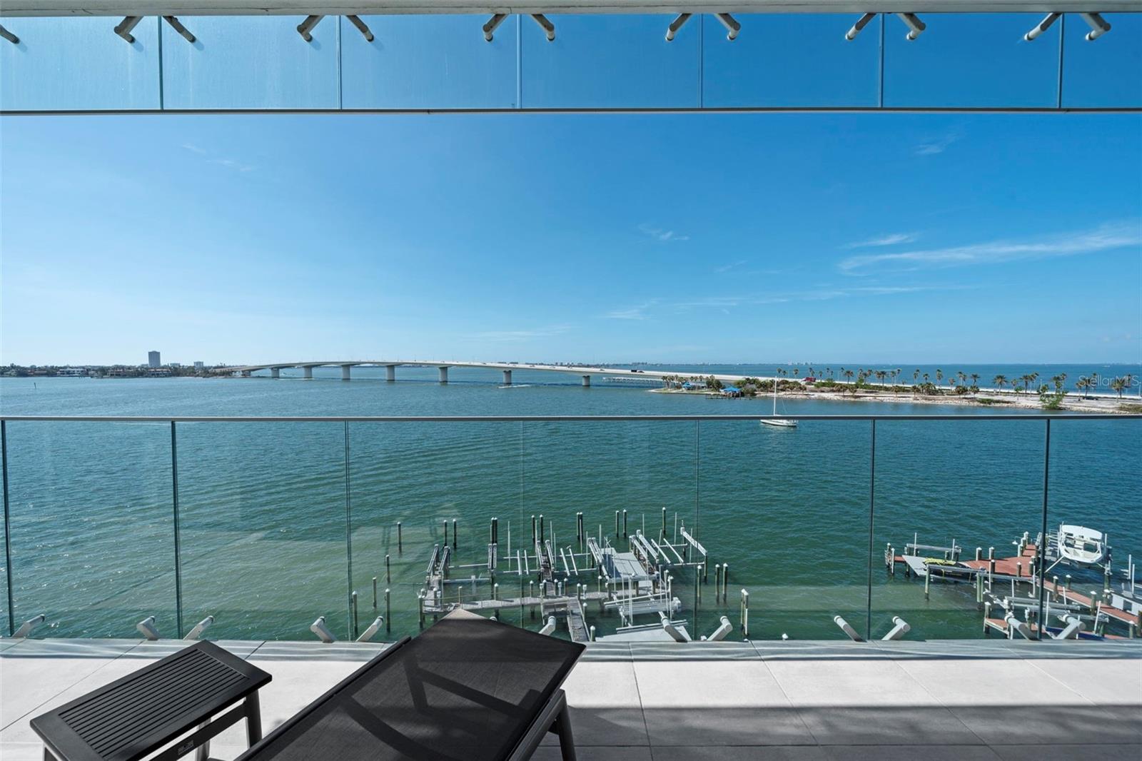Welcome to AQUA, a pinnacle of refined luxury and architectural brilliance on Golden Gate Point. Designed by heralded modernist architect, Guy Peterson, this exclusive nine-story boutique building is home to only eight exquisite, full-floor residences, each designed for unparalleled privacy and sophistication. This 6th floor residence offers sweeping, unobstructed 180-degree views of Sarasota Bay and beyond, complete with a private boat dock. The location is enviable as it's just steps from the vibrant energy of downtown Sarasota. With over 4,100 square feet under air, this light-filled residence boasts 10-foot floor-to-ceiling walls of glass where the owners have curated some of the finest interiors in our marketplace. Hundreds of thousands of dollars were spent on elevating each aspect of this spectacular residence above and beyond the original finishes. The plan flows beautifully after entering the formal foyer from your private elevator turning the corner to experience the breathtaking views from the stunning living room. The adjacent wet bar area is positioned perfectly for entertaining guests. The gourmet kitchen features a Wolf cooktop and ovens, 2 Miele dishwashers and a Sub-Zero refrigerator. Cuisnes Laurier cabinetry and an expansive island topped with quartzite Cielo countertop provides casual in-kitchen dining. The adjacent formal dining room is a stunning space with 2 walls of glass offering views all around. The spacious water-side primary suite serves as a true sanctuary, offering a custom walk-in closet with individual sections fronted by Cuisimax poly-gloss doors and packing stations with extra storage. The spa-like primary bath features a dual vanity with blue crystal marble countertops and undermount sinks, a glass walk-in shower with full tile surround, a soaking tub and private water closet. The two guest suites are situated for complete privacy with walk-in closets and en-suite baths with the fourth bedroom currently serving as an office. With practical conveniences including extra storage flanking the service elevator entry, a Lutron light system, two sets of electronic blinds: both solar and privacy throughout. AQUA's state-of-the-art amenities create an environment that feels both exclusive and resort-like. Residents enjoy highly personalized concierge services, a private elevator, an enclosed two-car garage with dehumidifier and an EV charging station, a waterfront heated pool and spa, a fitness studio, temperature-controlled wine storage/wine tasting room and a rooftop observation area with stunning panoramic views. The building also includes architecturally landscaped grounds, sauna and secure spaces for meetings and entertaining. AQUA is truly an intimate and exclusive sanctuary reflecting a heritage of Sarasota's architectural elegance and embodies the pinnacle of modern coastal living. Discover AQUA, where refined elegance meets Sarasota's vibrant downtown and idyllic beaches.