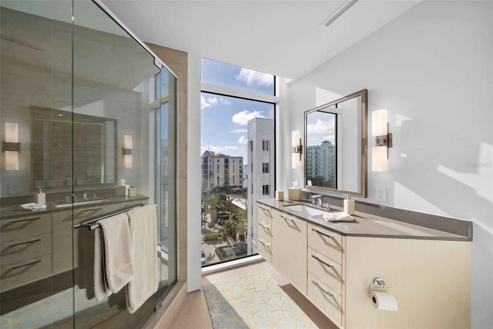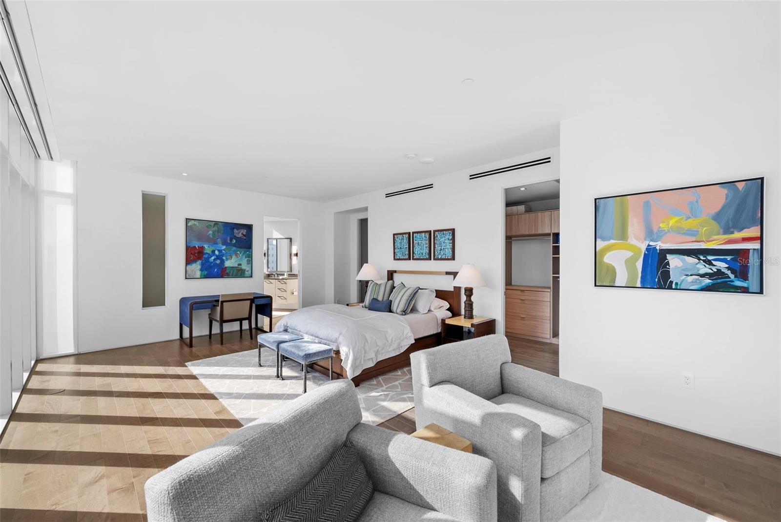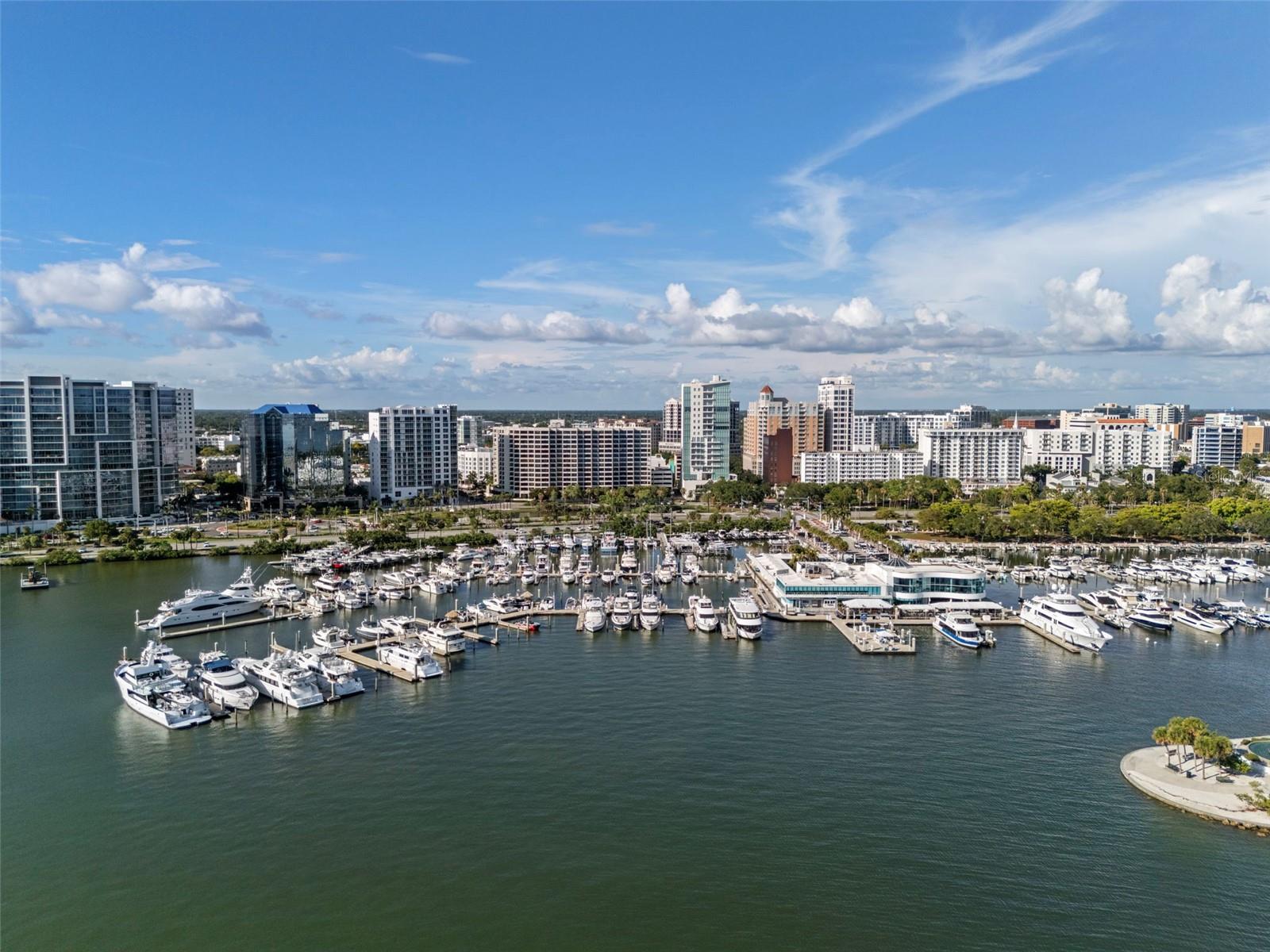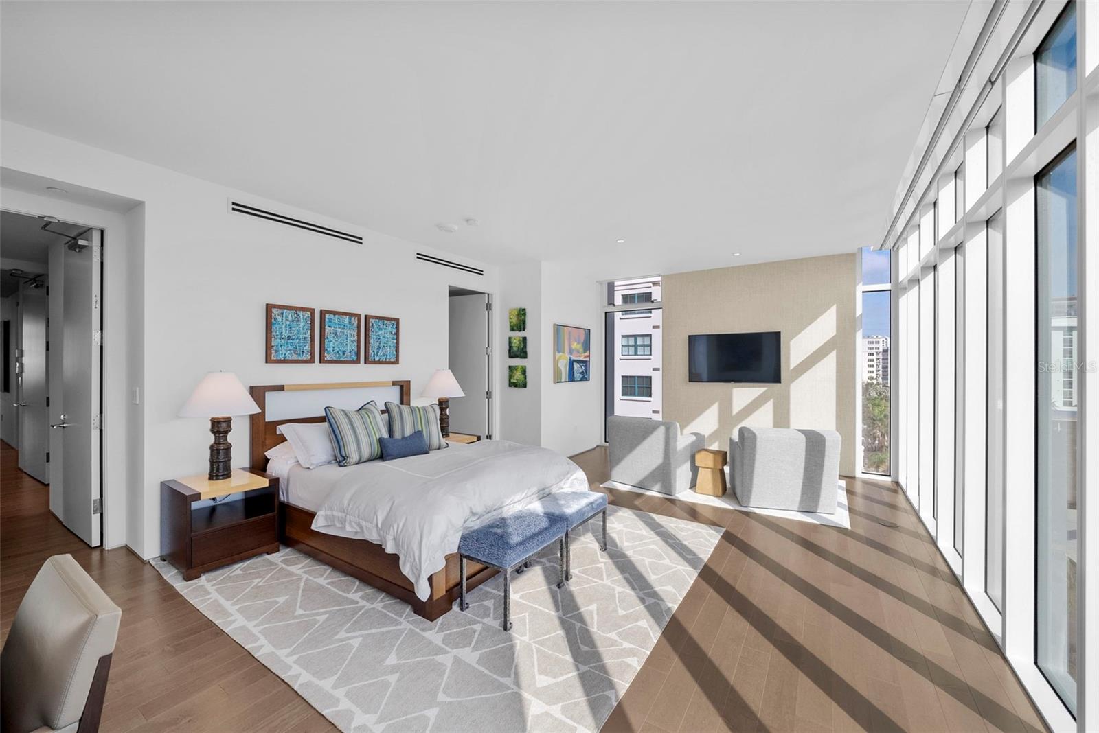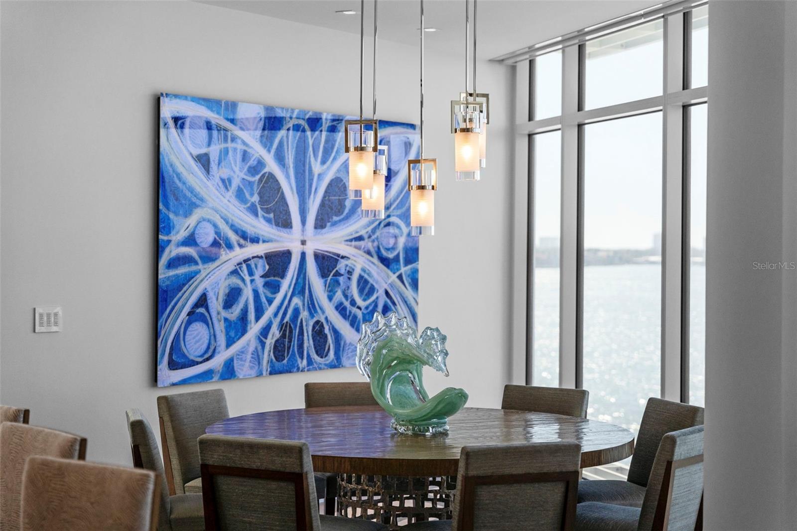 Welcome to AQUA, a pinnacle of refined luxury and architectural brilliance on Golden Gate Point. Designed by heralded modernist architect, Guy Peterson, this exclusive nine-story boutique building is home to only eight exquisite, full-floor residences, each designed for unparalleled privacy and sophistication. This 6th floor residence offers sweeping, unobstructed 180-degree views of Sarasota Bay and beyond, complete with a private boat dock. The location is enviable as it's just steps from the vibrant energy of downtown Sarasota. With over 4,100 square feet under air, this light-filled residence boasts 10-foot floor-to-ceiling walls of glass where the owners have curated some of the finest interiors in our marketplace. Hundreds of thousands of dollars were spent on elevating each aspect of this spectacular residence above and beyond the original finishes. The plan flows beautifully after entering the formal foyer from your private elevator turning the corner to experience the breathtaking views from the stunning living room. The adjacent wet bar area is positioned perfectly for entertaining guests. The gourmet kitchen features a Wolf cooktop and ovens, 2 Miele dishwashers and a Sub-Zero refrigerator. Cuisnes Laurier cabinetry and an expansive island topped with quartzite Cielo countertop provides casual in-kitchen dining. The adjacent formal dining room is a stunning space with 2 walls of glass offering views all around. The spacious water-side primary suite serves as a true sanctuary, offering a custom walk-in closet with individual sections fronted by Cuisimax poly-gloss doors and packing stations with extra storage. The spa-like primary bath features a dual vanity with blue crystal marble countertops and undermount sinks, a glass walk-in shower with full tile surround, a soaking tub and private water closet. The two guest suites are situated for complete privacy with walk-in closets and en-suite baths with the fourth bedroom currently serving as an office. With practical conveniences including extra storage flanking the service elevator entry, a Lutron light system, two sets of electronic blinds: both solar and privacy throughout. AQUA's state-of-the-art amenities create an environment that feels both exclusive and resort-like. Residents enjoy highly personalized concierge services, a private elevator, an enclosed two-car garage with dehumidifier and an EV charging station, a waterfront heated pool and spa, a fitness studio, temperature-controlled wine storage/wine tasting room and a rooftop observation area with stunning panoramic views. The building also includes architecturally landscaped grounds, sauna and secure spaces for meetings and entertaining. AQUA is truly an intimate and exclusive sanctuary reflecting a heritage of Sarasota's architectural elegance and embodies the pinnacle of modern coastal living. Discover AQUA, where refined elegance meets Sarasota's vibrant downtown and idyllic beaches.