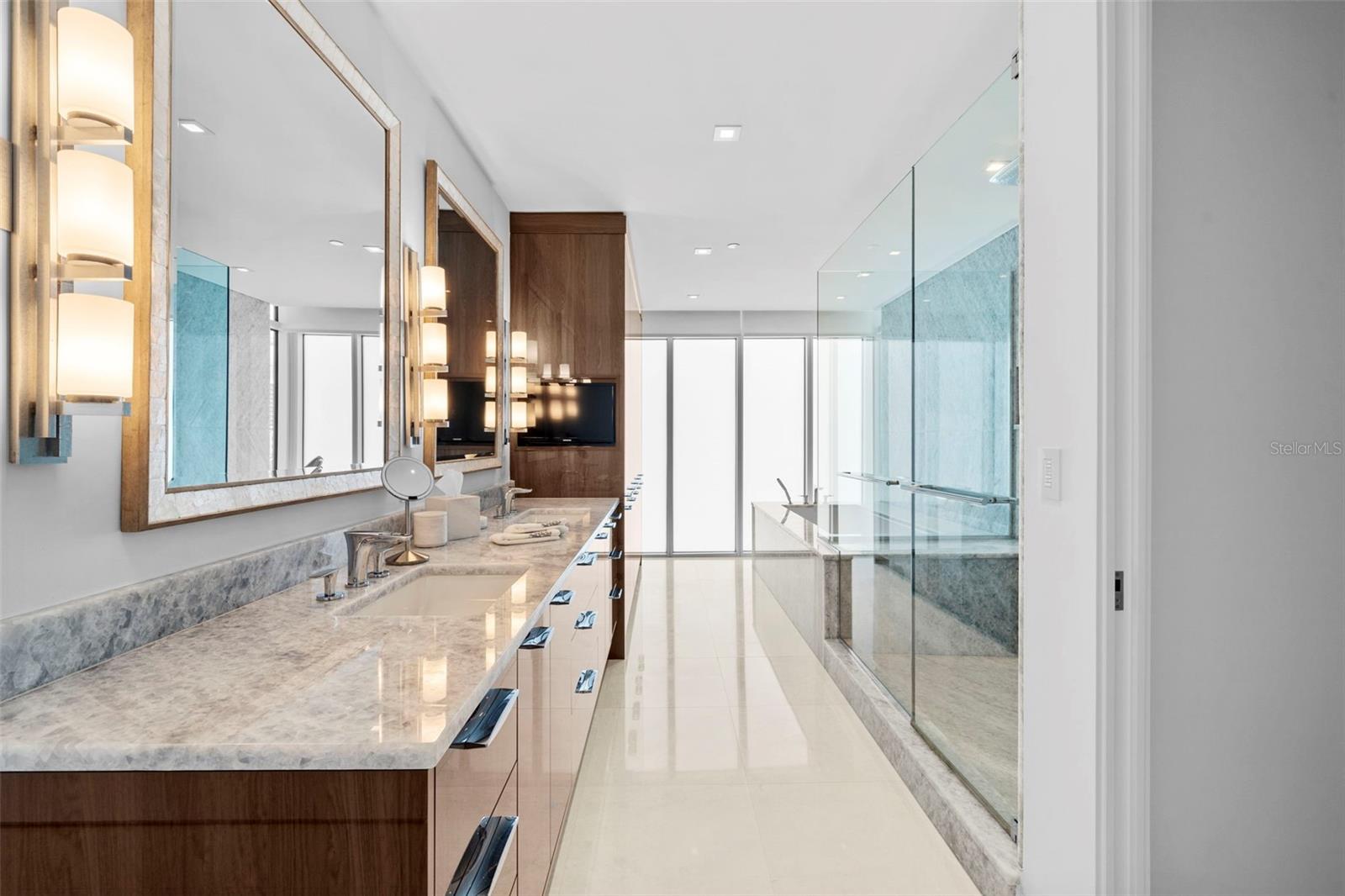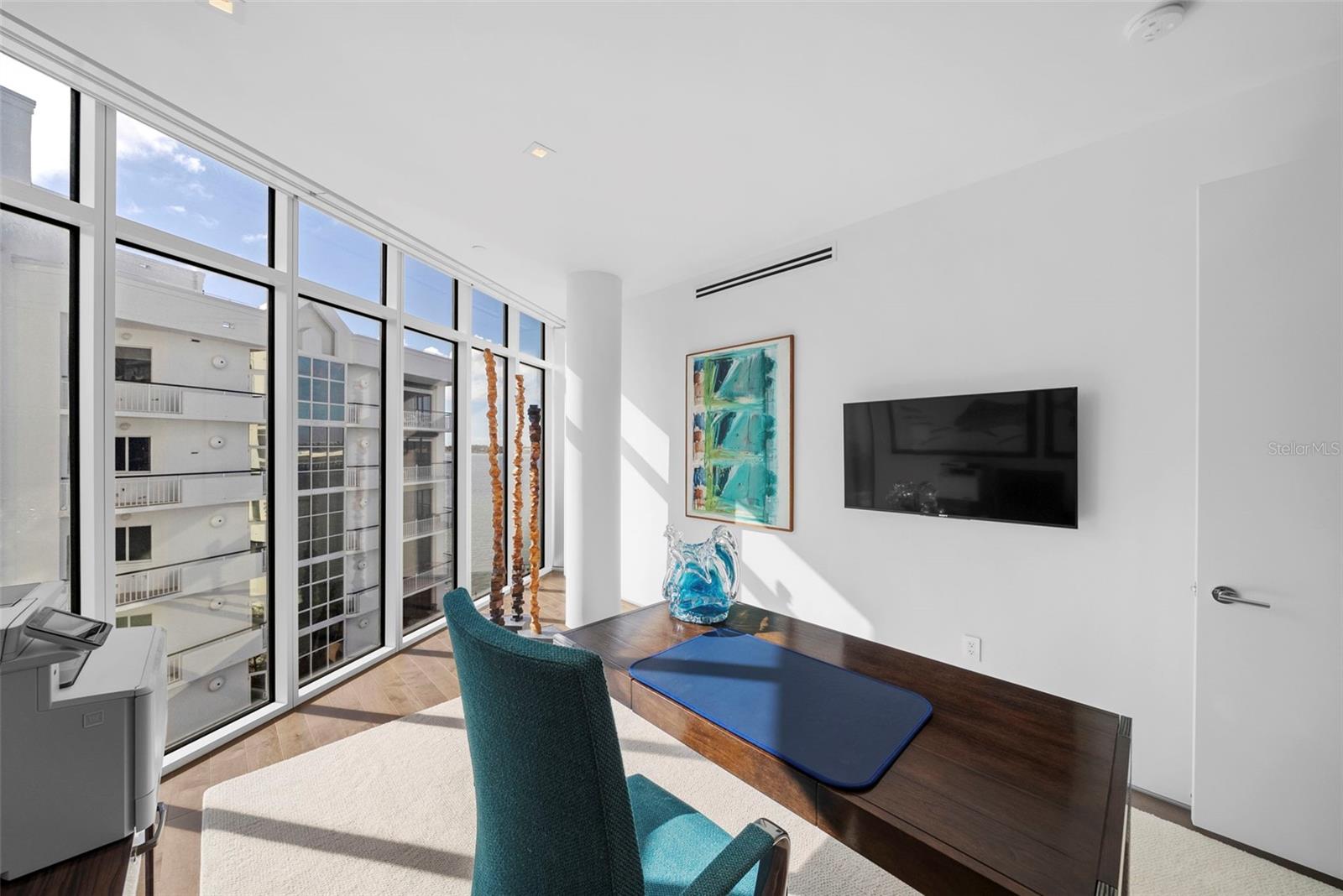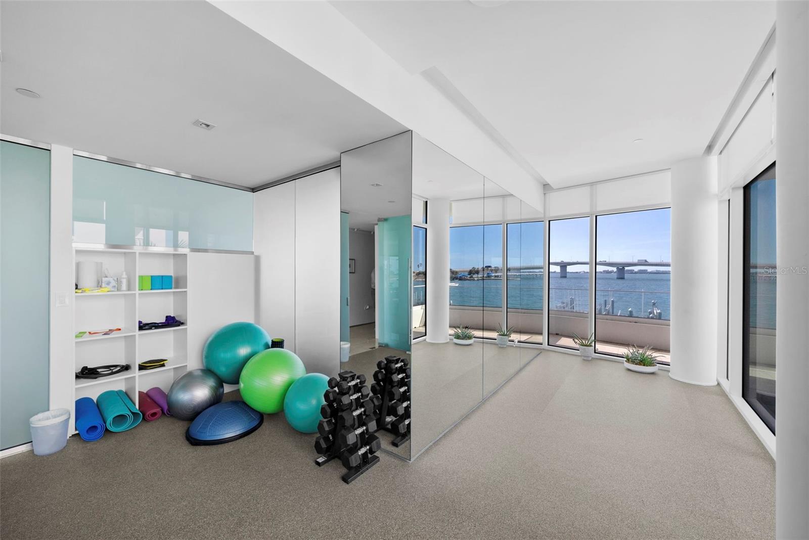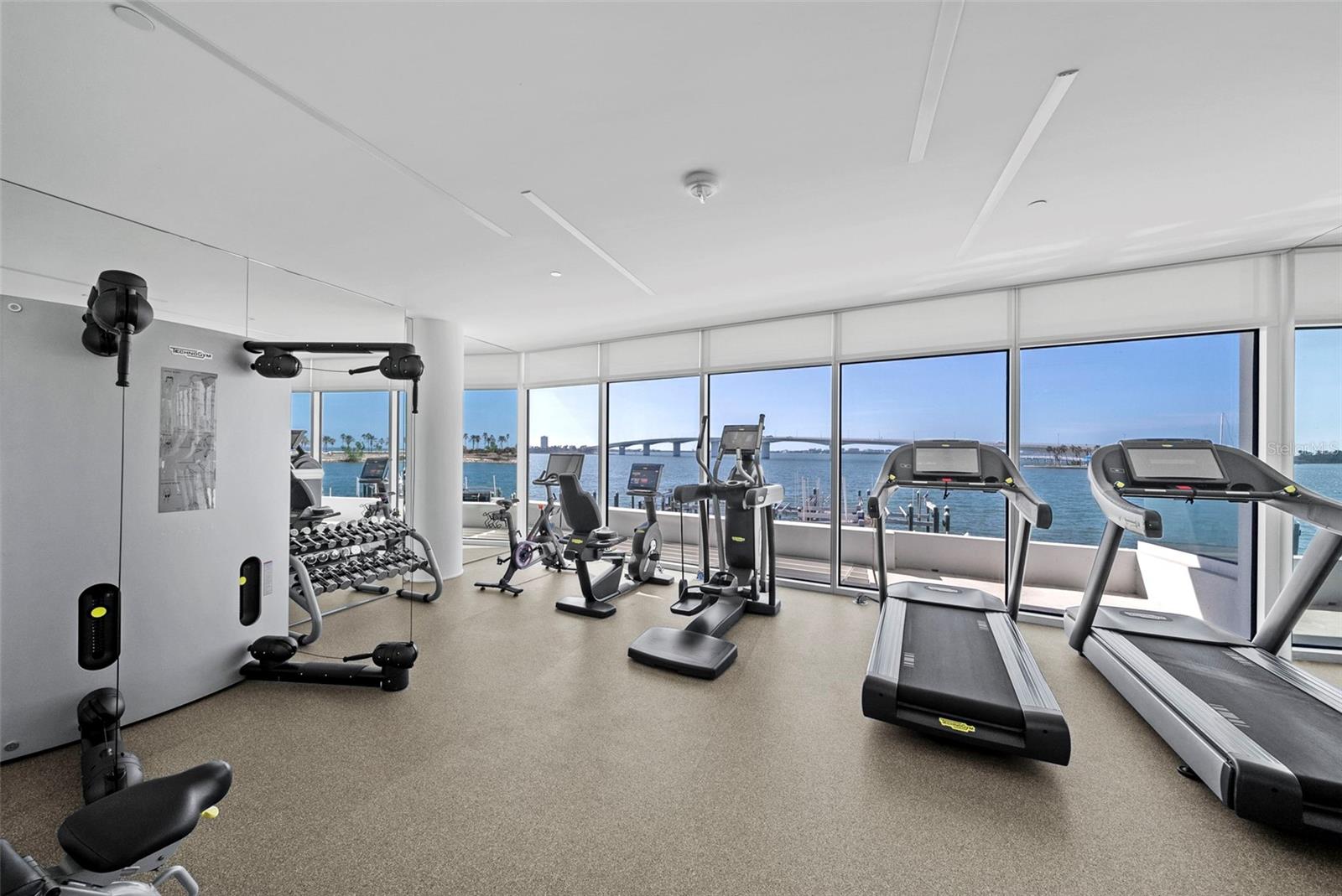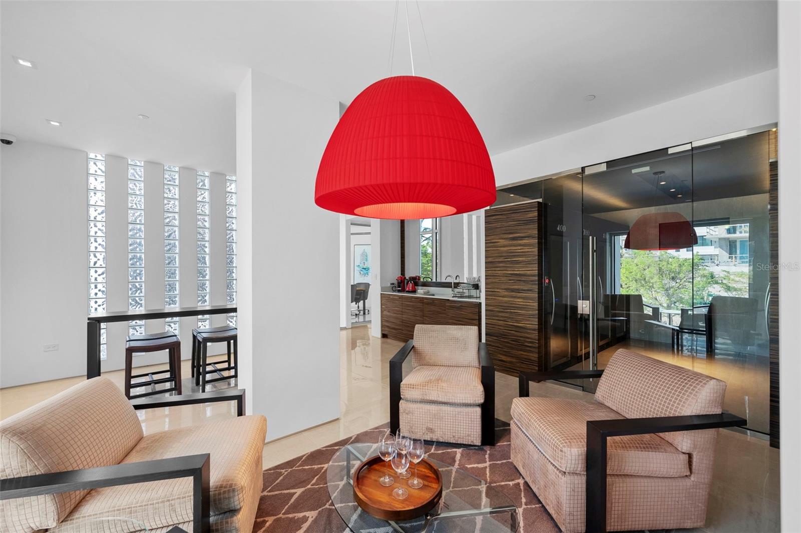 Welcome to AQUA, a pinnacle of refined luxury and architectural brilliance on Golden Gate Point. Designed by heralded modernist architect, Guy Peterson, this exclusive nine-story boutique building is home to only eight exquisite, full-floor residences, each designed for unparalleled privacy and sophistication. This 6th floor residence offers sweeping, unobstructed 180-degree views of Sarasota Bay and beyond, complete with a private boat dock. The location is enviable as it's just steps from the vibrant energy of downtown Sarasota. With over 4,100 square feet under air, this light-filled residence boasts 10-foot floor-to-ceiling walls of glass where the owners have curated some of the finest interiors in our marketplace. Hundreds of thousands of dollars were spent on elevating each aspect of this spectacular residence above and beyond the original finishes. The plan flows beautifully after entering the formal foyer from your private elevator turning the corner to experience the breathtaking views from the stunning living room. The adjacent wet bar area is positioned perfectly for entertaining guests. The gourmet kitchen features a Wolf cooktop and ovens, 2 Miele dishwashers and a Sub-Zero refrigerator. Cuisnes Laurier cabinetry and an expansive island topped with quartzite Cielo countertop provides casual in-kitchen dining. The adjacent formal dining room is a stunning space with 2 walls of glass offering views all around. The spacious water-side primary suite serves as a true sanctuary, offering a custom walk-in closet with individual sections fronted by Cuisimax poly-gloss doors and packing stations with extra storage. The spa-like primary bath features a dual vanity with blue crystal marble countertops and undermount sinks, a glass walk-in shower with full tile surround, a soaking tub and private water closet. The two guest suites are situated for complete privacy with walk-in closets and en-suite baths with the fourth bedroom currently serving as an office. With practical conveniences including extra storage flanking the service elevator entry, a Lutron light system, two sets of electronic blinds: both solar and privacy throughout. AQUA's state-of-the-art amenities create an environment that feels both exclusive and resort-like. Residents enjoy highly personalized concierge services, a private elevator, an enclosed two-car garage with dehumidifier and an EV charging station, a waterfront heated pool and spa, a fitness studio, temperature-controlled wine storage/wine tasting room and a rooftop observation area with stunning panoramic views. The building also includes architecturally landscaped grounds, sauna and secure spaces for meetings and entertaining. AQUA is truly an intimate and exclusive sanctuary reflecting a heritage of Sarasota's architectural elegance and embodies the pinnacle of modern coastal living. Discover AQUA, where refined elegance meets Sarasota's vibrant downtown and idyllic beaches.