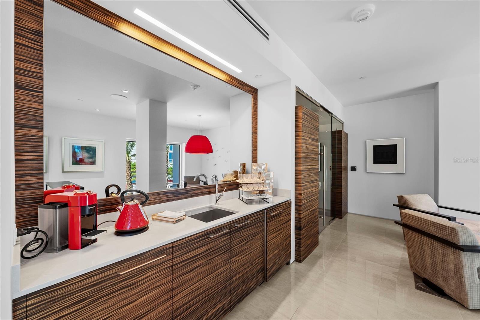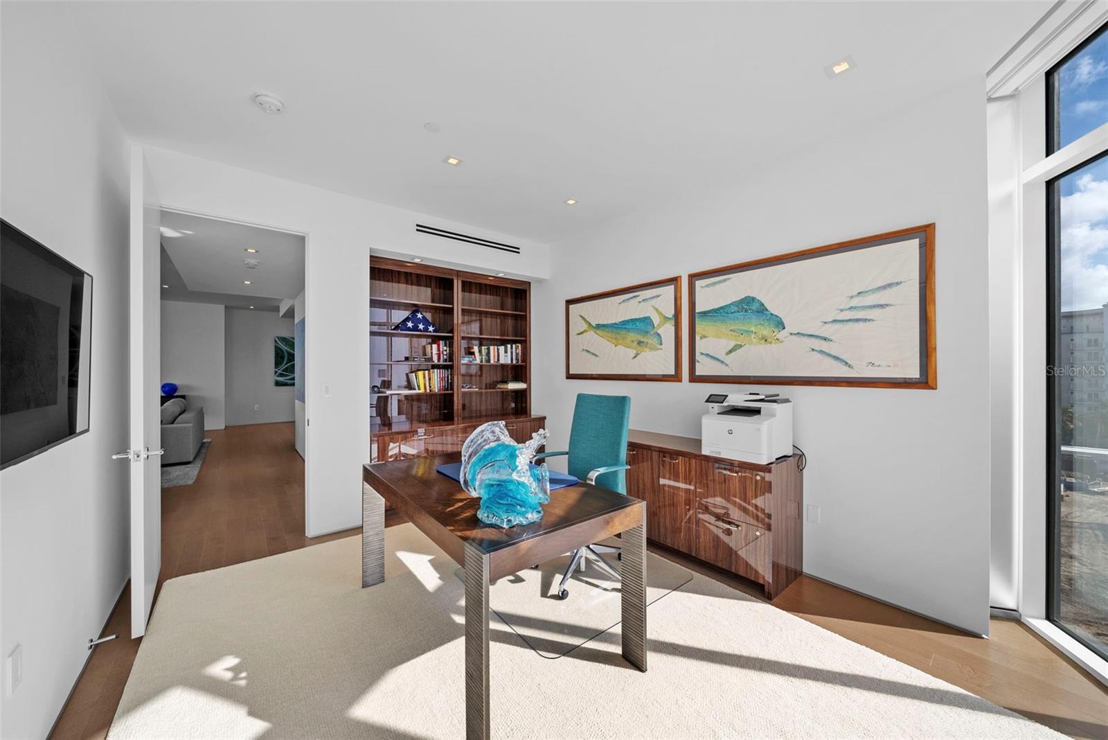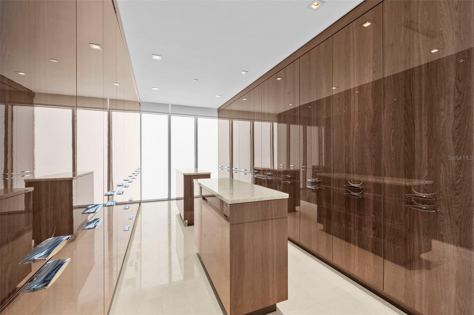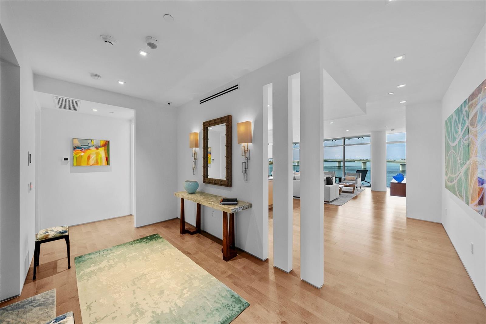 Welcome to AQUA, a pinnacle of refined luxury and architectural brilliance on Golden Gate Point. Designed by heralded modernist architect, Guy Peterson, this exclusive nine-story boutique building is home to only eight exquisite, full-floor residences, each designed for unparalleled privacy and sophistication. This 6th floor residence offers sweeping, unobstructed 180-degree views of Sarasota Bay and beyond, complete with a private boat dock. The location is enviable as it's just steps from the vibrant energy of downtown Sarasota. With over 4,100 square feet under air, this light-filled residence boasts 10-foot floor-to-ceiling walls of glass where the owners have curated some of the finest interiors in our marketplace. Hundreds of thousands of dollars were spent on elevating each aspect of this spectacular residence above and beyond the original finishes. The plan flows beautifully after entering the formal foyer from your private elevator turning the corner to experience the breathtaking views from the stunning living room. The adjacent wet bar area is positioned perfectly for entertaining guests. The gourmet kitchen features a Wolf cooktop and ovens, 2 Miele dishwashers and a Sub-Zero refrigerator. Cuisnes Laurier cabinetry and an expansive island topped with quartzite Cielo countertop provides casual in-kitchen dining. The adjacent formal dining room is a stunning space with 2 walls of glass offering views all around. The spacious water-side primary suite serves as a true sanctuary, offering a custom walk-in closet with individual sections fronted by Cuisimax poly-gloss doors and packing stations with extra storage. The spa-like primary bath features a dual vanity with blue crystal marble countertops and undermount sinks, a glass walk-in shower with full tile surround, a soaking tub and private water closet. The two guest suites are situated for complete privacy with walk-in closets and en-suite baths with the fourth bedroom currently serving as an office. With practical conveniences including extra storage flanking the service elevator entry, a Lutron light system, two sets of electronic blinds: both solar and privacy throughout. AQUA's state-of-the-art amenities create an environment that feels both exclusive and resort-like. Residents enjoy highly personalized concierge services, a private elevator, an enclosed two-car garage with dehumidifier and an EV charging station, a waterfront heated pool and spa, a fitness studio, temperature-controlled wine storage/wine tasting room and a rooftop observation area with stunning panoramic views. The building also includes architecturally landscaped grounds, sauna and secure spaces for meetings and entertaining. AQUA is truly an intimate and exclusive sanctuary reflecting a heritage of Sarasota's architectural elegance and embodies the pinnacle of modern coastal living. Discover AQUA, where refined elegance meets Sarasota's vibrant downtown and idyllic beaches.