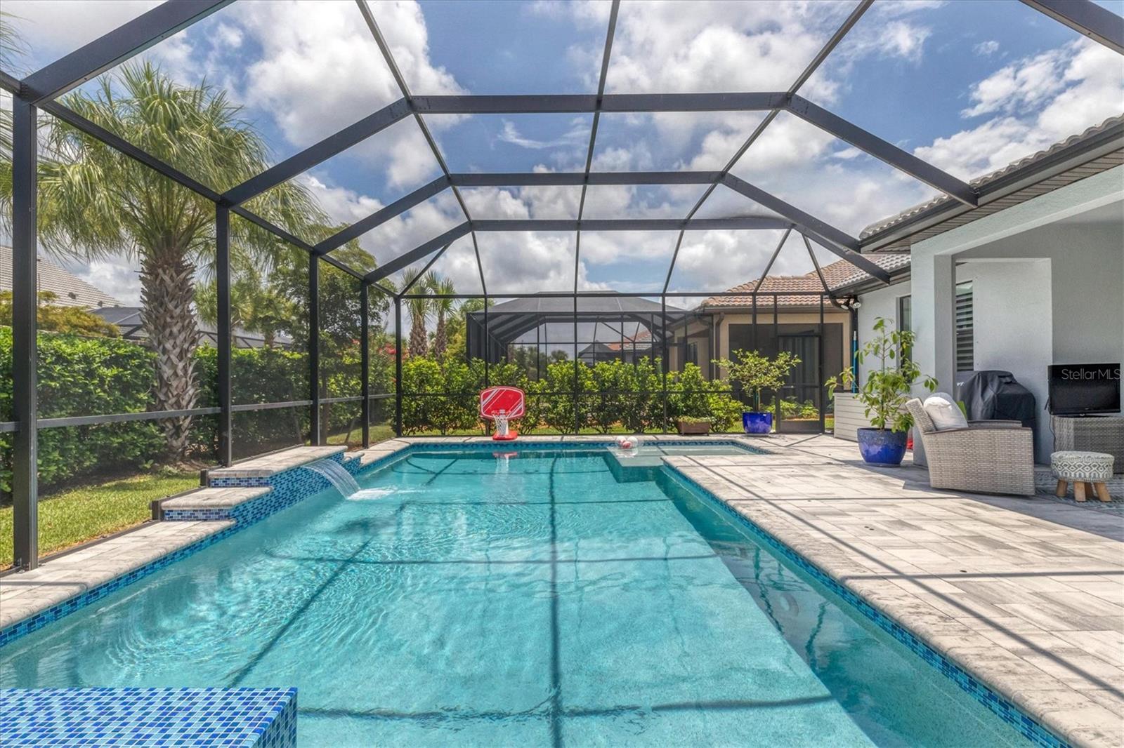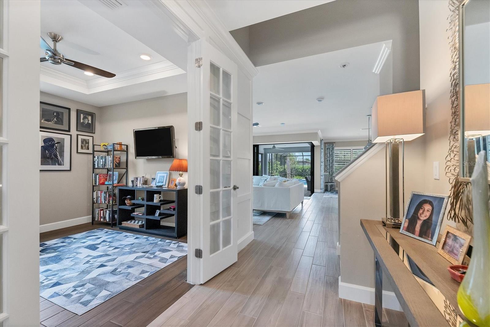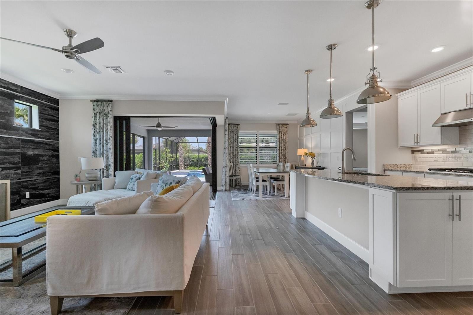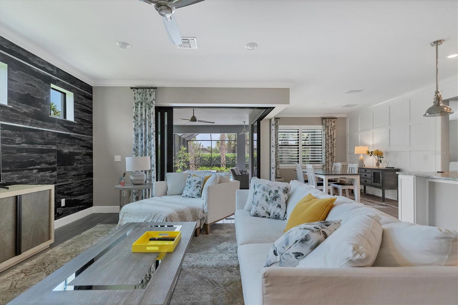 This stunning 4-bedroom 3-bath plus den Summerwood model has over 2943 square feet of spacious open living. Foyer entry leading to great room with elevated ceilings, crown moldings, custom wall finishes including a dramatic tiled accent wall. Chefs' kitchen with white cabinets, tiled backsplash and quartz counters, large island with decorative pendant lighting. Stainless appliances, 5 burner gas stove top, and large pantry. Separate dining with great space for memorable occasions. Elegant primary suite with white cabinets, quartz counters and double sinks, large walk-in shower, walk in closet w custom built ins. Two additional bedrooms ensuite. The large second-story loft is perfect for a home theater and game room including the 4th bedroom with a full bath. Zero corner sliders lead you to the paved extended covered lanai overlooking the amazing, heated saltwater pool and spa. A wonderful place to gather with friends and family. Home has been professionally furnished and decorated. Furniture is available for purchase separately. Hammock Preserve is a gated community offering full amenities including, grand clubhouse w community room, Resort style pool & spa, 2 bocce courts, 2 pickleball courts, 2 tennis courts, fitness center, catering kitchen & dog park. This is an ideal location in Palmer Ranch, minutes to the beaches, shopping, dining.