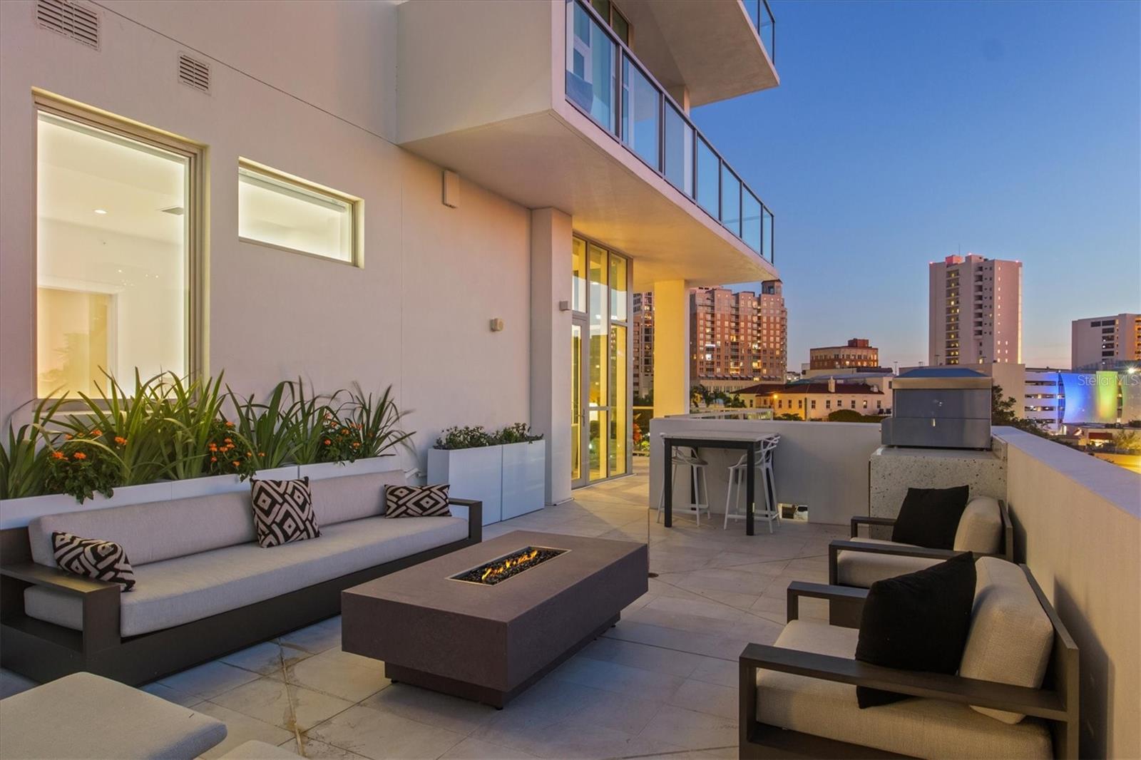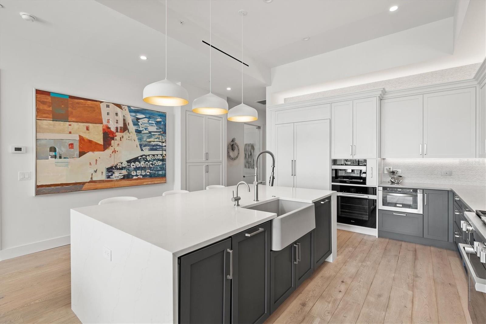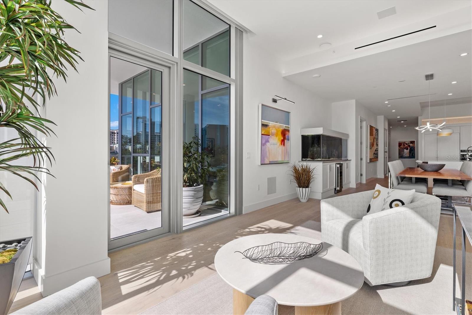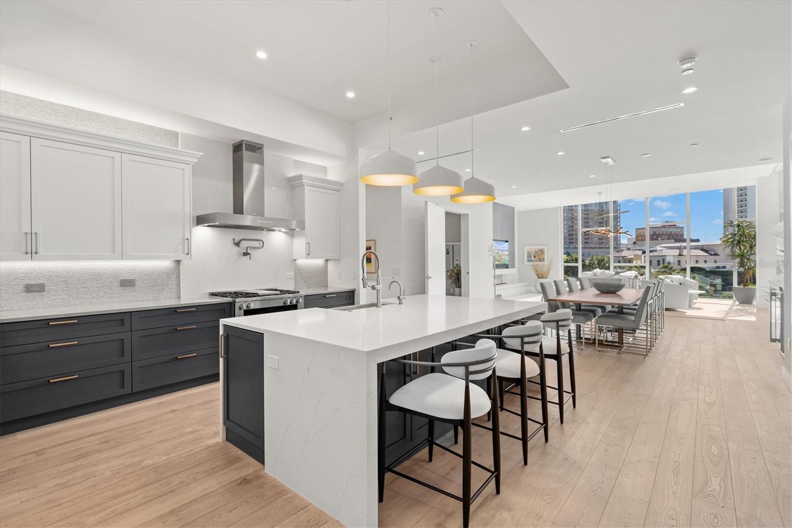 Welcome to 3W at The Collection, where you will experience the epitome of modern luxury in this one-of-a-kind, boutique condo located in the heart of downtown Sarasota just steps away from world-class dining, shopping, and cultural attractions. Every detail of this custom residence has been meticulously curated with high-end designer selections and finishes, offering an unparalleled living experience. As you enter the unit by way of private elevator access, you’ll be delighted by the beautifully styled entrance leading into the home. Immediately you will notice an abundance of natural light shining through the 12-ft-floor-to-ceiling windows and doors. The sleek, open-concept floor plan showcases premium finishes throughout the units 3,300+ sq ft of interior living space and 1,000 sq ft of private patio space. No expense was spared for upgrades. The kitchen is a true masterpiece with custom soft-close wood cabinetry, quartz countertops with a waterfall edge island and stone backsplash, top-of-the-line Miele appliances including a built-in smart coffee system and ice maker, under and over cabinet lighting, and additional storage. Each bedroom is equipped with a custom closet system, a luxurious en-suite bath with marble flooring, flash tile and custom vanities and LED illuminated mirrors, and private balcony access. The office features built-in storage with stone countertops and a beautiful glass door. Stunning stone accents, vibrant wallpaper, European White Oak flooring and exquisite light fixtures throughout the residence perfectly blend sophistication and comfort, creating a masterpiece of contemporary design. Home automation, including interior automated shades by Wicked Smart Homes, allows for an easy lock and leave process. The exterior living space is just as remarkable and perfect for entertaining with a pizza oven, refrigerator, sink, a firepit and multiple seating areas. Situated in the heart of The Art District in downtown Sarasota with only 12 units in the building, residents of The Collection enjoy a very private and exclusive living experience. The state-of-the-art building has a 24-hour camera and building access system in place with key fob, entry code, remote, card, and phone entry. The ground floor ensures residents have everything they need right at their fingertips with a concierge, mail room, covered private parking, and a temperature-controlled storage area. 3W comes with two parking spaces. The second floor is where residents will enjoy the impressive onsite amenities which include a pool and spa, daybeds, a yoga and fitness center, sauna, entertainment center with a fireplace, tv, and wet bar, and conference style meeting room. This rare gem is the ultimate expression of style and convenience, being sold furnished with some exclusions, and located within walking distance to Bayfront Park, Sarasota Main Street, Starbucks, Whole Foods, and more!