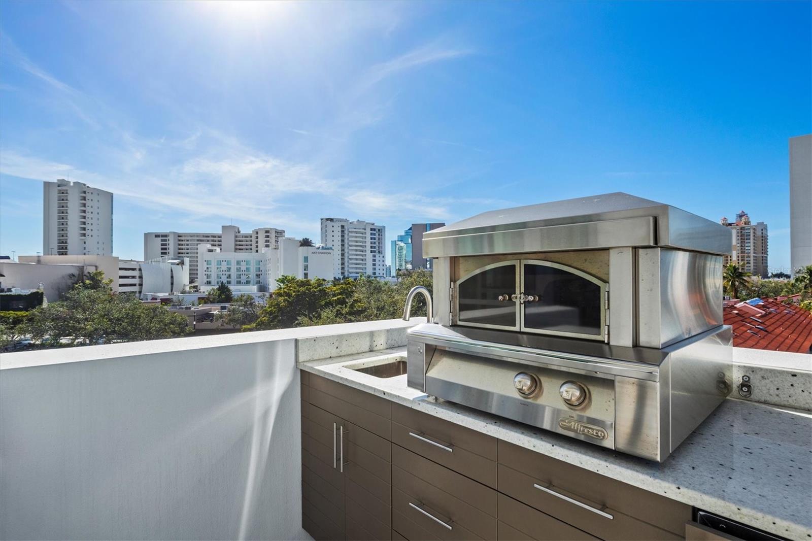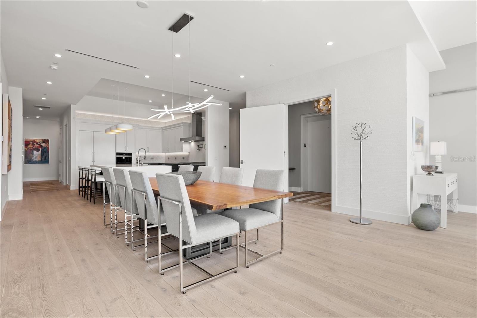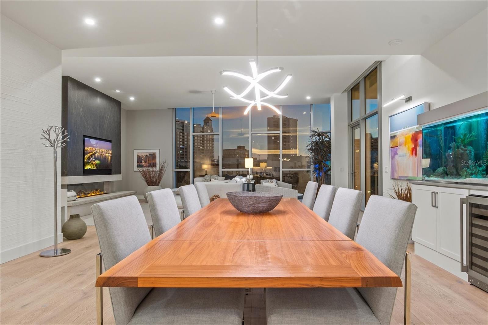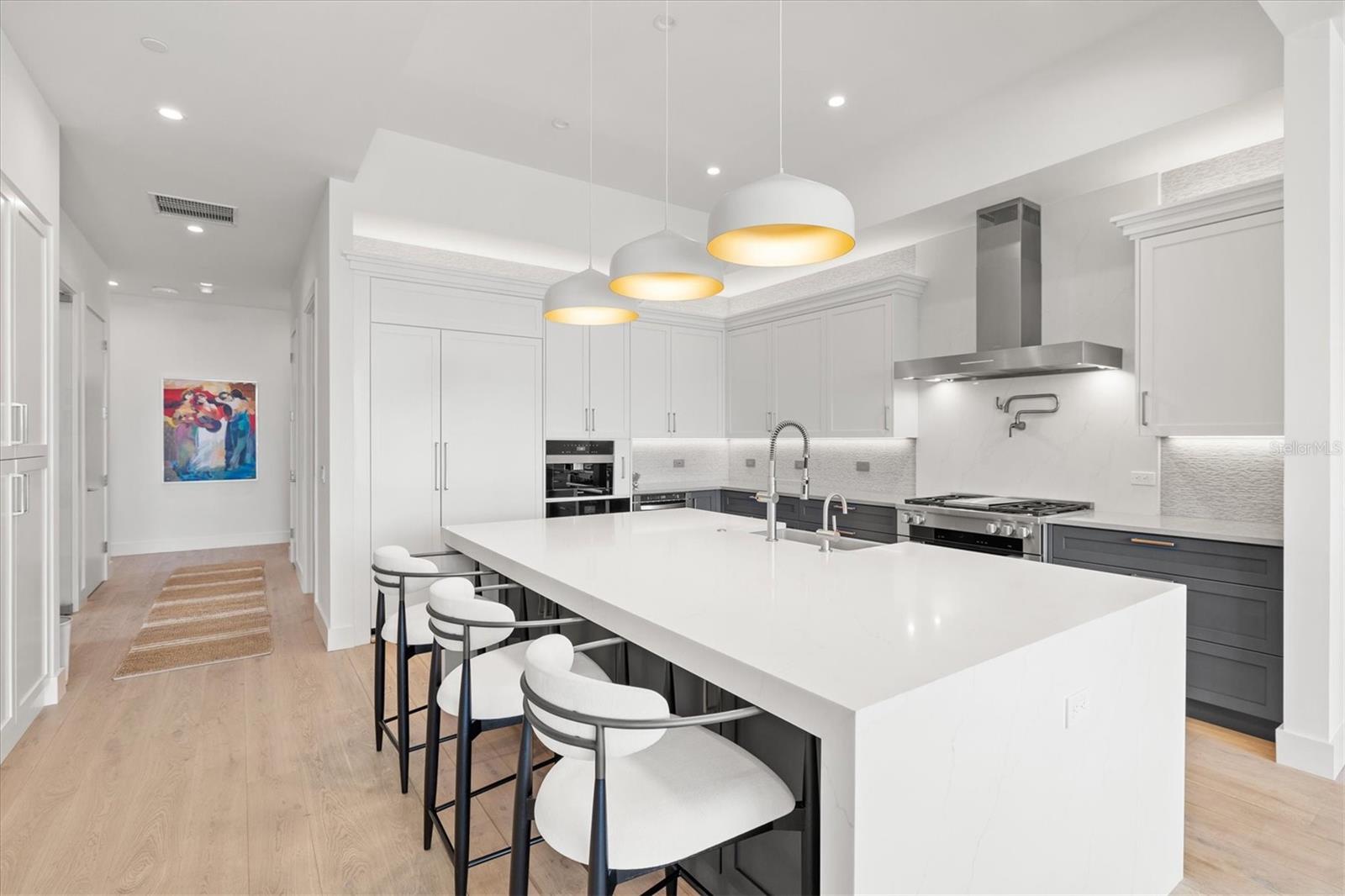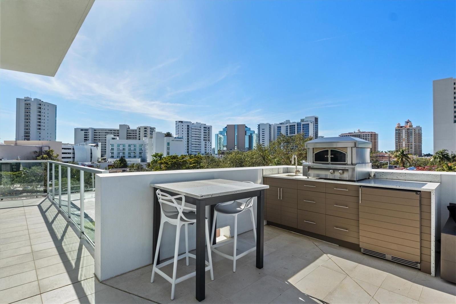 Welcome to 3W at The Collection, where you will experience the epitome of modern luxury in this one-of-a-kind, boutique condo located in the heart of downtown Sarasota just steps away from world-class dining, shopping, and cultural attractions. Every detail of this custom residence has been meticulously curated with high-end designer selections and finishes, offering an unparalleled living experience. As you enter the unit by way of private elevator access, you’ll be delighted by the beautifully styled entrance leading into the home. Immediately you will notice an abundance of natural light shining through the 12-ft-floor-to-ceiling windows and doors. The sleek, open-concept floor plan showcases premium finishes throughout the units 3,300+ sq ft of interior living space and 1,000 sq ft of private patio space. No expense was spared for upgrades. The kitchen is a true masterpiece with custom soft-close wood cabinetry, quartz countertops with a waterfall edge island and stone backsplash, top-of-the-line Miele appliances including a built-in smart coffee system and ice maker, under and over cabinet lighting, and additional storage. Each bedroom is equipped with a custom closet system, a luxurious en-suite bath with marble flooring, flash tile and custom vanities and LED illuminated mirrors, and private balcony access. The office features built-in storage with stone countertops and a beautiful glass door. Stunning stone accents, vibrant wallpaper, European White Oak flooring and exquisite light fixtures throughout the residence perfectly blend sophistication and comfort, creating a masterpiece of contemporary design. Home automation, including interior automated shades by Wicked Smart Homes, allows for an easy lock and leave process. The exterior living space is just as remarkable and perfect for entertaining with a pizza oven, refrigerator, sink, a firepit and multiple seating areas. Situated in the heart of The Art District in downtown Sarasota with only 12 units in the building, residents of The Collection enjoy a very private and exclusive living experience. The state-of-the-art building has a 24-hour camera and building access system in place with key fob, entry code, remote, card, and phone entry. The ground floor ensures residents have everything they need right at their fingertips with a concierge, mail room, covered private parking, and a temperature-controlled storage area. 3W comes with two parking spaces. The second floor is where residents will enjoy the impressive onsite amenities which include a pool and spa, daybeds, a yoga and fitness center, sauna, entertainment center with a fireplace, tv, and wet bar, and conference style meeting room. This rare gem is the ultimate expression of style and convenience, being sold furnished with some exclusions, and located within walking distance to Bayfront Park, Sarasota Main Street, Starbucks, Whole Foods, and more!
