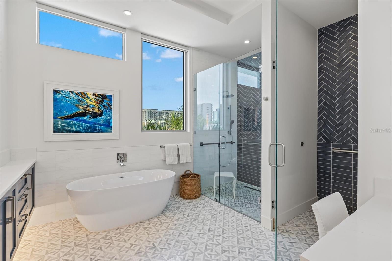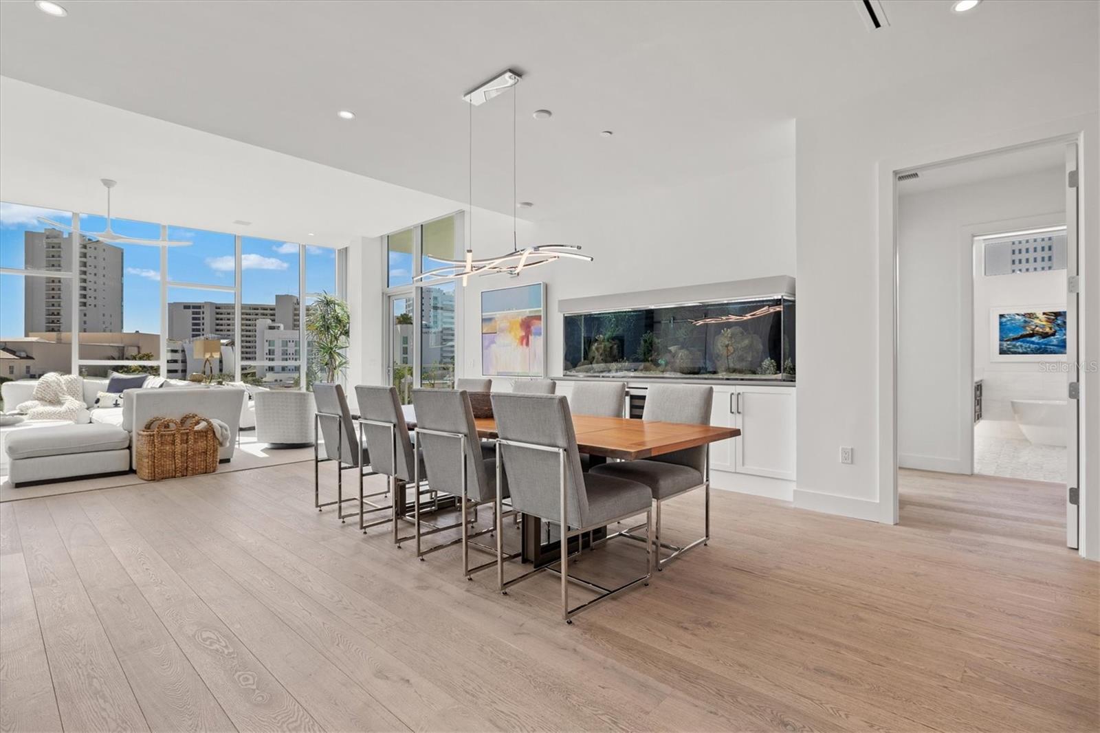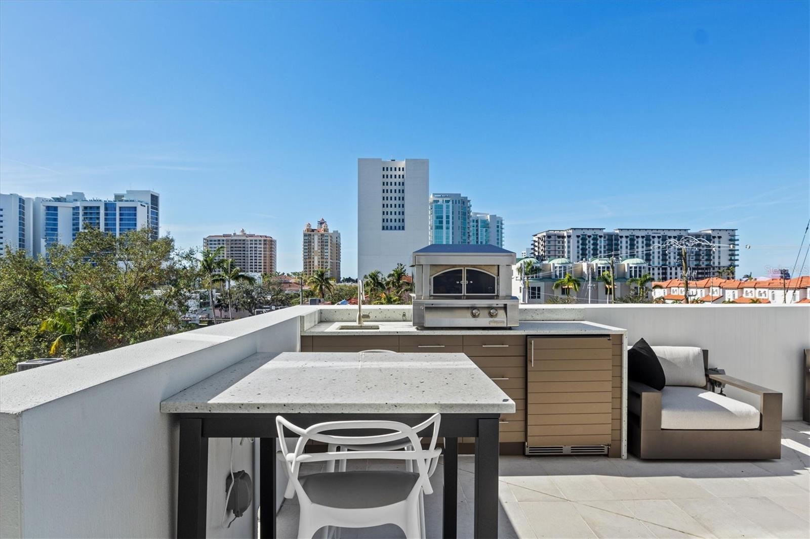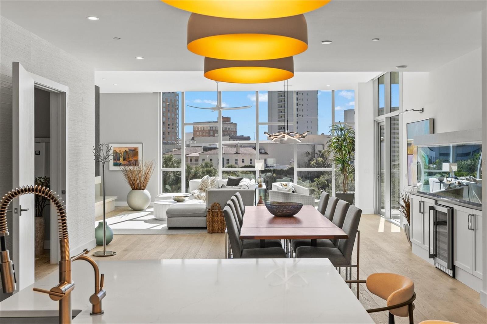 Welcome to 3W at The Collection, where you will experience the epitome of modern luxury in this one-of-a-kind, boutique condo located in the heart of downtown Sarasota just steps away from world-class dining, shopping, and cultural attractions. Every detail of this custom residence has been meticulously curated with high-end designer selections and finishes, offering an unparalleled living experience. As you enter the unit by way of private elevator access, you’ll be delighted by the beautifully styled entrance leading into the home. Immediately you will notice an abundance of natural light shining through the 12-ft-floor-to-ceiling windows and doors. The sleek, open-concept floor plan showcases premium finishes throughout the units 3,300+ sq ft of interior living space and 1,000 sq ft of private patio space. No expense was spared for upgrades. The kitchen is a true masterpiece with custom soft-close wood cabinetry, quartz countertops with a waterfall edge island and stone backsplash, top-of-the-line Miele appliances including a built-in smart coffee system and ice maker, under and over cabinet lighting, and additional storage. Each bedroom is equipped with a custom closet system, a luxurious en-suite bath with marble flooring, flash tile and custom vanities and LED illuminated mirrors, and private balcony access. The office features built-in storage with stone countertops and a beautiful glass door. Stunning stone accents, vibrant wallpaper, European White Oak flooring and exquisite light fixtures throughout the residence perfectly blend sophistication and comfort, creating a masterpiece of contemporary design. Home automation, including interior automated shades by Wicked Smart Homes, allows for an easy lock and leave process. The exterior living space is just as remarkable and perfect for entertaining with a pizza oven, refrigerator, sink, a firepit and multiple seating areas. Situated in the heart of The Art District in downtown Sarasota with only 12 units in the building, residents of The Collection enjoy a very private and exclusive living experience. The state-of-the-art building has a 24-hour camera and building access system in place with key fob, entry code, remote, card, and phone entry. The ground floor ensures residents have everything they need right at their fingertips with a concierge, mail room, covered private parking, and a temperature-controlled storage area. 3W comes with two parking spaces. The second floor is where residents will enjoy the impressive onsite amenities which include a pool and spa, daybeds, a yoga and fitness center, sauna, entertainment center with a fireplace, tv, and wet bar, and conference style meeting room. This rare gem is the ultimate expression of style and convenience, being sold furnished with some exclusions, and located within walking distance to Bayfront Park, Sarasota Main Street, Starbucks, Whole Foods, and more!