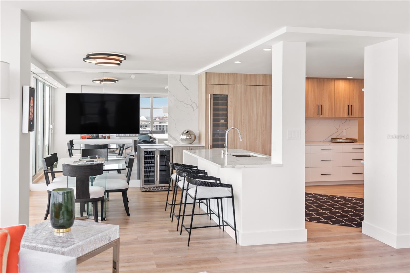 Step into the most luxurious waterfront condo that awaits you in this stunning two bedroom, two-bath condo in the heart of Sarasota! Enjoy breathtaking views of the Bay of Sarasota and The Gulf of America from one of two of your private balconies. This stunning 100% completely renovated 5 stack VanGogh located on the 17th floor will leave you breathless. You will not believe your eyes when you see the attention to detail built into this stunning condo. Floor to ceiling mirrors in entryway accentuate the grand view as you enter the condo. Seller did a complete demolition of all interior drywall, ceiling tiles, all interior AC ductwork, plumbing, flooring and electrical. Installed all new plumbing, electrical, AC ductwork and / outdoor lighting. All new indoor lighting design and hardware throughout. The gorgeous all new wood flooring is in main areas and bedrooms, with all new tile in the bathrooms and patios. Raised the ceilings for maximum grand feeling and the stunning views. Both bathrooms completely remodeled with top of the line marble, quartz and waterworks hardware. Extended the width of the hall to open up laundry area with a stackable washer and dryer as well as a tankless water heater. Installed all new hurricane doors at both patios. Custom doors and hardware throughout. Brand new cabinetry along with custom closet cabinetry in primary suite. Installation of a completely new and hard wired AV system for Sound, TV, lighting & shades for the entire house. Hard wired the WiFi Sonos system through out the entire condo. And wait until you see this extraordinary kitchen, it is a culinary dream… brand new top of the line Fulgor Italian appliances! Waterfall quartz island countertop and quartz backsplash. Full size counter depth refrigerator, wine cellar, and 2 freezers. Microwave, convection combo, built in coffee maker, induction range top, oven & dishwasher. Smart home features include Ring and Nest. When you are ready to retire for the evening you simply use the remote powered shade system by Creston for all windows. Entry into 888 Boulevard of the Arts has a 24 hour guarded gate station. Just steps outside the condo you will find access to kayaks and/or boats. You can also enjoy the resort style heated pool along with pickleball, tennis courts and fitness room. Assigned underground parking (this unit has the best spot in the building) as well as 2 EV charging stations up on the top deck. You are close to all the key spots that beautiful Sarasota has to offer: Lido Beach, Siesta Key, Anna Maria Island, Long Boat Key and St Armands Circle. Sarasota offers exquisite restaurants, shopping, theaters and many cultural activities including Asolo Theater, Van Wezel Performing Arts Center and John Ringling Museum. You don’t want to miss this extraordinary condo with the most precise attention to detail at every turn. This unit is truly perfection.