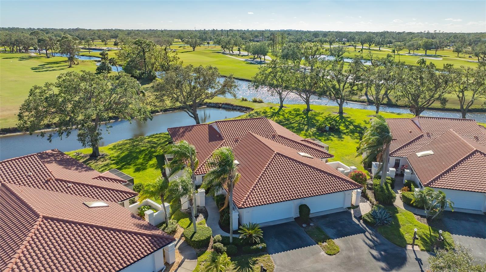 Highly sought-after Golf Pointe Circle Villa in the Palm Aire Country Club. This 3 Bedroom and 2 Bath Villa is being Sold Turnkey Furnished, minus some items (see inventory sheets). Beachy Coastal Decor gives you the feeling of living on the Beach, but even better, you're right on the Palm Aire Golf Course. With over 1,800 sq ft of living space this split floor plan has a Living Room/Dining Room combination, great for entertaining or just a comfortable and enjoyable relaxed environment. Or you might be spending all your time in the air-conditioned Florida Room, where Hurricane Impact Resistant Sliding Glass Doors were added earlier this year giving you sweeping landscapes of the club's practice range, golf course and water views. Starting with your first cup of coffee in the morning to your last evening cocktail enjoying the stunning sunsets. Kitchen has a nice eat-in area with sliding glass doors out to your private screened -in porch, perfect for your BBQ grilling. Primary Bedroom has sliding glass doors out to the Florida Room. The Primary Bath has a large walk-in closet with 2 entrances. Dual sinks, garden tub and separate shower stall. Second and Third Bedrooms are located towards the front of the home and share the second Bathroom, which is next to the closet laundry. All three Bedrooms have newer carpeting. The 2-car garage has plenty of room for your car and your golf cart with storage above if needed. Golf Pointe Community has a clubhouse and 2 heated pools for your enjoyment. Palm Aire Country Club has 2 Championship Golf Courses, Clubhouse, Fitness Center, Olympic Sized Heated Swimming Pool,12 Tennis and 8 Pickleball Courts. Golf, Sport and Fitness and Social/Dining memberships are offered but membership is not mandatory. Convenient location close to the UTC Mall, Benderson Rowing Venue, Sarasota Airport and the local beaches.