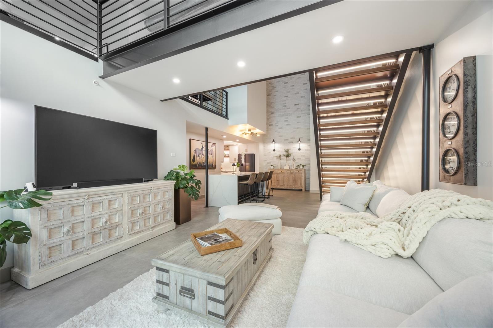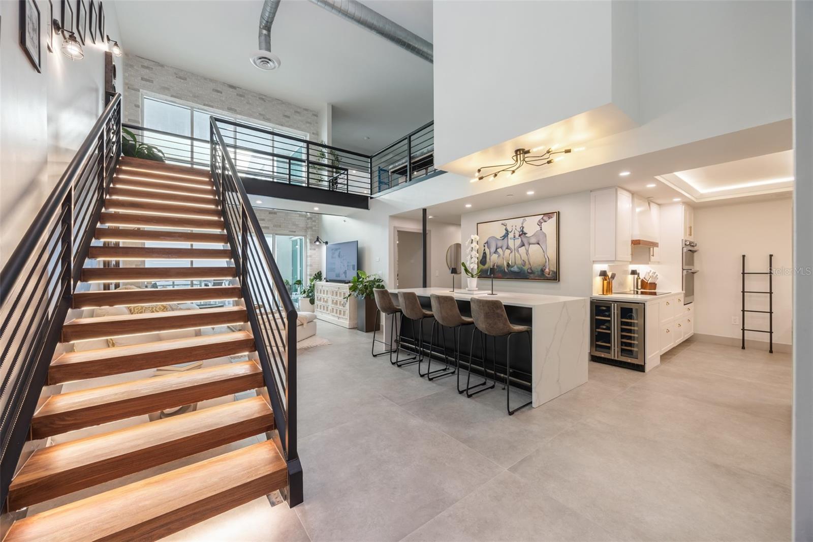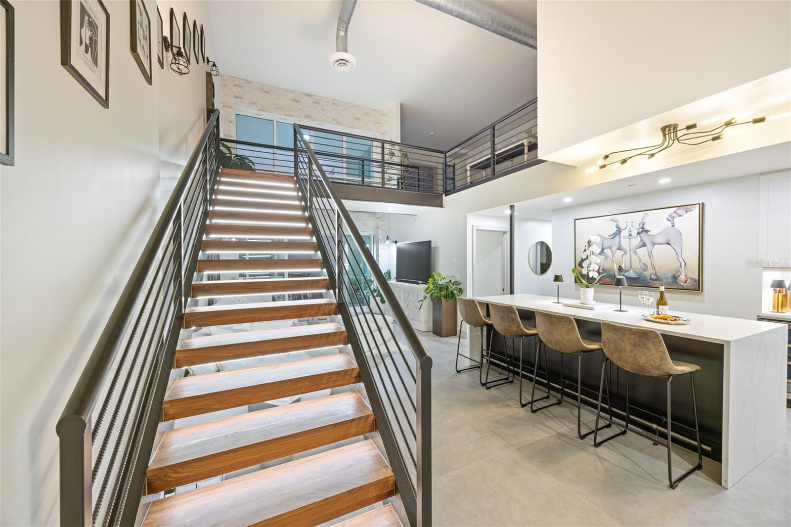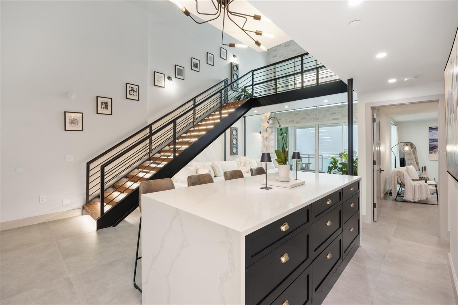 Exquisite Sarasota Penthouse with Prime Location and Unmatched Privacy! This fully renovated 3,117 sq. ft. penthouse offers luxurious living with breathtaking views of downtown Sarasota and the Gulf. Featuring soaring two-story ceilings, a dramatic walnut staircase, and custom Italian tile flooring, this home exudes sophistication at every turn. Expansive windows flood the space with natural light, creating an open, airy atmosphere throughout. Located just steps from Michelin-starred restaurants, the distinguished yacht club, and world-class cultural attractions, this home offers unparalleled convenience in one of Sarasota’s most coveted neighborhoods. The building is home to only 19 penthouse residences, ensuring peace, quiet, and maximum privacy. The chef-inspired kitchen boasts all new top-of-the-line appliances, including a double wall microwave-oven combo, induction cooktop, and a moveable, Calacatta Quartz waterfall island. The spa-like Primary suite features a hidden secret entry, a custom closet, and a luxurious bathroom designed for ultimate relaxation and privacy. Additional highlights include remote blackout shades, a backlit walnut staircase, and a private balcony perfect for entertaining. Two dedicated parking spaces, secure entry, and HOA fees covering; utilities, Concierge service, and with protected increases, adds convenience and peace of mind. With its exclusivity, prime location, and stunning design, this one-of-a-kind penthouse offers the ideal blend of luxury, lifestyle, and privacy. Experience the best of vibrant Sarasota—schedule a private tour today!