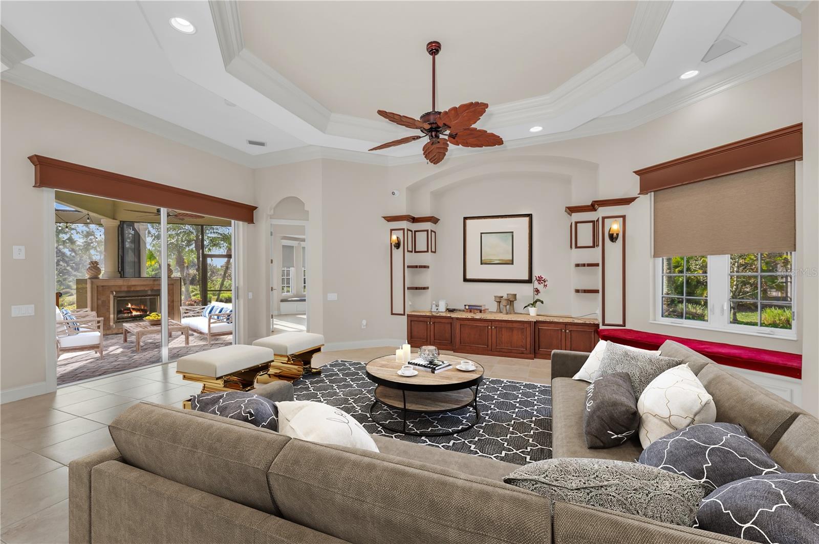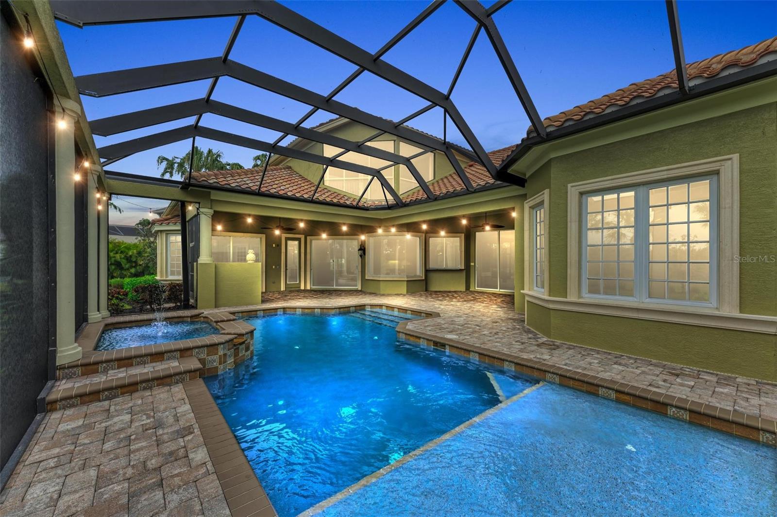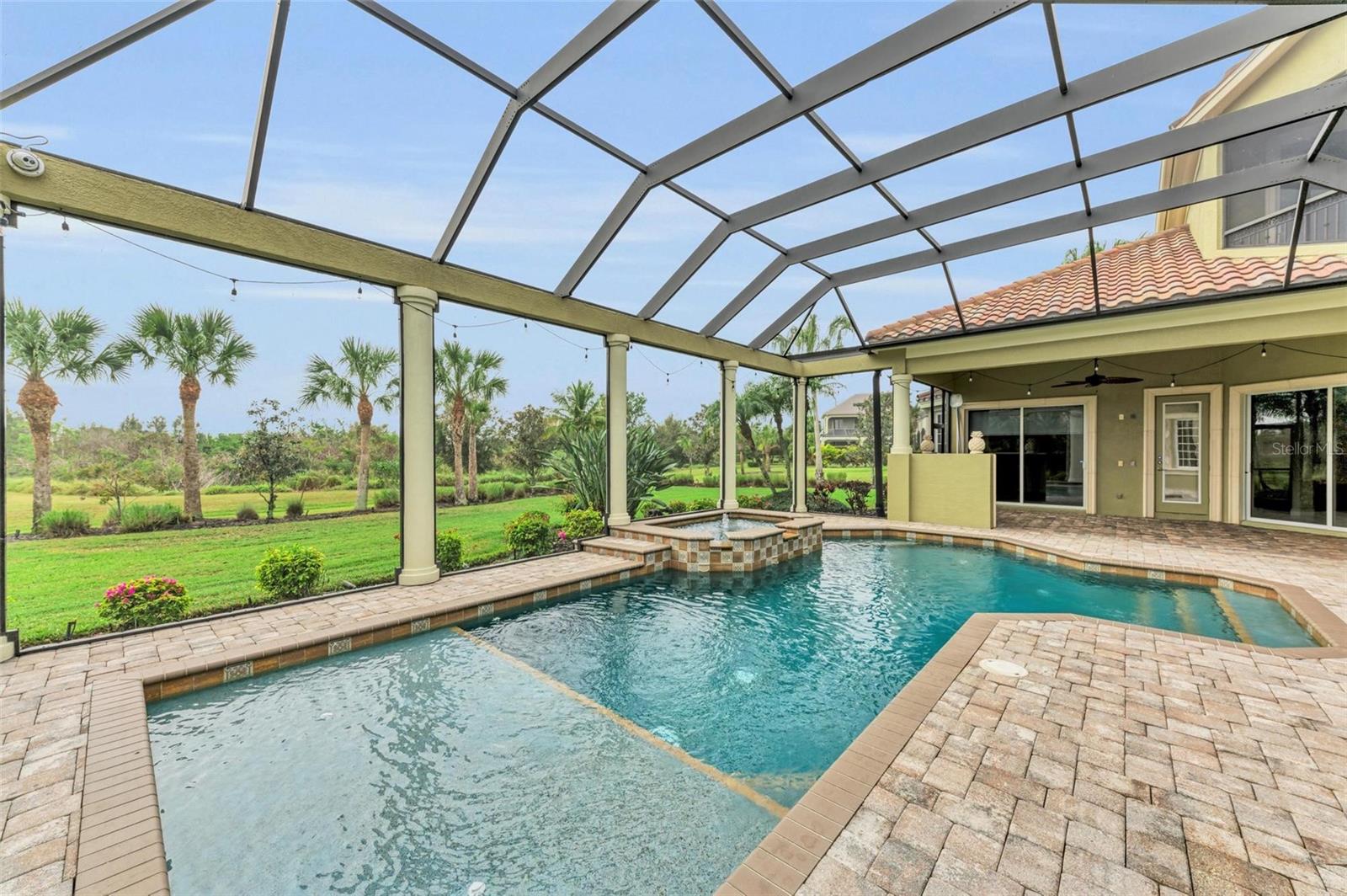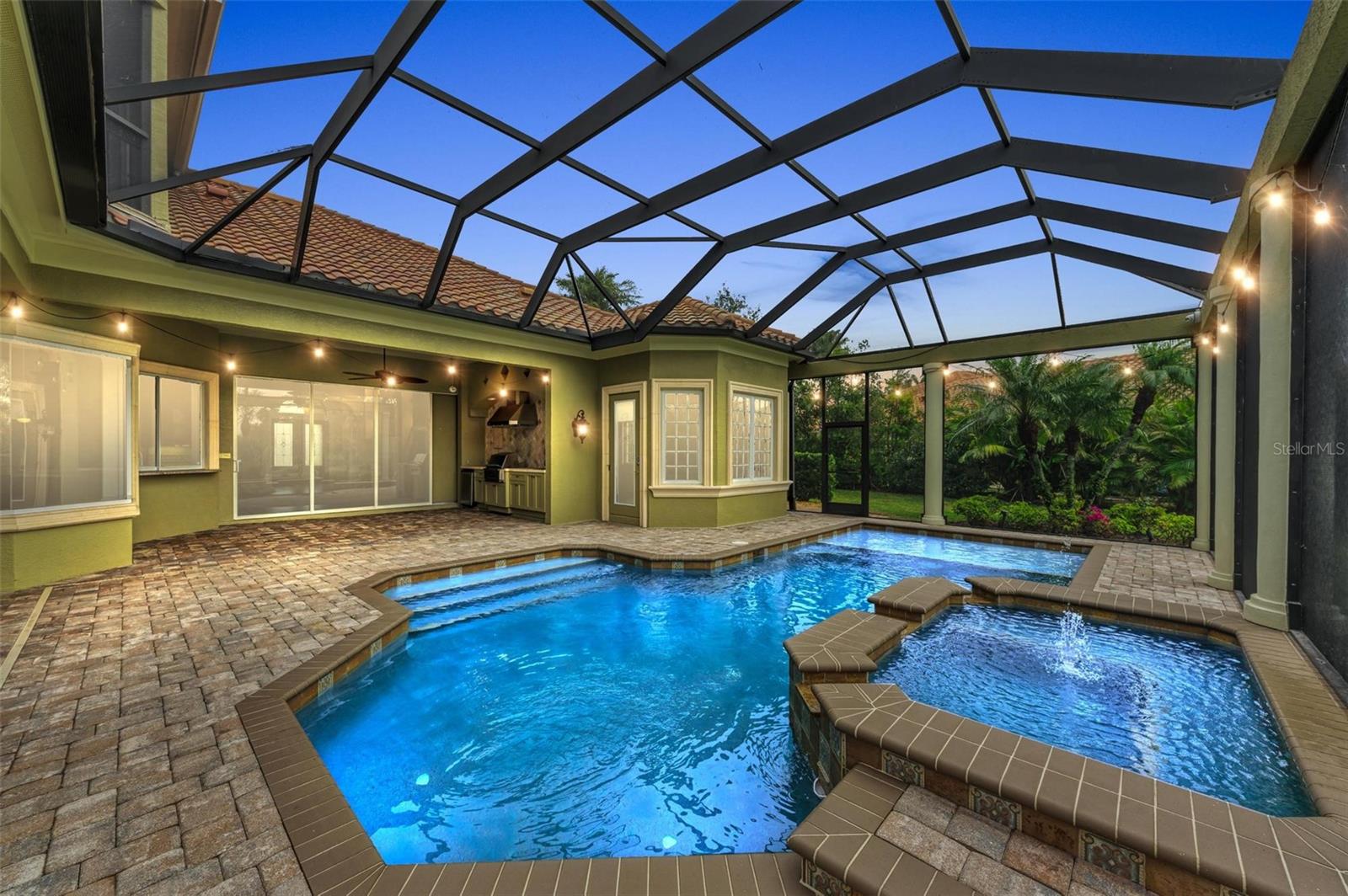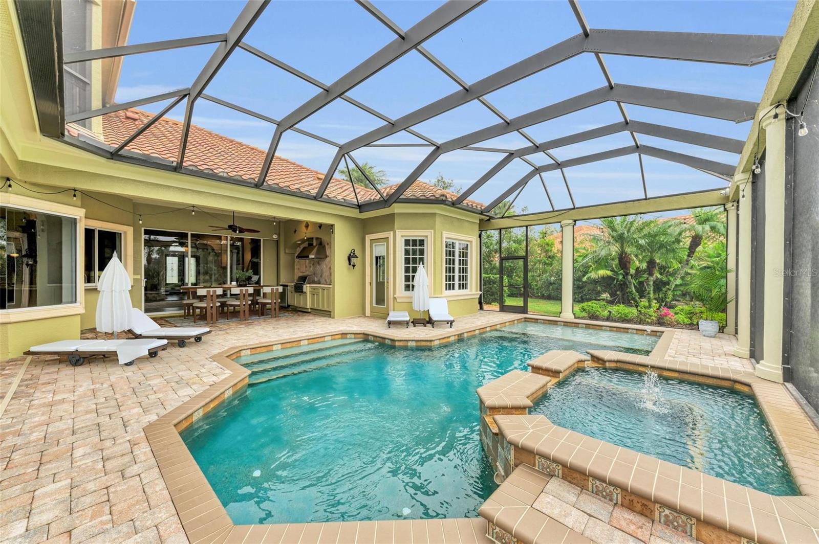 One or more photo(s) has been virtually staged. If you’re looking for a home that gives you room for everyone and everything, this estate home in The Founders Club is it. This custom-designed architectural masterpiece by renowned builder Todd Johnston is nestled on a coveted preserve lot within the exclusive, gated community of The Founders Club. This striking estate redefines Florida elegance with over 4,800 square feet of thoughtfully curated space. With 4 spacious bedrooms, 4.5 baths, a stately den, and a flexible floor plan, this home offers the perfect balance of grandeur and comfort. Step inside to soaring 12–14 ft. ceilings, intricate custom millwork, and expansive living areas that flow seamlessly for effortless entertaining and everyday living. The grand living room serves as the heart of the home, featuring a sculpted ceiling, a striking fireplace, and pocketing glass doors that open to a resort-style lanai—blending indoor and outdoor living in perfect harmony. Adjacent is the formal dining room and a private home office with French doors, ideal for work or quiet reflection. The chef’s kitchen is equipped with premium GE Monogram appliances, including a 48” industrial refrigerator (2023), granite countertops, True Blue solid wood cabinetry, and an oversized center island. A wet bar with a built-in refrigerator and desk nook enhances the home’s functionality and charm. Retreat to the tranquil first-floor primary suite, where bay windows overlook lush preserve views. Indulge in a spa-like bath with a whirlpool tub, walk-in shower, dual vanities, and two custom walk-in closets. A private atrium adds a serene, Tuscan-inspired escape. The main level also includes a generous Mother-in-Law suite with a private entrance, en-suite bath, walk-in closet, and space for a kitchenette—ideal for multigenerational living. A secondary master suite offers pool access and stunning preserve views, while the upstairs family room serves as a versatile retreat complete with a billiard table, wet bar, and balcony overlooking the pool and preserve. A spacious guest suite with full bath ensures comfort and privacy for visitors. Step outside to your private paradise: a screened lanai with impact-rated enclosures, a heated resort-style pool and spa, an outdoor kitchen with a GE Monogram natural gas grill and mini fridge, plus a cozy fireplace lounge—all surrounded by professionally designed LED landscape lighting for nighttime ambiance. This smart home offers advanced features including remote spa control, a Kohler whole-house generator (2022), ADT security system, reverse osmosis water system, and three zoned Trane AC units (2021). Natural gas fuels the pool heater, kitchen appliances, and water heaters for energy-efficient living. Located within The Founders Club—a prestigious community celebrated for its natural beauty, golf course, and 100+ acres of preserved wetlands, lakes, and oak hammocks—residents enjoy exclusive access to world-class golf and social amenities. Designed with precision, style, and comfort in mind, this exceptional residence is a rare opportunity to experience true Florida luxury. Explore the Matterport 3D tour and listing video to fully appreciate the elegance and craftsmanship of this home. Lowest Per Square Foot Home in The Founders Club (Listed, Pending, or Sold - last 6 months)!!! Sellers are motivated and willing to entertain all reasonable offers.