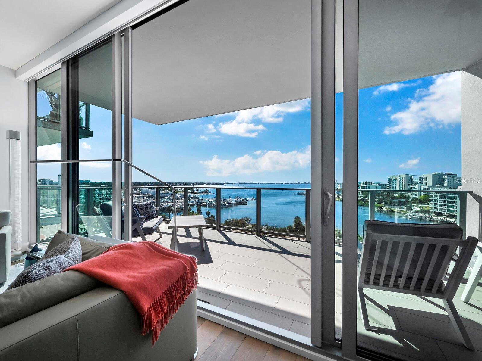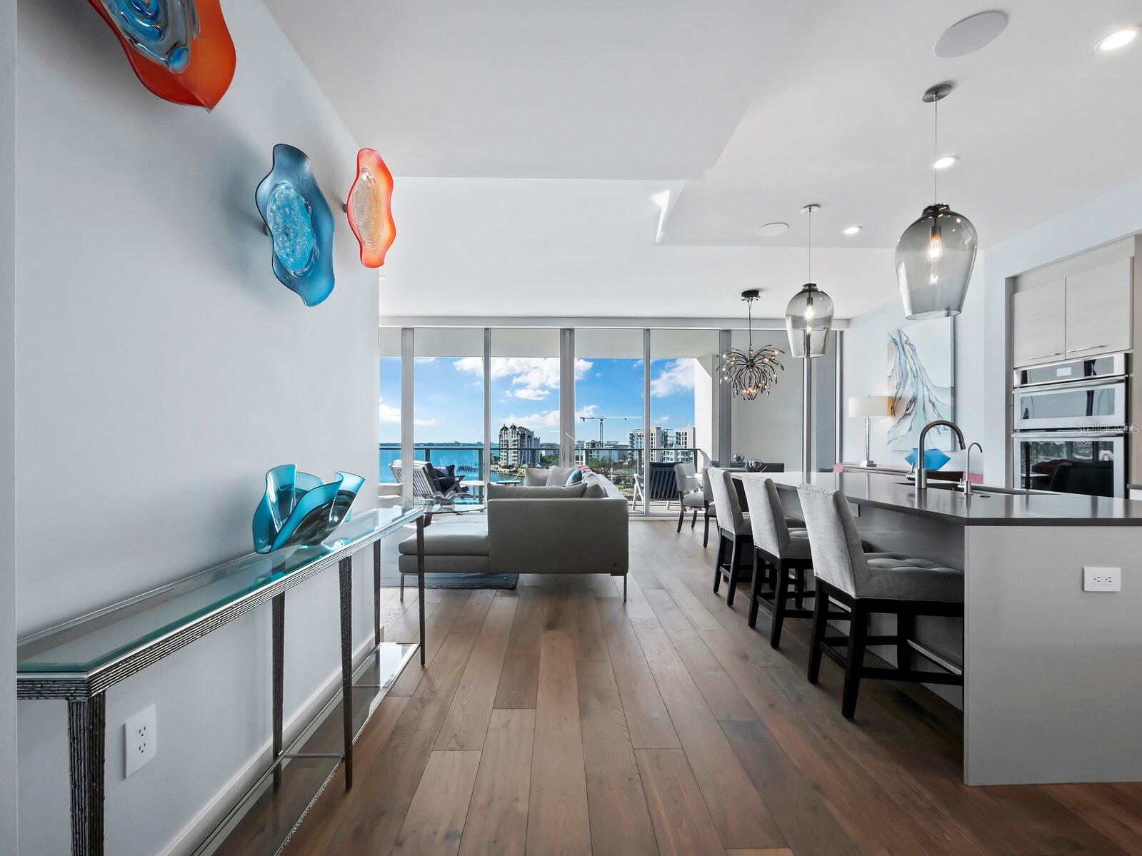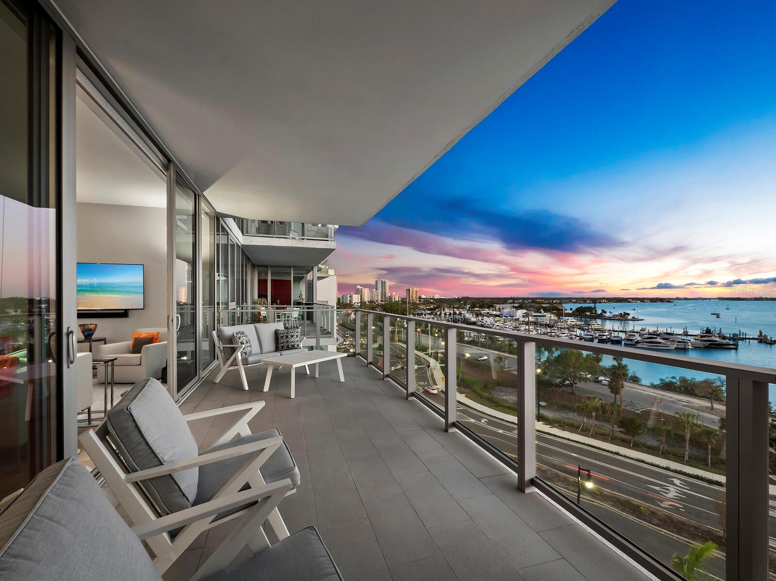 A fabulously appointed designer residence in a coveted, amenity-rich building, VUE 703 offers the pinnacle of luxury living in the heart of Sarasota’s cosmopolitan downtown. Renowned for its exceptional resort-style living and elegant contemporary style, VUE is an incredible high-rise building with enviably curated amenities that extend from the valet service and concierge to plush resident lounges and facilities, all within steps of Sarasota’s world-class cultural scene and thriving hub of shops, restaurants, and galleries. This elevated residence with private elevator access is a spacious retreat that blends the sleek modern style of the building with exquisite design elements that lend warmth and enhance the luxurious comfort. Premium upgrades include elegant wide-plank wood floors, designer lighting and décor, sound system and automatic window shades both by Creston, and water filtration by Aqua, while tall 10’ ceilings throughout accentuate absolutely stunning water views. From the front door, unobstructed site lines showcase spectacular southwest vistas across Sarasota Bay and the keys to the Gulf of Mexico beyond. Thoughtfully designed to maximize the views, the home features an airy, open layout with a full wall of floor-to-ceiling sliding impact glass doors that extend the central living space to a deep private terrace with glass railings. Overlooking the dining and central living spaces, the gourmet kitchen with beautiful Italian cabinetry and stainless appliances wraps around a large quartz-clad island with abundant prep and storage space as well as additional seating for guests. The open plan living room and dining area are perfect for entertaining, flowing seamlessly to a private terrace that spans nearly 300 square feet with protective shade and picture-perfect views overlooking the waterfront and marina. The owners’ suite enjoys its own floor-to-ceiling wall of windows for spectacular water and sunset views, with a resort-style bathroom that features extra-long double vanity, enviable storage, glass-enclosed walk-in shower, and separate water closet. Two separate walk-in closets add to the owners’ luxury. Near the home’s entry, a spacious second bedroom offers en suite comfort and ample closet space, and a separate den accommodates a private office or media lounge. The additional half bath is luxuriously outfitted with haute design elements including crystal sconces and a carved onyx sink. A generous, separate utility room with washer and dryer adds to the exceptional in-home conveniences. The residence comes with deeded, secure storage space and two assigned parking spaces that are gated and enclosed. Ideally located across from Sarasota’s celebrated waterfront and within steps of Downtown’s cosmopolitan core, VUE is a highly sought after address with a dazzling array of premium amenities including heated pool and spa with a spectacular pool deck that encompasses multiple lounge areas, fire pit, and enormous pergola with gourmet grill station. Additional amenities include fitness center, dedicated pet recreational area, concierge and security. Offered by the original owners, meticulously maintained and upgraded, VUE 703 is a valuable opportunity to enjoy a lifestyle of ultimate comfort and style. Furnishings available by separate offer.