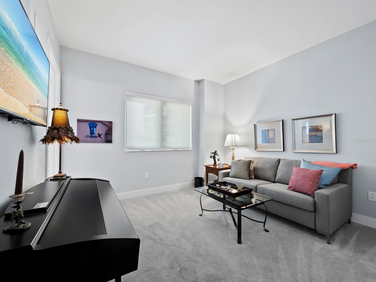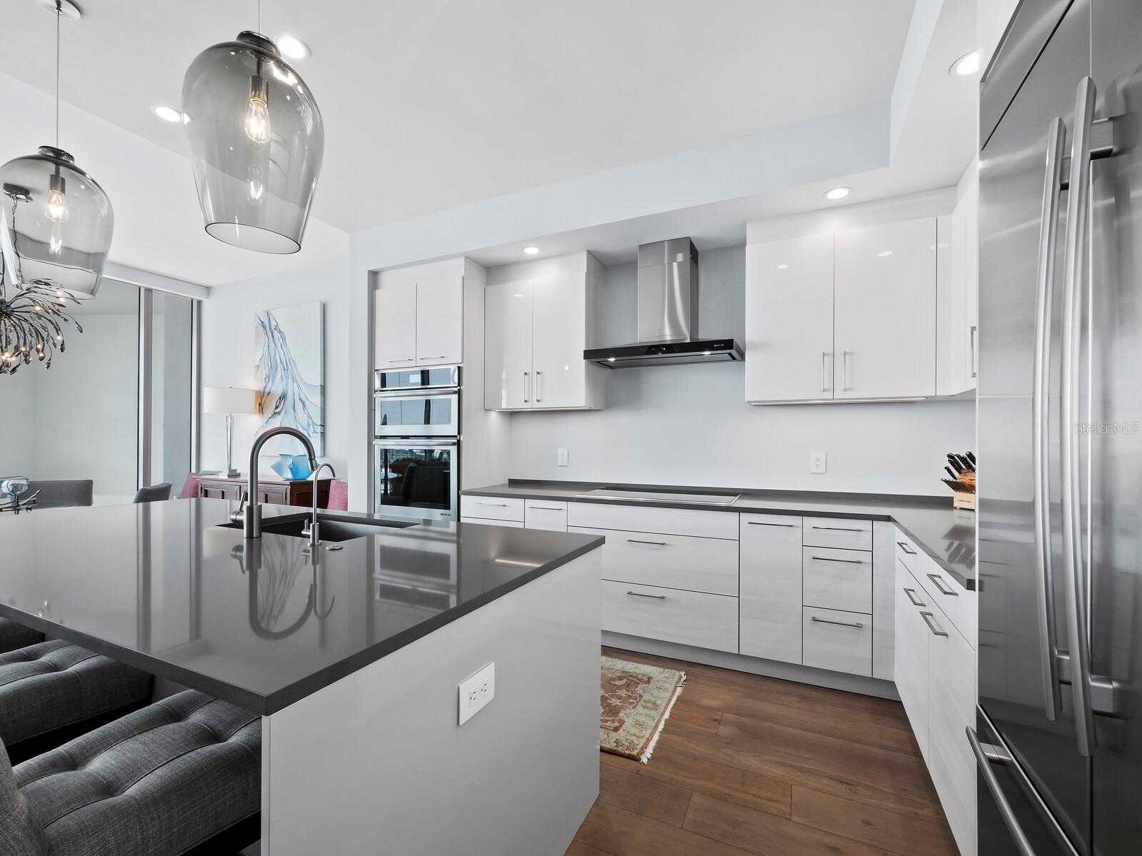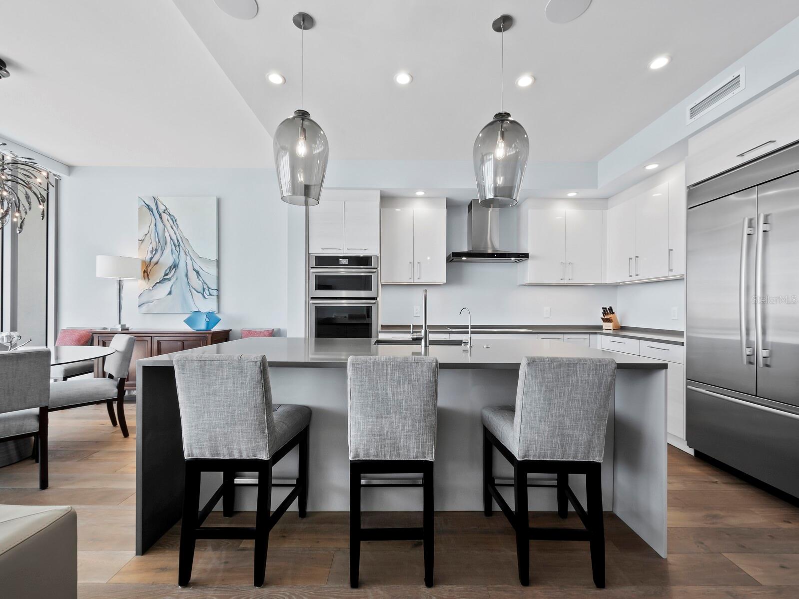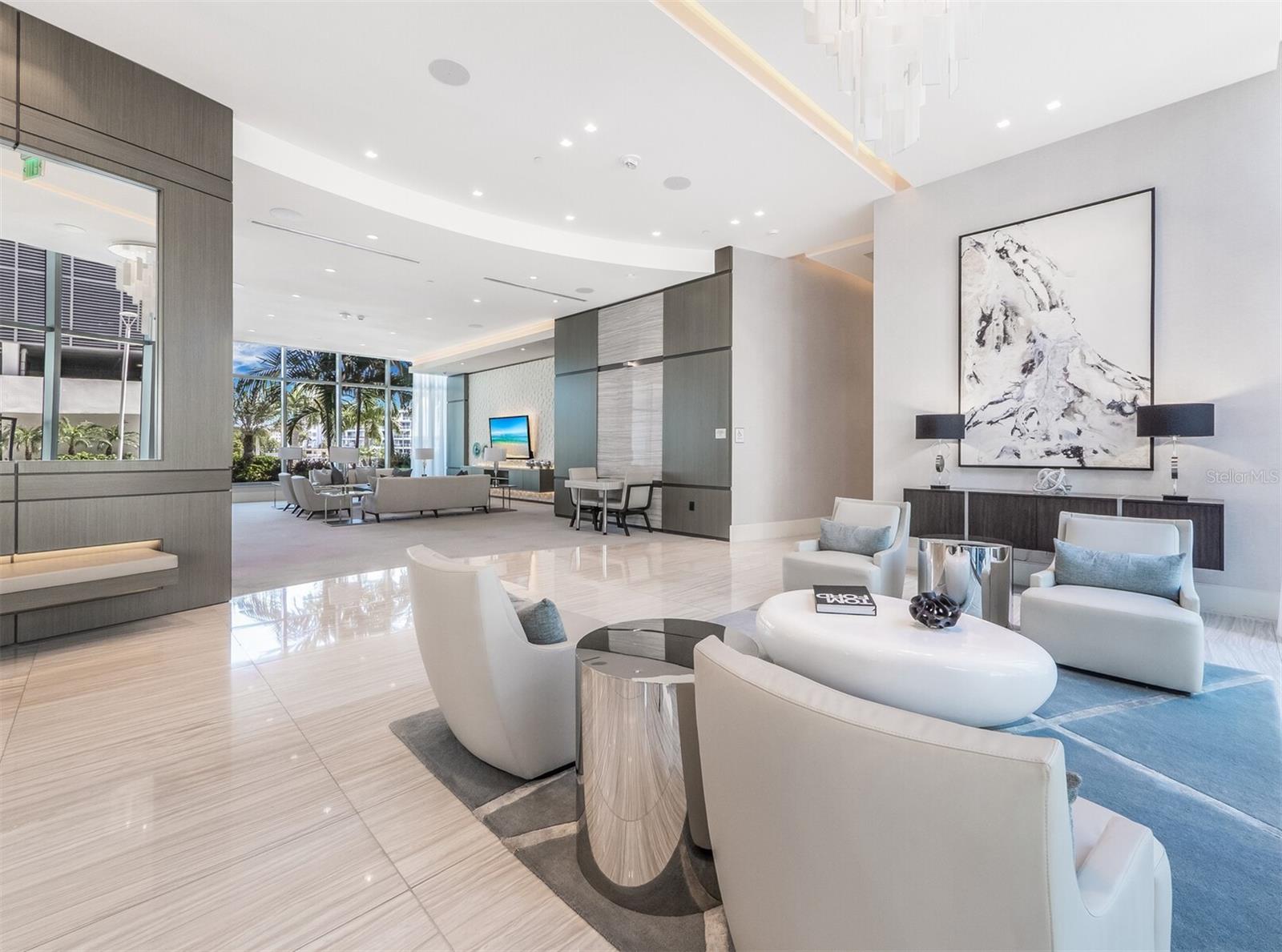 A fabulously appointed designer residence in a coveted, amenity-rich building, VUE 703 offers the pinnacle of luxury living in the heart of Sarasota’s cosmopolitan downtown. Renowned for its exceptional resort-style living and elegant contemporary style, VUE is an incredible high-rise building with enviably curated amenities that extend from the valet service and concierge to plush resident lounges and facilities, all within steps of Sarasota’s world-class cultural scene and thriving hub of shops, restaurants, and galleries. This elevated residence with private elevator access is a spacious retreat that blends the sleek modern style of the building with exquisite design elements that lend warmth and enhance the luxurious comfort. Premium upgrades include elegant wide-plank wood floors, designer lighting and décor, sound system and automatic window shades both by Creston, and water filtration by Aqua, while tall 10’ ceilings throughout accentuate absolutely stunning water views. From the front door, unobstructed site lines showcase spectacular southwest vistas across Sarasota Bay and the keys to the Gulf of Mexico beyond. Thoughtfully designed to maximize the views, the home features an airy, open layout with a full wall of floor-to-ceiling sliding impact glass doors that extend the central living space to a deep private terrace with glass railings. Overlooking the dining and central living spaces, the gourmet kitchen with beautiful Italian cabinetry and stainless appliances wraps around a large quartz-clad island with abundant prep and storage space as well as additional seating for guests. The open plan living room and dining area are perfect for entertaining, flowing seamlessly to a private terrace that spans nearly 300 square feet with protective shade and picture-perfect views overlooking the waterfront and marina. The owners’ suite enjoys its own floor-to-ceiling wall of windows for spectacular water and sunset views, with a resort-style bathroom that features extra-long double vanity, enviable storage, glass-enclosed walk-in shower, and separate water closet. Two separate walk-in closets add to the owners’ luxury. Near the home’s entry, a spacious second bedroom offers en suite comfort and ample closet space, and a separate den accommodates a private office or media lounge. The additional half bath is luxuriously outfitted with haute design elements including crystal sconces and a carved onyx sink. A generous, separate utility room with washer and dryer adds to the exceptional in-home conveniences. The residence comes with deeded, secure storage space and two assigned parking spaces that are gated and enclosed. Ideally located across from Sarasota’s celebrated waterfront and within steps of Downtown’s cosmopolitan core, VUE is a highly sought after address with a dazzling array of premium amenities including heated pool and spa with a spectacular pool deck that encompasses multiple lounge areas, fire pit, and enormous pergola with gourmet grill station. Additional amenities include fitness center, dedicated pet recreational area, concierge and security. Offered by the original owners, meticulously maintained and upgraded, VUE 703 is a valuable opportunity to enjoy a lifestyle of ultimate comfort and style. Furnishings available by separate offer.
