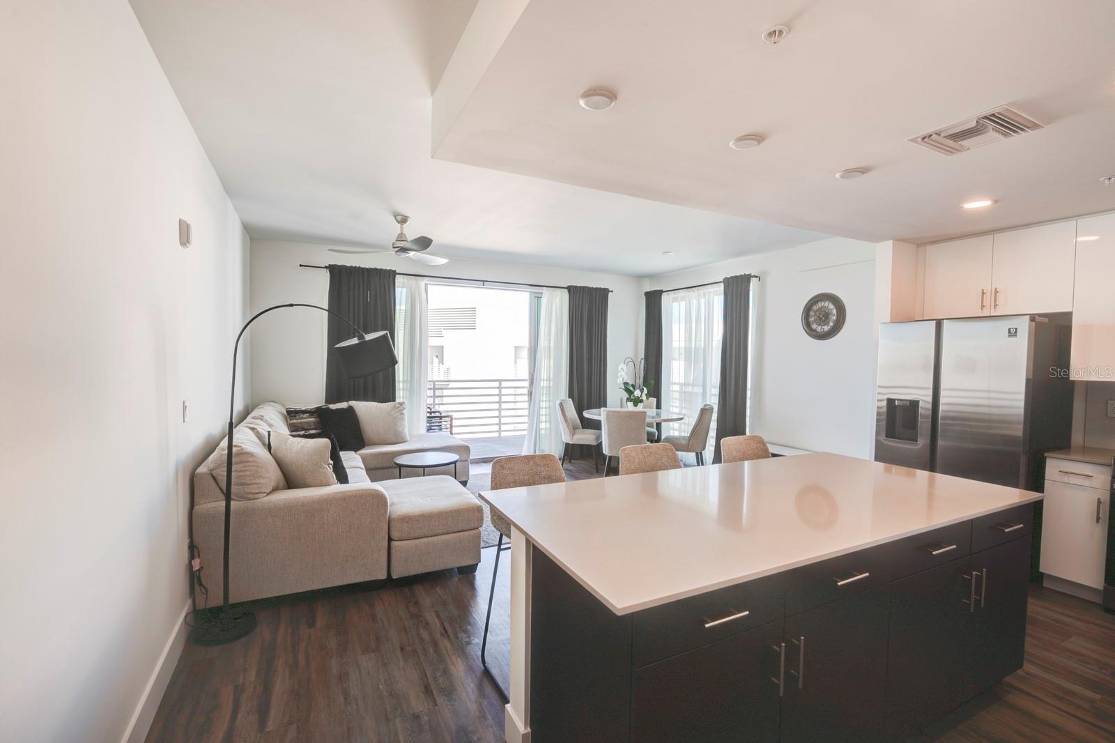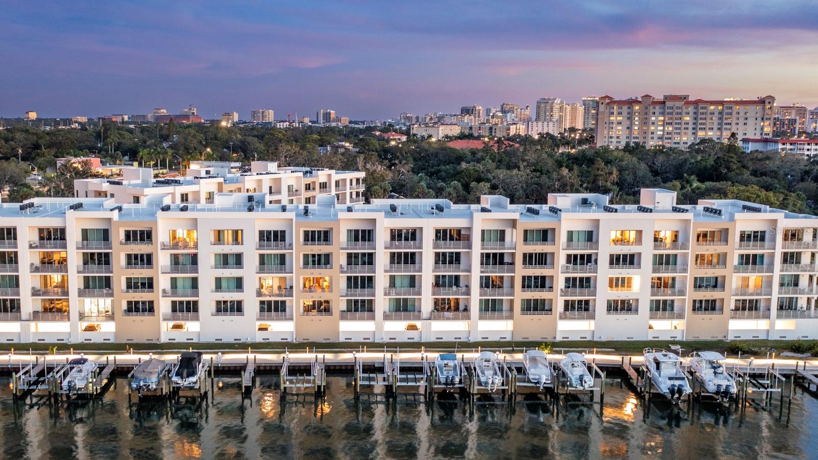 One or more photo(s) has been virtually staged. Penthouse , 5th floor, end unit, 2 bedroom , 2 full bath residence , 1359 sqft , 126 sf oversized terrace, Perfect as a primary or secondary home, or investment property where weekly rentals are permitted. The Strand! This Modern New Construction Waterfront and Bay access Condo, near Downtown Sarasota, Florida was completed in November 2022, beautifully decorated and designed PENTHOUSE, END UNIT with unmatched custom upgrades in this oversized open floor plan layout. The Kitchen/Dining/Living room gives a large, bright, open feeling. Upgraded, Two toned Modern high gloss cabinetry with pull outs and soft close drawers, terrazzo quartz island is amazing for eating, working, or to gather around at a cocktail party that will spill out onto the balcony thru the full wall of 9’ tall hurricane rated sliding glass doors. This beautiful unit offers two full bathrooms, with high gloss finished vanities and stone quartz countertops, one master bedroom with walking closet plus a large second bedroom.Convenient in-unit laundry room with Samsung washer and dryer, 1 under building assigned parking space, and private secure storage. Resort style amenities are fantastic including heated swimming pool/spa, fitness center, gas fire pit and grills, electric car charging stations, dog park, boardwalk, and kayak launch & storage. In addition to the fabulous surroundings and culture , walking distance of Downtown Sarasota, you can enjoy the restaurants, cafes and bars that are just a stone’s throw away from The Strand. Enjoy and explore the top-rated beaches and bays, waterfront parks just one step away. Sarasota was named one of the best places to live in the Country by U.S. News & World Report in the 2022 annual rankings which ranked Sarasota #9, making it the only Florida city to land in the Top 10. Make this exceptional residence, community and city your home today.