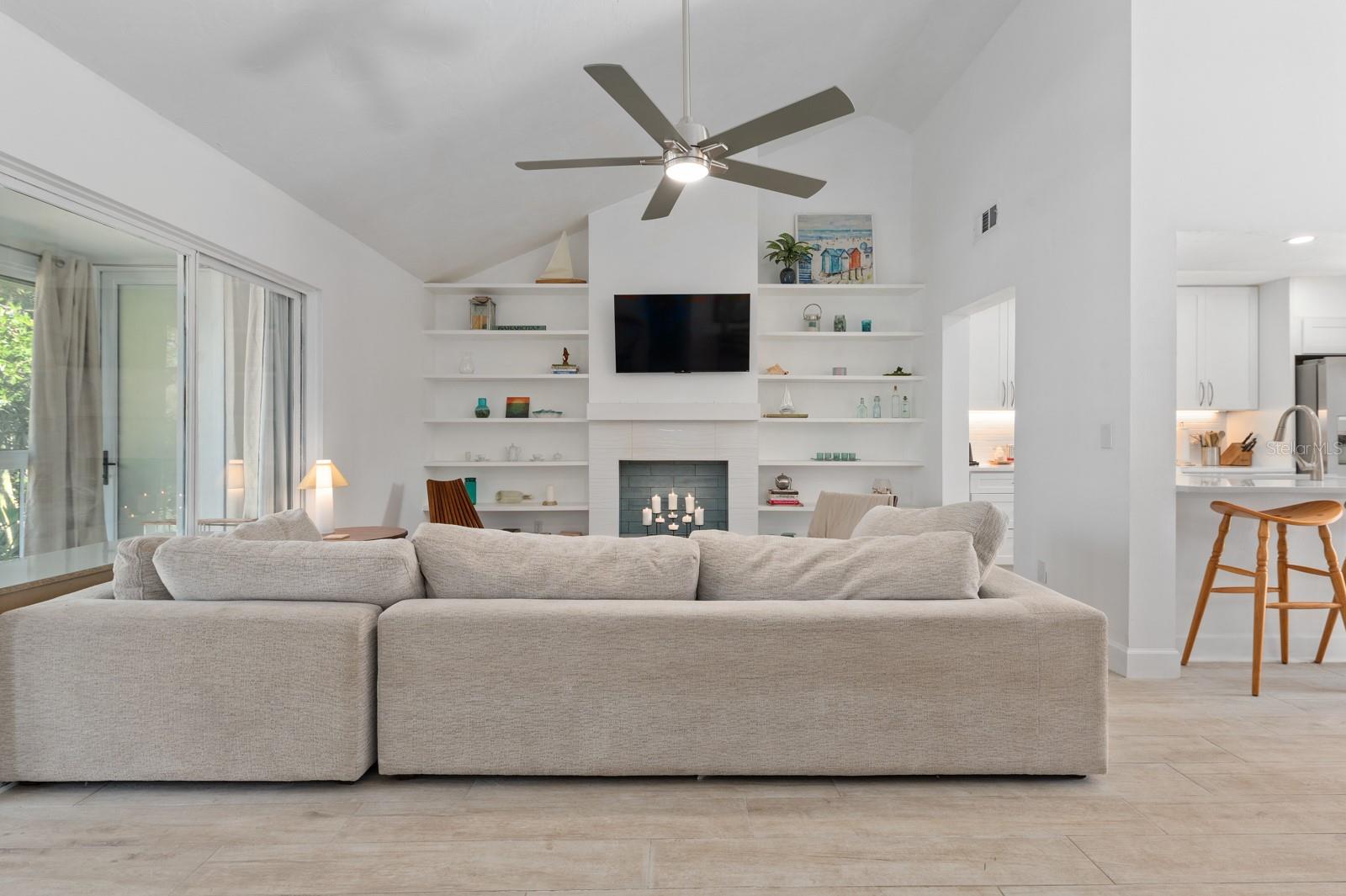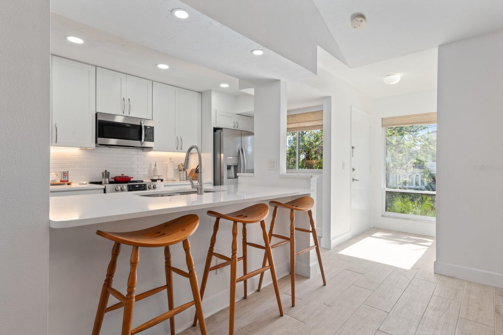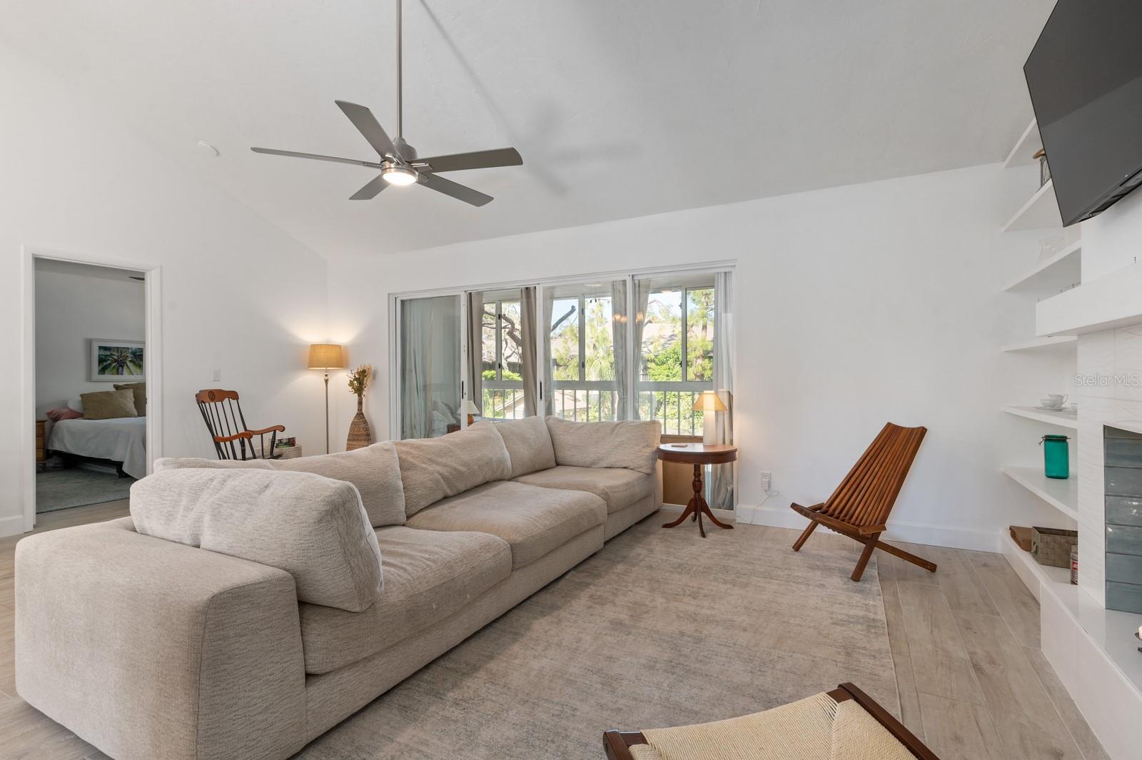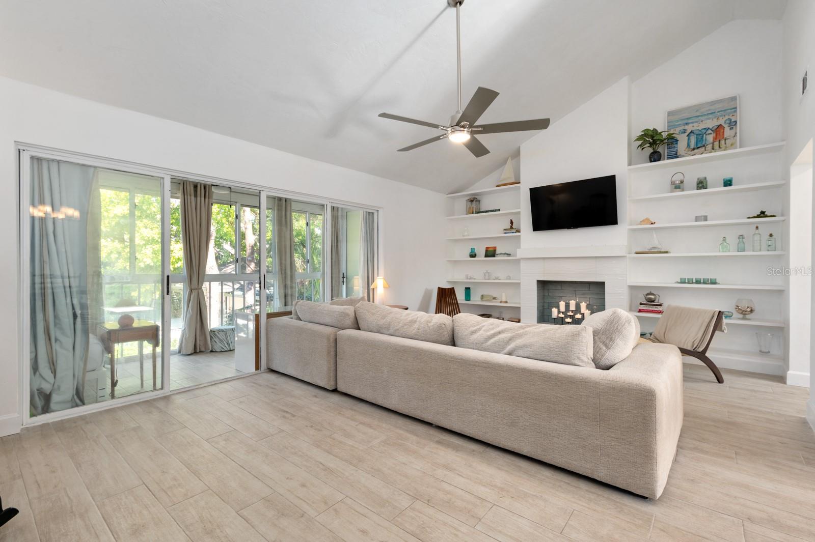 Experience the best of waterfront living in the exclusive, gated Pelican Cove Community. This unit is light and bright and move-in ready! The newly remodeled kitchen boasts quartz countertops and wood cabinets complemented by top-of-the-line stainless steel appliances with open-concept access to both the dining and living areas. Living area features a fireplace wall with built-in bookcase and cathedral ceiling. Bathrooms are also completely remodeled with walk-in showers, glass surrounds, and wood cabinetry with quartz countertops. Hurricane glass-enclosed lanai overlooking the beautiful pool acts as a guest room, office, and/or peaceful meditation/yoga/workout studio. Stacked LG full-sized washer/dryer. Fresh paint and wood-look porcelain tiles throughout, plenty of closet space, and updated water heater (2021). Spread across 75 acres of pristine, gated waterfront property, Pelican Cove is a tropical oasis teeming with amenities and friendly neighbors. Discover the 86-slip protected boat harbor with unbeatable slip fees and lovable manatees directly across the intercoastal from Siesta Key and the newly reopened Midnight Pass providing Gulf access. Launch your kayak or canoe from one of three docks specifically designed for these smaller vessels. Enjoy the six heated swimming pools, a hot tub, three clubhouses, fitness center, lighted tennis and pickleball courts, shuffleboard, basketball, dog walking areas, and over 5 miles of walking trails and boardwalks. Spend your time bird watching in this bird sanctuary and experience spectacular sunsets almost every evening from several platforms along the waterfront. Unleash your creativity with art studios, a pottery classroom, woodworking, and sculpting, or attend classes at Pelican Cove University. Choose from over 37 clubs, including photography, fiber art, biking, yoga, Tai Chi, culinary arts, and card clubs. The community also offers evening jazz and classical music concerts, ensuring an enriched lifestyle for all. Award-winning landscaping and superior management set Pelican Cove apart as the ultimate adult sanctuary. Just minutes from Siesta Key Beach, Turtle Beach, fine dining, and shopping, this stunning condo is your ticket to a life of luxury and leisure by the bay.
