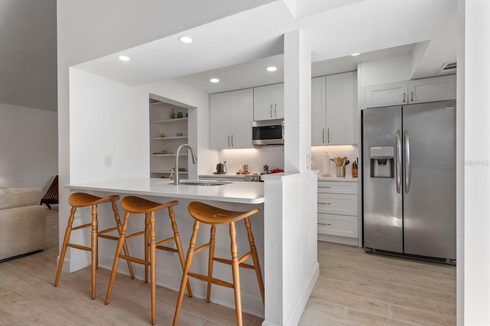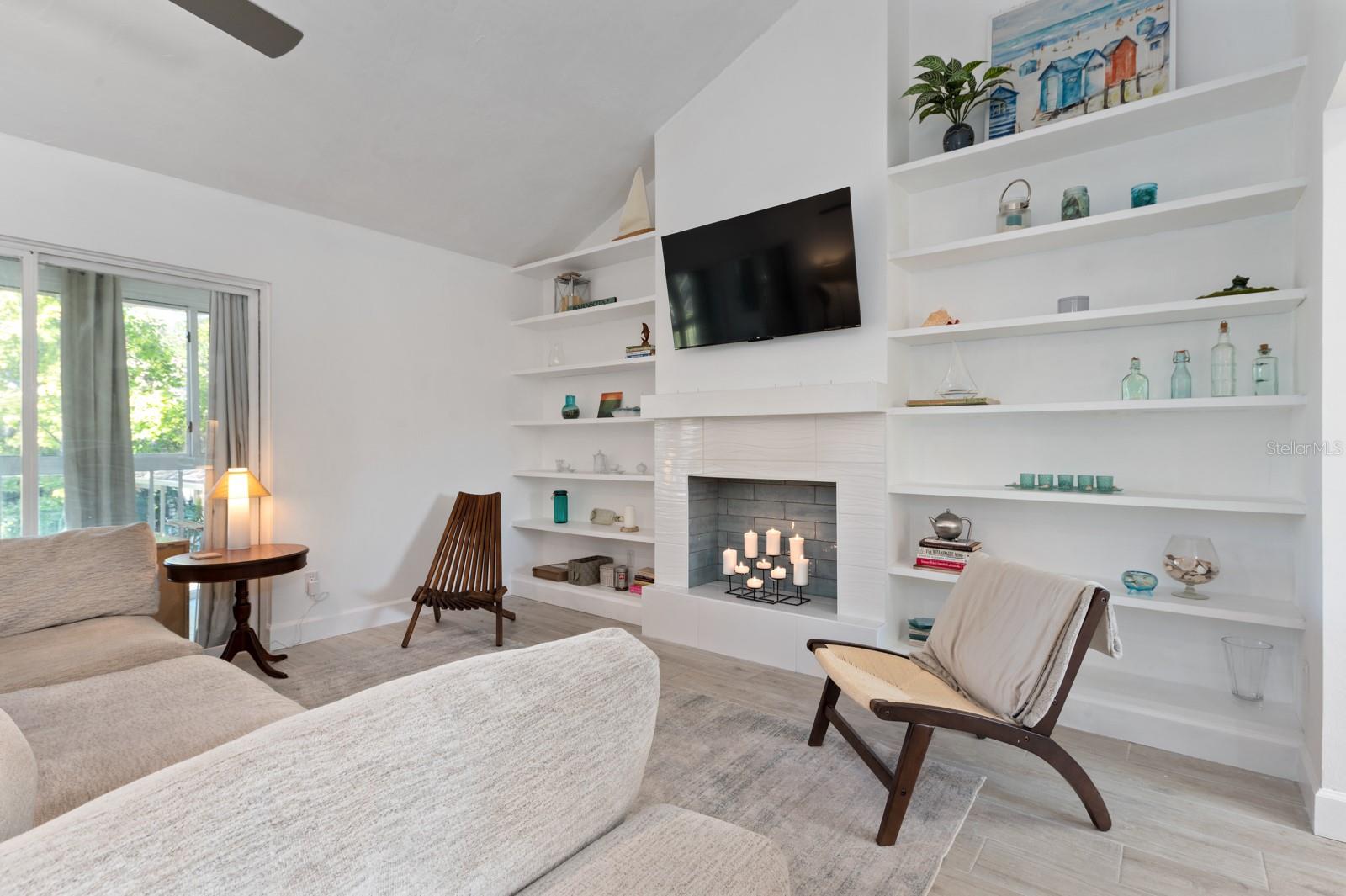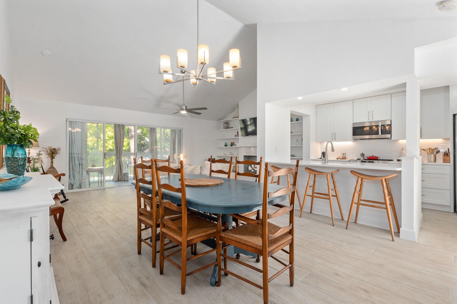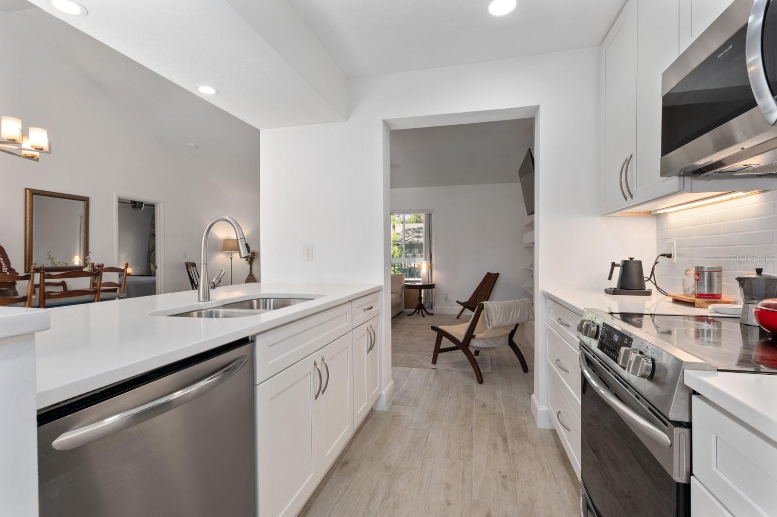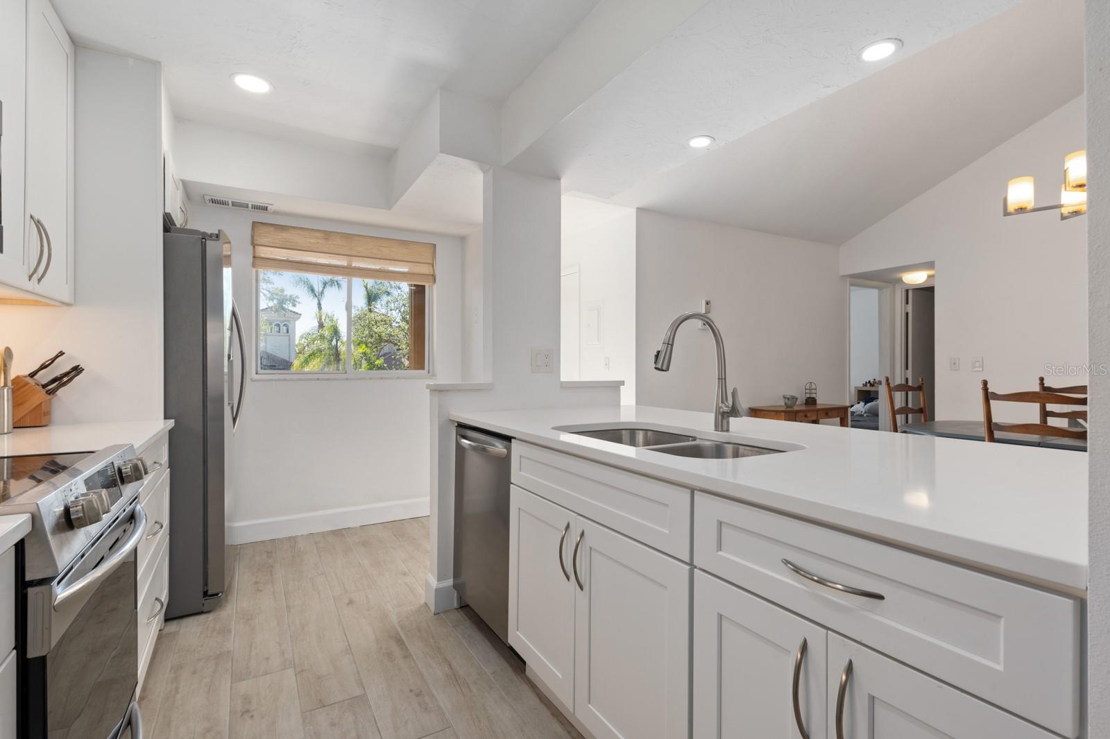 Experience the best of waterfront living in the exclusive, gated Pelican Cove Community. This unit is light and bright and move-in ready! The newly remodeled kitchen boasts quartz countertops and wood cabinets complemented by top-of-the-line stainless steel appliances with open-concept access to both the dining and living areas. Living area features a fireplace wall with built-in bookcase and cathedral ceiling. Bathrooms are also completely remodeled with walk-in showers, glass surrounds, and wood cabinetry with quartz countertops. Hurricane glass-enclosed lanai overlooking the beautiful pool acts as a guest room, office, and/or peaceful meditation/yoga/workout studio. Stacked LG full-sized washer/dryer. Fresh paint and wood-look porcelain tiles throughout, plenty of closet space, and updated water heater (2021). Spread across 75 acres of pristine, gated waterfront property, Pelican Cove is a tropical oasis teeming with amenities and friendly neighbors. Discover the 86-slip protected boat harbor with unbeatable slip fees and lovable manatees directly across the intercoastal from Siesta Key and the newly reopened Midnight Pass providing Gulf access. Launch your kayak or canoe from one of three docks specifically designed for these smaller vessels. Enjoy the six heated swimming pools, a hot tub, three clubhouses, fitness center, lighted tennis and pickleball courts, shuffleboard, basketball, dog walking areas, and over 5 miles of walking trails and boardwalks. Spend your time bird watching in this bird sanctuary and experience spectacular sunsets almost every evening from several platforms along the waterfront. Unleash your creativity with art studios, a pottery classroom, woodworking, and sculpting, or attend classes at Pelican Cove University. Choose from over 37 clubs, including photography, fiber art, biking, yoga, Tai Chi, culinary arts, and card clubs. The community also offers evening jazz and classical music concerts, ensuring an enriched lifestyle for all. Award-winning landscaping and superior management set Pelican Cove apart as the ultimate adult sanctuary. Just minutes from Siesta Key Beach, Turtle Beach, fine dining, and shopping, this stunning condo is your ticket to a life of luxury and leisure by the bay.