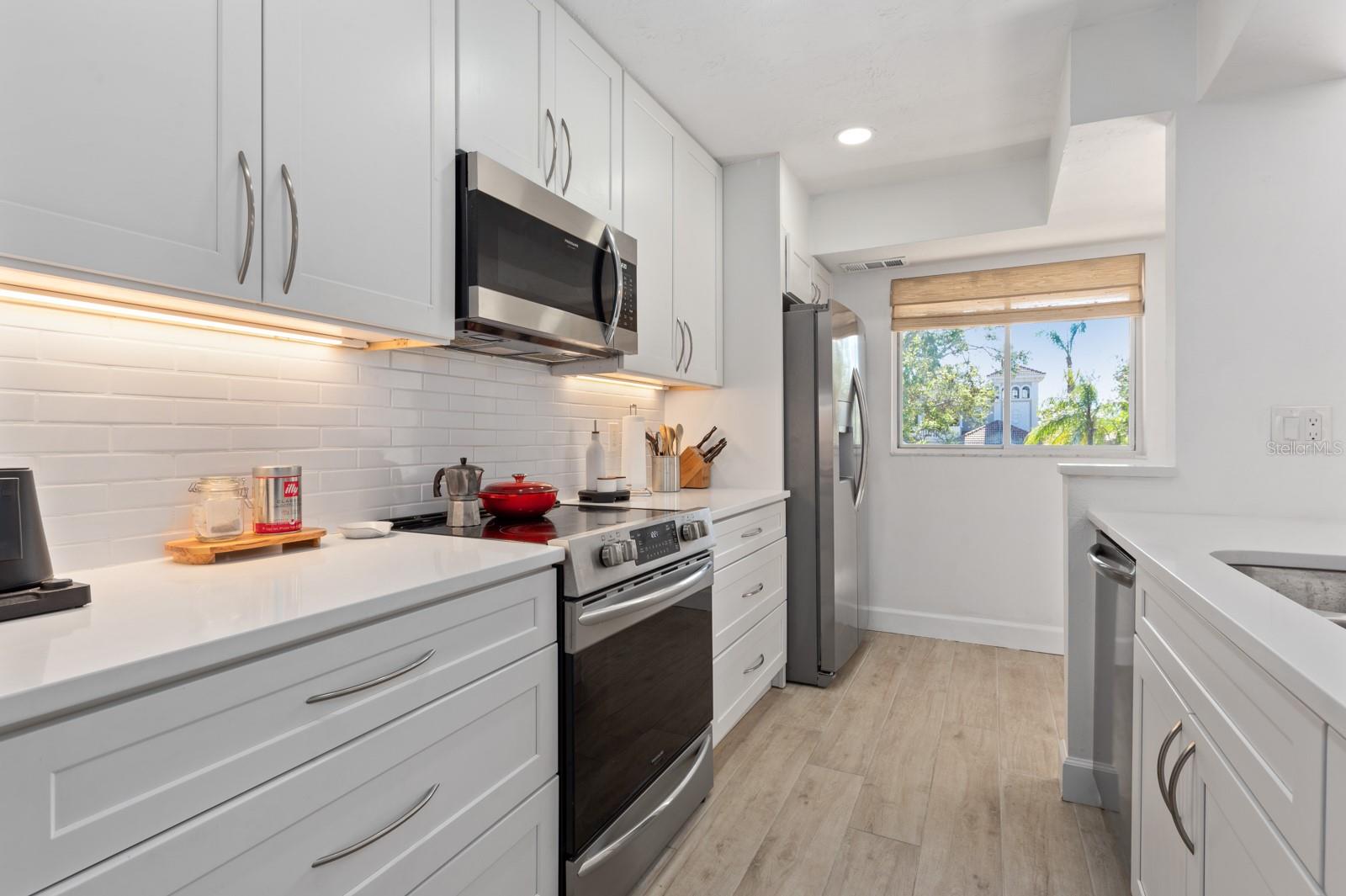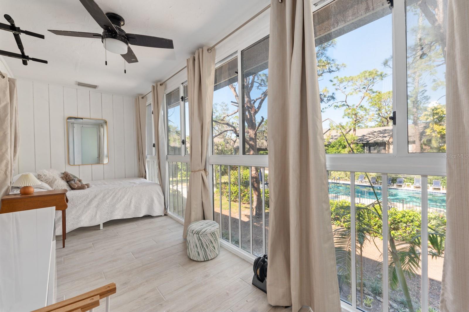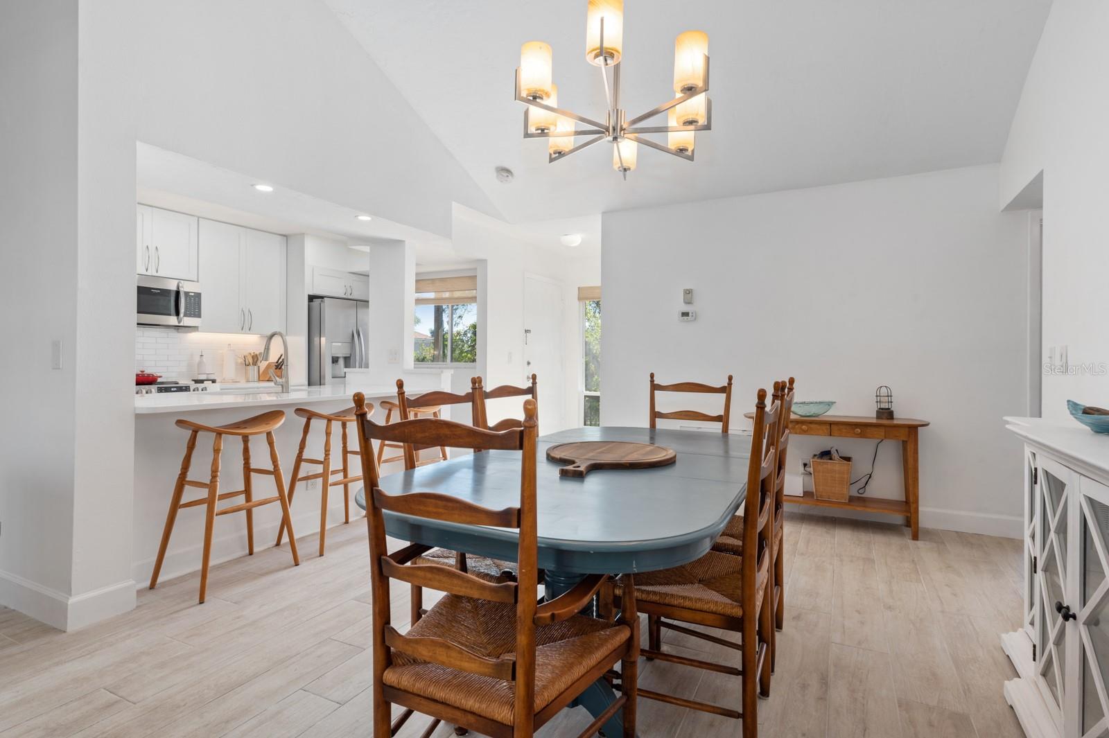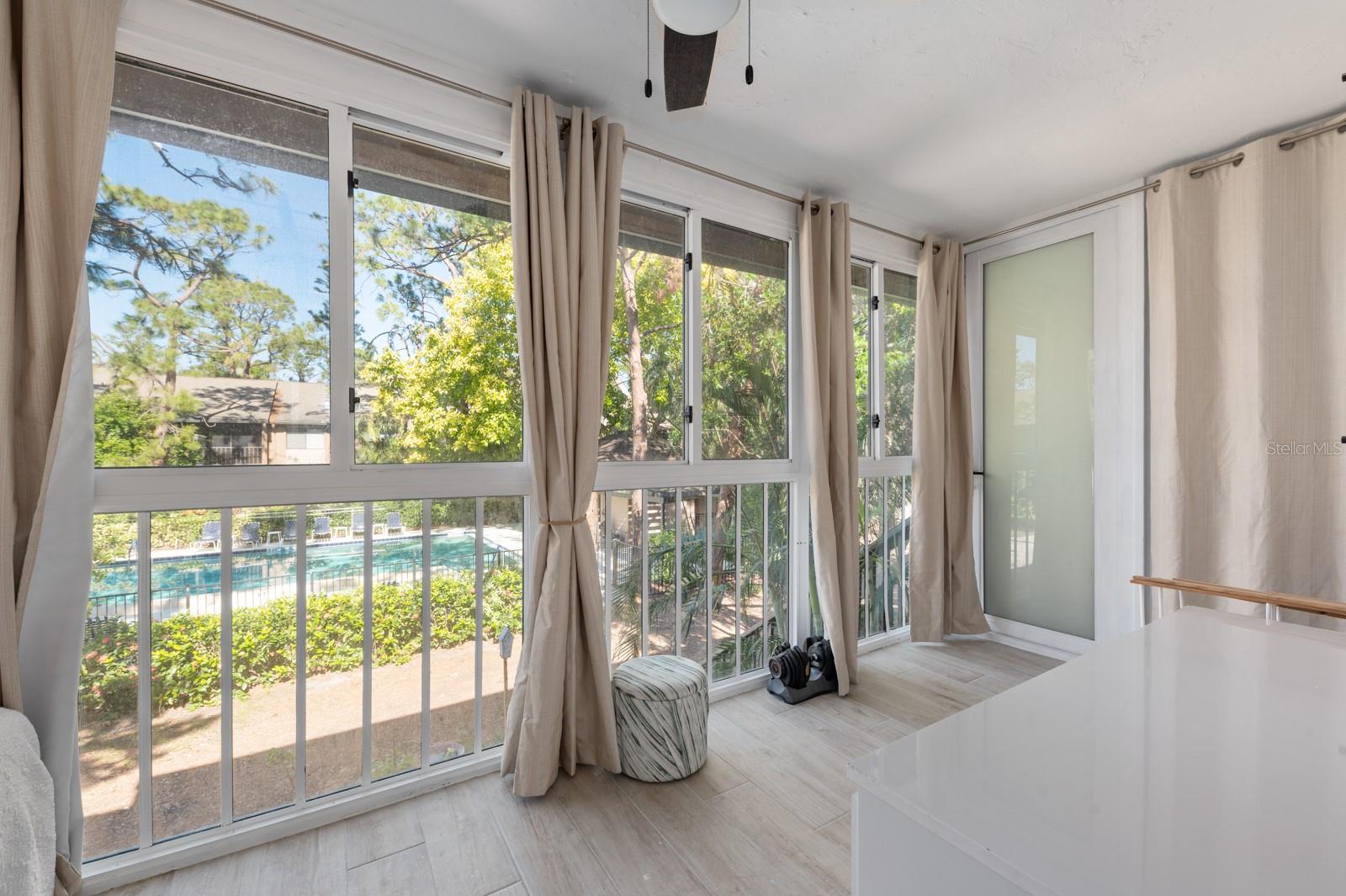 Experience the best of waterfront living in the exclusive, gated Pelican Cove Community. This unit is light and bright and move-in ready! The newly remodeled kitchen boasts quartz countertops and wood cabinets complemented by top-of-the-line stainless steel appliances with open-concept access to both the dining and living areas. Living area features a fireplace wall with built-in bookcase and cathedral ceiling. Bathrooms are also completely remodeled with walk-in showers, glass surrounds, and wood cabinetry with quartz countertops. Hurricane glass-enclosed lanai overlooking the beautiful pool acts as a guest room, office, and/or peaceful meditation/yoga/workout studio. Stacked LG full-sized washer/dryer. Fresh paint and wood-look porcelain tiles throughout, plenty of closet space, and updated water heater (2021). Spread across 75 acres of pristine, gated waterfront property, Pelican Cove is a tropical oasis teeming with amenities and friendly neighbors. Discover the 86-slip protected boat harbor with unbeatable slip fees and lovable manatees directly across the intercoastal from Siesta Key and the newly reopened Midnight Pass providing Gulf access. Launch your kayak or canoe from one of three docks specifically designed for these smaller vessels. Enjoy the six heated swimming pools, a hot tub, three clubhouses, fitness center, lighted tennis and pickleball courts, shuffleboard, basketball, dog walking areas, and over 5 miles of walking trails and boardwalks. Spend your time bird watching in this bird sanctuary and experience spectacular sunsets almost every evening from several platforms along the waterfront. Unleash your creativity with art studios, a pottery classroom, woodworking, and sculpting, or attend classes at Pelican Cove University. Choose from over 37 clubs, including photography, fiber art, biking, yoga, Tai Chi, culinary arts, and card clubs. The community also offers evening jazz and classical music concerts, ensuring an enriched lifestyle for all. Award-winning landscaping and superior management set Pelican Cove apart as the ultimate adult sanctuary. Just minutes from Siesta Key Beach, Turtle Beach, fine dining, and shopping, this stunning condo is your ticket to a life of luxury and leisure by the bay.