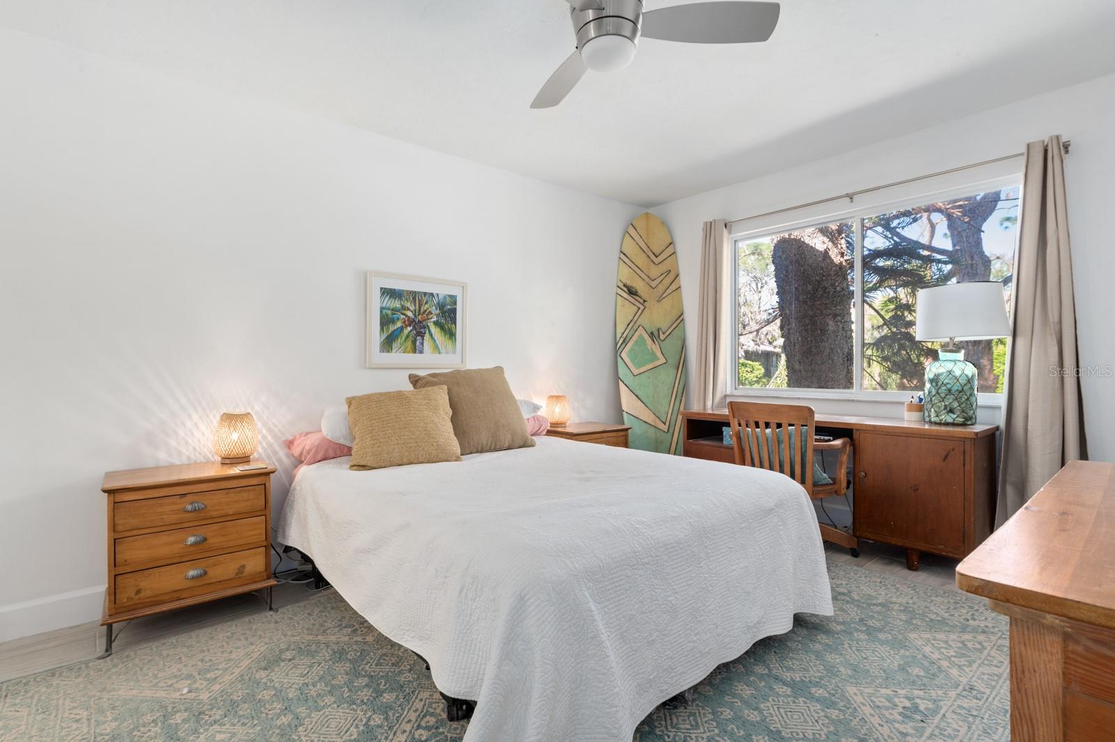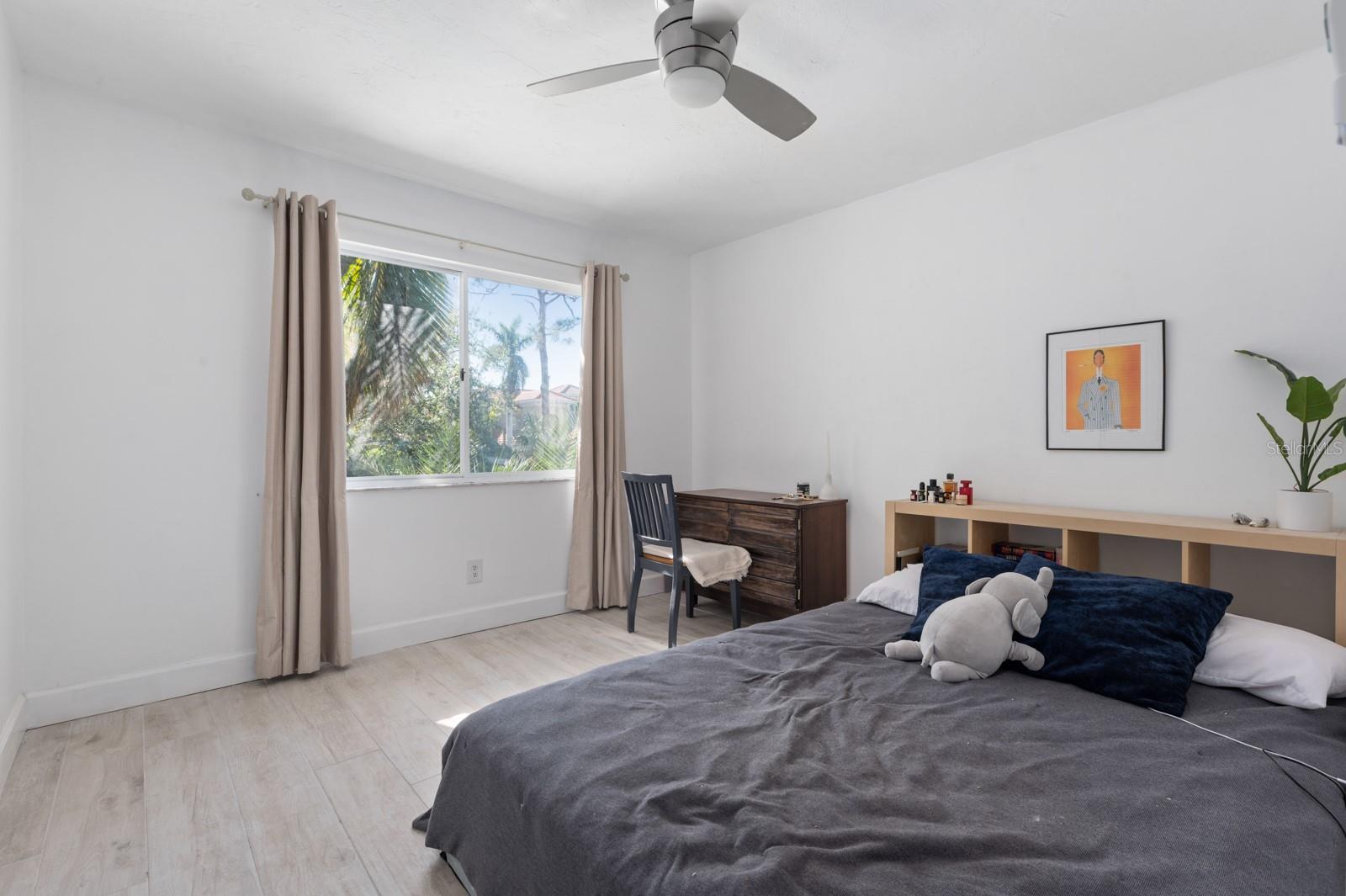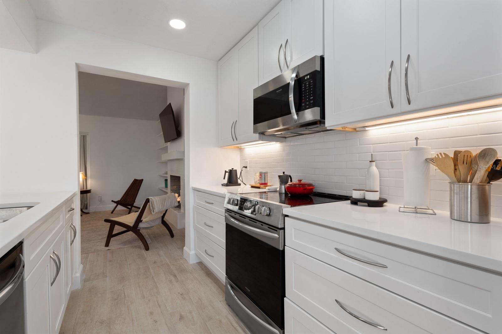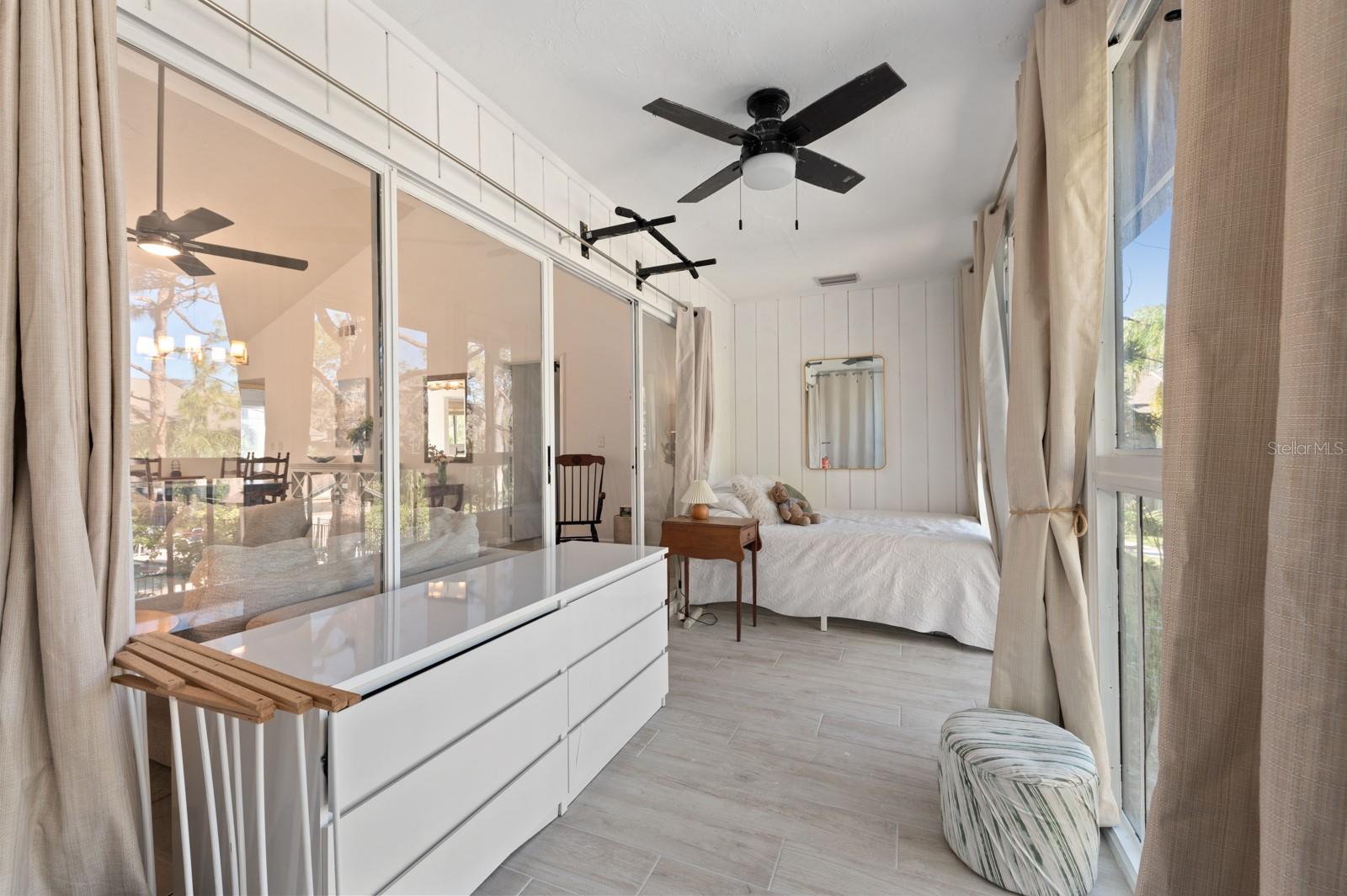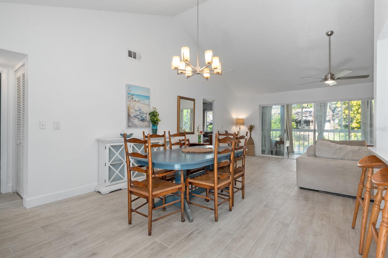 Experience the best of waterfront living in the exclusive, gated Pelican Cove Community. This unit is light and bright and move-in ready! The newly remodeled kitchen boasts quartz countertops and wood cabinets complemented by top-of-the-line stainless steel appliances with open-concept access to both the dining and living areas. Living area features a fireplace wall with built-in bookcase and cathedral ceiling. Bathrooms are also completely remodeled with walk-in showers, glass surrounds, and wood cabinetry with quartz countertops. Hurricane glass-enclosed lanai overlooking the beautiful pool acts as a guest room, office, and/or peaceful meditation/yoga/workout studio. Stacked LG full-sized washer/dryer. Fresh paint and wood-look porcelain tiles throughout, plenty of closet space, and updated water heater (2021). Spread across 75 acres of pristine, gated waterfront property, Pelican Cove is a tropical oasis teeming with amenities and friendly neighbors. Discover the 86-slip protected boat harbor with unbeatable slip fees and lovable manatees directly across the intercoastal from Siesta Key and the newly reopened Midnight Pass providing Gulf access. Launch your kayak or canoe from one of three docks specifically designed for these smaller vessels. Enjoy the six heated swimming pools, a hot tub, three clubhouses, fitness center, lighted tennis and pickleball courts, shuffleboard, basketball, dog walking areas, and over 5 miles of walking trails and boardwalks. Spend your time bird watching in this bird sanctuary and experience spectacular sunsets almost every evening from several platforms along the waterfront. Unleash your creativity with art studios, a pottery classroom, woodworking, and sculpting, or attend classes at Pelican Cove University. Choose from over 37 clubs, including photography, fiber art, biking, yoga, Tai Chi, culinary arts, and card clubs. The community also offers evening jazz and classical music concerts, ensuring an enriched lifestyle for all. Award-winning landscaping and superior management set Pelican Cove apart as the ultimate adult sanctuary. Just minutes from Siesta Key Beach, Turtle Beach, fine dining, and shopping, this stunning condo is your ticket to a life of luxury and leisure by the bay.