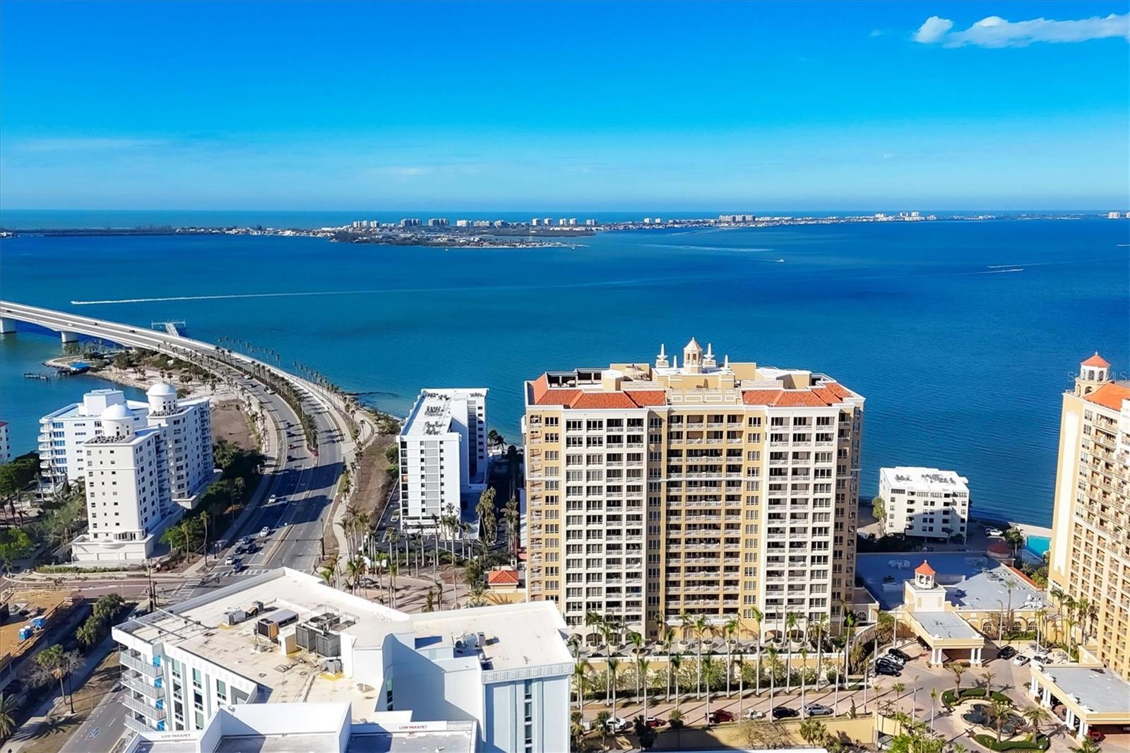 Panoramic views of the Bay and Gulf with beautiful sunsets, stunning modern renovations, great location with easy access, world renowned Ritz Carlton service. This 12th floor residence has unobstructed water views, 2985 sq ft, 54 ft balcony, 3 bedrooms, 3 baths, two parking spaces with EV charging station, wood floors, electric blinds and drapes on hidden tracks, creative storage spaces, designer lighting, Carrara marble countertops. dual built in Dacor ovens, Thermador induction cooktop, paneled Sub-Zero refrigerator, freezer drawers and 59 bottle wine cooler, private elevator lobby, custom closet with drawers and shelves, fully installed leak detector system. Building completely painted and sealed in 2024. Common areas being remodeled. The Tower Residences provides concierge services, a full staff management team, 24 hour in-residence dining and VIP status at all the Ritz Carlton hotels worldwide. Amenities include a state-of-the-art fitness center with sauna, steam baths, and massage rooms, large social and recreation rooms, private movie theatre, heated pool and spa, outdoor grill and kitchen.