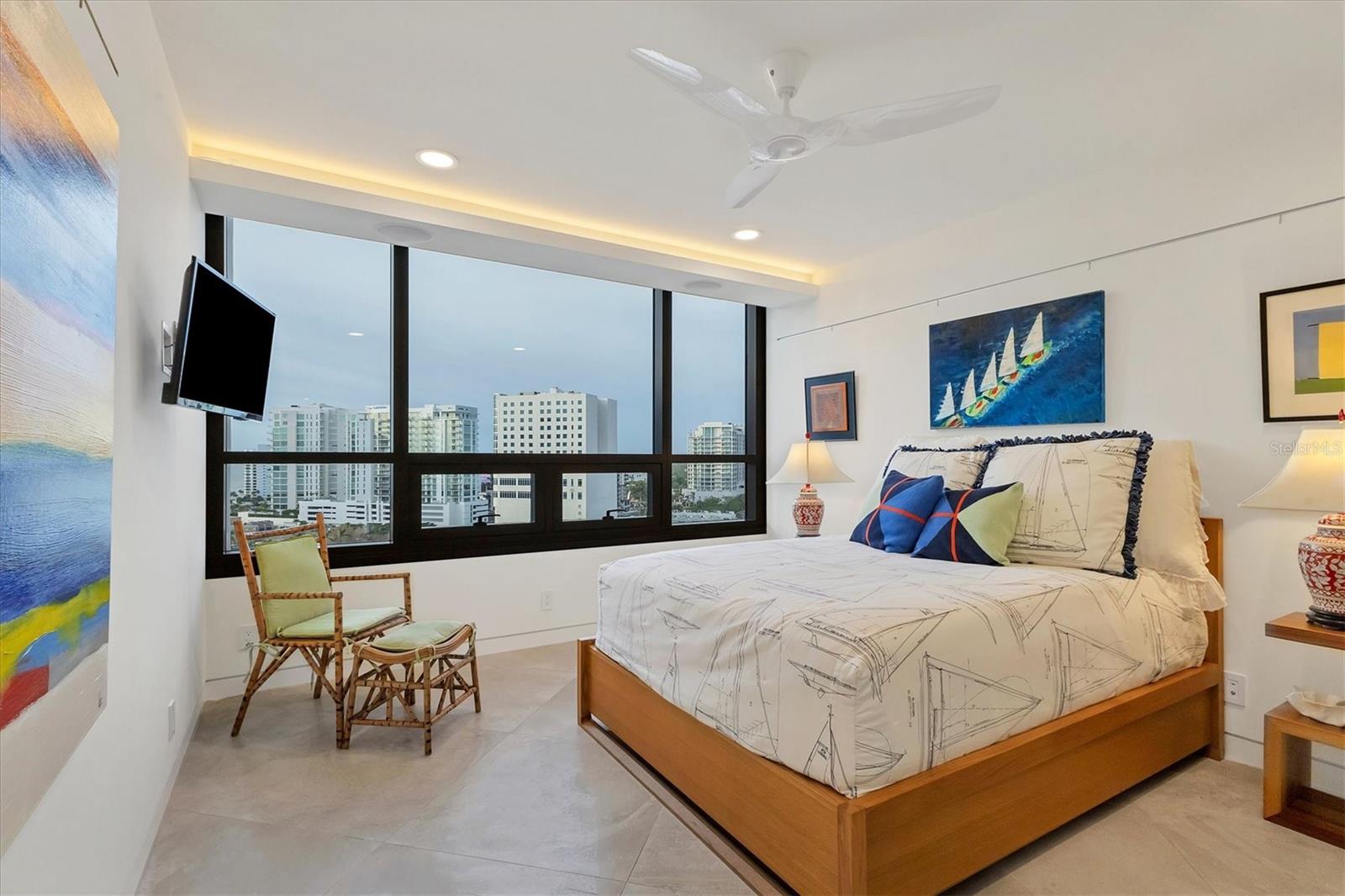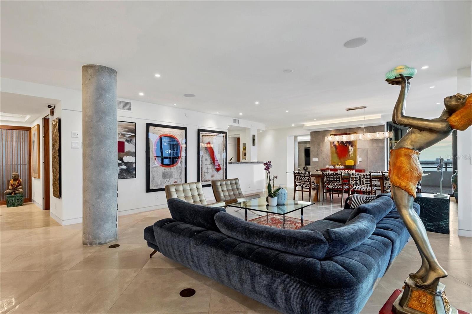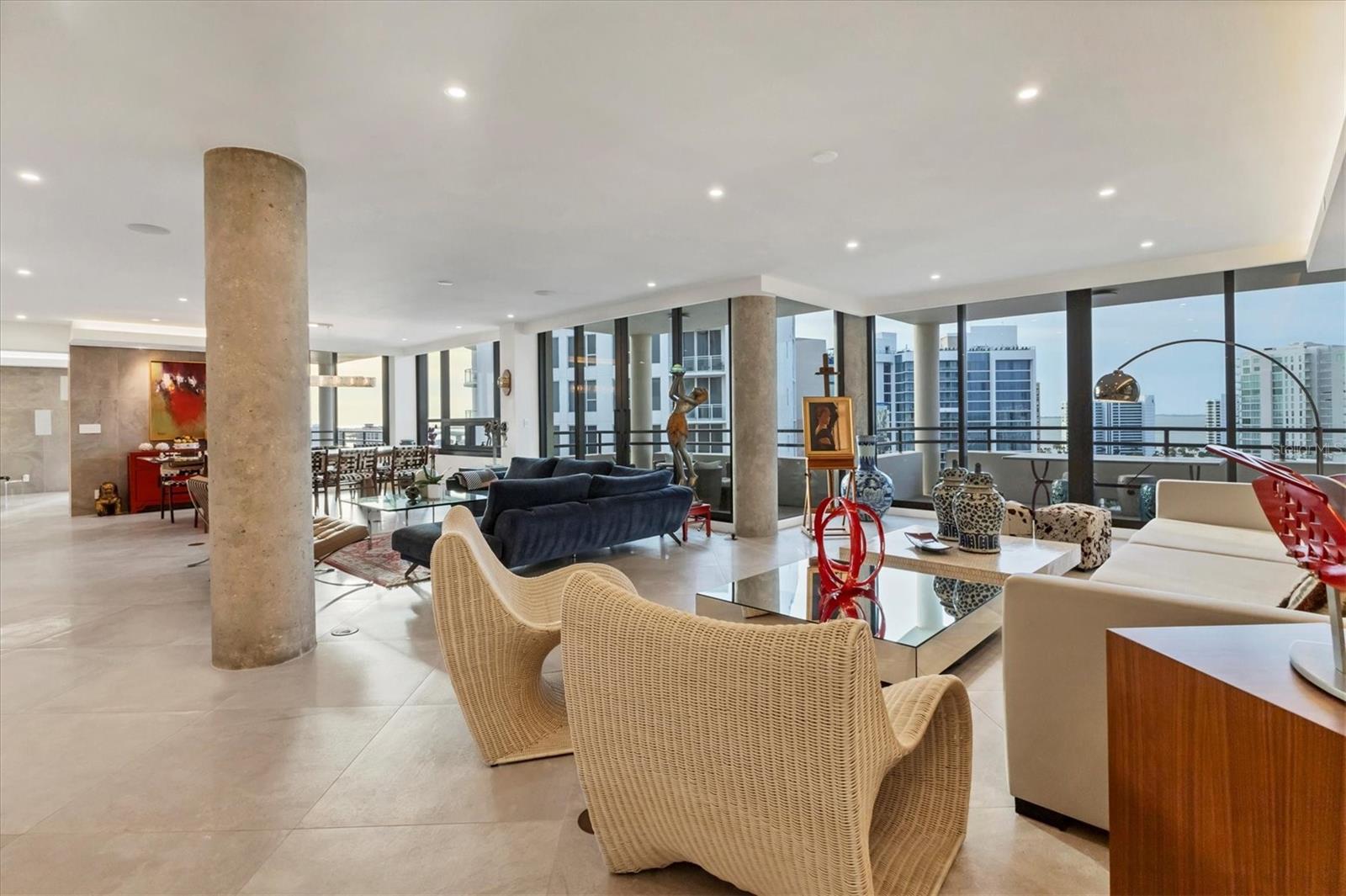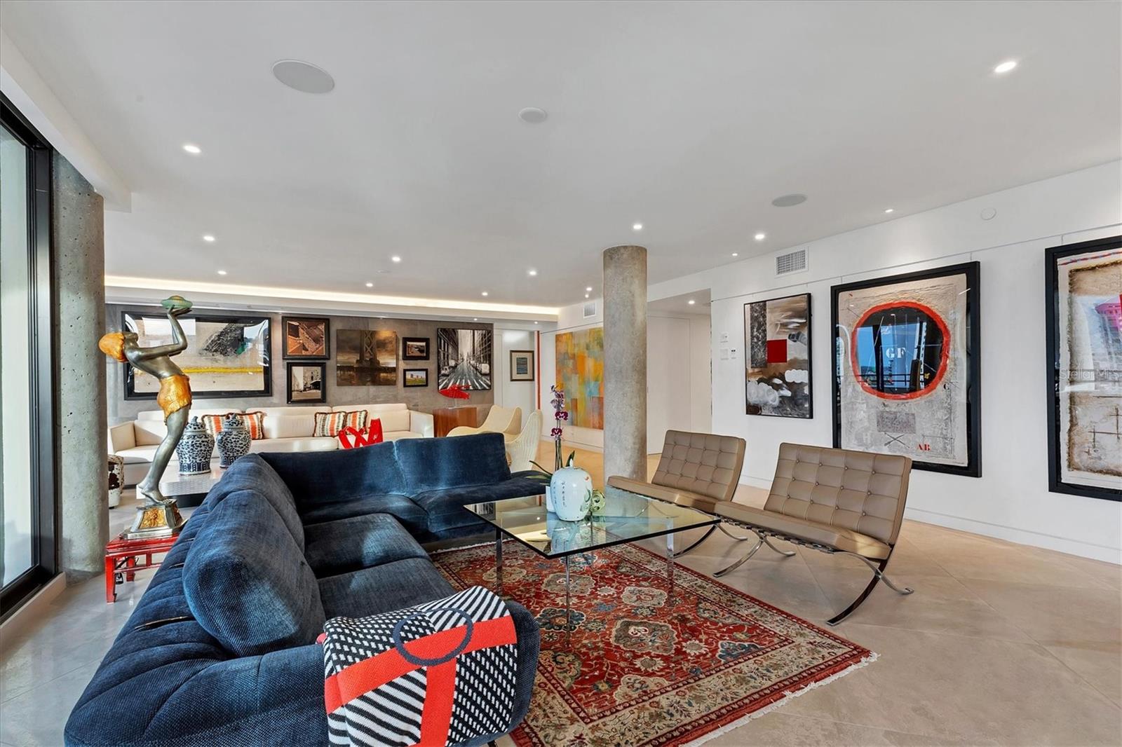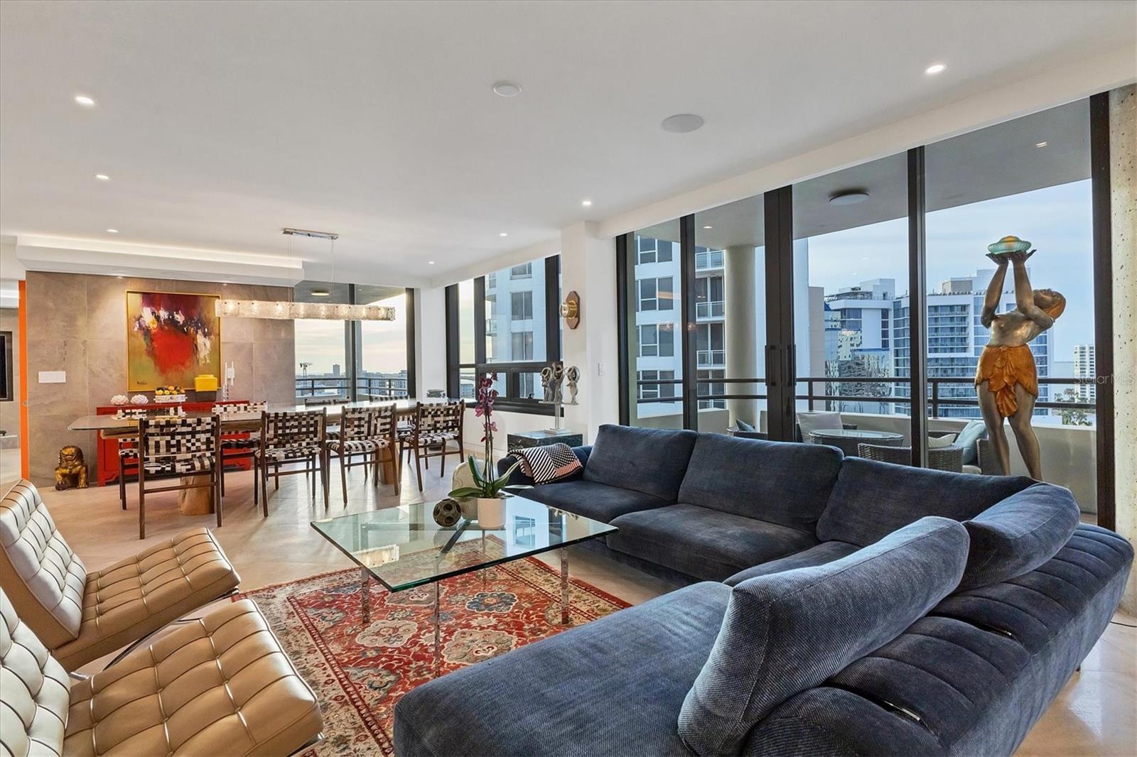 Sophisticated Downtown Sarasota Penthouse with Unmatched Bay and Skyline Views. Experience the pinnacle of luxury living in this fully renovated, architect-designed Sarasota penthouse in the heart of the city’s vibrant cultural district. Offered fully furnished (excluding art and sculptures), this residence blends mid-century modern architecture with sleek, contemporary upgrades for a timeless yet fresh aesthetic. Designed by acclaimed architect Bill Niblock, the expansive open floor plan connects the living, dining, and kitchen spaces with effortless flow—perfect for both intimate evenings and large-scale entertaining. Seven wraparound balconies showcase breathtaking 360-degree views of Sarasota Bay, the city skyline, and beyond, creating a seamless indoor-outdoor lifestyle. Originally renovated in 2019 and further elevated in 2024, the home meets Miami-Dade HVHZ impact standards with floor-to-ceiling sliding glass doors and windows, delivering safety, energy efficiency, and uninterrupted panoramas. Modern infrastructure includes a 200-amp electrical panel, high-efficiency HVAC, an 85-gallon commercial-grade water heater, and a manifold-based PEX plumbing system for superior performance. At the heart of the home, the Studio Becker-designed chef’s kitchen boasts Sub-Zero and Miele appliances, custom cabinetry, and striking blue granite surfaces. Adjacent, a custom media room features an 85-inch television, an 11-speaker Dolby ATMOS sound system, and rich walnut cabinetry for the ultimate cinematic experience. The owner’s suite is a private retreat with two balconies, three walk-in closets, an 85-inch television, and a spa-inspired bath with dual rain showers and limestone sinks. Throughout the home, you’ll find smart home technology, including motorized Hunter Douglas shades, Wi-Fi-enabled Haiku ceiling fans, CAT-6 cabling, USB charging outlets, and a WaterCop leak detection system. Elegant finishes include 32" x 32" imported porcelain tile, flush Italian doors, an art hanging system, and LED recessed lighting. Located in the prestigious Bay Plaza condominium, residents enjoy 24-hour concierge and valet services, a heated pool, fitness center, EV charging stations, and three deeded parking spaces. Step outside to explore Sarasota’s renowned arts venues, fine dining, and waterfront attractions just moments from your door. This one-of-a-kind penthouse offers architectural pedigree, world-class amenities, and a premier downtown Sarasota location—now available at $4.25M.