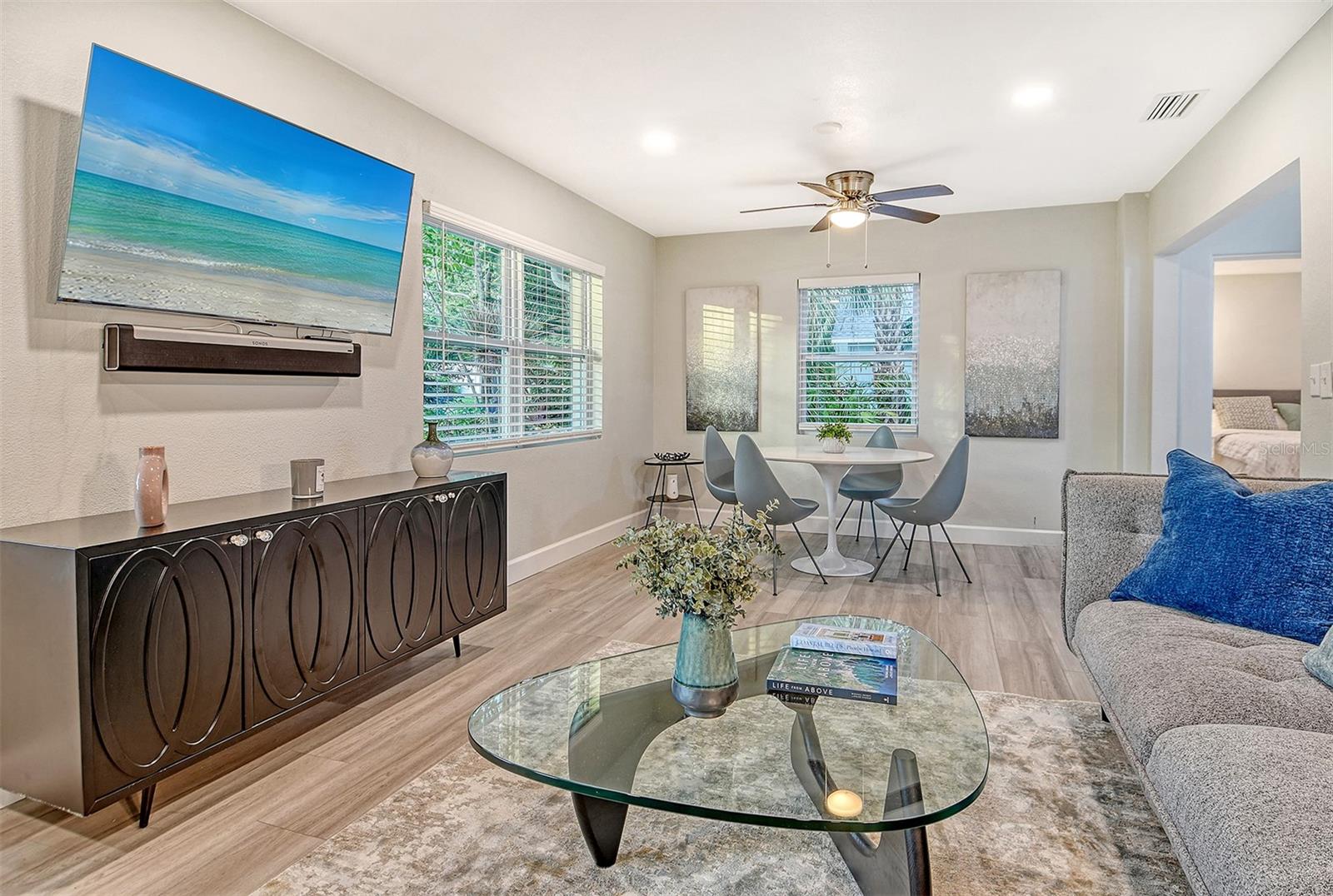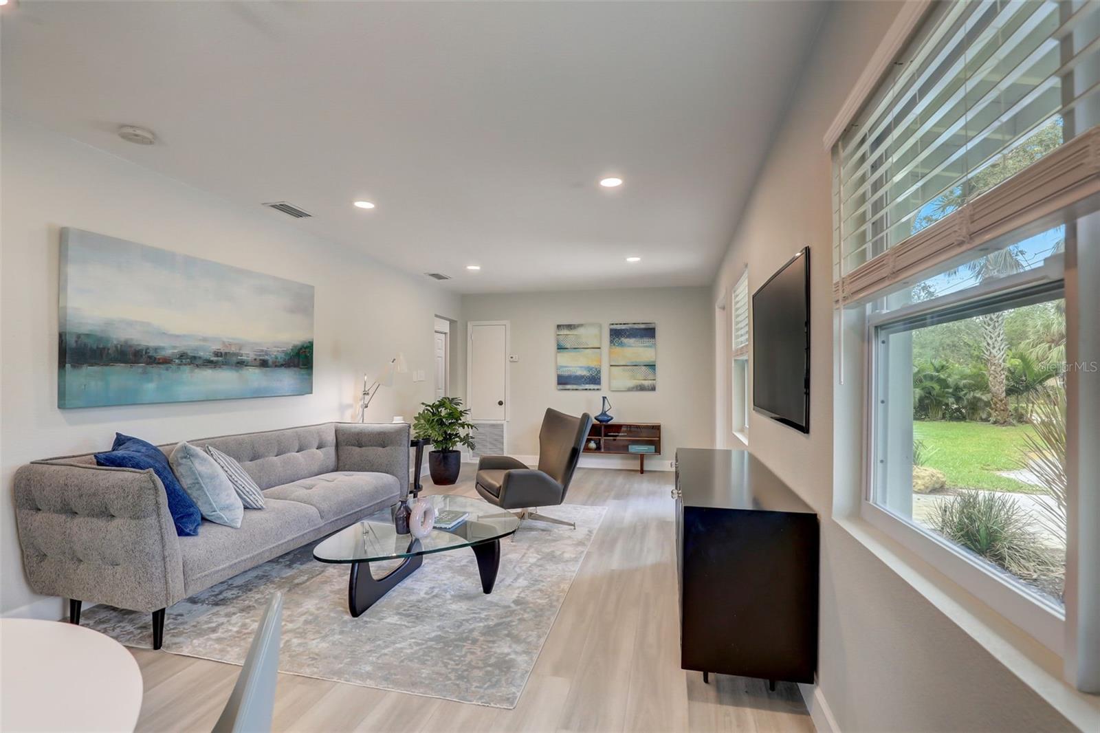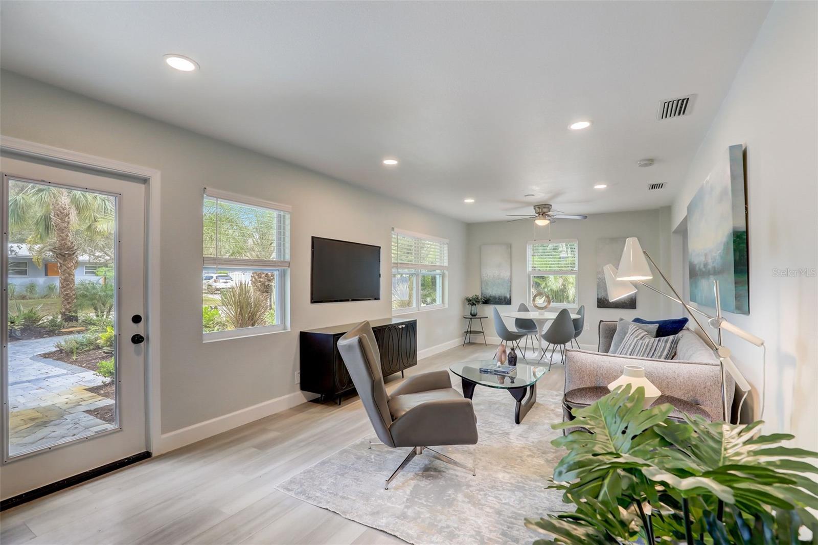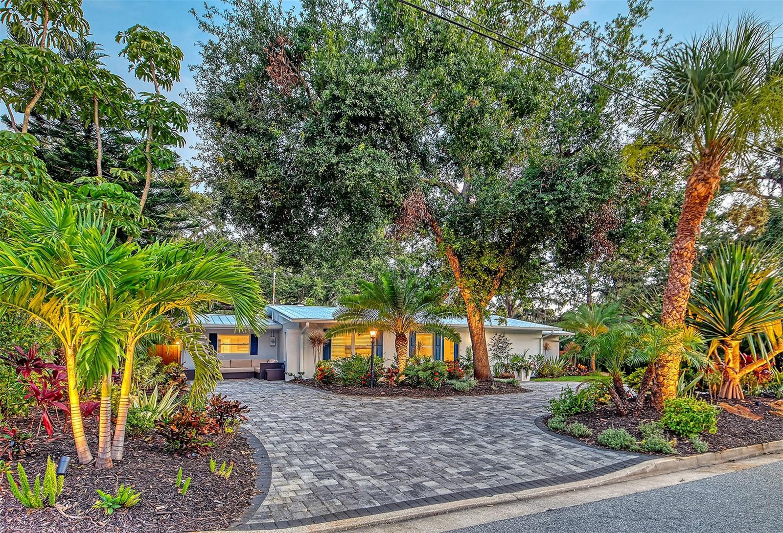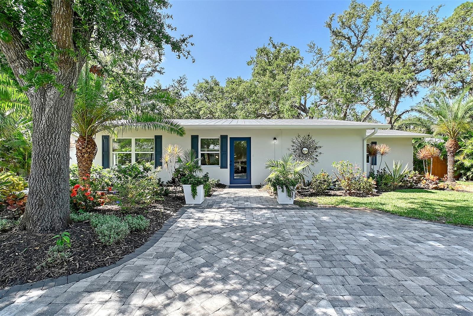 Welcome to Sapphire Shores, this property is on almost a quarter acre. This stunning 2023-25 completely remodeled Mid Century Modern residence is nestled in the highly sought-after Indian Beach/Sapphire Shores community of Sarasota. No expense was spared in transforming this gem into a luxurious haven, offering 4 bedrooms, 3 baths. Two outdoor relaxation areas, and a privacy fenced yard. The in-law suite with full bath, is perfect for guests, Airbnb, or a work-from-home office. New metal roof, aluminum soffit, and gutters, new AC system, hurricane impact windows and doors. New Kitchen, and appliances, New stackable washer and dryer. Newly furnished, and equipped. Experience the ultimate Gulf Coast lifestyle with this exceptional home, located West-of-the-Trail, mere minutes from downtown Sarasota, St. Armand’s Circle, and the pristine sands of Lido Beach. Enjoy the perfect blend of timeless elegance and modern convenience in this exquisite property. Step inside to discover a thoughtfully designed interior, boasting high-end finishes, an open-concept layout, and an abundance of natural light. The spacious living areas flow seamlessly, creating an ideal setting for both relaxation and entertaining. The gourmet kitchen features state-of-the-art appliances, custom cabinetry, and stunning Blue Onyx countertops, making it a chef’s dream. Come take a new look! Move in Ready!