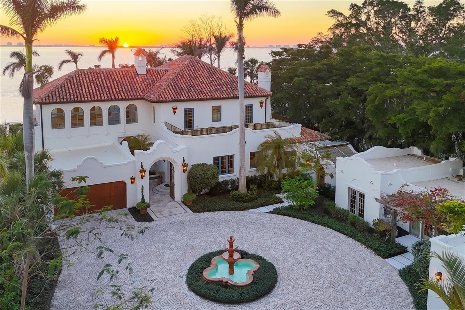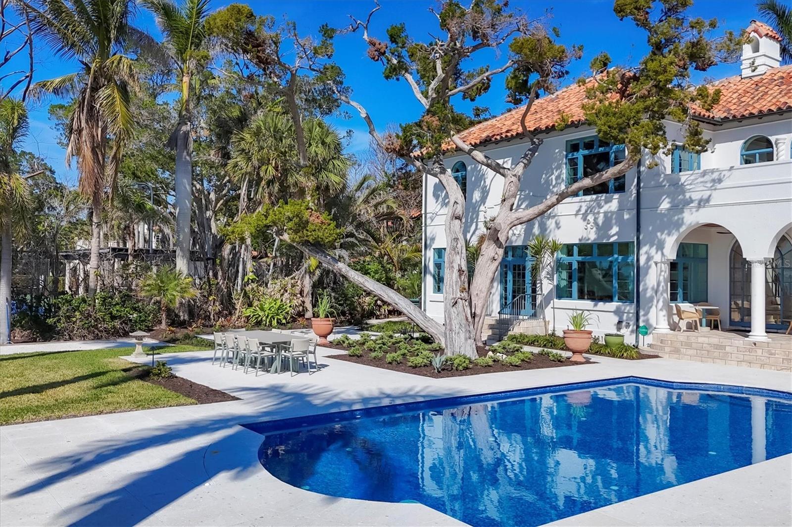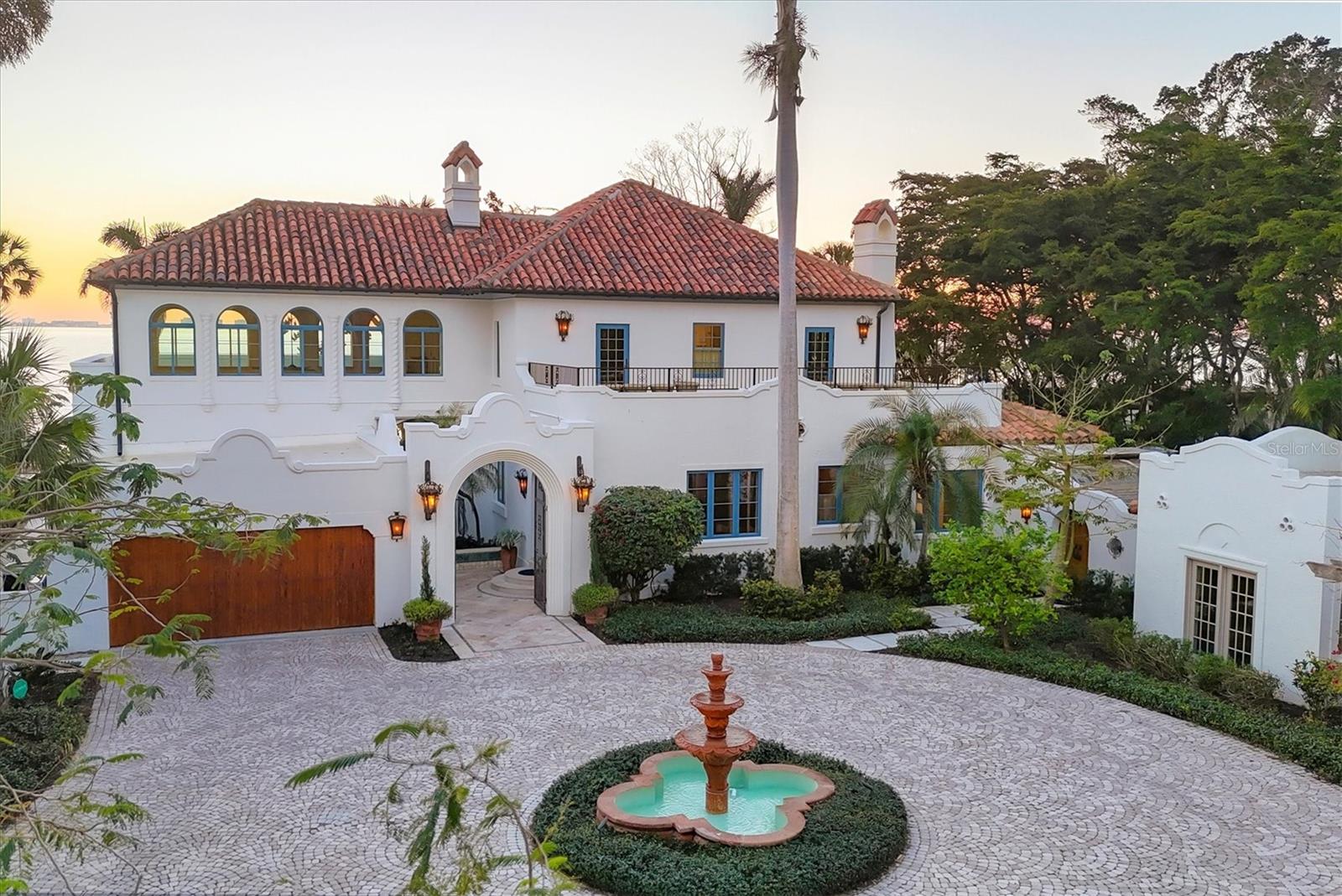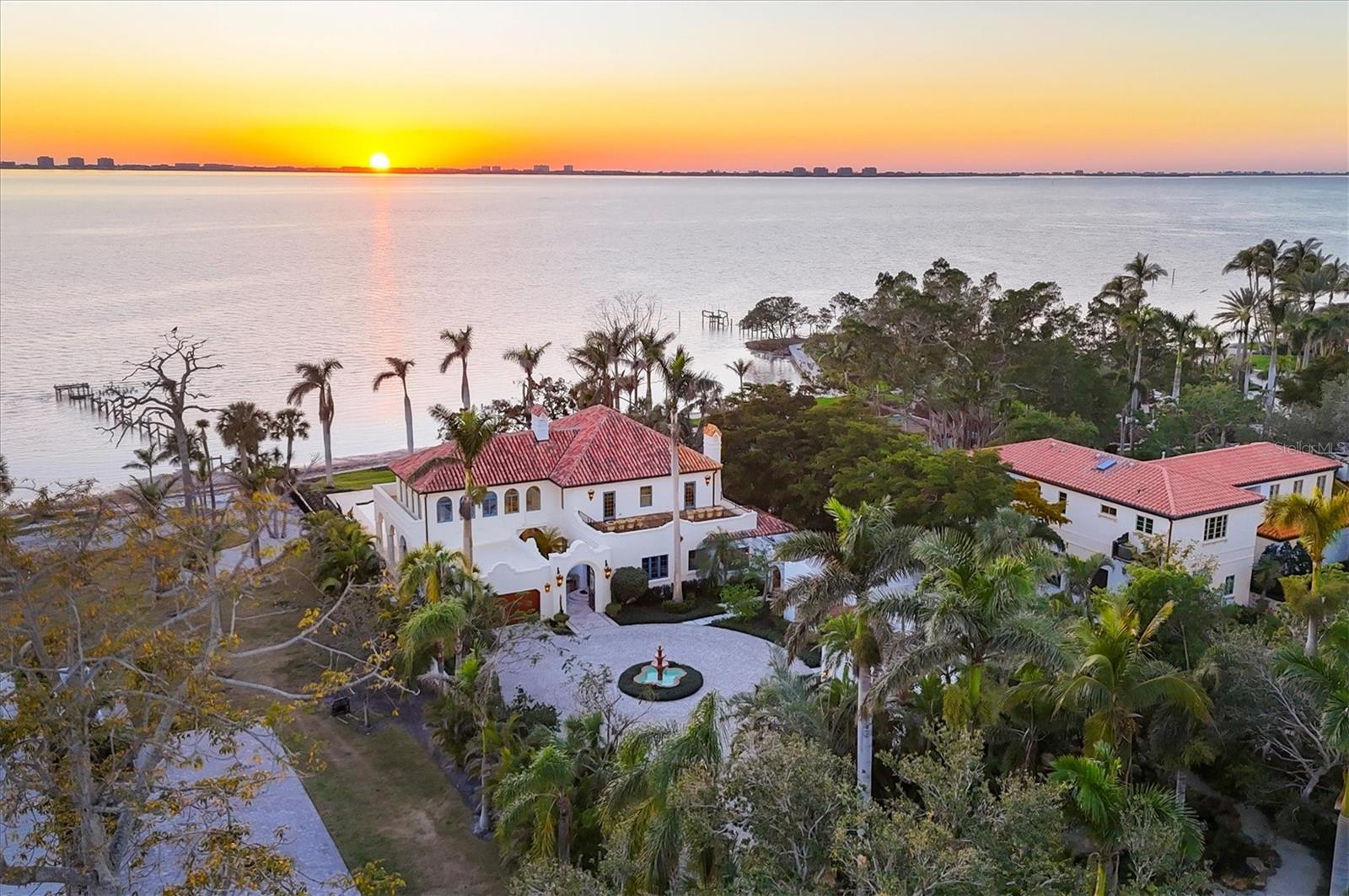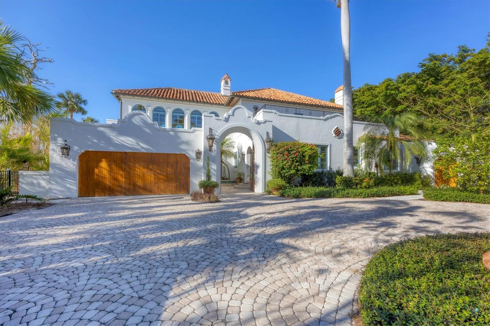 Nestled on nearly three-quarters of an acre, this meticulously updated 1925 Mediterranean Revival residence offers breathtaking, panoramic views of Sarasota Bay, encompassing the downtown skyline, Ringling Bridge and the northern tip of Longboat Key. While preserving its historic charm and original elegance, the home seamlessly integrates modern upgrades designed for both gracious living and entertaining. Upon entering through the gated entry, visitors are greeted by a serene garden with a koi pond and a spacious circular driveway featuring a central fountain, providing ample parking. The gated courtyard leads to a welcoming foyer, which serves as a gateway to the home’s expansive living spaces. To one side lies the formal living room, adorned with a coffered ceiling and an ornate fireplace, while the opposite side reveals a newly renovated kitchen, thoughtfully designed with a Sub-Zero refrigerator, AGA induction range, dolomite countertops, galley sinks and a cozy breakfast area. The formal dining room is perfect for hosting friends and family, offering bay views, a hand-painted recessed ceiling, a marble fireplace and custom built-ins for storage, display and serving. Adjacent to the dining room, the office/den provides tranquil spaces with views of the pool and bay. The great room, with its soaring ceilings, stately fireplace and 10-foot arched doors creates a stunning venue for entertaining, flowing effortlessly onto a spacious covered terrace perfect for sunset views. The second floor boasts three generously sized en-suite bedrooms, each with access to private terraces that showcase captivating vistas. The primary suite, completely reimagined in 2021, epitomizes luxury and relaxation with a custom-trimmed ceiling, a large window for endless Gulf of Mexico views, two French doors leading to an expansive terrace and a custom-organized walk-in closet. The primary bathroom is a retreat with an oversized walk-in shower, floating vanity, a free-standing soaking tub and stunning details and finishes throughout. Designed by renowned landscape architect Michael Gilkey, the grounds have been transformed into distinct outdoor "rooms," featuring a bocce court, expansive patios and a beautifully tiled, heated pool. A charming guesthouse, located adjacent to one of the two two-car garages, includes two rooms, two bathrooms and a kitchenette. With a pocket door, the space can be configured as two separate en-suite bedrooms for ultimate flexibility. Additional enhancements include updated HVAC systems, air conditioning for the garages, upgraded electrical systems, LED and Lutron lighting and hurricane-impact windows and doors. Conveniently located in Indian Beach and Sapphire Shores, this residence is close to downtown Sarasota, SRQ Airport and numerous dining and shopping options. Known as Casa Arula, this remarkable property harmoniously blends historical significance with modern sophistication, creating a truly exceptional place to call home.